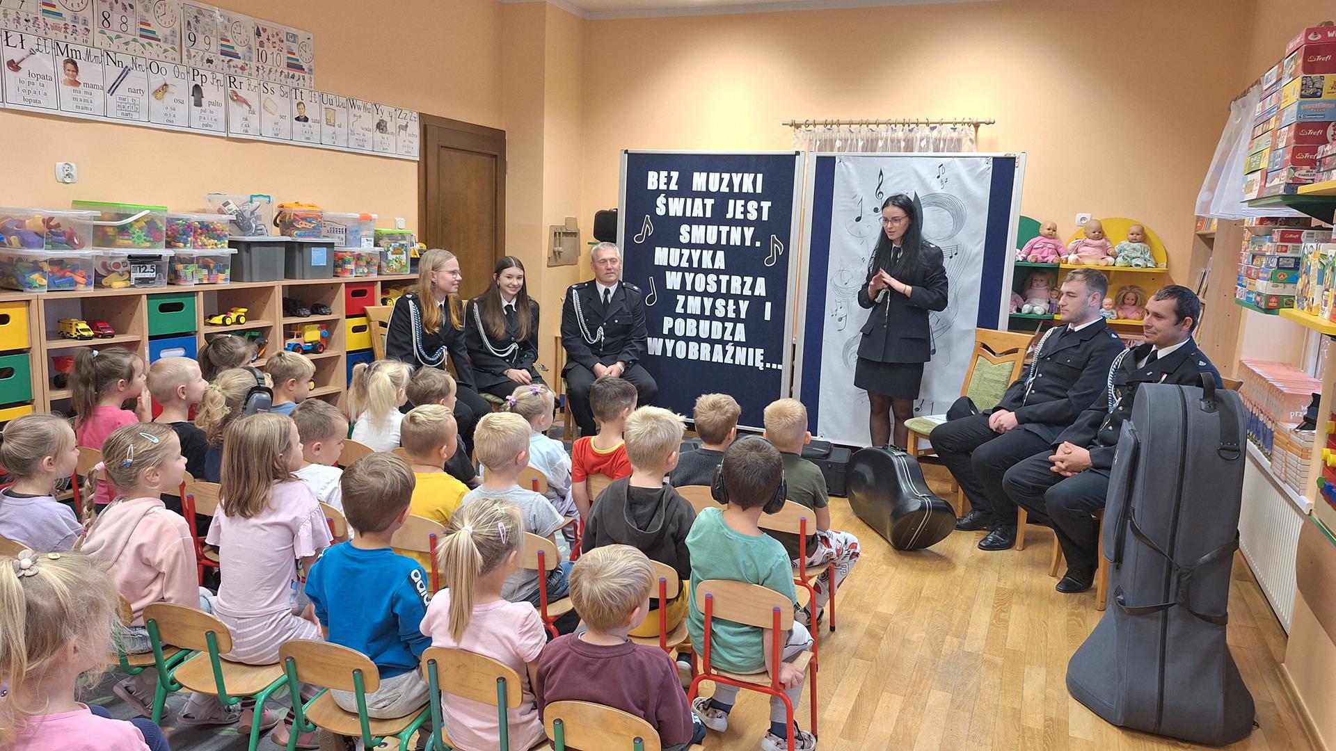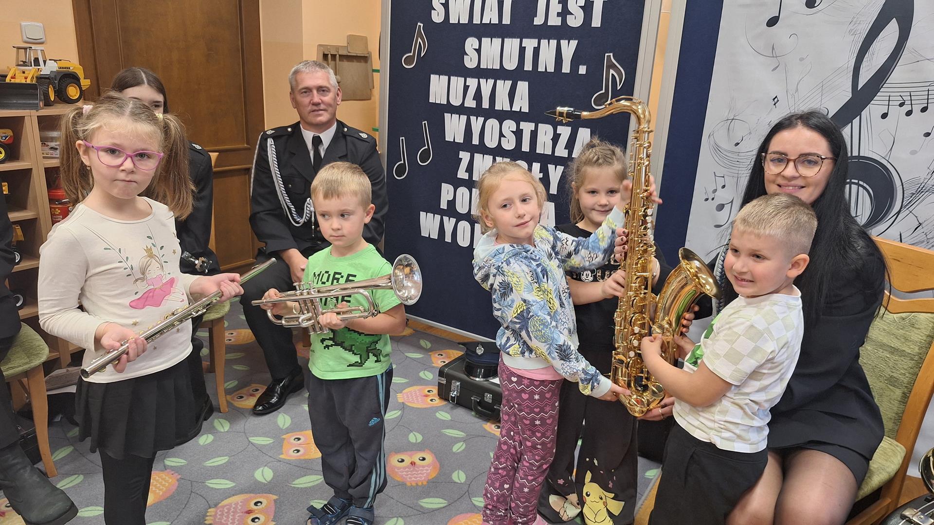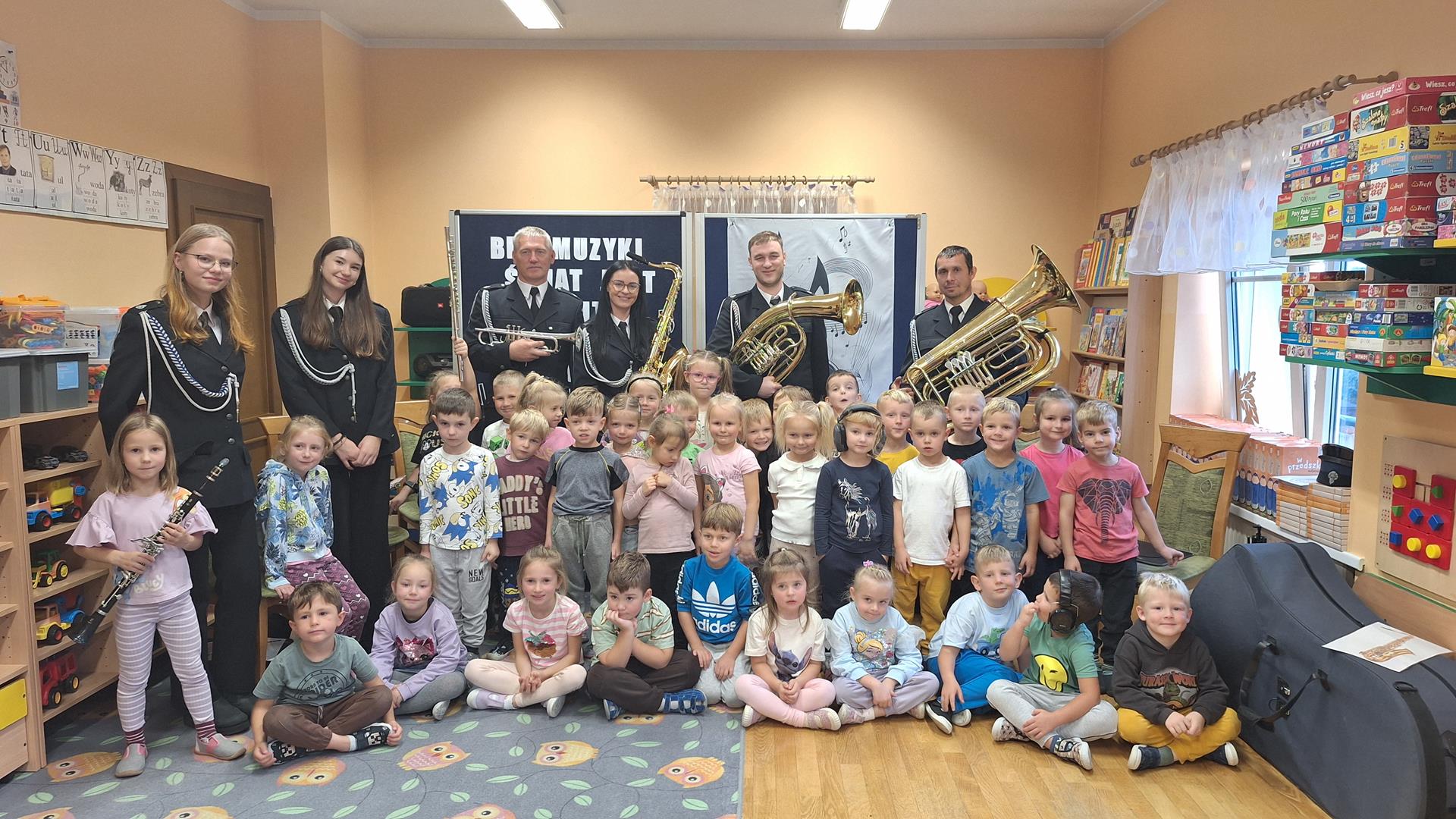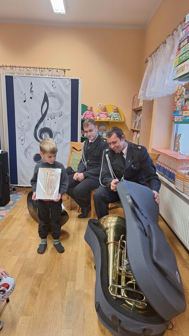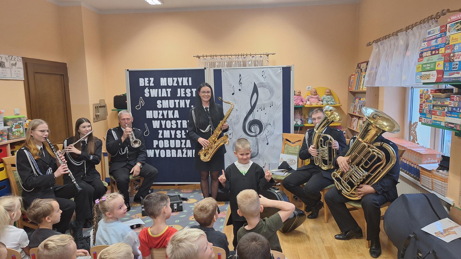 1 października to wyjątkowy dzień – Dzień Muzyki. Grupę Motylków i Biedronek odwiedzili niezwykli goście – sześciu muzyków z orkiestry dętej OSP w Kwielicach, każdy w galowym mundurze i z innym instrumentem: saksofonem, tubą, tenorem, trąbką, klarnetem i fletem. Już od pierwszych dźwięków w sali zapanowała magia. Dzieci siedziały zasłuchane i oczarowane, jakby przeniosły się do innego świata. Wysłuchaliśmy kilku marszowych utworów, a potem nadeszła chwila prawdziwych emocji – każde dziecko mogło dotknąć instrumentu, wziąć go do rąk, a nawet spróbować wydobyć własny dźwięk! Było to pierwsze takie wydarzenie w naszym przedszkolu – nigdy wcześniej orkiestra nie grała dla naszych przedszkolaków na żywo. Nic więc dziwnego, że maluchy były zaciekawione, zafascynowane i jakby zaczarowane. Muzyka była i zawsze będzie najpiękniejszą przygodą dla dziecięcych serc.