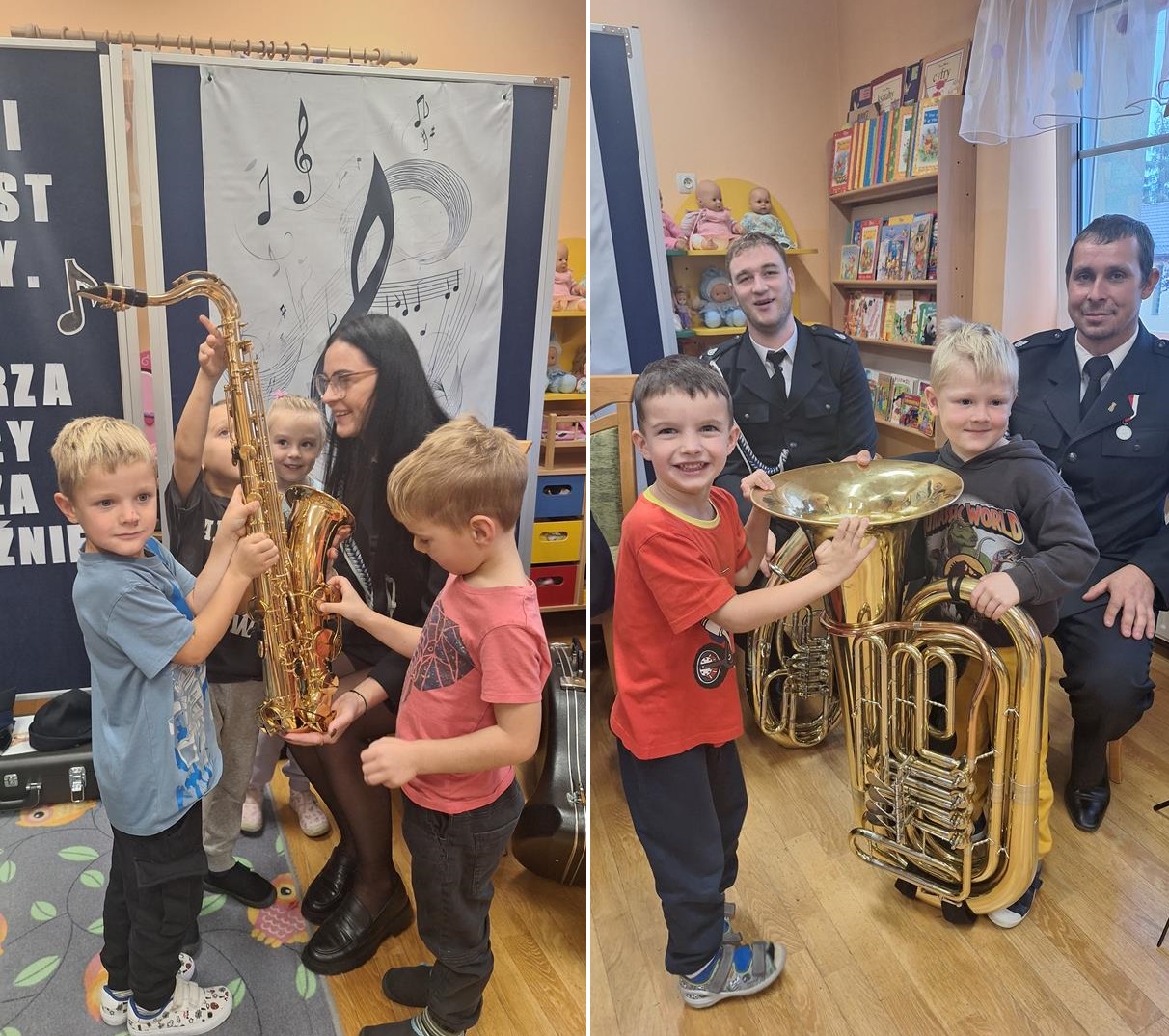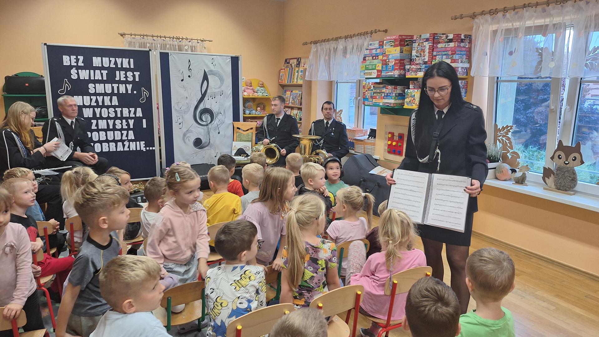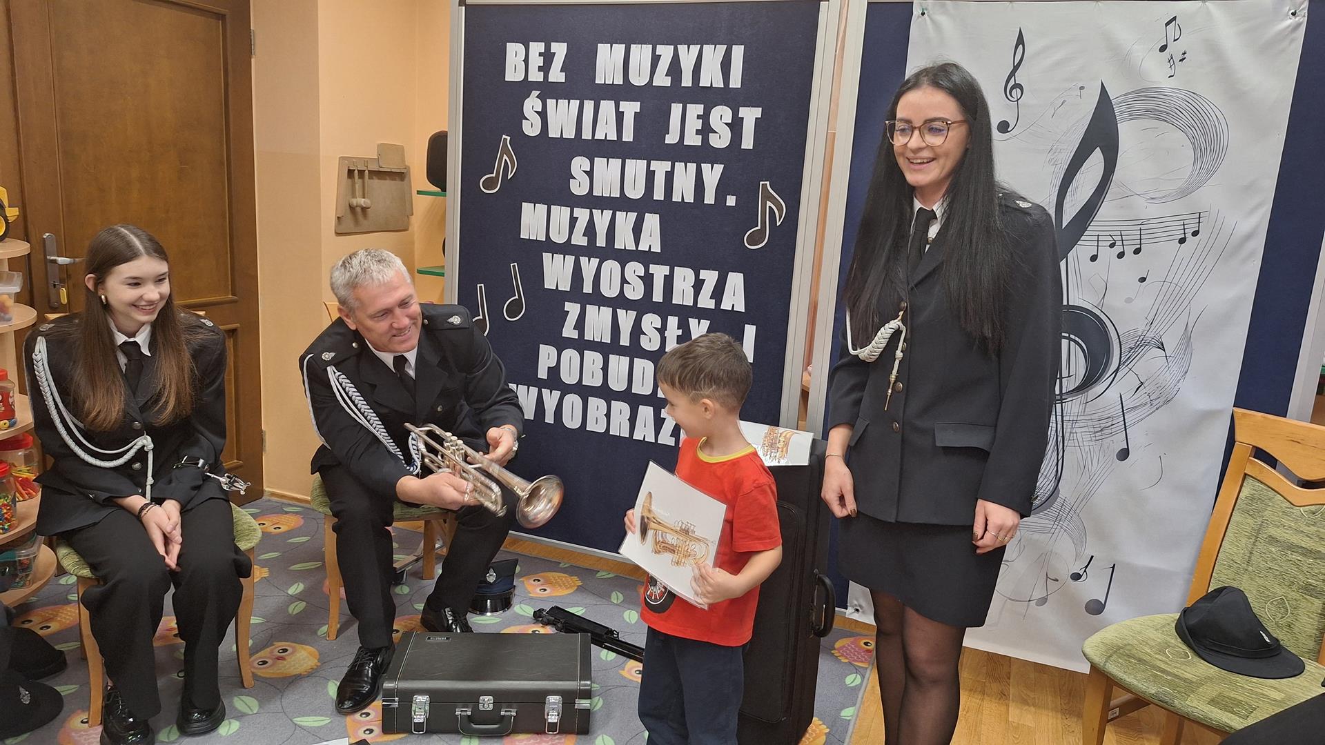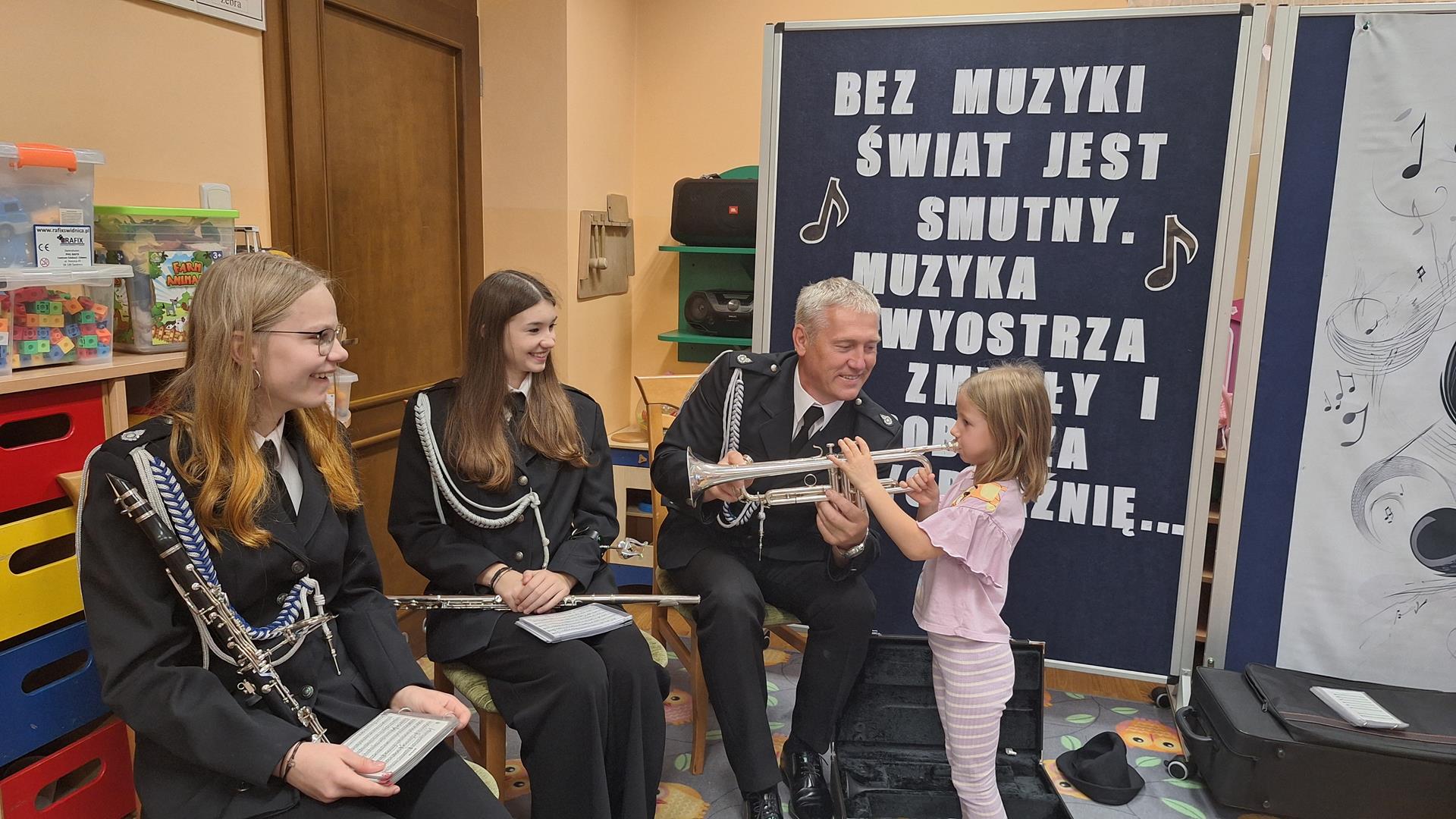 1 października to wyjątkowy dzień – Dzień Muzyki. Grupę Motylków i Biedronek odwiedzili niezwykli goście – sześciu muzyków z orkiestry dętej OSP w Kwielicach, każdy w galowym mundurze i z innym instrumentem: saksofonem, tubą, tenorem, trąbką, klarnetem i fletem. Już od pierwszych dźwięków w sali zapanowała magia. Dzieci siedziały zasłuchane i oczarowane, jakby przeniosły się do innego świata. Wysłuchaliśmy kilku marszowych utworów, a potem nadeszła chwila prawdziwych emocji – każde dziecko mogło dotknąć instrumentu, wziąć go do rąk, a nawet spróbować wydobyć własny dźwięk! Było to pierwsze takie wydarzenie w naszym przedszkolu – nigdy wcześniej orkiestra nie grała dla naszych przedszkolaków na żywo. Nic więc dziwnego, że maluchy były zaciekawione, zafascynowane i jakby zaczarowane. Muzyka była i zawsze będzie najpiękniejszą przygodą dla dziecięcych serc.