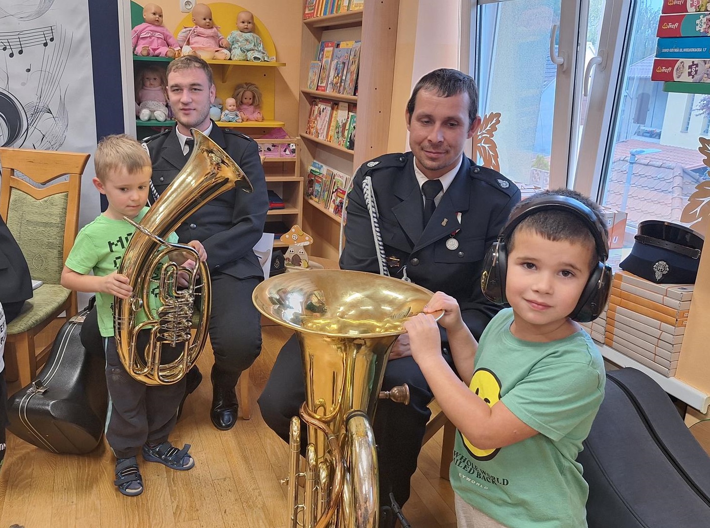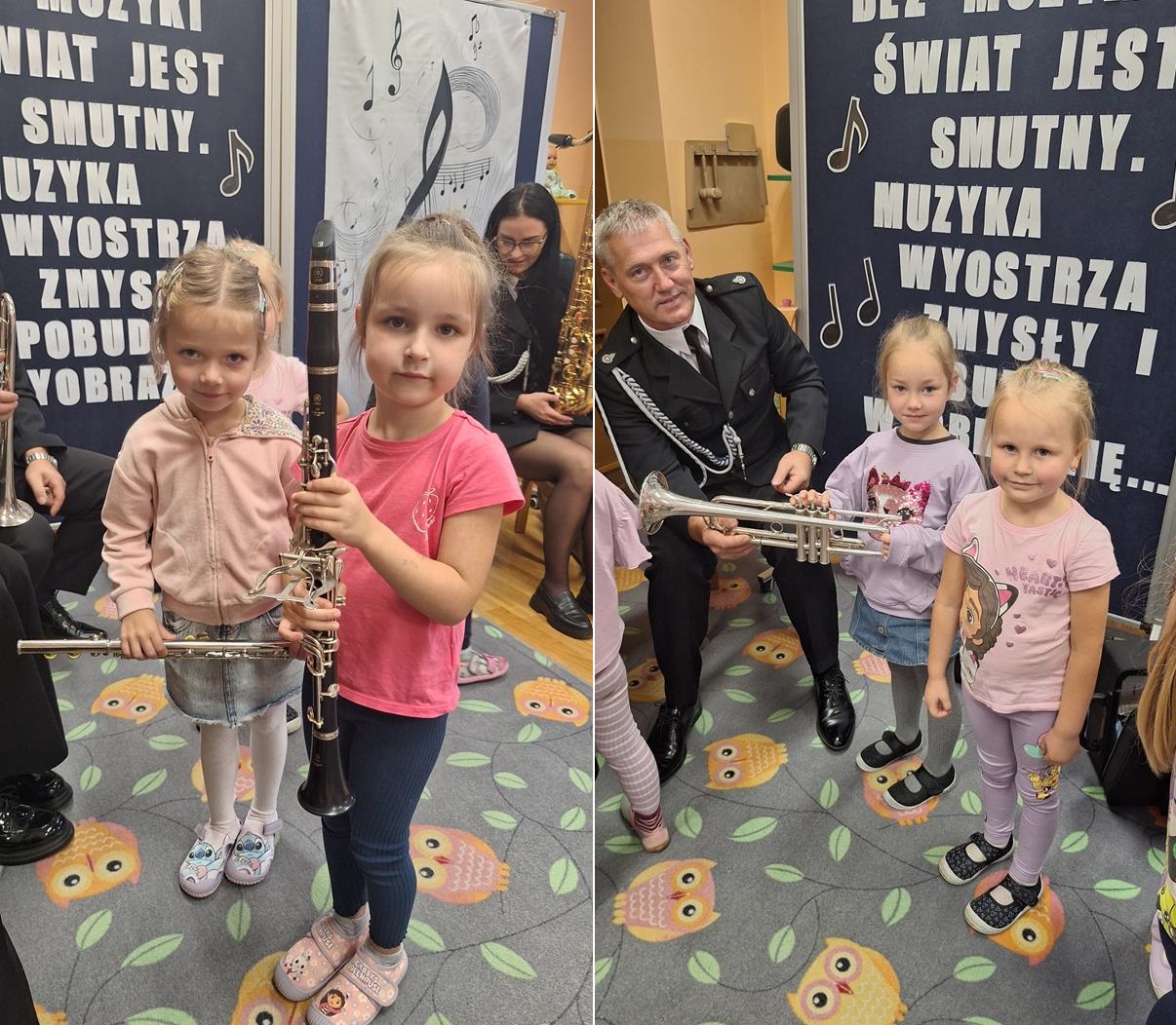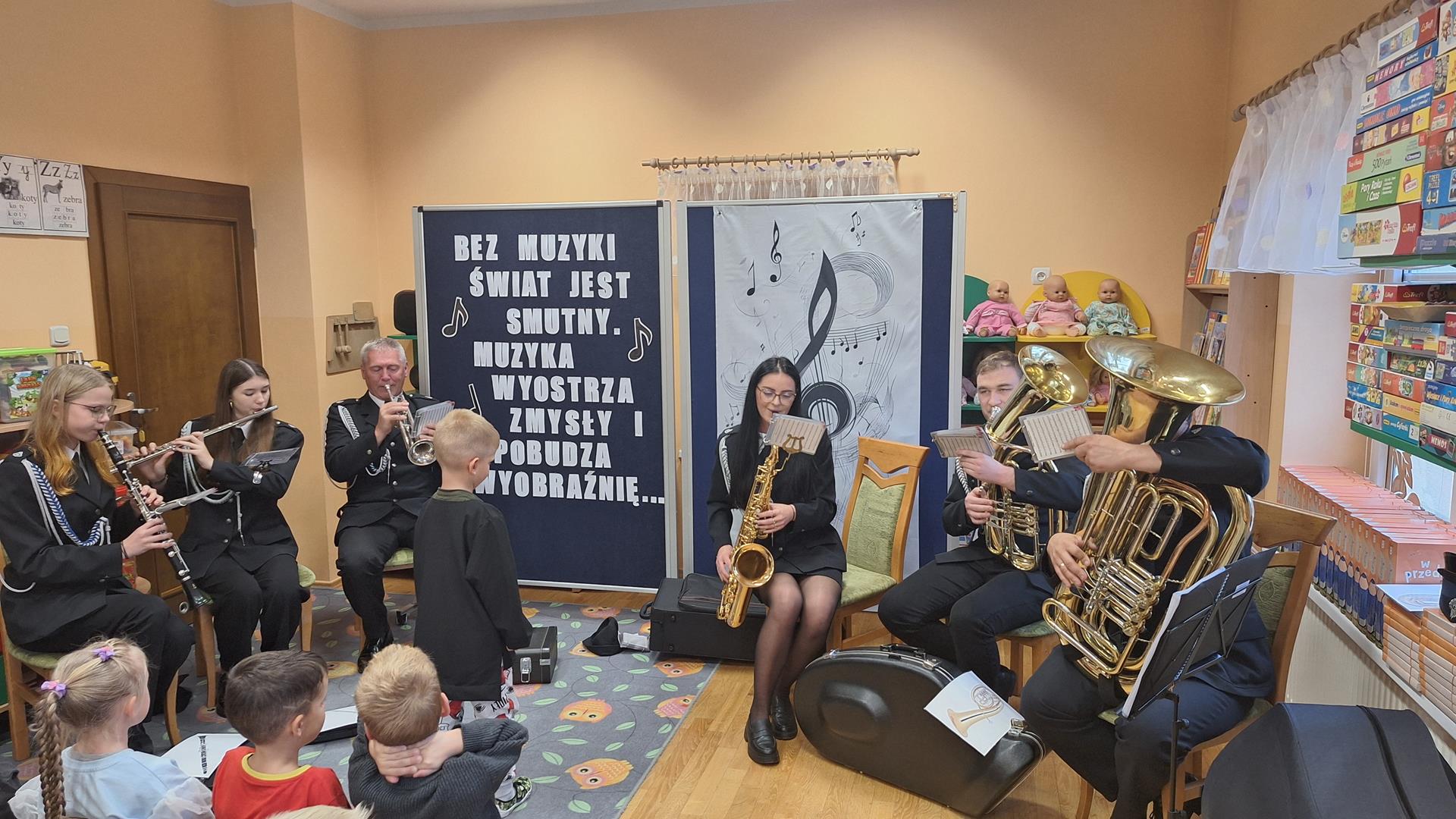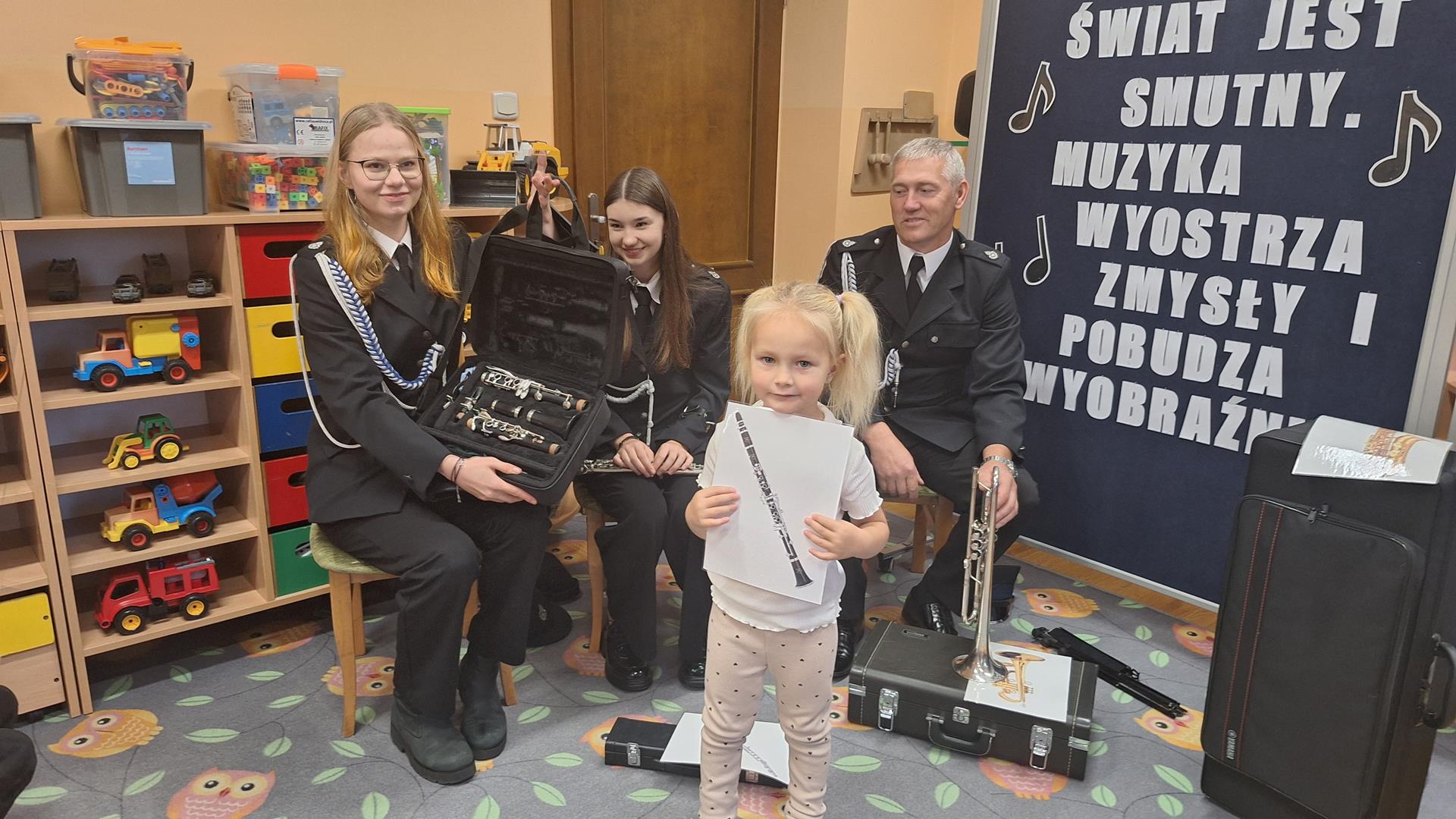 1 października to wyjątkowy dzień – Dzień Muzyki. Grupę Motylków i Biedronek odwiedzili niezwykli goście – sześciu muzyków z orkiestry dętej OSP w Kwielicach, każdy w galowym mundurze i z innym instrumentem: saksofonem, tubą, tenorem, trąbką, klarnetem i fletem. Już od pierwszych dźwięków w sali zapanowała magia. Dzieci siedziały zasłuchane i oczarowane, jakby przeniosły się do innego świata. Wysłuchaliśmy kilku marszowych utworów, a potem nadeszła chwila prawdziwych emocji – każde dziecko mogło dotknąć instrumentu, wziąć go do rąk, a nawet spróbować wydobyć własny dźwięk! Było to pierwsze takie wydarzenie w naszym przedszkolu – nigdy wcześniej orkiestra nie grała dla naszych przedszkolaków na żywo. Nic więc dziwnego, że maluchy były zaciekawione, zafascynowane i jakby zaczarowane. Muzyka była i zawsze będzie najpiękniejszą przygodą dla dziecięcych serc.