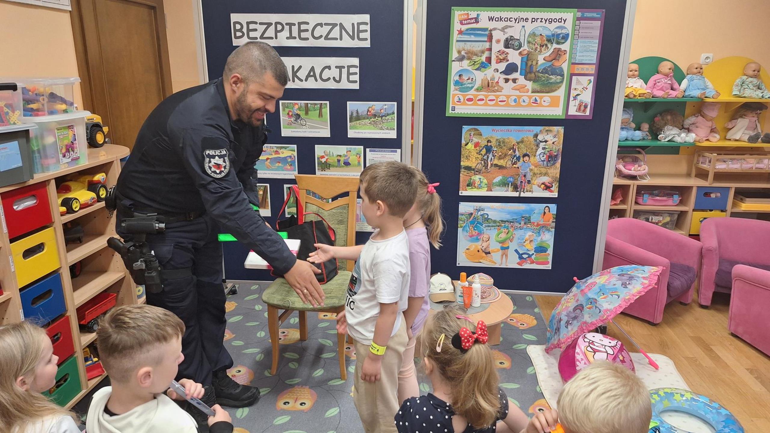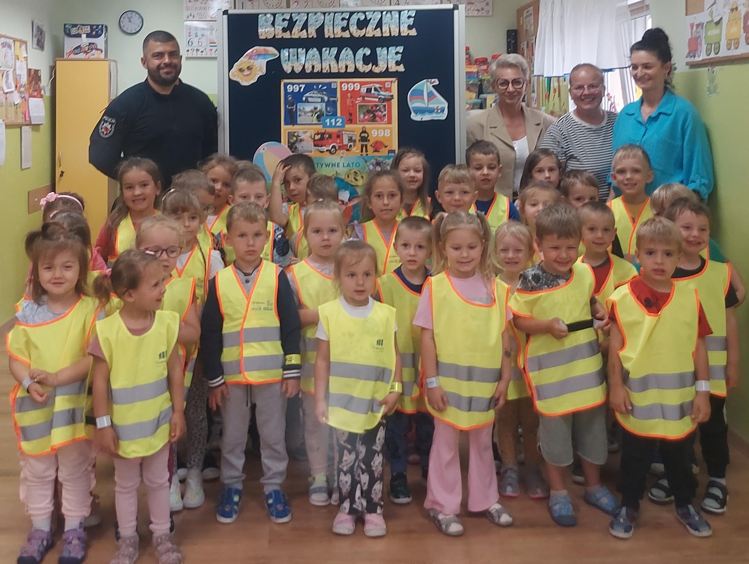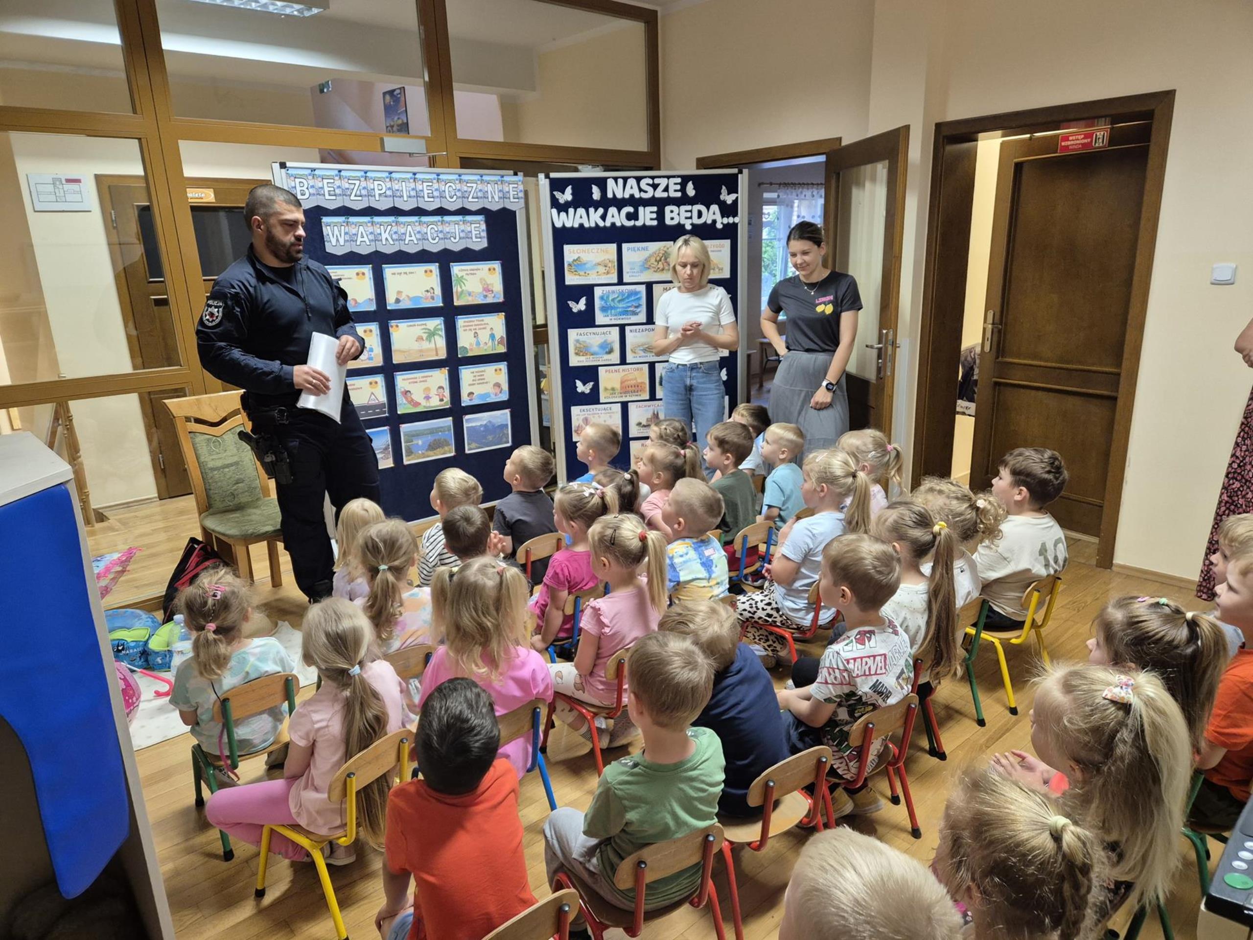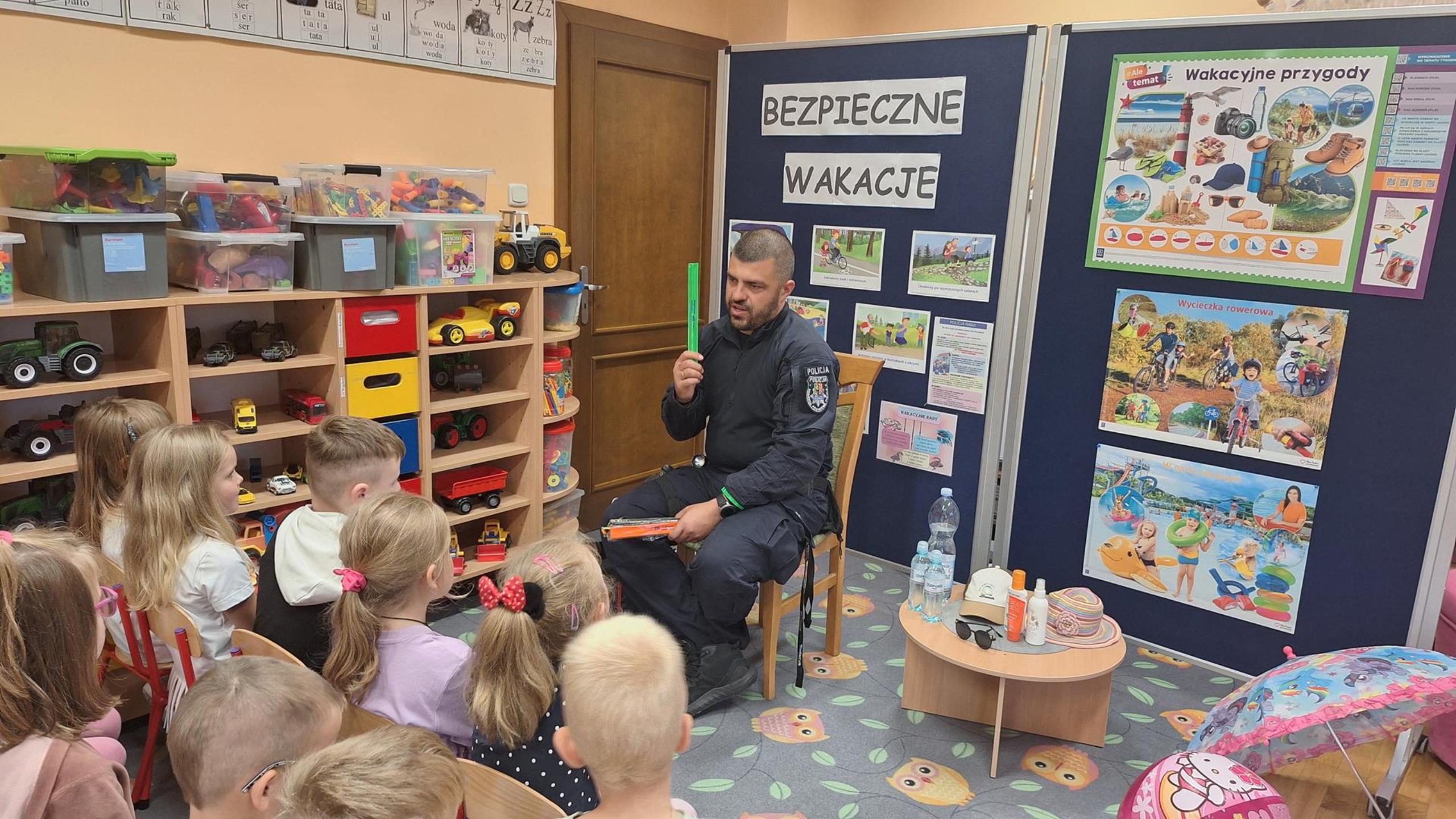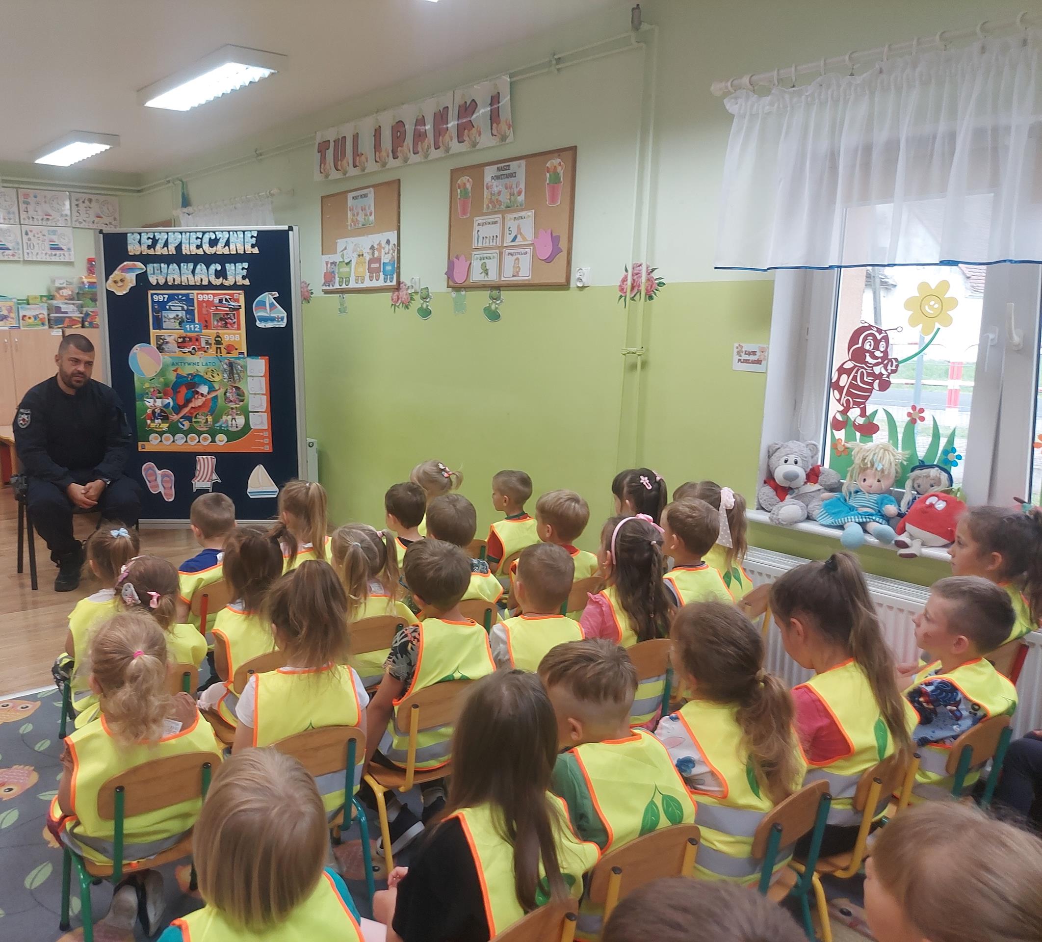 W ramach akcji „Bezpieczne Wakacje ” we wszystkich oddziałach przedszkolnych zostały przeprowadzone zajęcia z policjantem z zakresu bezpieczeństwa. Celem zajęć było przypomnienie i utrwalenie podstawowych zasad bezpiecznego zachowania na drodze, uświadomienie dzieciom zagrożeń, które mogą napotkać w okresie wakacyjnym. Dodatkowo, zajęcia te mają na celu utrwalenie zasad bezpiecznego zachowania w różnych miejscach, takich jak drogi, place zabaw, czy podczas kąpieli.