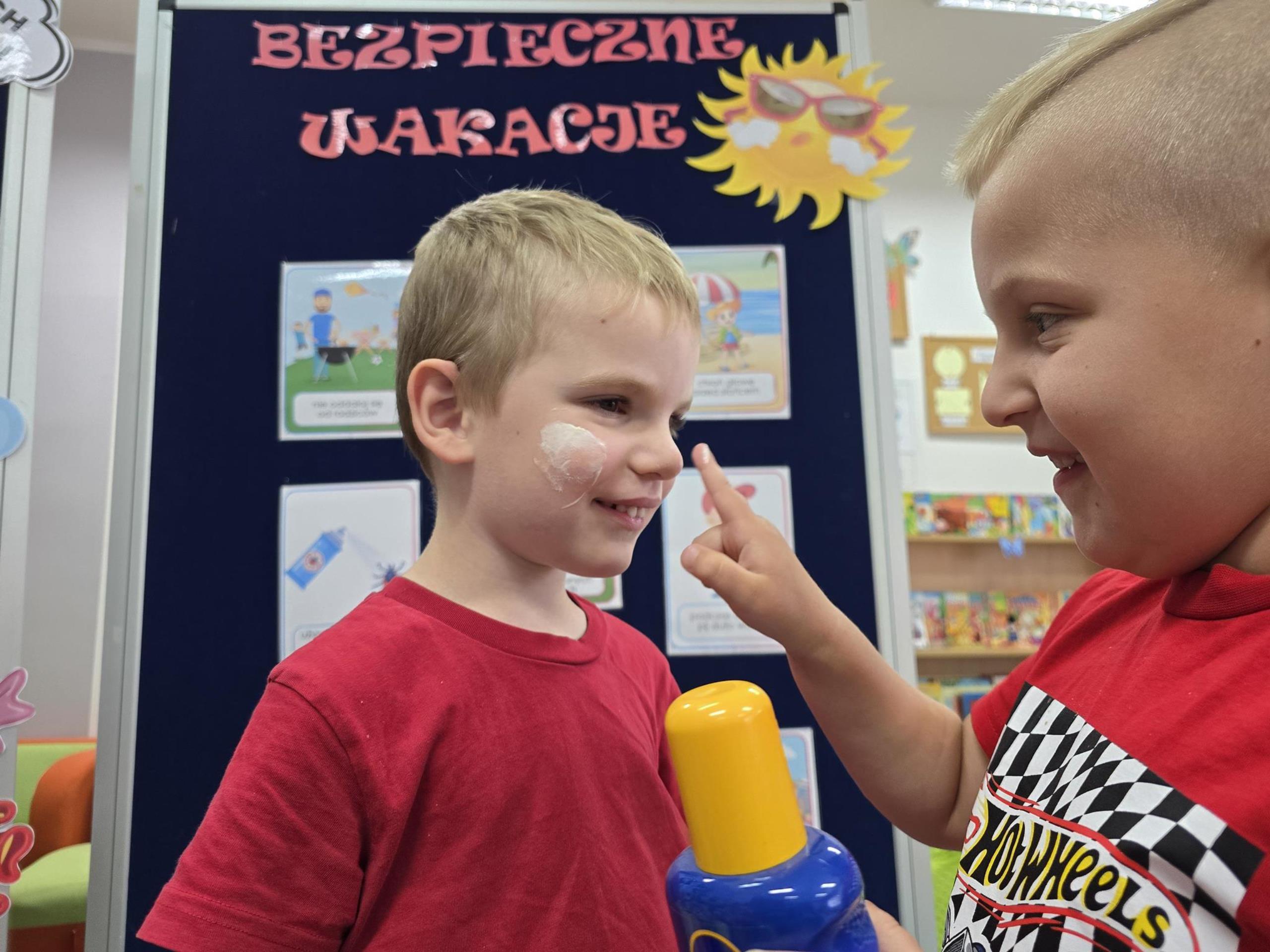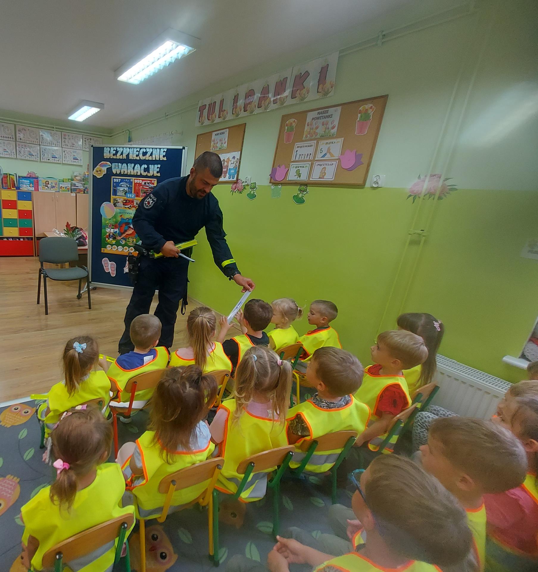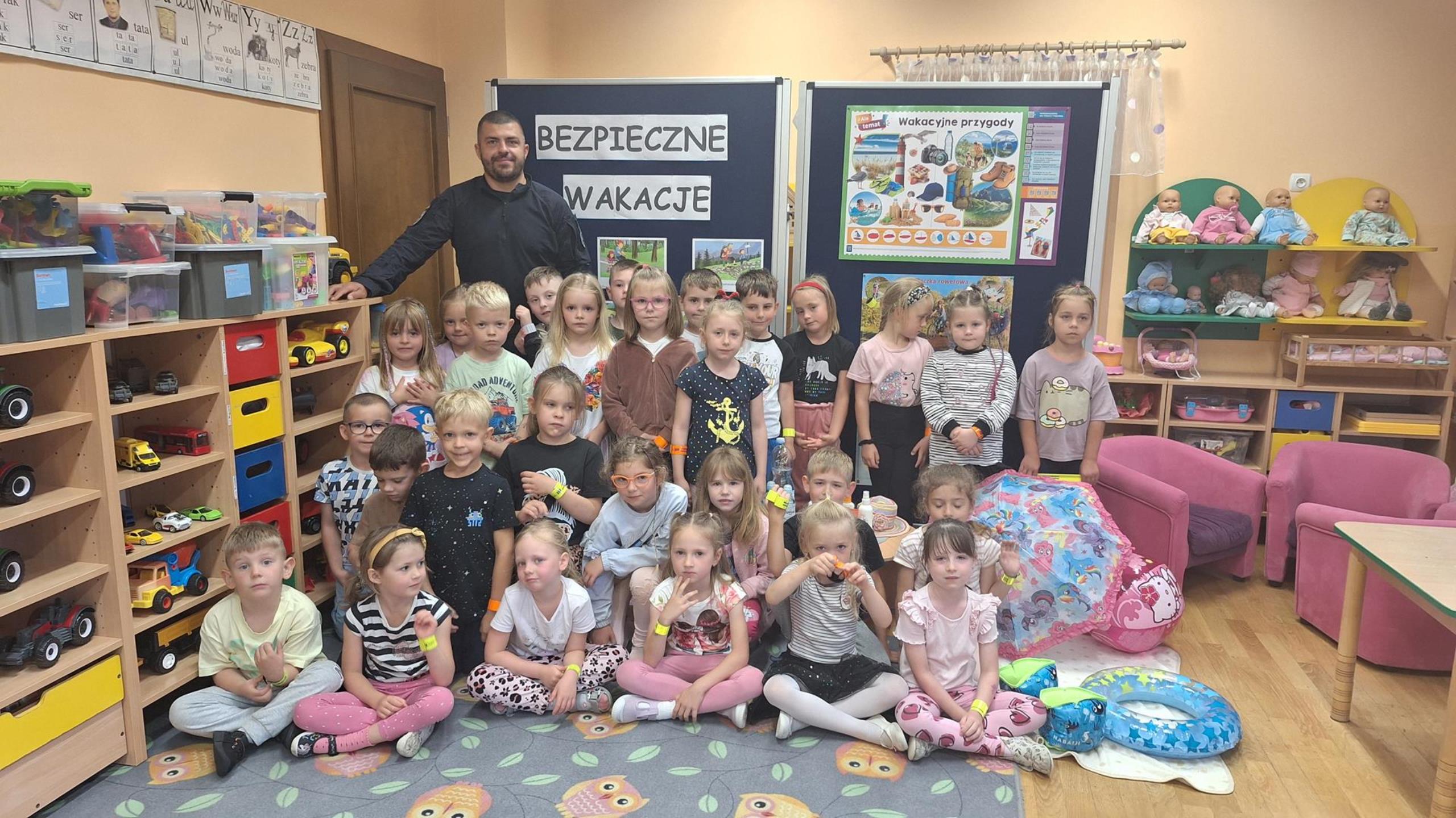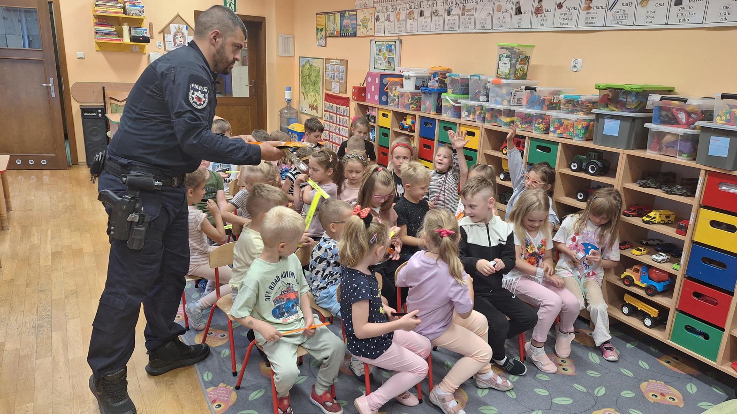 W ramach akcji „Bezpieczne Wakacje ” we wszystkich oddziałach przedszkolnych zostały przeprowadzone zajęcia z policjantem z zakresu bezpieczeństwa. Celem zajęć było przypomnienie i utrwalenie podstawowych zasad bezpiecznego zachowania na drodze, uświadomienie dzieciom zagrożeń, które mogą napotkać w okresie wakacyjnym. Dodatkowo, zajęcia te mają na celu utrwalenie zasad bezpiecznego zachowania w różnych miejscach, takich jak drogi, place zabaw, czy podczas kąpieli.