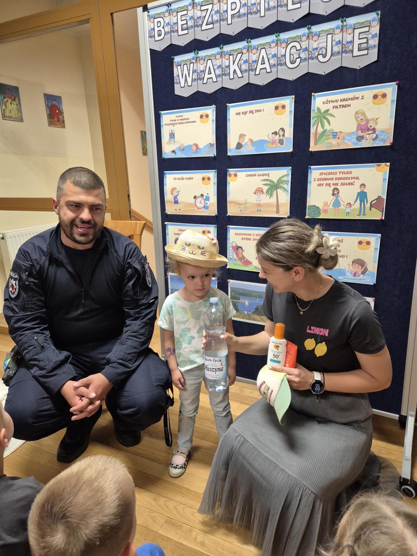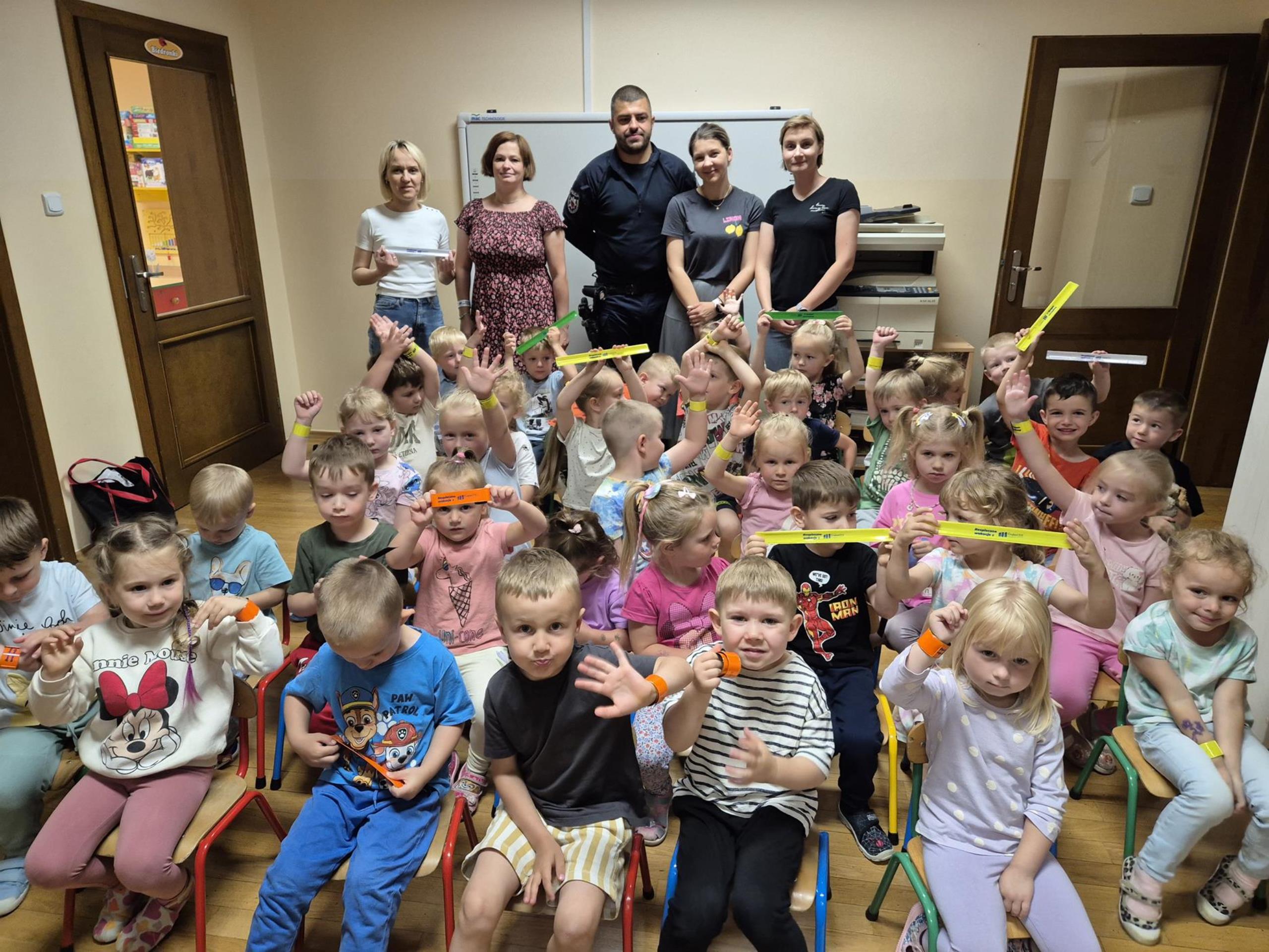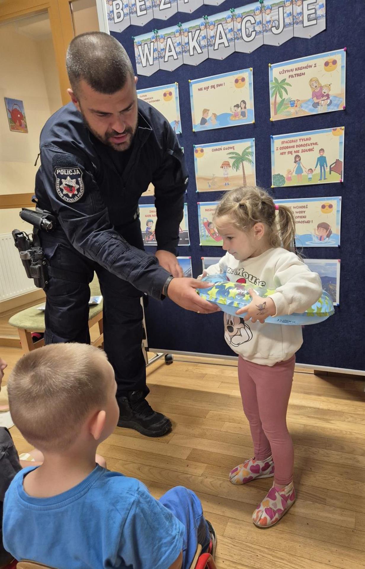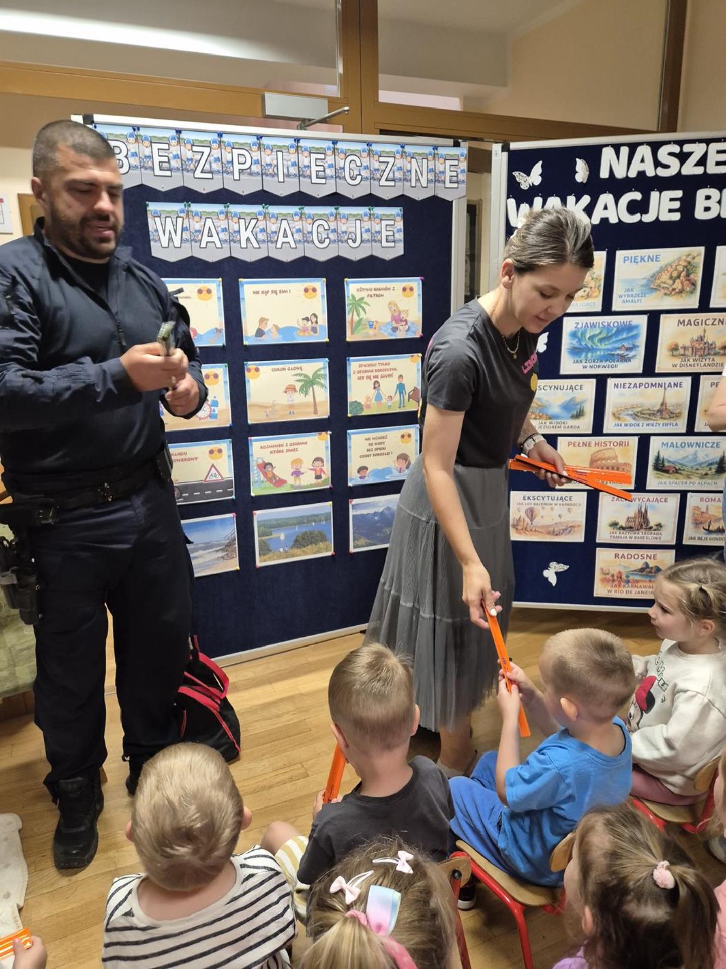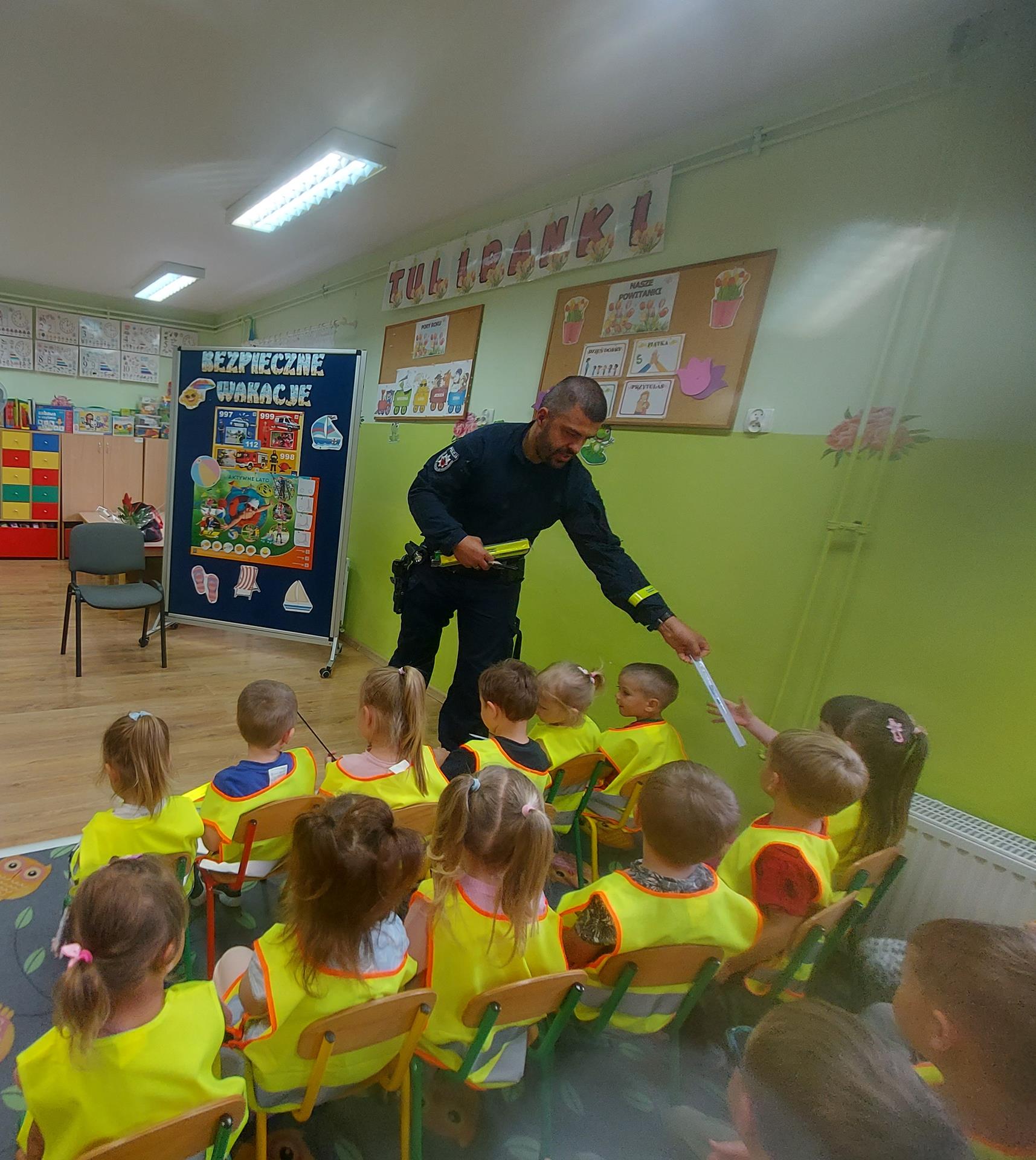 W ramach akcji „Bezpieczne Wakacje ” we wszystkich oddziałach przedszkolnych zostały przeprowadzone zajęcia z policjantem z zakresu bezpieczeństwa. Celem zajęć było przypomnienie i utrwalenie podstawowych zasad bezpiecznego zachowania na drodze, uświadomienie dzieciom zagrożeń, które mogą napotkać w okresie wakacyjnym. Dodatkowo, zajęcia te mają na celu utrwalenie zasad bezpiecznego zachowania w różnych miejscach, takich jak drogi, place zabaw, czy podczas kąpieli.