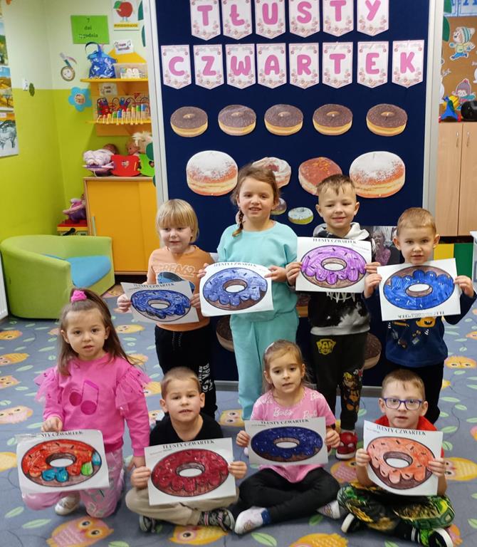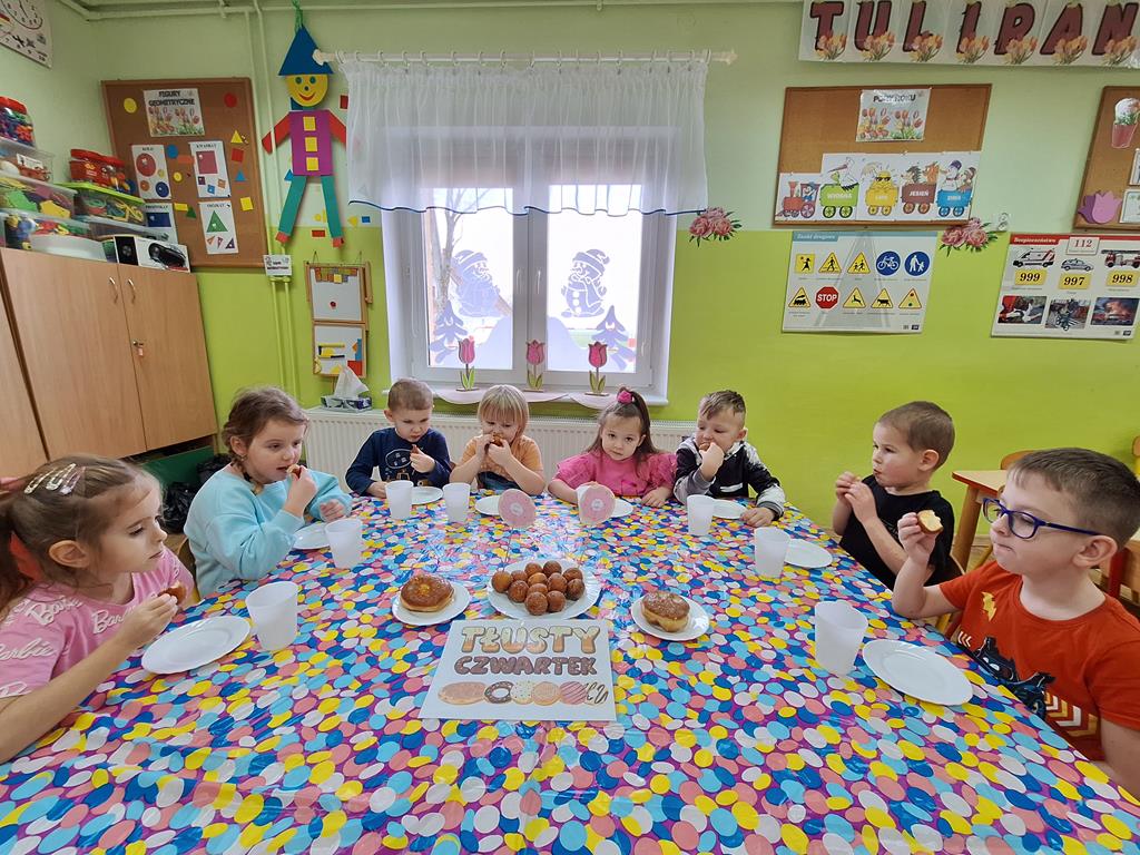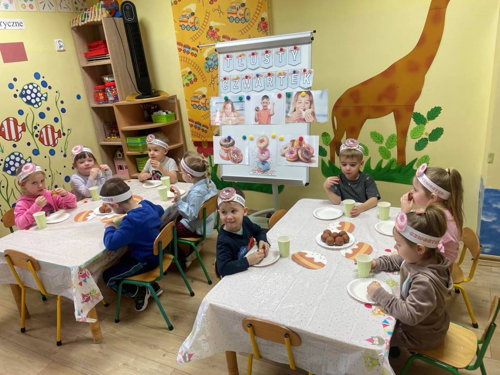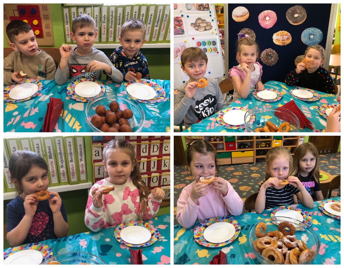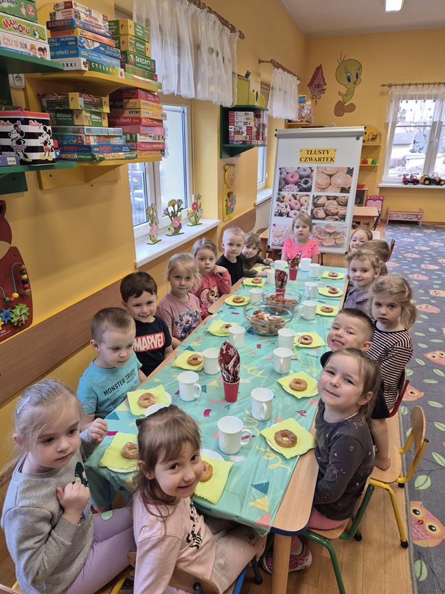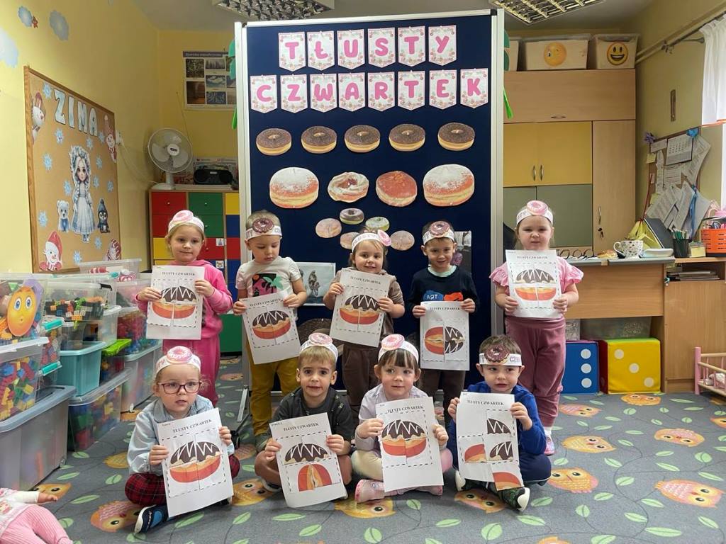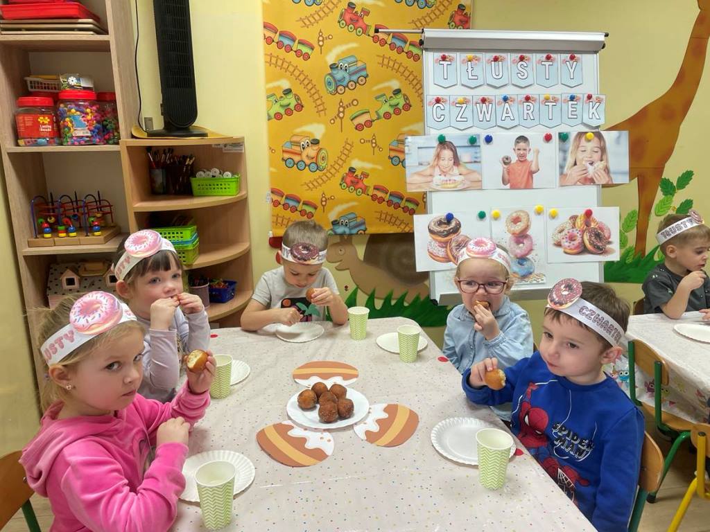 „Powiedział Bartek , że dziś tłusty czwartek, a Bartkowa uwierzyła, dobrych pączków nasmażyła” -mówi staropolskie przysłowie. Tłusty Czwartek -tak, jak każe tradycja, każdy w ten dzień powinien zjeść pączka. Tak też było w naszym przedszkolu. W tłusty czwartek 27lutego we wszystkich oddziałach przedszkolnych obchodziliśmy „Pączkowe Święto”. W ten bardzo słodki dla wszystkich dzień, przedszkolaki zapoznały się ze zwyczajami polskiej tradycji, z historią pączka. Każde dziecko kosztowało pączka, który zjadany był z wielkim apetytem oraz uśmiechem na buzi.