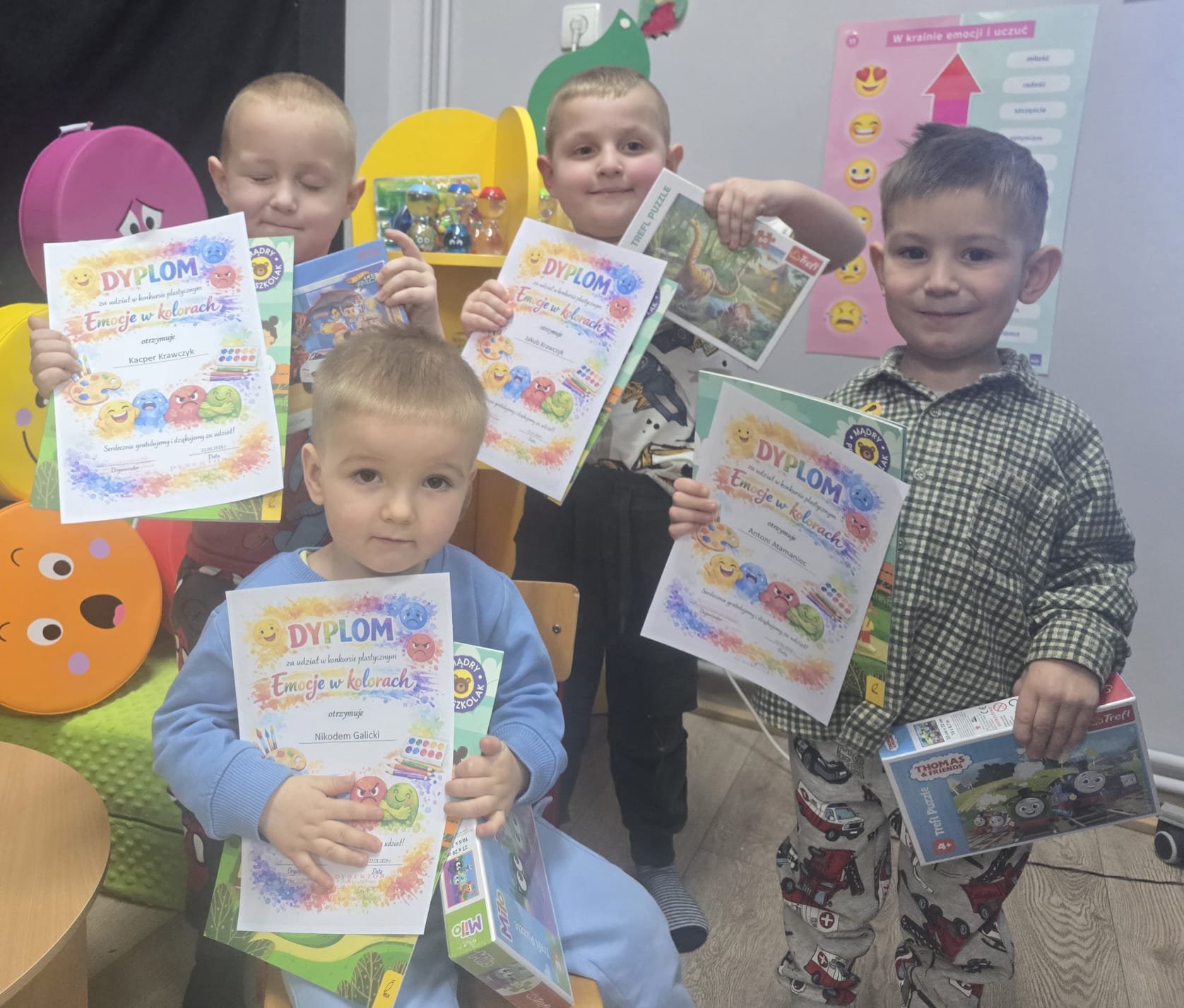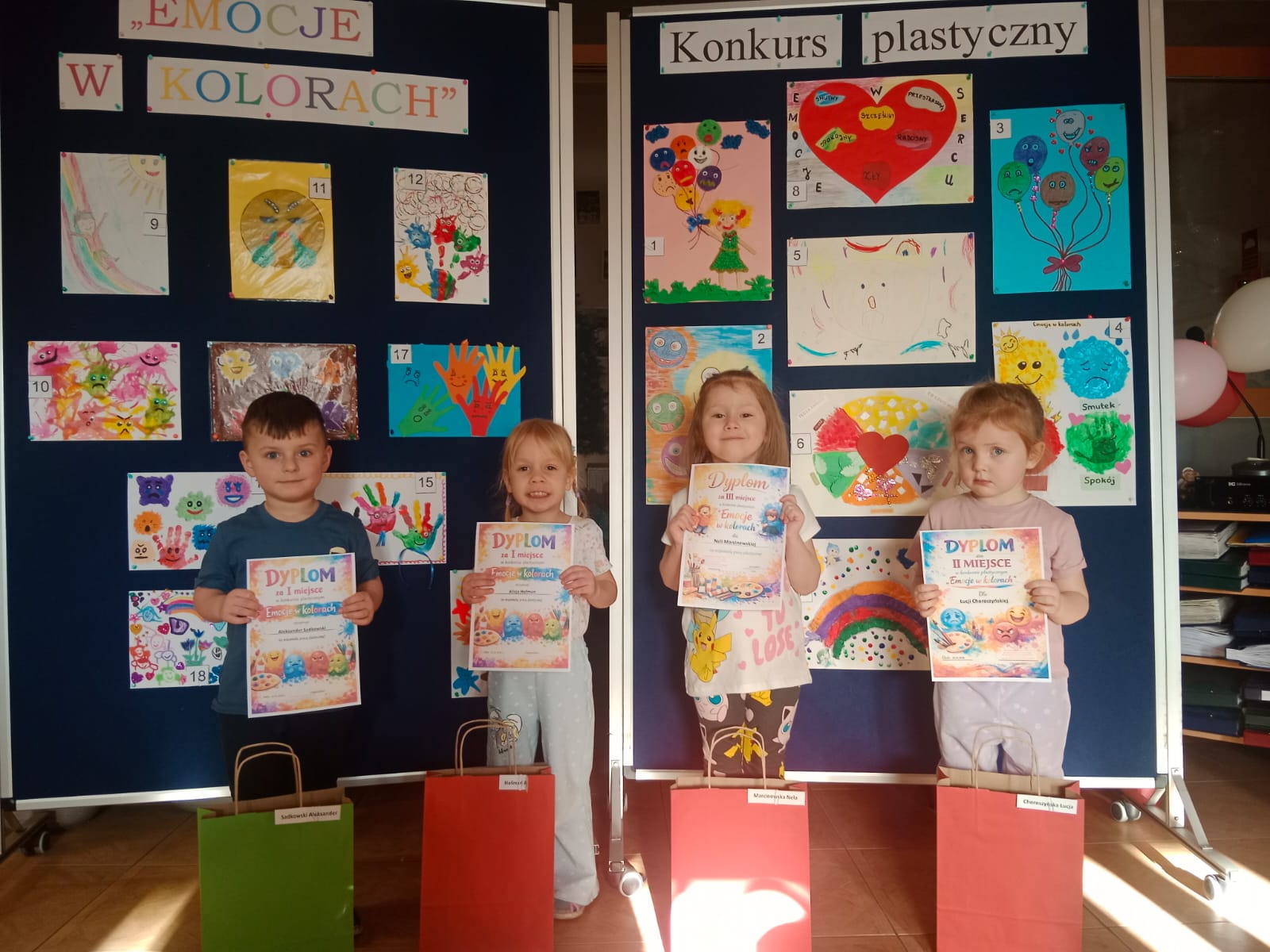 W czwartek 22 stycznia 2026 roku został rozstrzygnięty przedszkolny konkurs plastyczny „Emocje w kolorach”. Zadanie konkursowe polegało na wykonaniu pracy zgodnej z tytułem konkursu z zastosowaniem dowolnej techniki. Celem konkursu było rozpoznawanie, nazywanie i wyrażanie emocji, kształtowanie i rozwijanie zainteresowań artystycznych, rozwijanie umiejętności manualnych dzieci, prezentacja emocji poprzez różne formy aktywności plastycznej. Wykonane prace były oryginalne, ciekawe i staranne. Dzieła naszych przedszkolaków można było podziwiać na wystawie przygotowanej na korytarzu przedszkolnym.