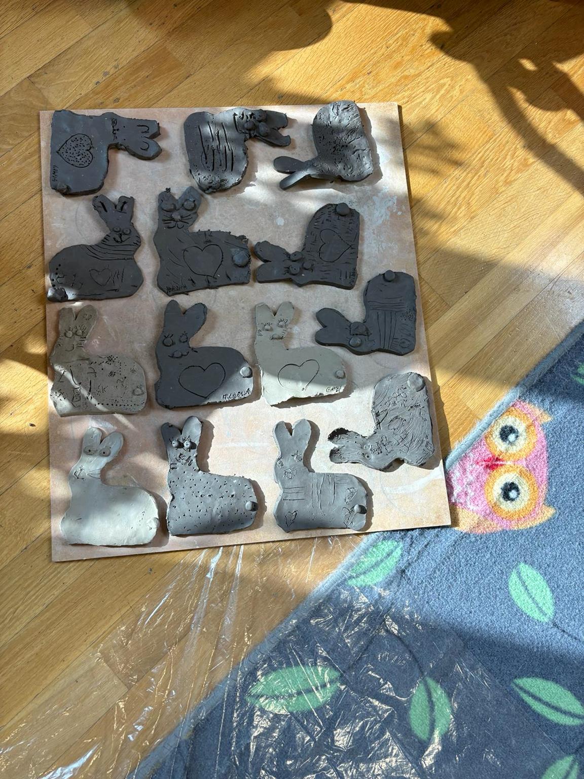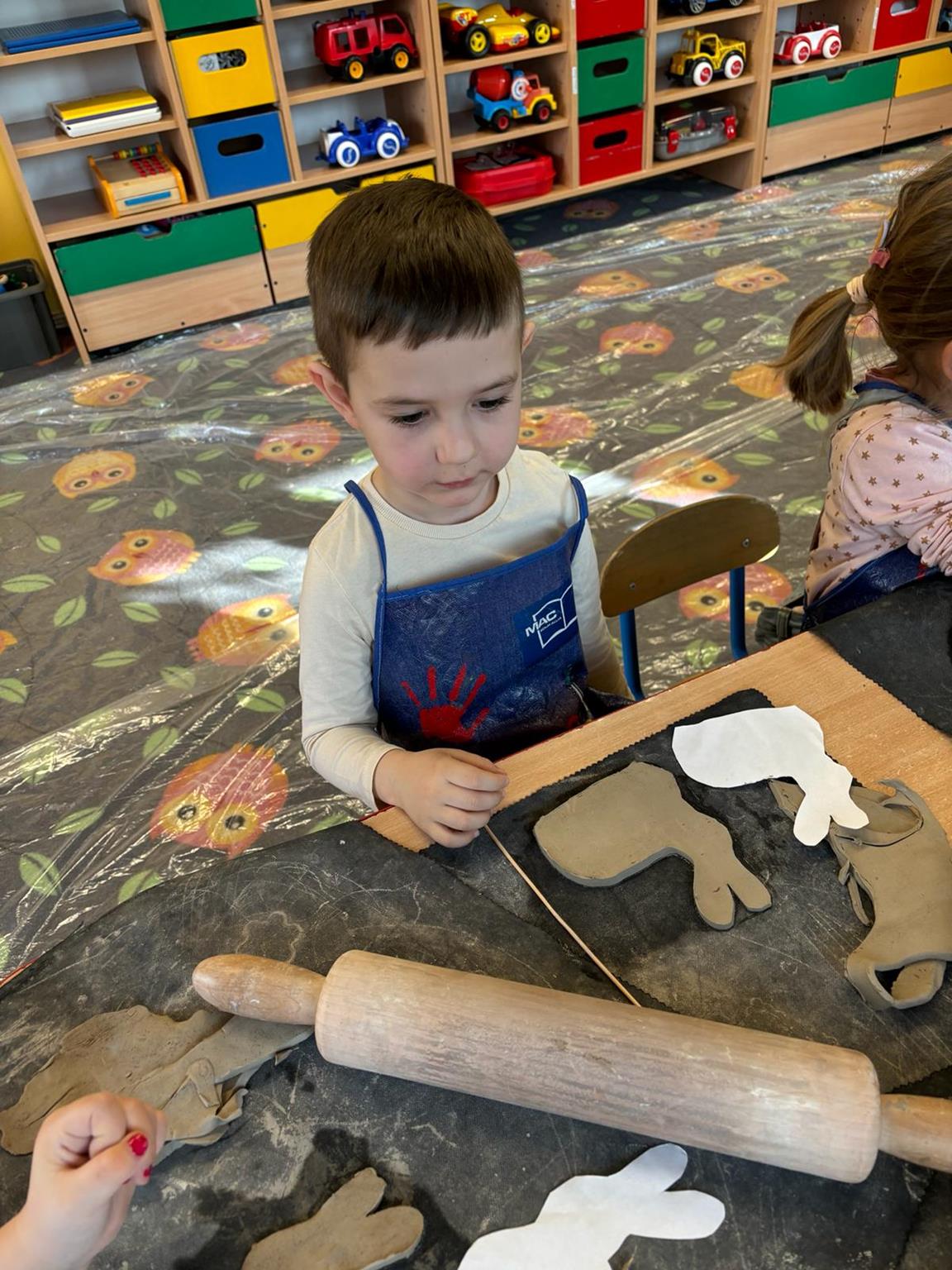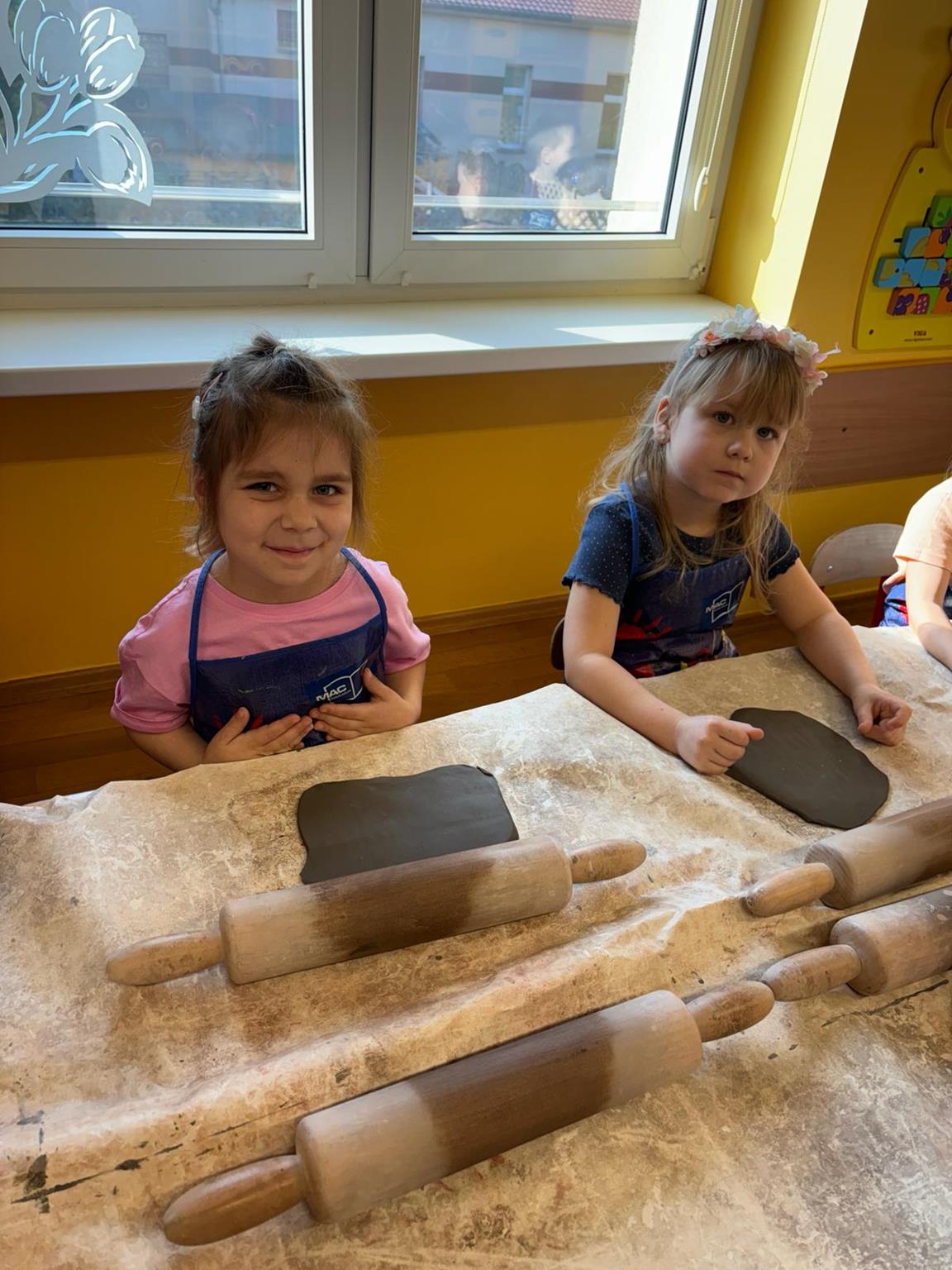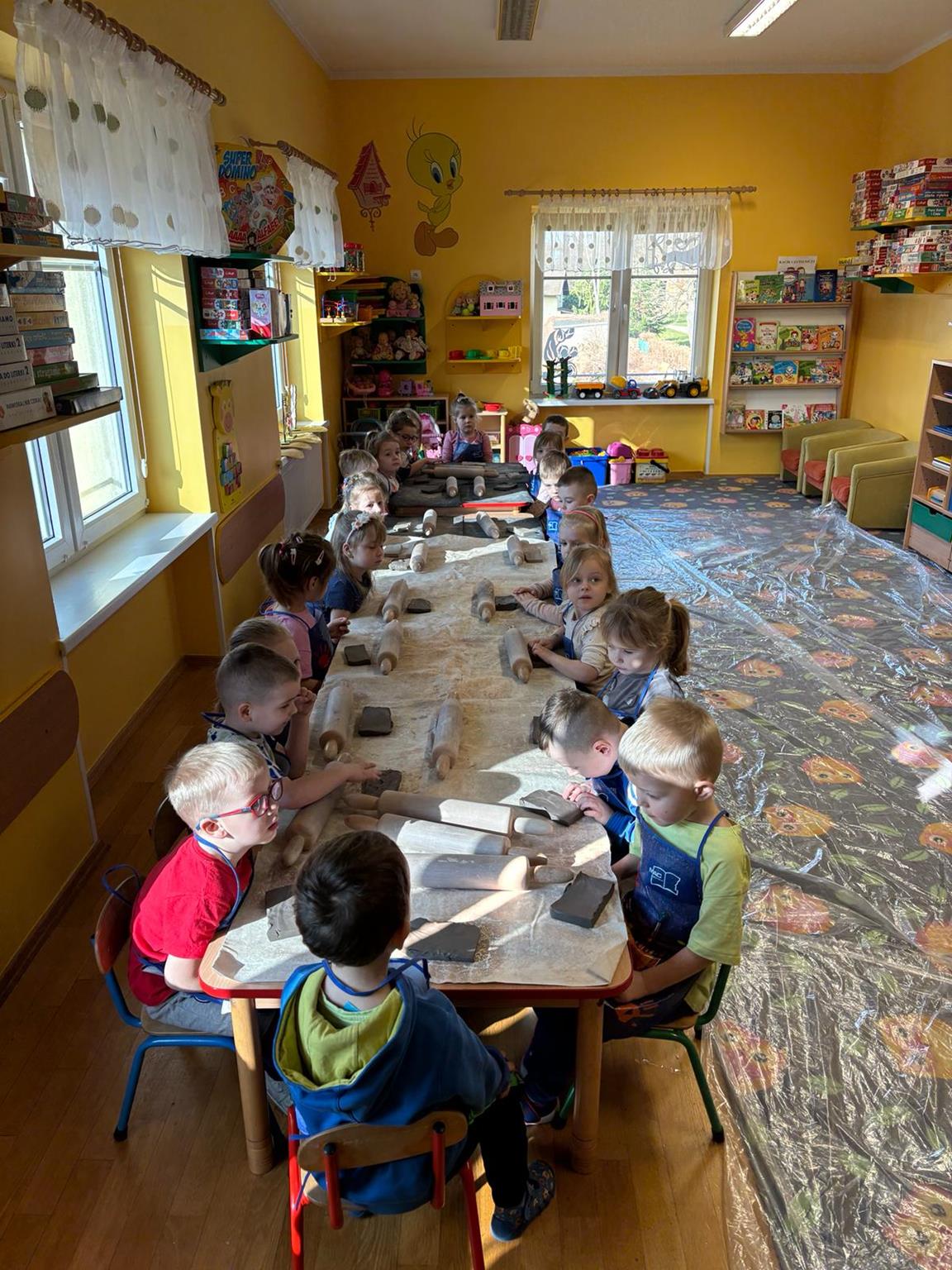 Przedszkolaki z oddziału „Pszczółki” wzięły udział w zajęciach ceramiki. Dzieci miały okazję do zapoznania się z nową techniką plastyczną. Celem zajęć było rozbudzenie u dzieci zainteresowania kształtem, fakturą i materią. Prowadząca zajęcia, Pani Joanna, wprowadziła dzieci w niezwykły świat ceramiki, opowiedziała co to jest ceramika, z czego i w jaki sposób powstaje. Poznaliśmy właściwości gliny i samodzielnie wykonaliśmy zajączki.