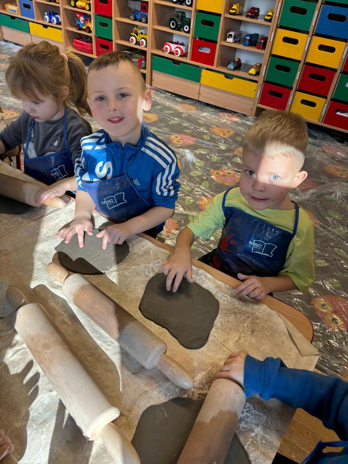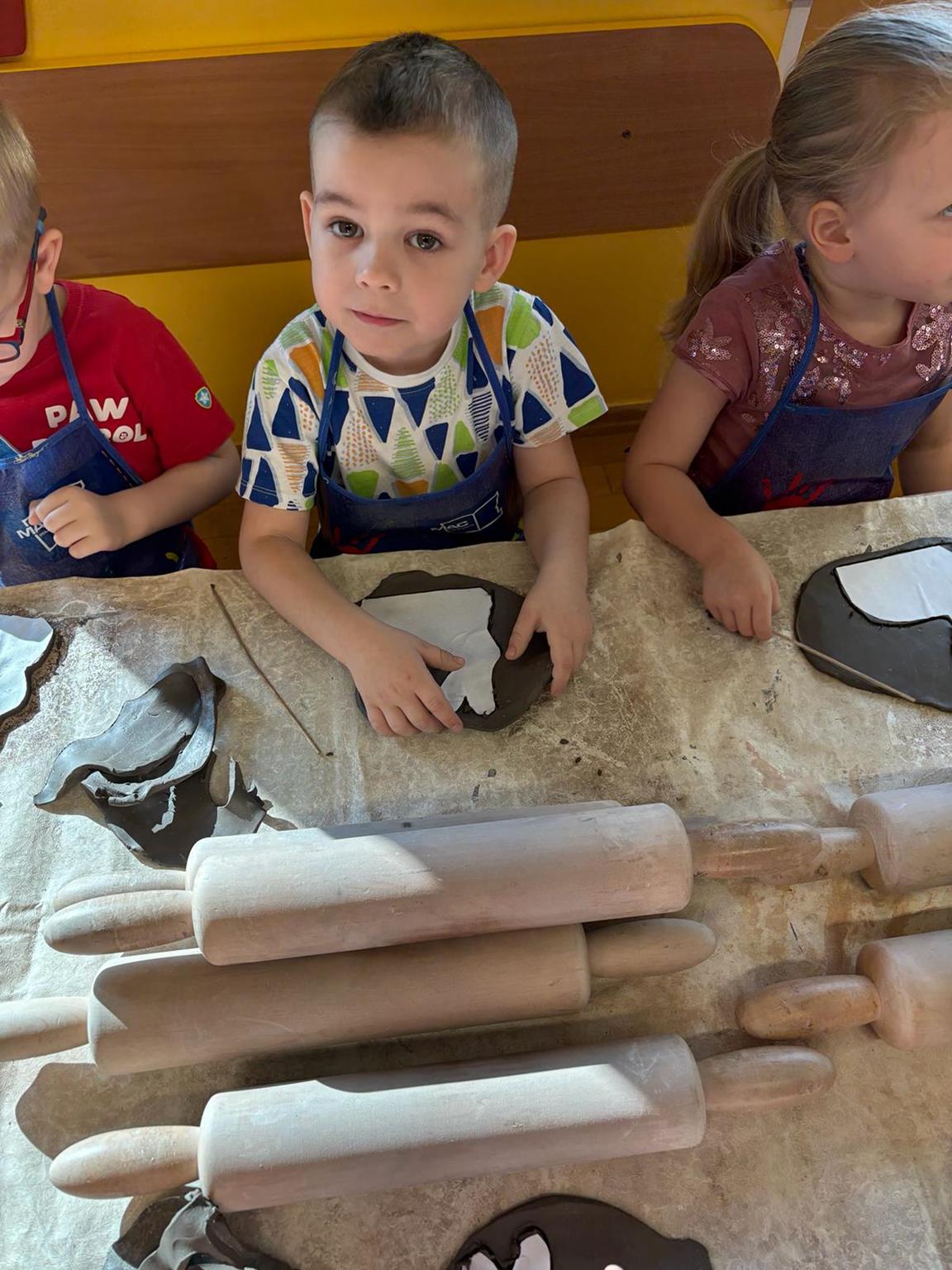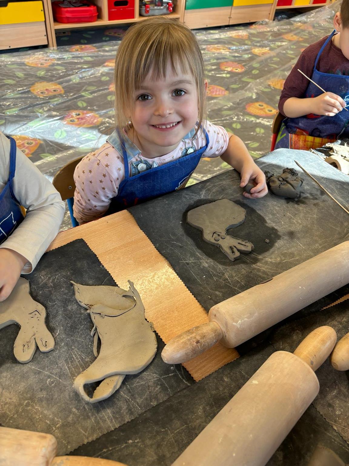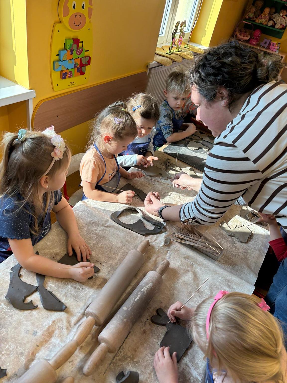Przedszkolaki z oddziału „Pszczółki” wzięły udział w zajęciach ceramiki. Dzieci miały okazję do zapoznania się z nową techniką plastyczną. Celem zajęć było rozbudzenie u dzieci zainteresowania kształtem, fakturą i materią. Prowadząca zajęcia, Pani Joanna, wprowadziła dzieci w niezwykły świat ceramiki, opowiedziała co to jest ceramika, z czego i w jaki sposób powstaje. Poznaliśmy właściwości gliny i samodzielnie wykonaliśmy zajączki.