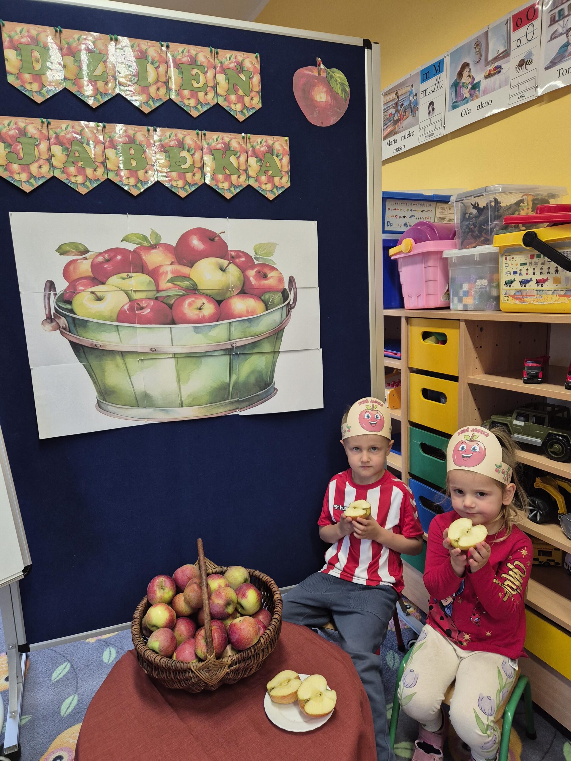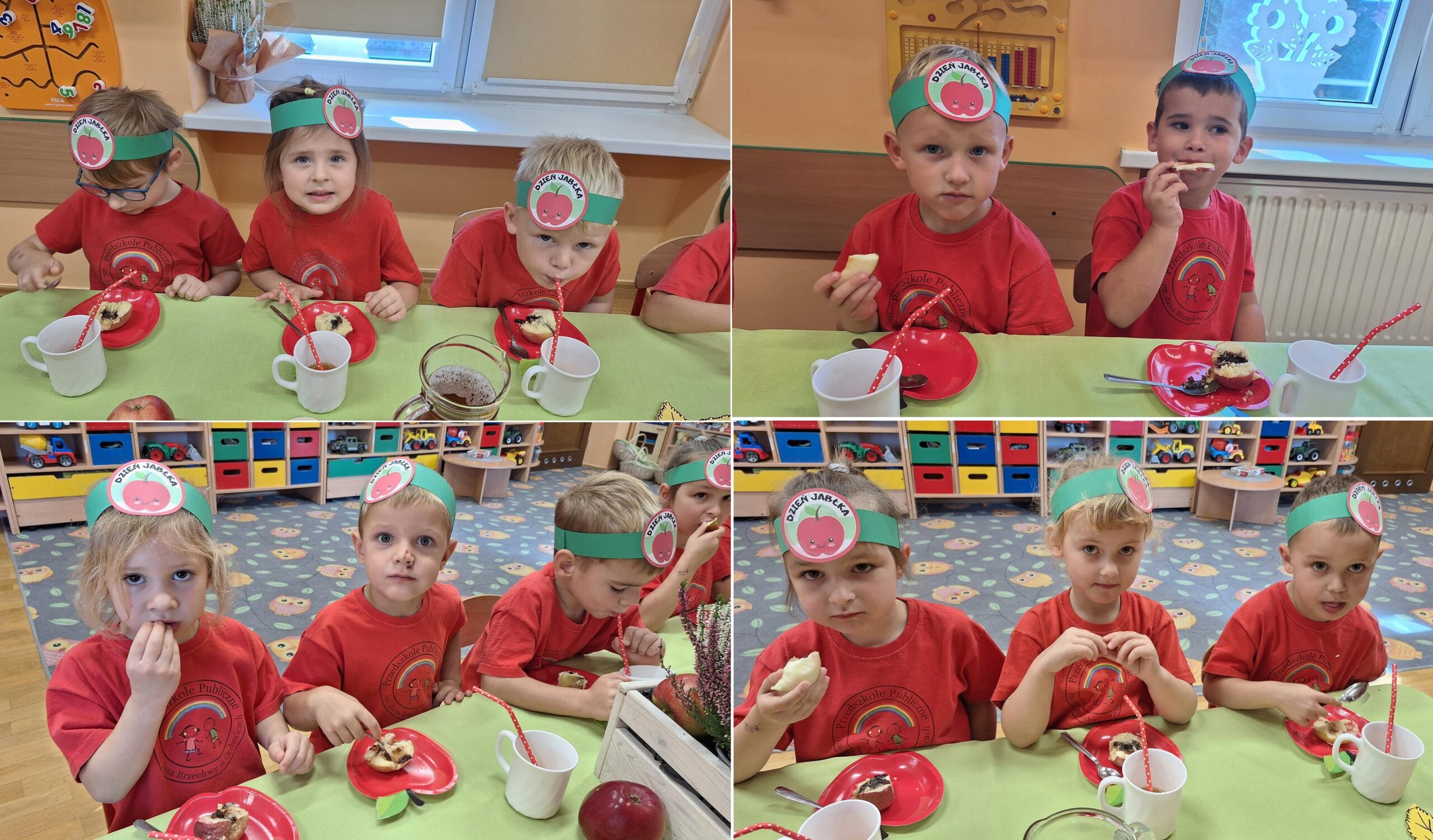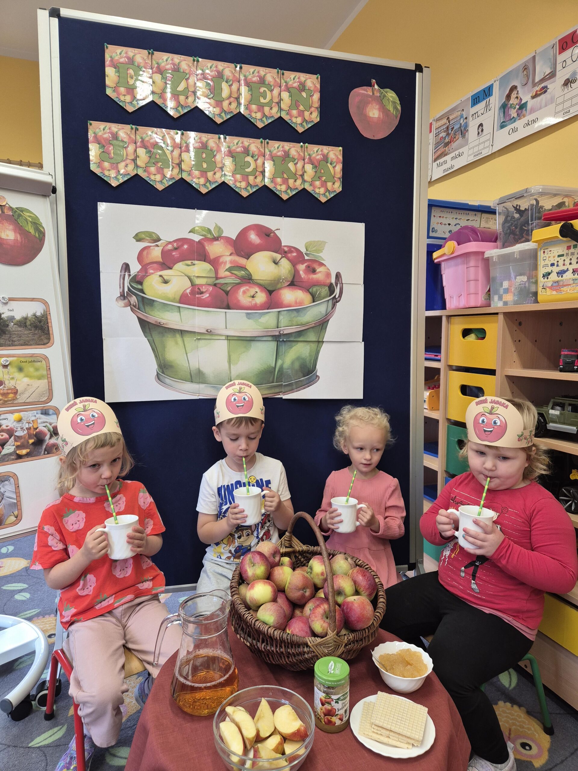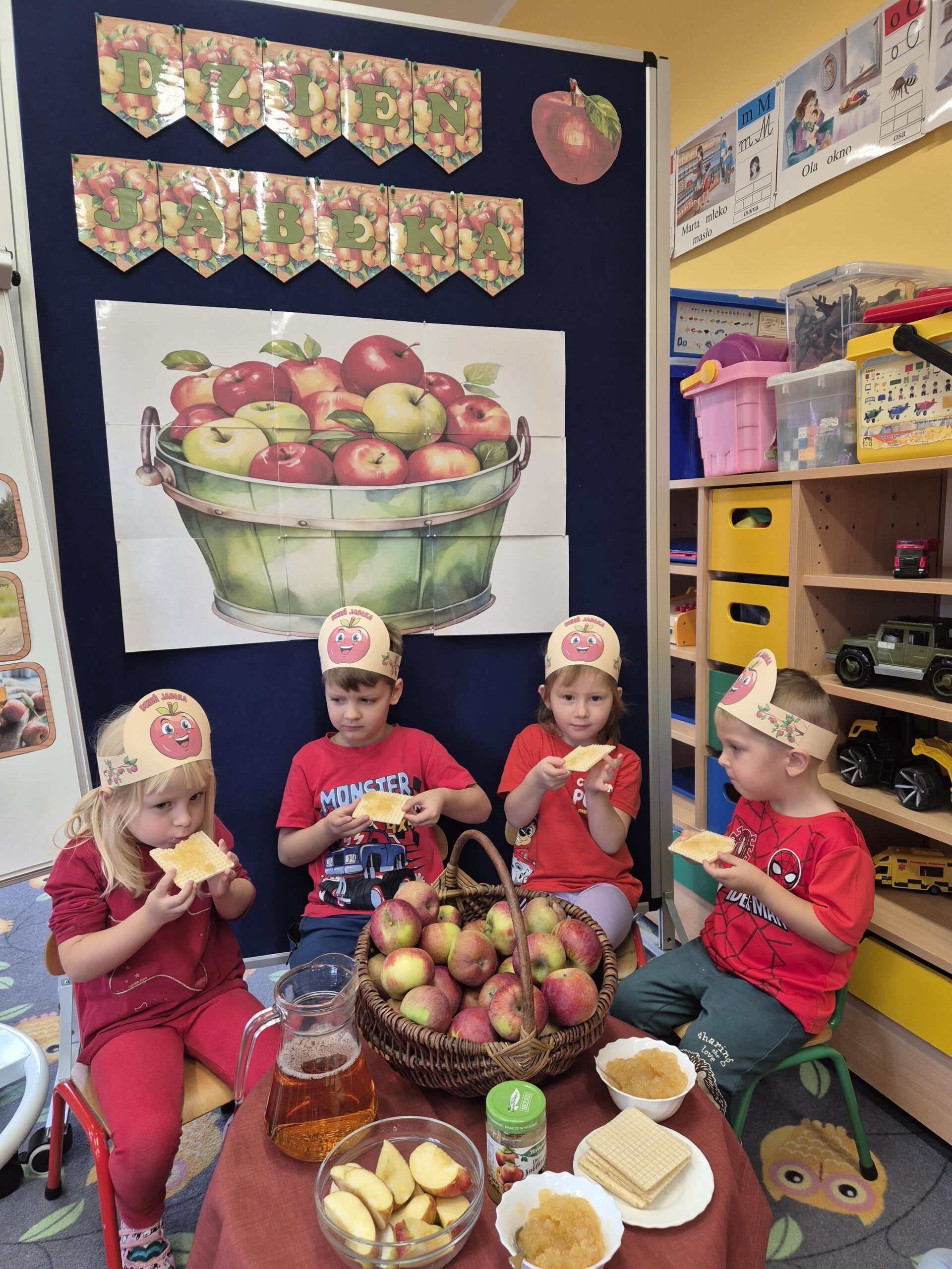 29 września w przedszkolu obchodziliśmy „Dzień Jabłka”. Jabłko jest jednym z najpopularniejszych owoców w naszym kraju i na świecie. Celem zajęć było zachęcenie dzieci do spożywania jabłek i ich przetworów jako źródła witamin. To był bardzo ciekawy dzień w przedszkolu. Dzieci wszechstronnie poszerzały wiedzę o jabłku. Poznawały różne gatunki jabłek, rozpoznawały kształt, zapach, kolor, smak. Zdobywały wiadomości na temat potraw i przetworów z jabłek. Dzień ten był nie tylko dniem innym niż zwykłe, ale dniem, o którym dzieci tak szybko nie zapomną i miejmy nadzieję będą chętnie sięgać po owoce zachowując zdrowy styl życia.