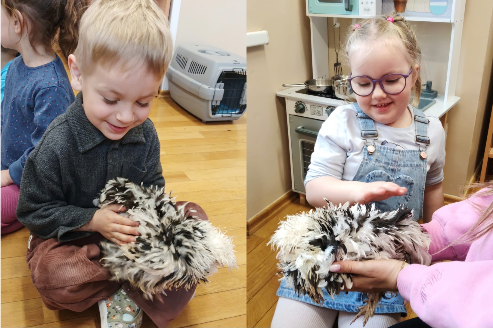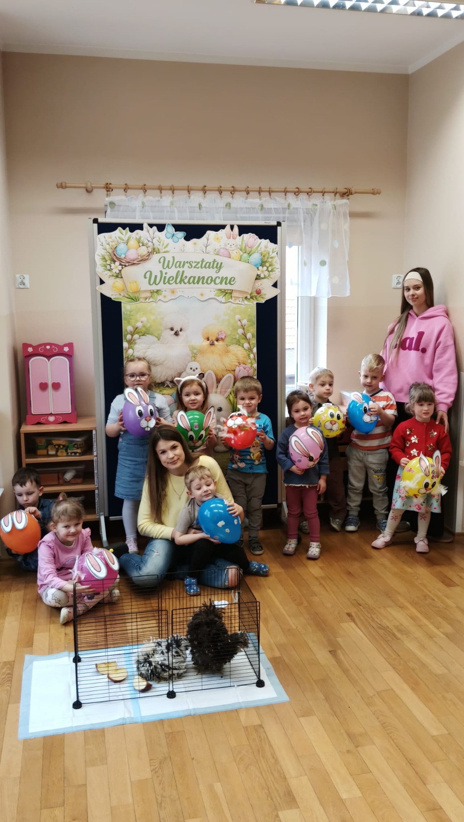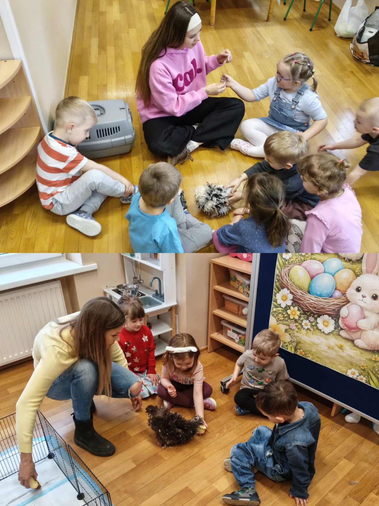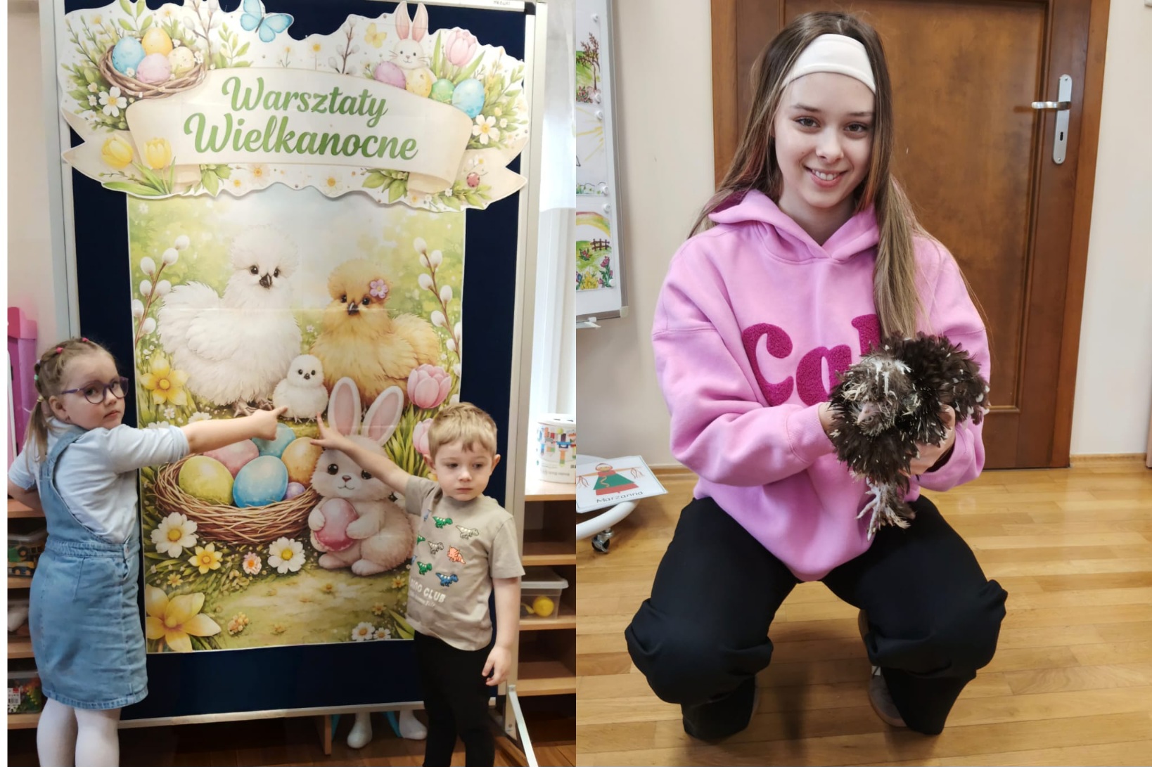 Z okazji zbliżających się Świąt Wielkanocnych w oddziale „Mrówki” odbyły się wyjątkowe warsztaty z udziałem kur rasy silka, połączone z elementami kuroterapii, sprzyjającej wyciszeniu i budowaniu uważności dzieci poprzez kontakt ze zwierzętami. Gościliśmy przedstawicielki hodowli „Silkowy Ogródek”, które w interesujący sposób opowiedziały przedszkolakom o rozwoju kurczaka w jajku, jego odżywianiu oraz zwyczajach tych niezwykłych ptaków. Największe emocje wzbudziła bezpośrednia interakcja z kurami – dzieci mogły je obserwować z bliska, delikatnie głaskać, brać na ręce, a także je karmić. Z dużym skupieniem przyglądały się kurkom ich zachowaniu, reakcją na każdy ruch i dźwięk pochodzący z otoczenia. Uzupełnieniem miłego spotkania było wykonanie prac plastycznych inspirowanych tematyką wielkanocną i kurami – dzieci tworzyły barwne zające i pisanki, rozwijając wyobraźnię i zdolności manualne. Warsztaty dostarczyły wielu pozytywnych wrażeń i stały się pięknym wprowadzeniem w świąteczny, wielkanocny czas.