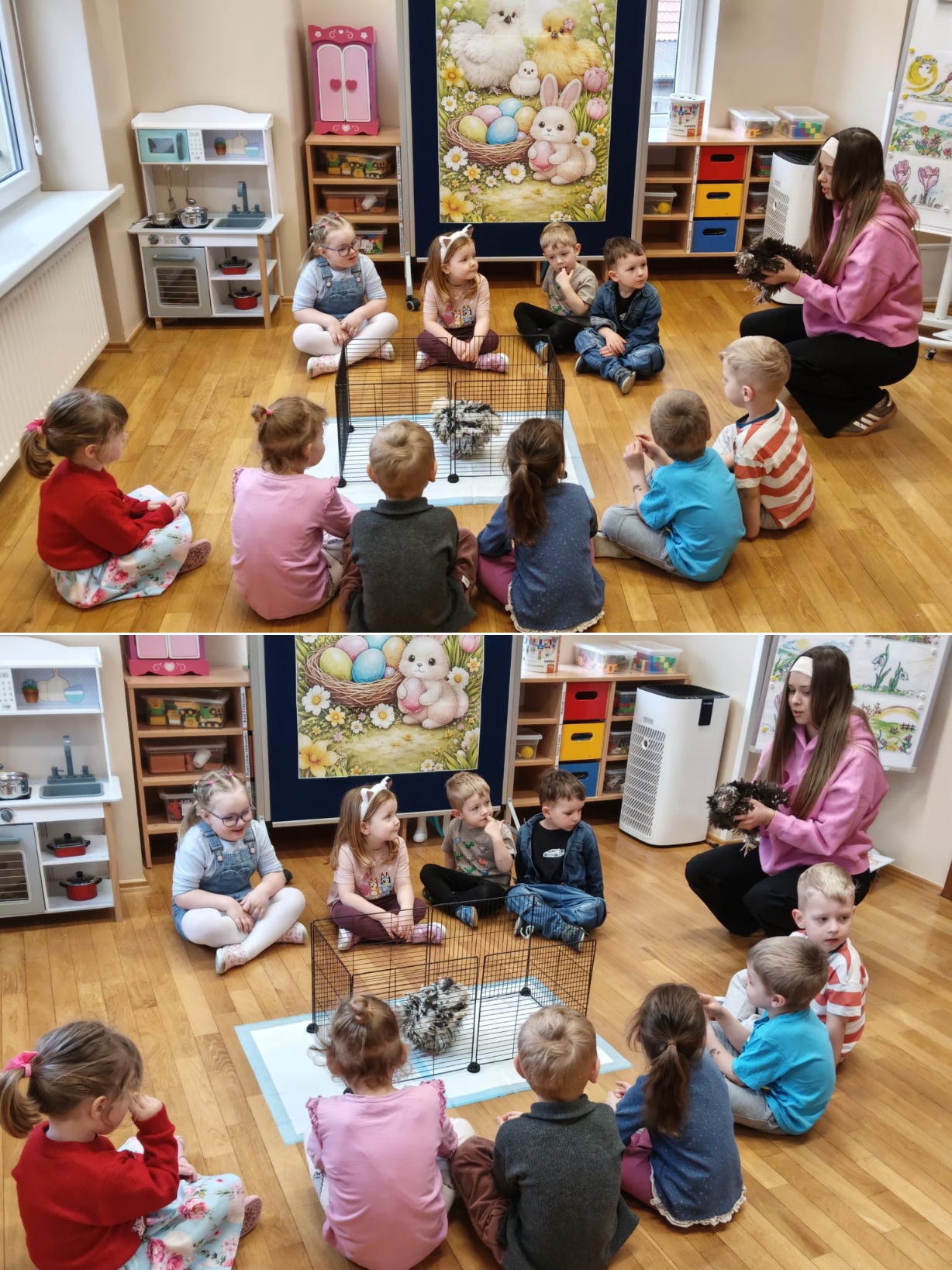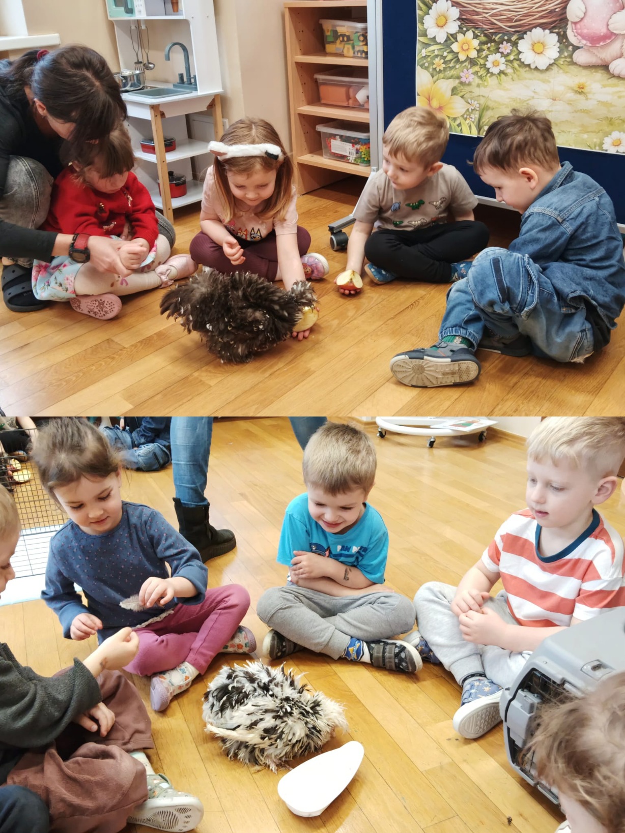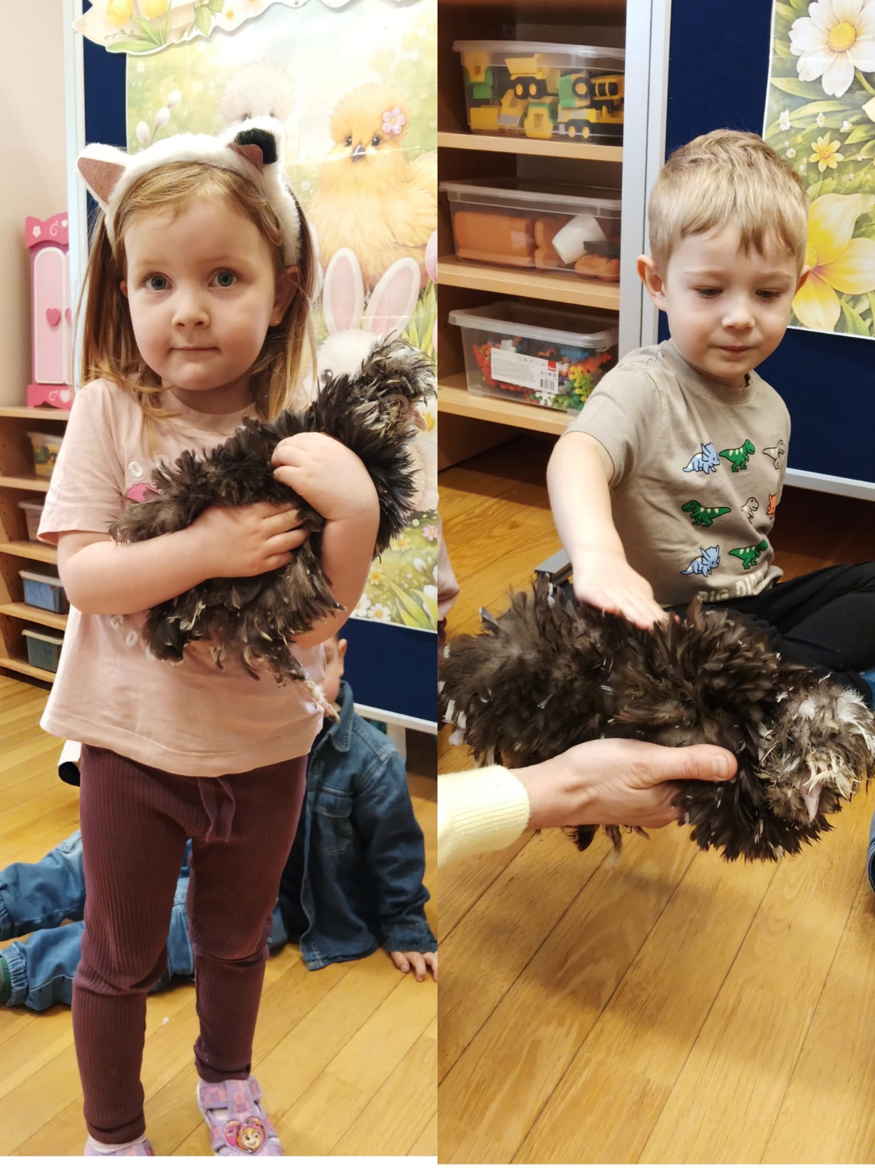 Z okazji zbliżających się Świąt Wielkanocnych w oddziale „Mrówki” odbyły się wyjątkowe warsztaty z udziałem kur rasy silka, połączone z elementami kuroterapii, sprzyjającej wyciszeniu i budowaniu uważności dzieci poprzez kontakt ze zwierzętami. Gościliśmy przedstawicielki hodowli „Silkowy Ogródek”, które w interesujący sposób opowiedziały przedszkolakom o rozwoju kurczaka w jajku, jego odżywianiu oraz zwyczajach tych niezwykłych ptaków. Największe emocje wzbudziła bezpośrednia interakcja z kurami – dzieci mogły je obserwować z bliska, delikatnie głaskać, brać na ręce, a także je karmić. Z dużym skupieniem przyglądały się kurkom ich zachowaniu, reakcją na każdy ruch i dźwięk pochodzący z otoczenia. Uzupełnieniem miłego spotkania było wykonanie prac plastycznych inspirowanych tematyką wielkanocną i kurami – dzieci tworzyły barwne zające i pisanki, rozwijając wyobraźnię i zdolności manualne. Warsztaty dostarczyły wielu pozytywnych wrażeń i stały się pięknym wprowadzeniem w świąteczny, wielkanocny czas.