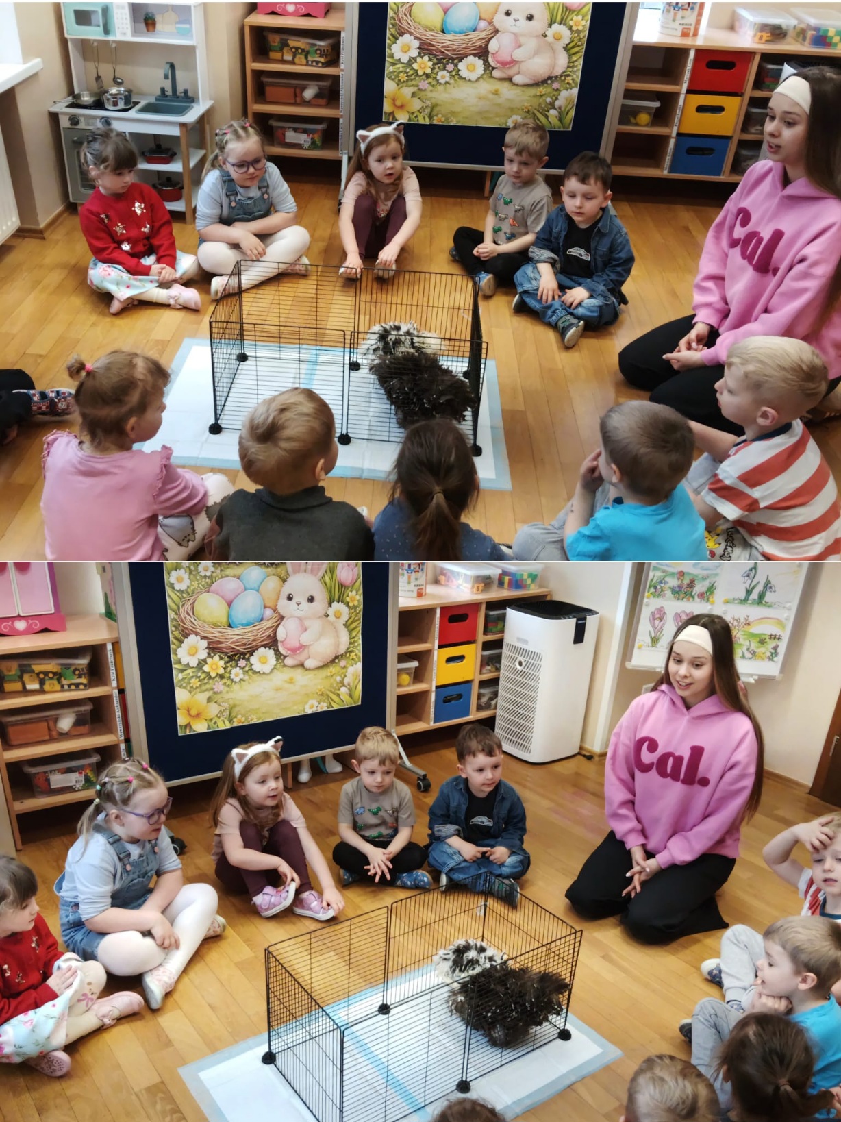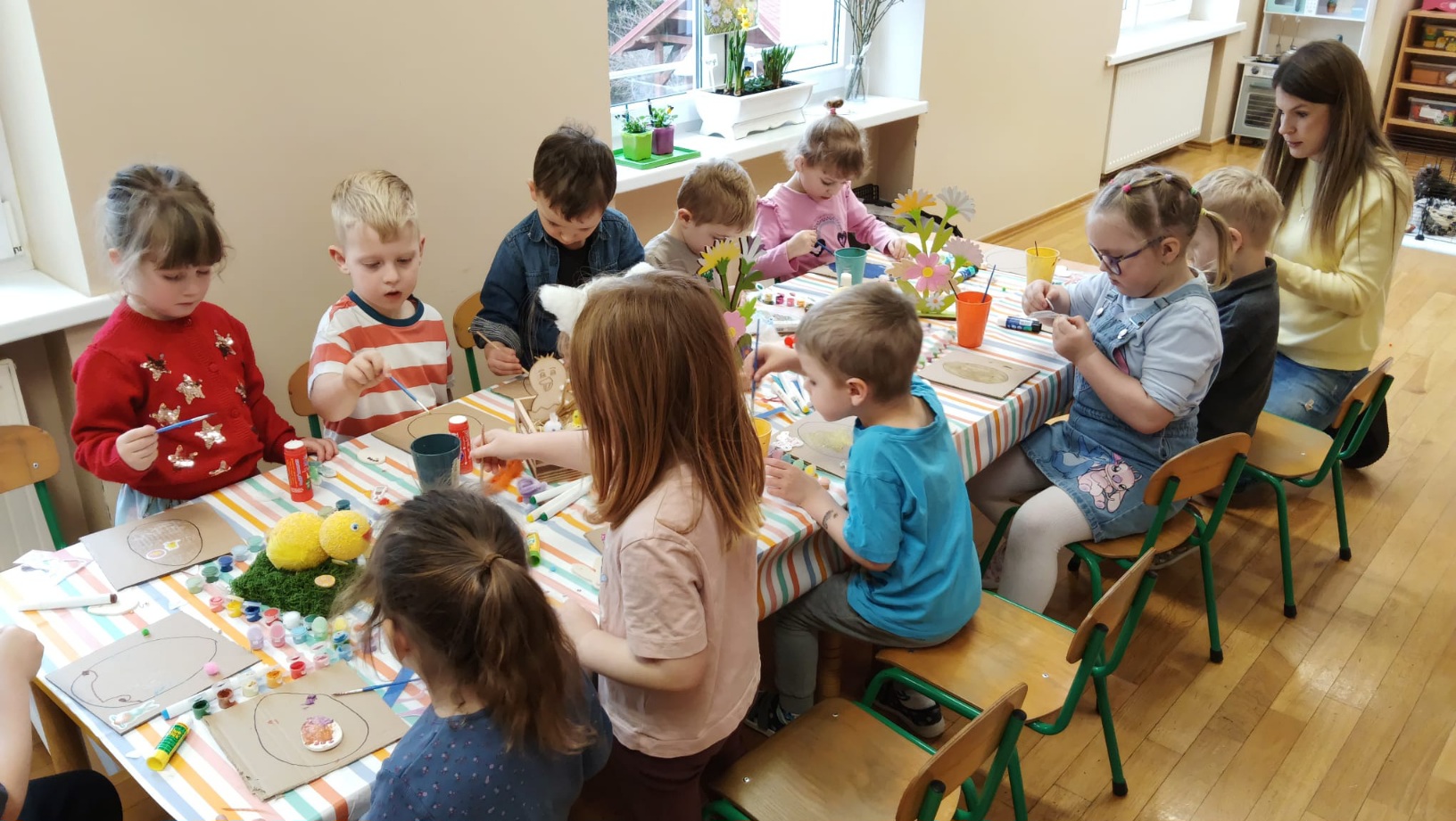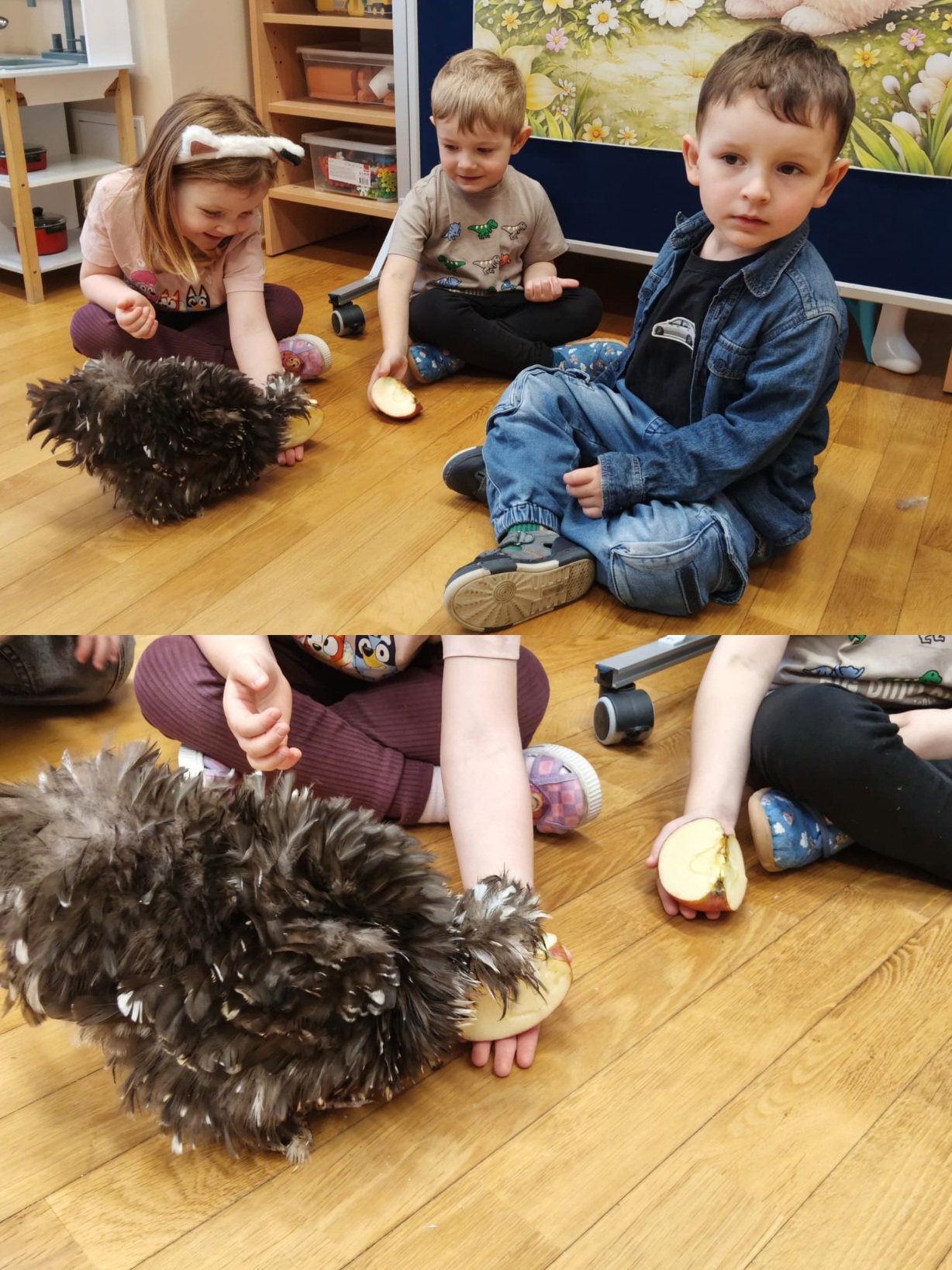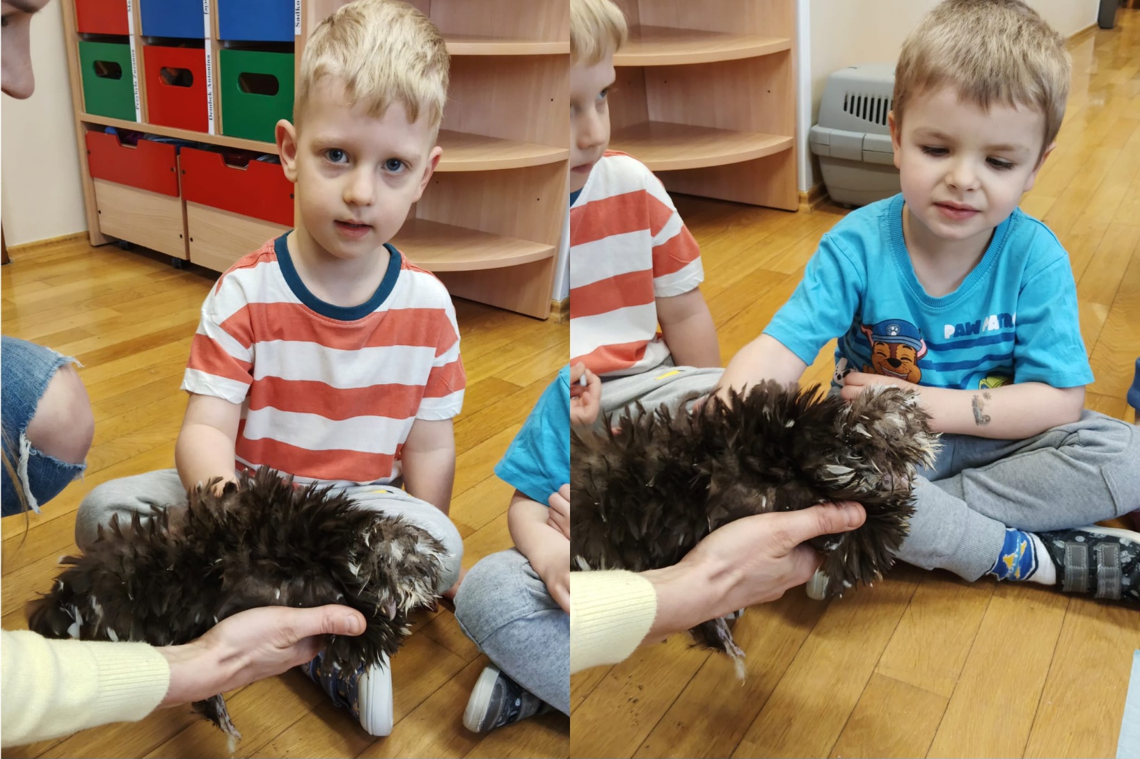 Z okazji zbliżających się Świąt Wielkanocnych w oddziale „Mrówki” odbyły się wyjątkowe warsztaty z udziałem kur rasy silka, połączone z elementami kuroterapii, sprzyjającej wyciszeniu i budowaniu uważności dzieci poprzez kontakt ze zwierzętami. Gościliśmy przedstawicielki hodowli „Silkowy Ogródek”, które w interesujący sposób opowiedziały przedszkolakom o rozwoju kurczaka w jajku, jego odżywianiu oraz zwyczajach tych niezwykłych ptaków. Największe emocje wzbudziła bezpośrednia interakcja z kurami – dzieci mogły je obserwować z bliska, delikatnie głaskać, brać na ręce, a także je karmić. Z dużym skupieniem przyglądały się kurkom ich zachowaniu, reakcją na każdy ruch i dźwięk pochodzący z otoczenia. Uzupełnieniem miłego spotkania było wykonanie prac plastycznych inspirowanych tematyką wielkanocną i kurami – dzieci tworzyły barwne zające i pisanki, rozwijając wyobraźnię i zdolności manualne. Warsztaty dostarczyły wielu pozytywnych wrażeń i stały się pięknym wprowadzeniem w świąteczny, wielkanocny czas.
