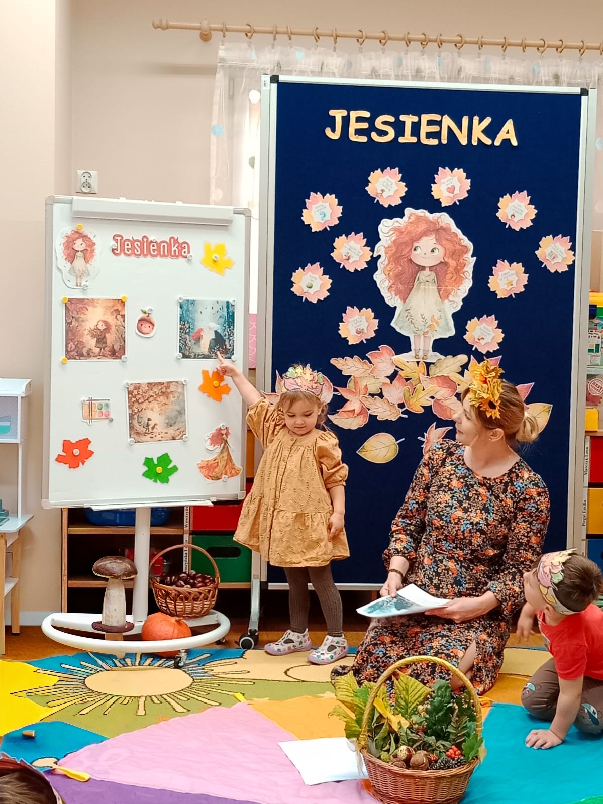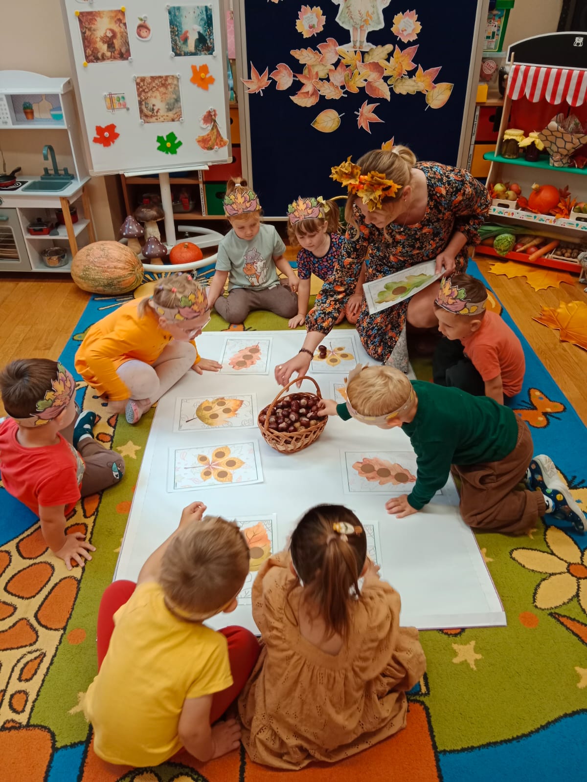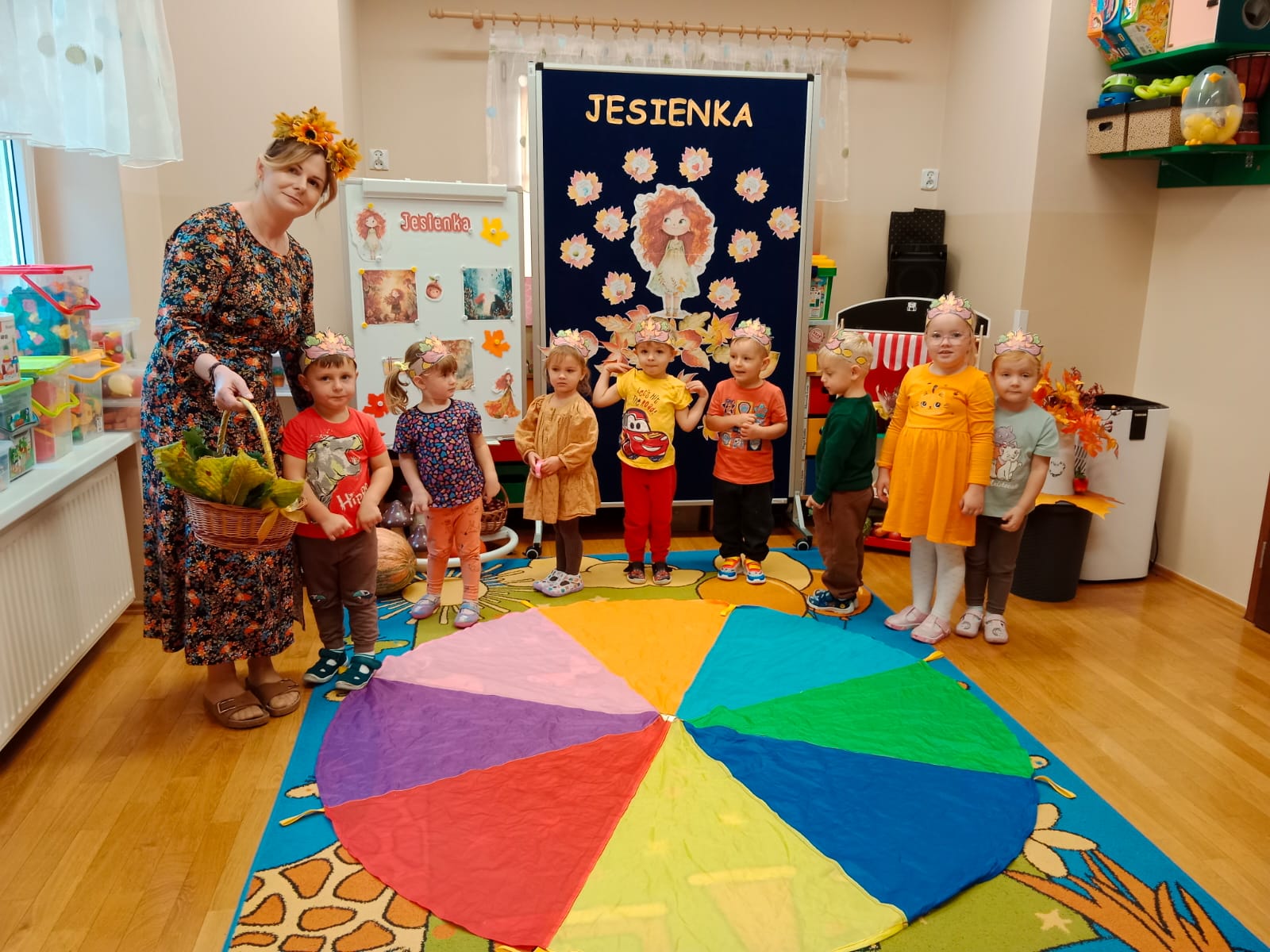 Idzie drogą Pani Jesień, kosz z darami do nas niesie…Do oddziału przedszkolnego „Mrówki” dotarła jesienna pora roku, na czele z Panią Jesienią, którą przedszkolaki radośnie powitały. Podczas wspólnej rozmowy z Jesienką rozpoznawały zwiastuny tej pory roku. Dzieci uczestniczyły w jesiennych zajęciach dydaktycznych, wykonały pracę plastyczną inspirowaną jesienią i przeprowadziły doświadczenie z cieczą nienewtonowską. W sali rozbrzmiewały wesołe piosenki o jesieni, przy których dzieci chętnie tańczyły i wykonywały proste układy ruchowe. Dzięki temu mogły utrwalić poznane treści i jednocześnie rozładować energię. Na zakończenie zajęć na dzieci czekała piękna, klimatyczna sesja zdjęciowa z wykorzystaniem jesiennych dekoracji. Zdjęcia oddają radosną atmosferę panującą w grupie oraz piękno tej barwnej pory roku.