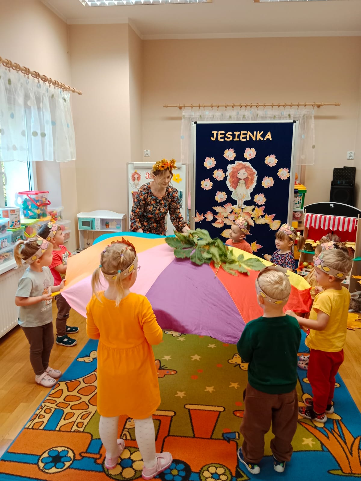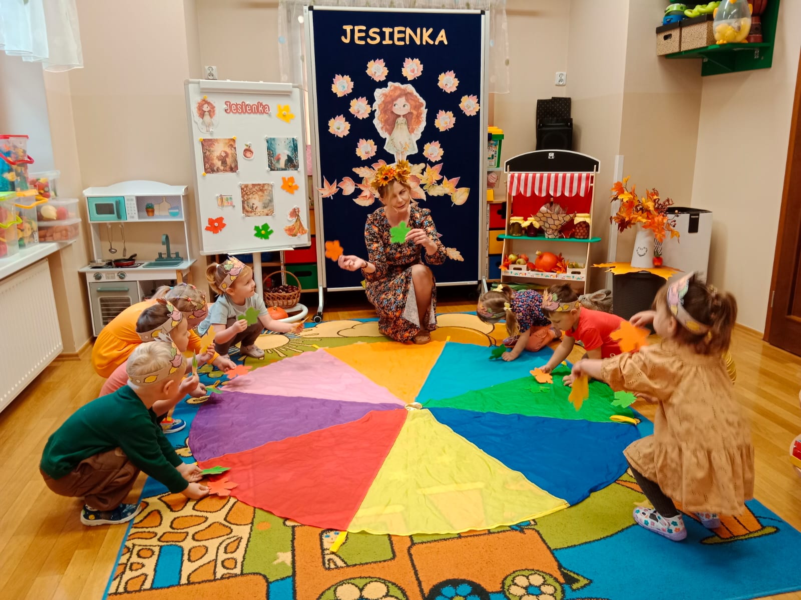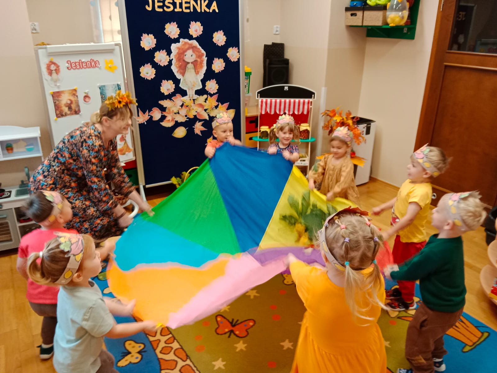 Idzie drogą Pani Jesień, kosz z darami do nas niesie…Do oddziału przedszkolnego „Mrówki” dotarła jesienna pora roku, na czele z Panią Jesienią, którą przedszkolaki radośnie powitały. Podczas wspólnej rozmowy z Jesienką rozpoznawały zwiastuny tej pory roku. Dzieci uczestniczyły w jesiennych zajęciach dydaktycznych, wykonały pracę plastyczną inspirowaną jesienią i przeprowadziły doświadczenie z cieczą nienewtonowską. W sali rozbrzmiewały wesołe piosenki o jesieni, przy których dzieci chętnie tańczyły i wykonywały proste układy ruchowe. Dzięki temu mogły utrwalić poznane treści i jednocześnie rozładować energię. Na zakończenie zajęć na dzieci czekała piękna, klimatyczna sesja zdjęciowa z wykorzystaniem jesiennych dekoracji. Zdjęcia oddają radosną atmosferę panującą w grupie oraz piękno tej barwnej pory roku.