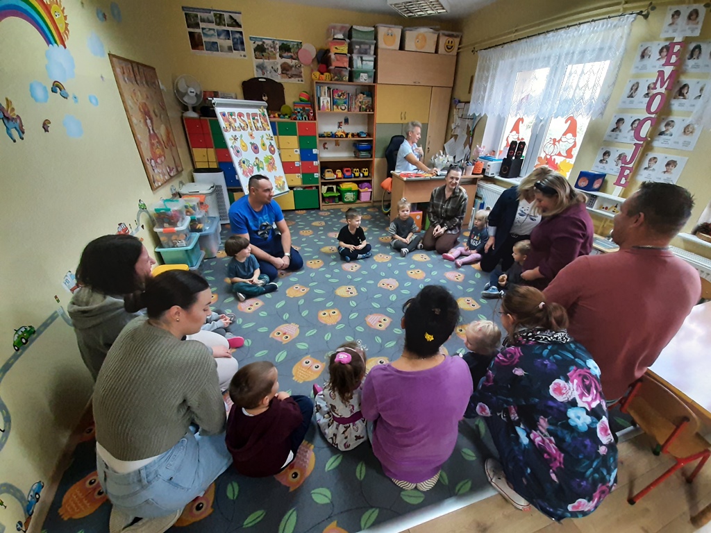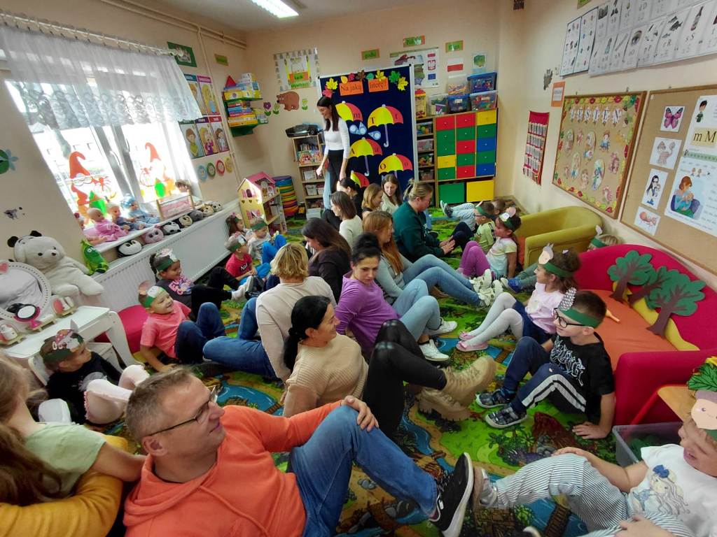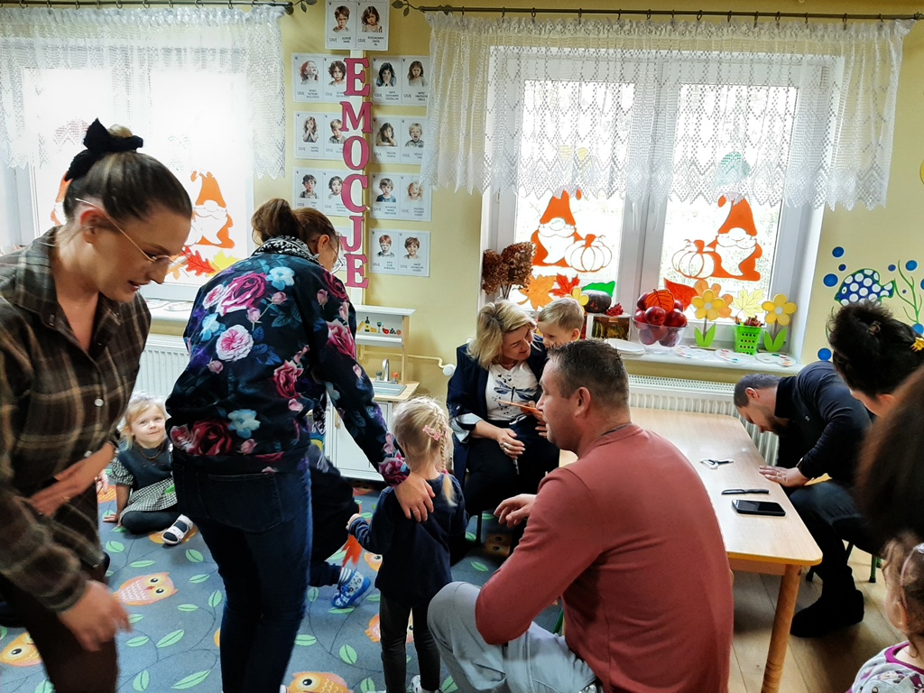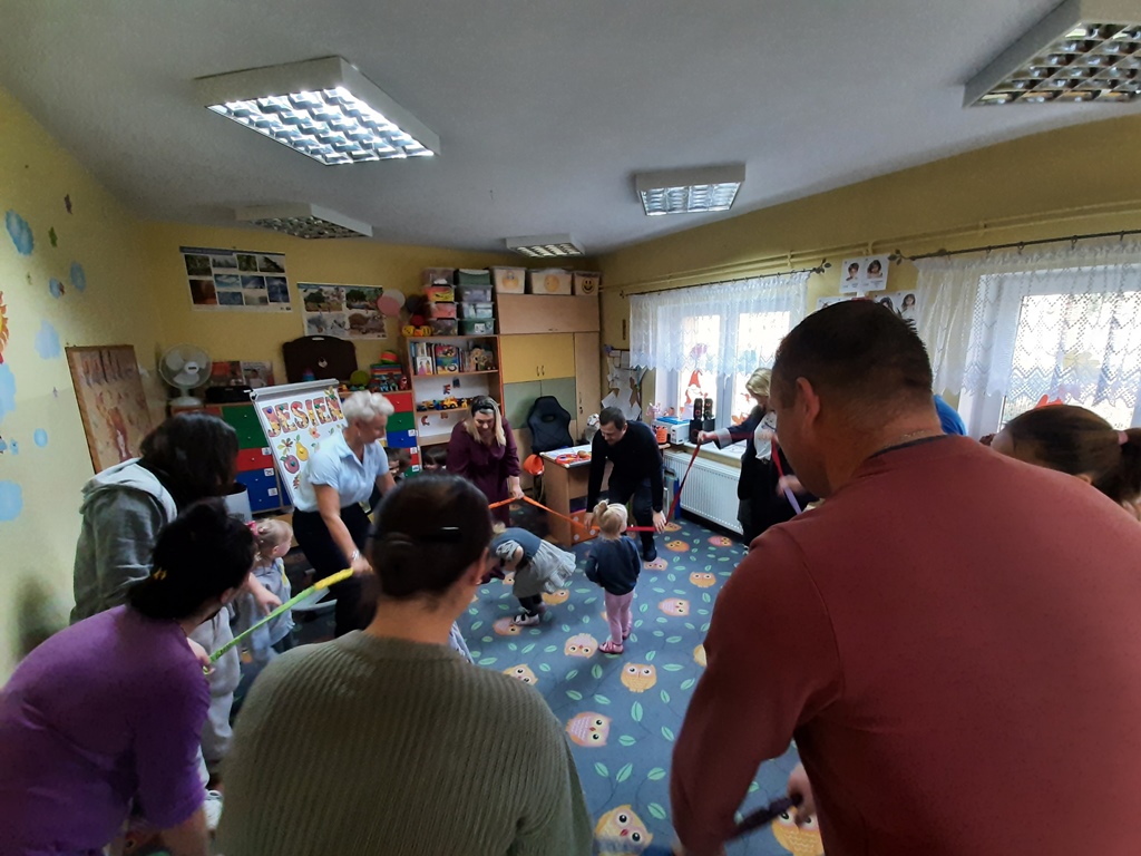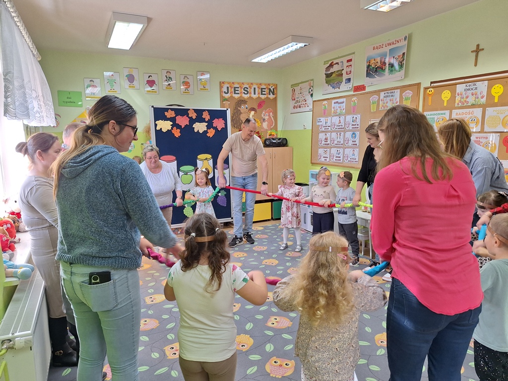 Spotkanie przebiegło w radosnej atmosferze. Rodzice z zaangażowaniem uczestniczyli w zabawach, a dzieci z dumą reprezentowały swoje umiejętności.