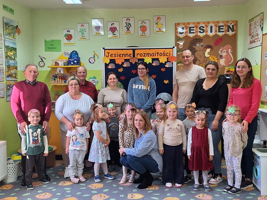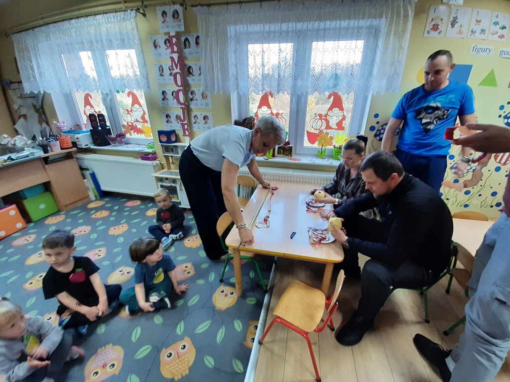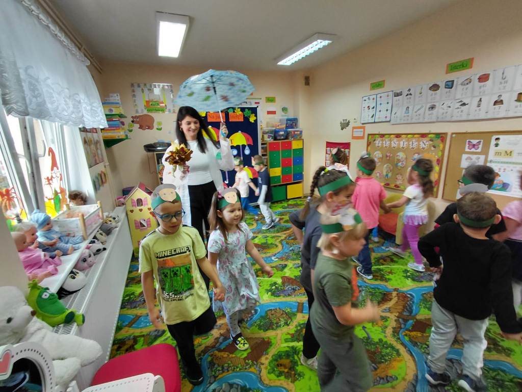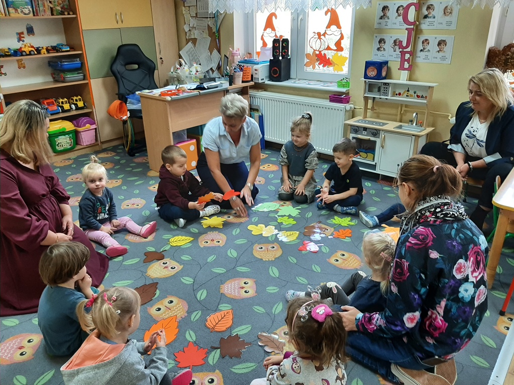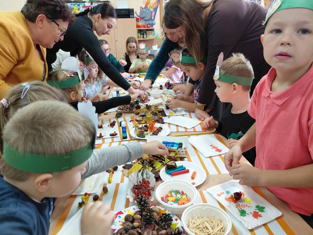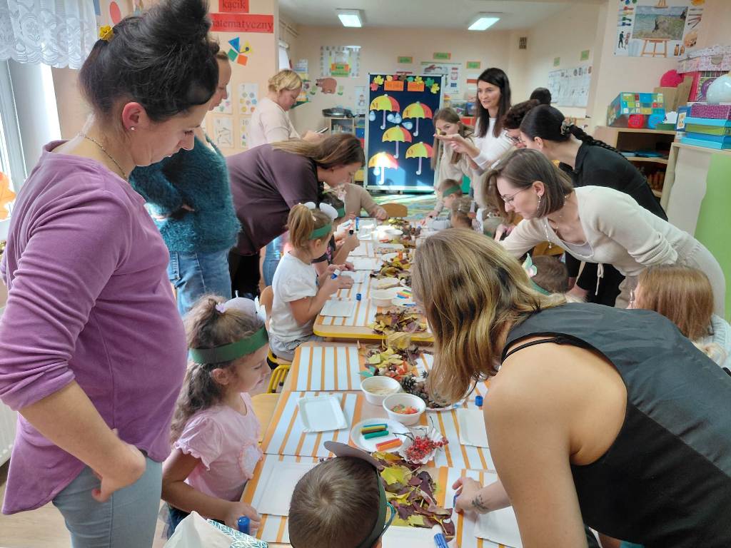 Jesień to pora roku pełna barw i inspiracji do różnorodnych zabaw i działań w przedszkolu. Tak też zorganizowane zajęcia otwarte dla rodziców odbyły się w jesiennej, ciepłej atmosferze. Celem spotkania było zaprezentowanie umiejętności dzieci zdobytych podczas realizacji tematyki jesiennej oraz wspólna zabawa integracyjna z rodzicami. Przedszkolaki omawiały zmiany zachodzące w przyrodzie, wymieniały dary jesieni, które wykorzystywane były do zabaw dydaktycznych, plastycznych i ruchowych. Zabawy te rozwijają u dzieci wyobraźnię, zdolności manualne oraz umiejętność współpracy w grupie.