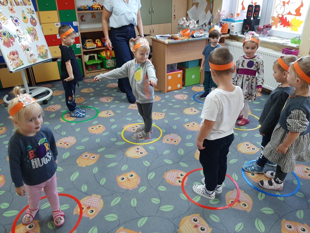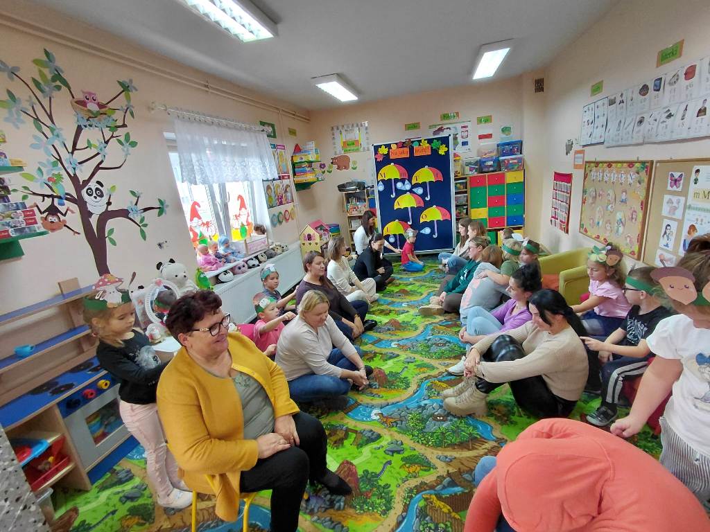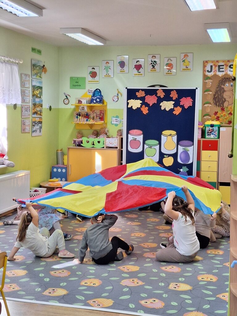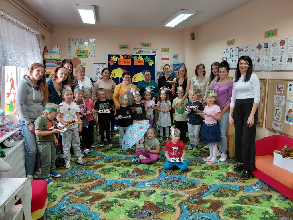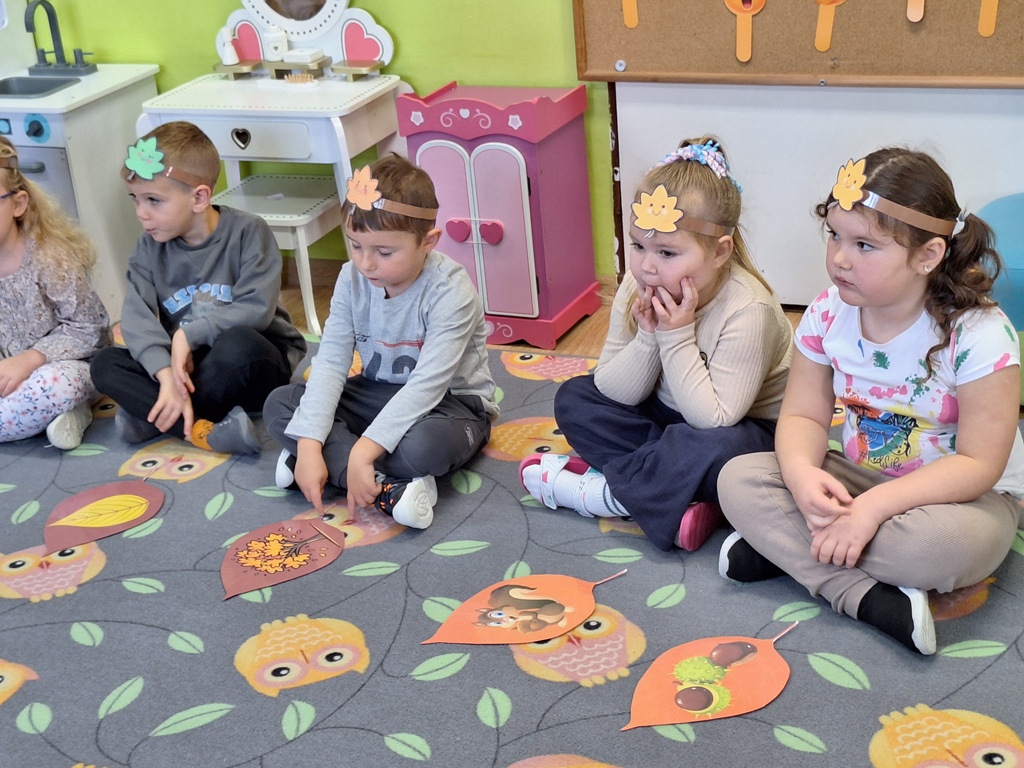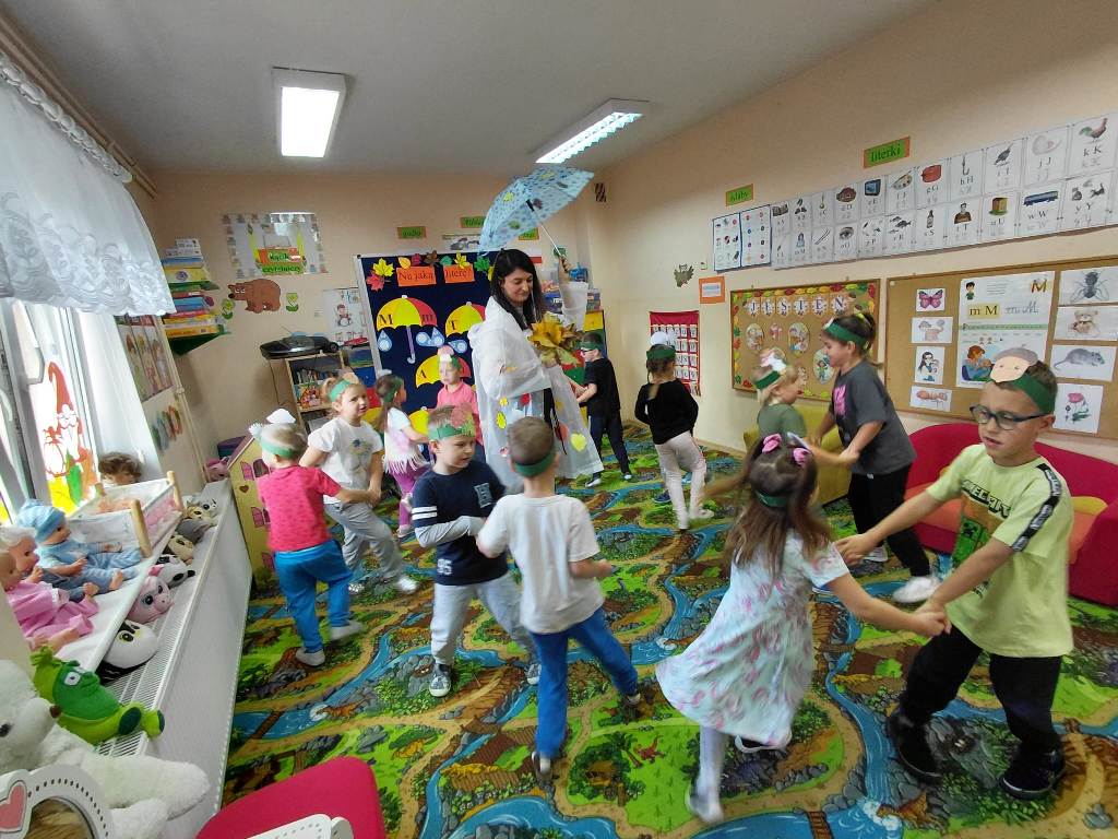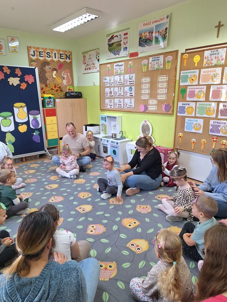 Jesień to pora roku pełna barw i inspiracji do różnorodnych zabaw i działań w przedszkolu. Tak też zorganizowane zajęcia otwarte dla rodziców odbyły się w jesiennej, ciepłej atmosferze. Celem spotkania było zaprezentowanie umiejętności dzieci zdobytych podczas realizacji tematyki jesiennej oraz wspólna zabawa integracyjna z rodzicami. Przedszkolaki omawiały zmiany zachodzące w przyrodzie, wymieniały dary jesieni, które wykorzystywane były do zabaw dydaktycznych, plastycznych i ruchowych. Zabawy te rozwijają u dzieci wyobraźnię, zdolności manualne oraz umiejętność współpracy w grupie.
