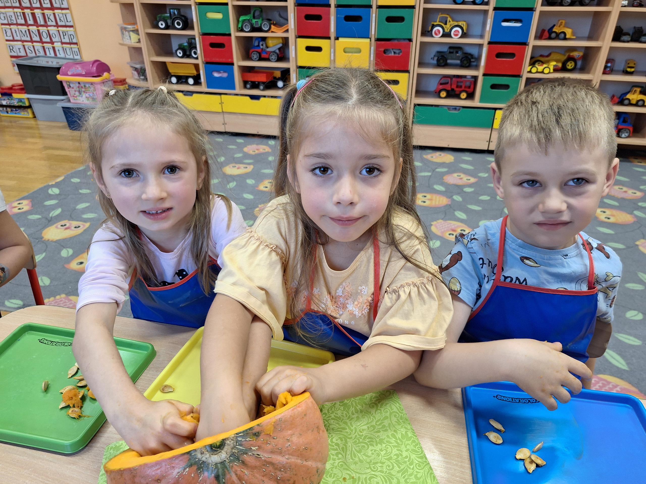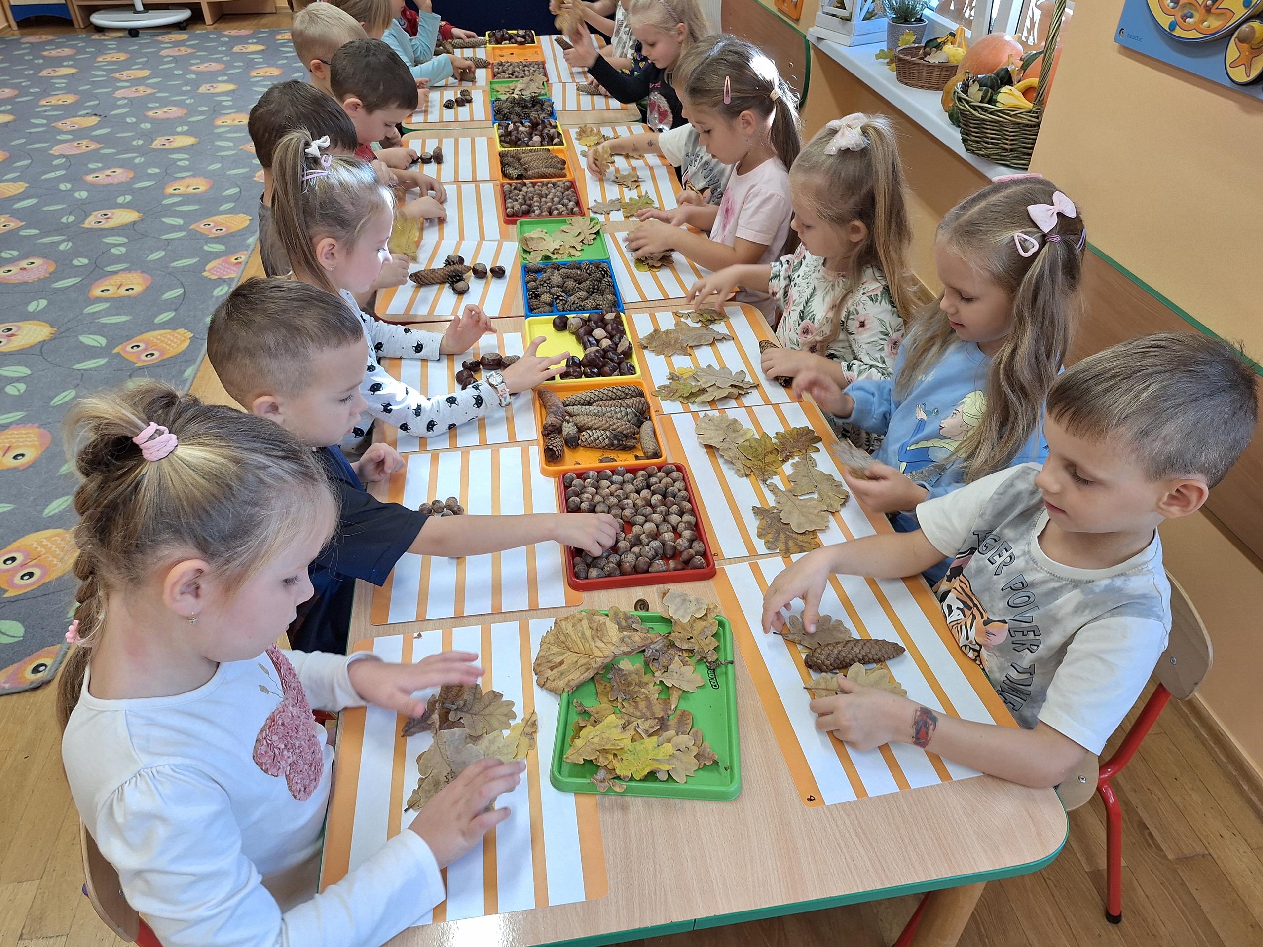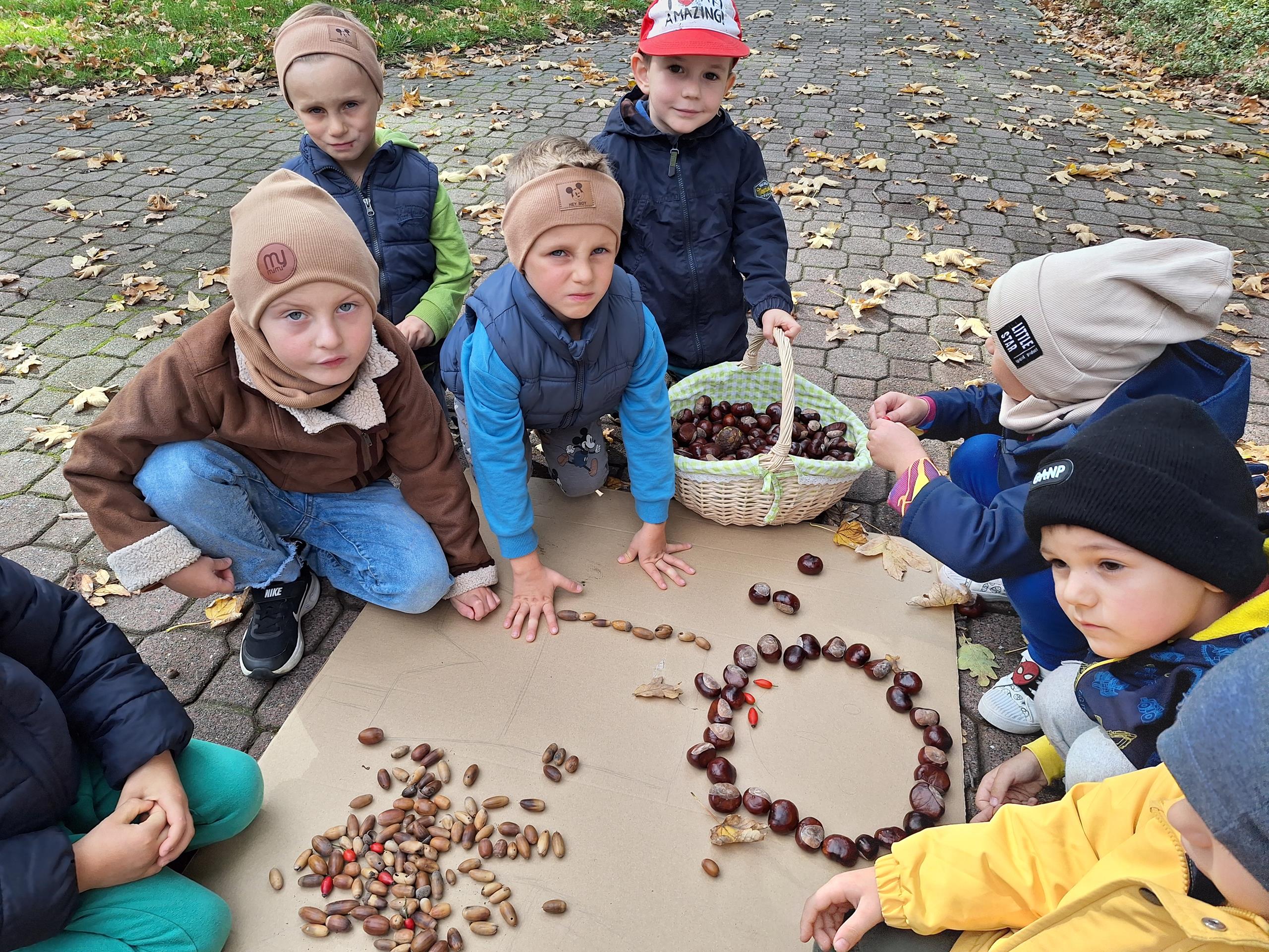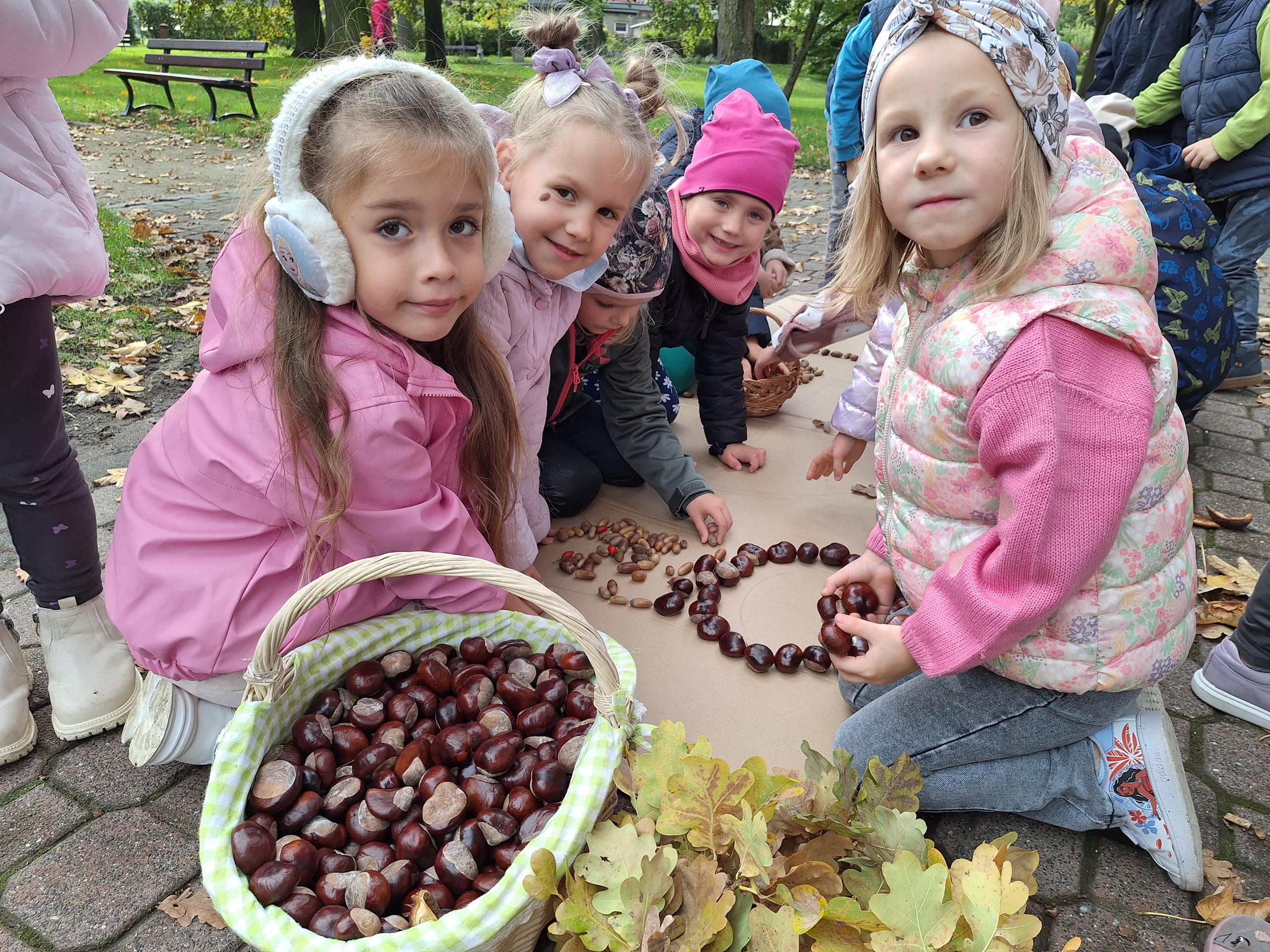 Jesień to czas, kiedy w zasięgu wzroku pojawiają się przeróżne dary natury. Kasztany, żołędzie, kolorowe liście czekają na nas na każdym kroku. Kontakt z materiałem przyrodniczym pełni niezwykle ważną rolę w wychowaniu dzieci. Jest on, bowiem źródłem pierwszych doświadczeń badawczych, przedmiotem zabaw i twórczych prac. Wykorzystując jesienne skarby Biedronki stworzyły m.in. jesienne obrazy, ścieżkę sensoryczną oraz układały wzory. Uśmiech na twarzach dzieci pojawił się także w czasie wyciągania pestek z dyni. Czekamy na kolejne zadania projektu.