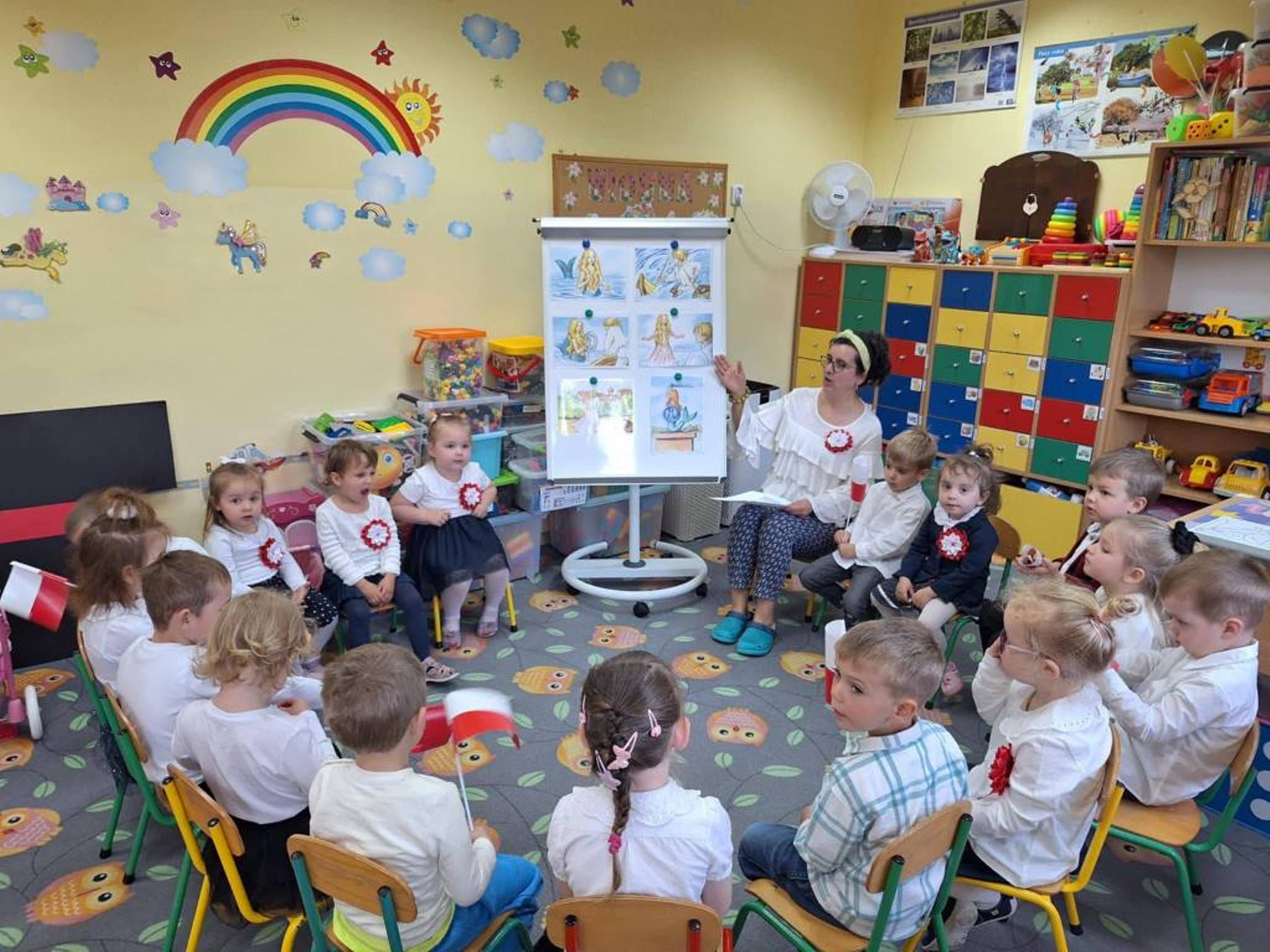 i utrwaliły symbole narodowe. Celem zajęć było wyrobienie wśród dzieci postaw szacunku do tradycji, dziedzictwa kulturowego i historycznego, które dają poczucie przynależności narodowej.