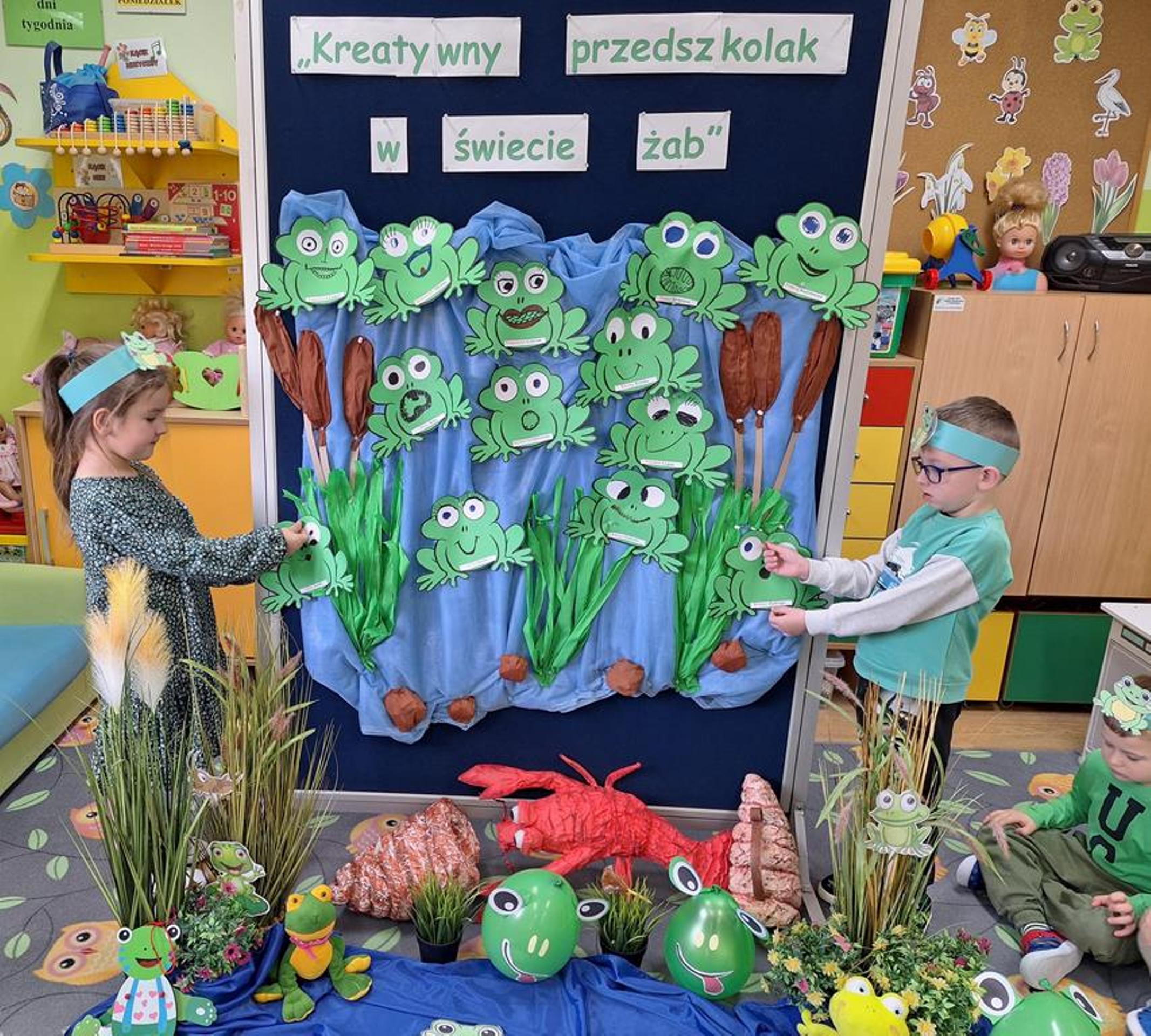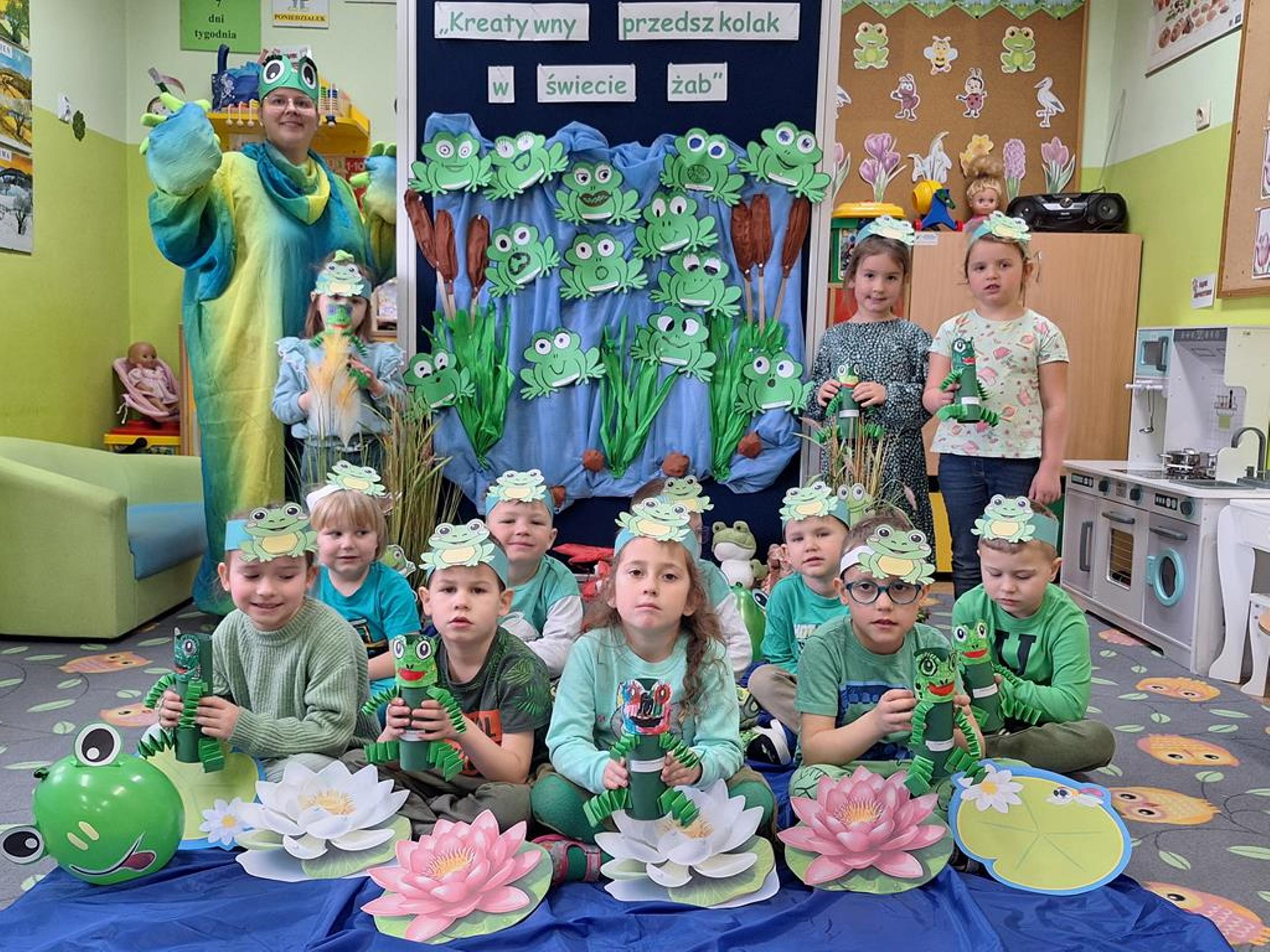 W Oddziale Przedszkolnym Tulipanki w Rzeczycy odbyły się warsztaty ekologiczne. Miały one na celu zachęcanie do ochrony tych płazów, które są pożyteczne dla naszego ekosystemu. Sala dzieci z oddziału Tulipanki zamieniła się w łąkę, po której skakały beztrosko zielone żabki. Ten dzień był pełen różnych zabaw tematycznych, dzieci poznały informacje na temat życia żab i ich znaczenia w przyrodzie. Poznały także cykl rozwojowy żaby, humorystyczną piosenkę o żabce oraz wiersz Jana Brzechwy. Na głowach przedszkolaków pojawiły się żabie opaski, a zwieńczeniem tego dnia były prace plastyczne, które potem rodzice mogli podziwiać na naszej wystawie. Koordynatorem zajęć była Lidia Pszonka i Justyna Stankiewicz.