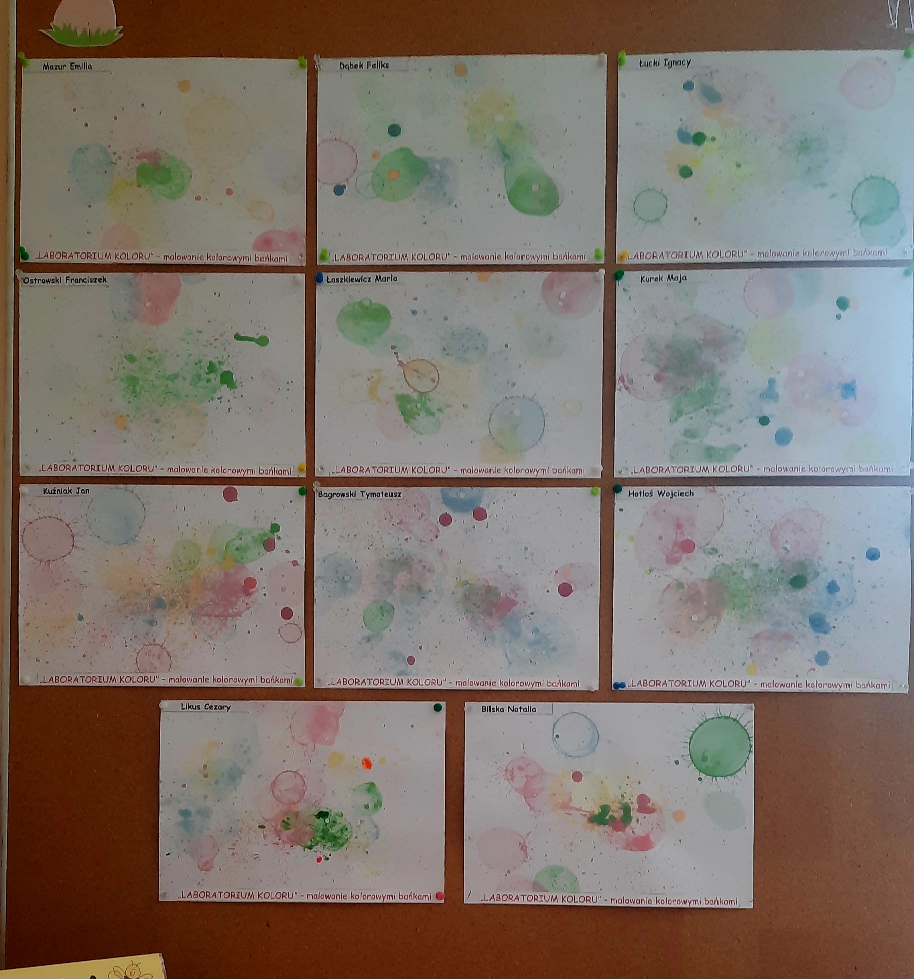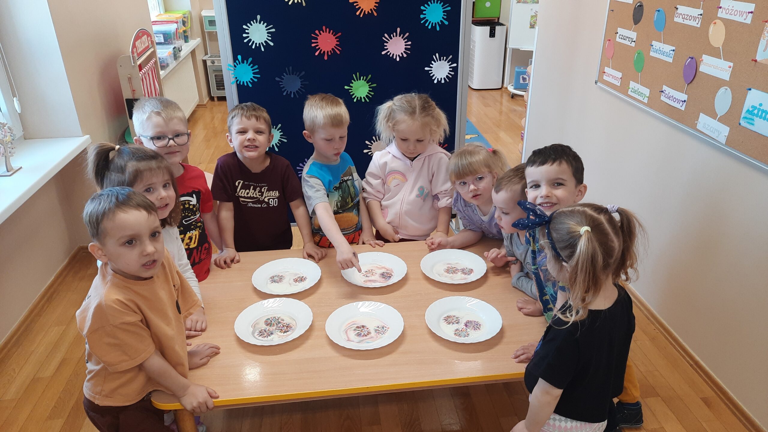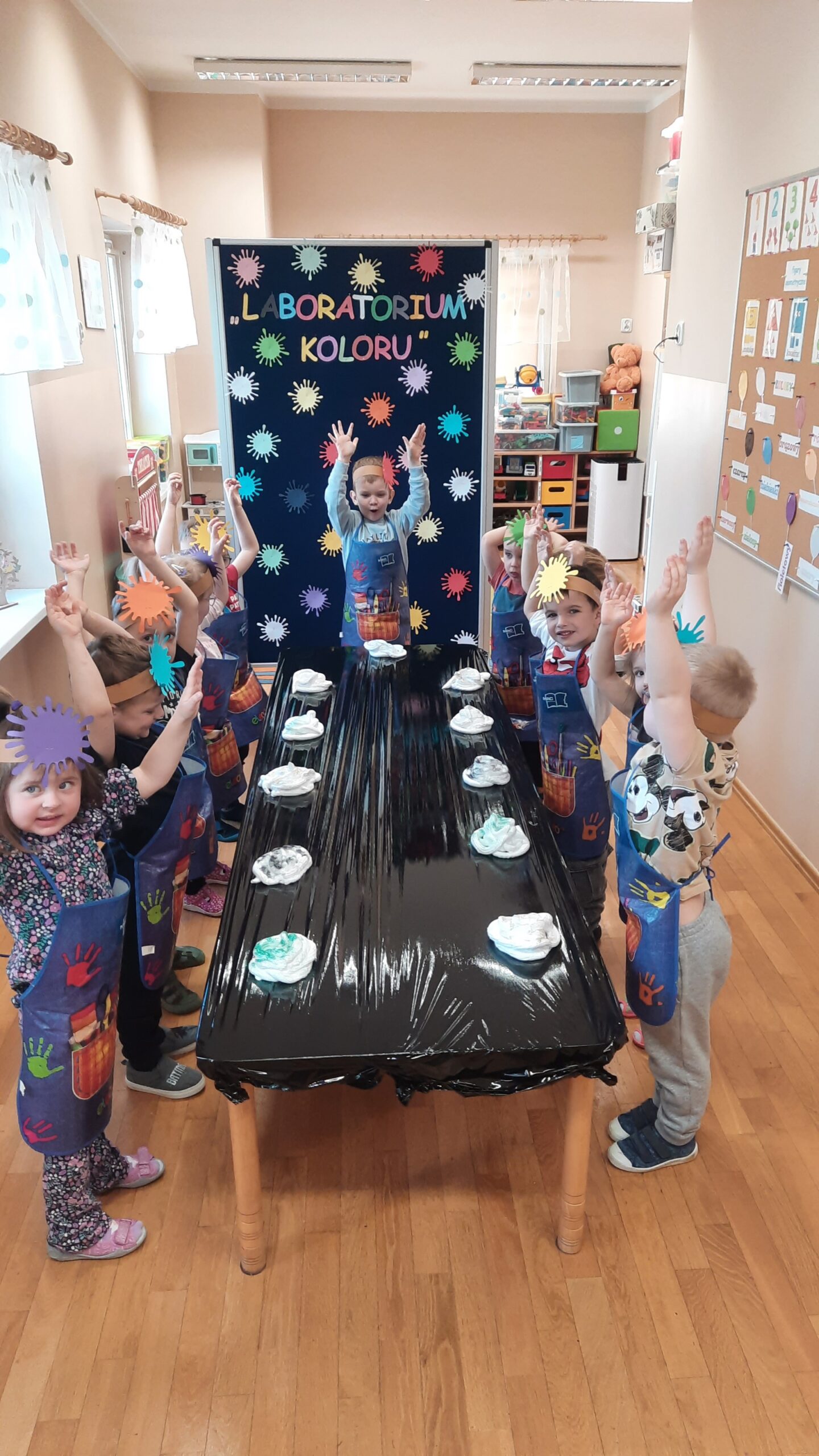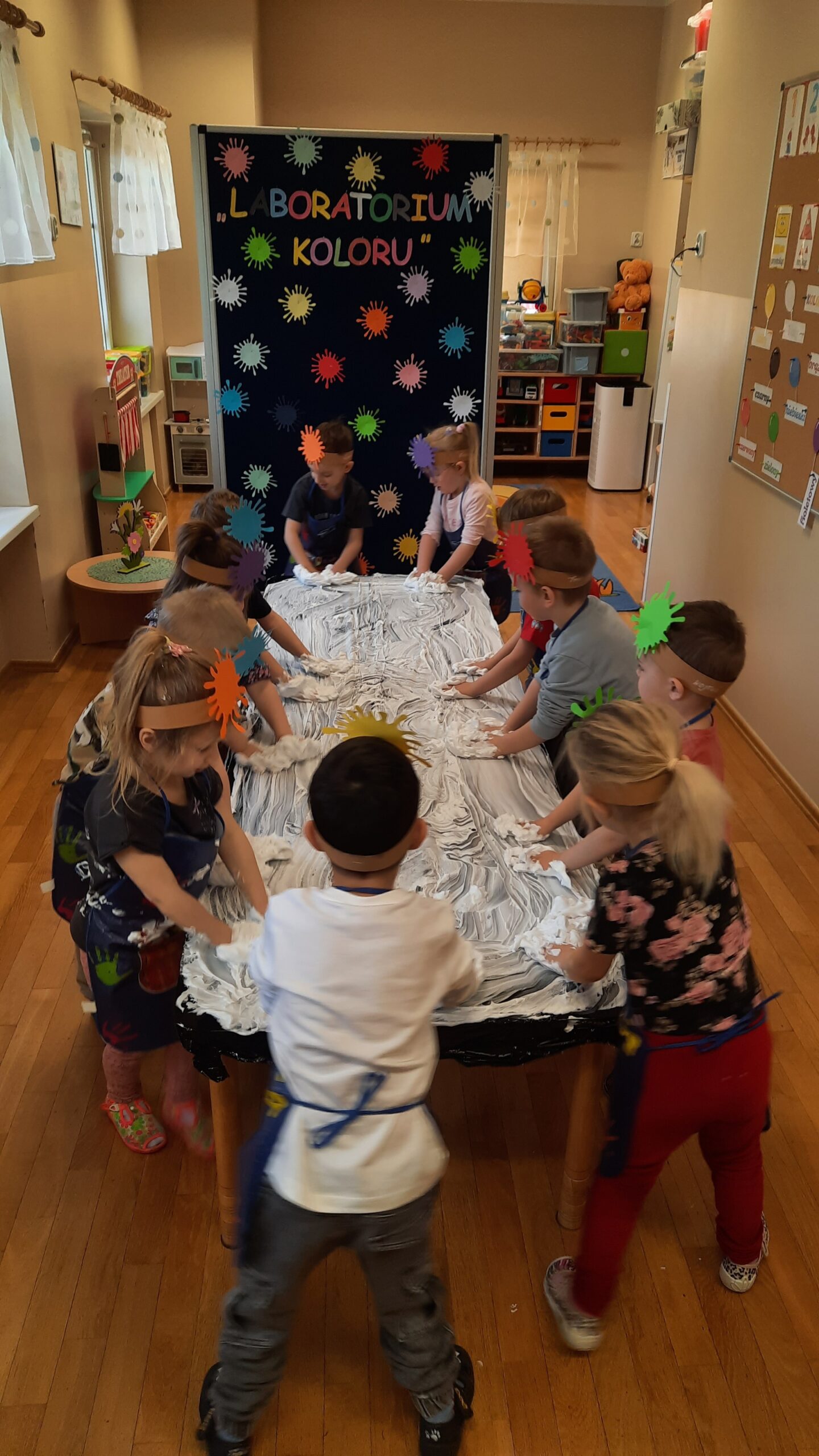 W ramach realizacji Ogólnopolskiego Projektu „Zabawa Sztuką” przedszkolaki z oddziału „Mrówki” wykonały kolejny jego etap pt. „Laboratorium koloru”. Podczas realizacji zadań dzieci utrwalały: pojęcie barwy podstawowej i pochodnej poprzez różnorodne eksperymenty, bawiły się barwami kontrastującymi, ciepłymi i zimnymi. Do pracy badawczej wykorzystane zostały: barwniki, mazaki, farby, bańki, brokat, płatki, mleko, woda, cukierki, olej, pianka, bita śmietana, owoce, zakraplacze i płyn do naczyń. Dzieci tworzyły własne dzieła plastyczne wykorzystując nietypowe narzędzia malarskie. Eksperymentowanie z barwą bardzo się podobało Mróweczkom. Koordynator programu: Ewelina Bury.