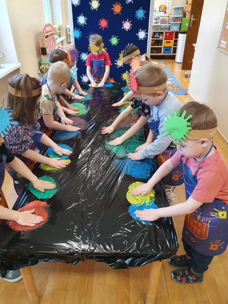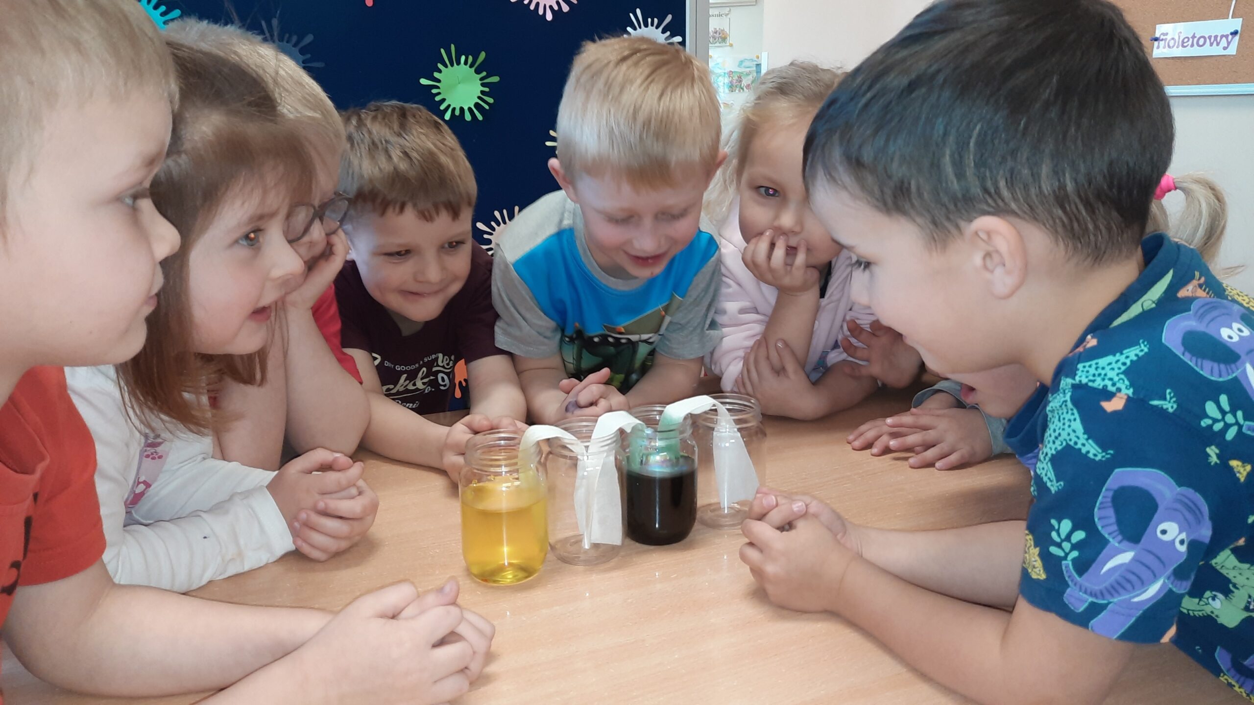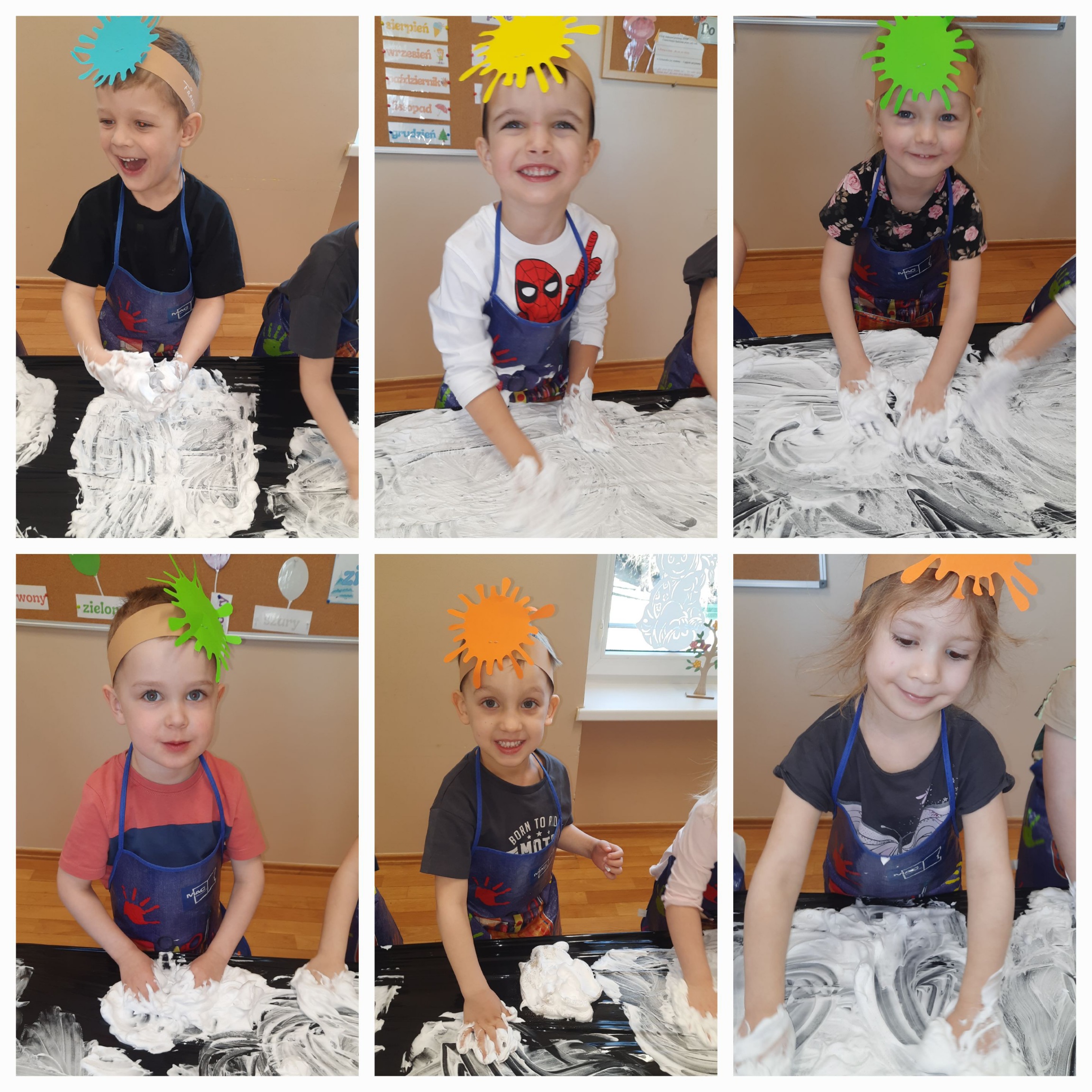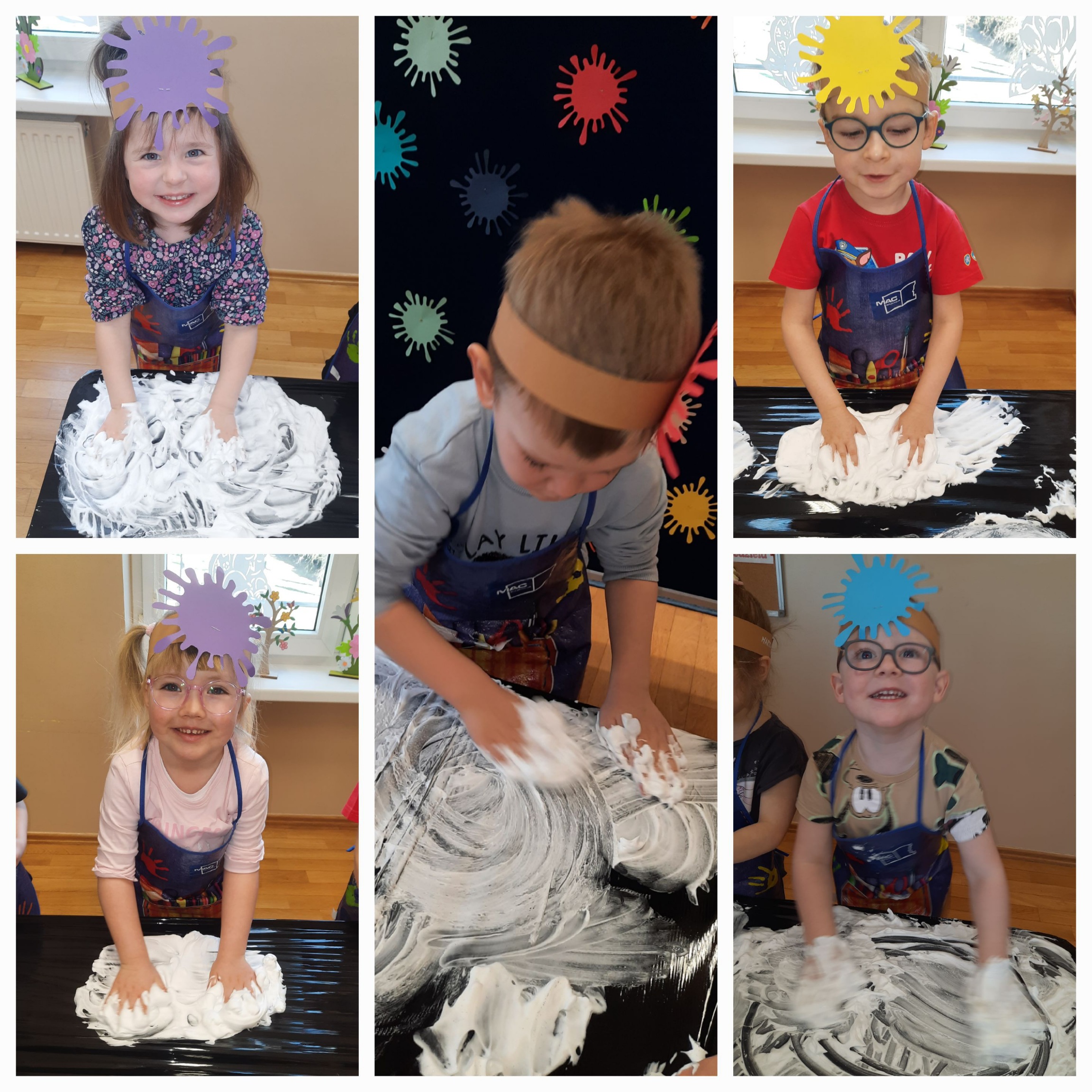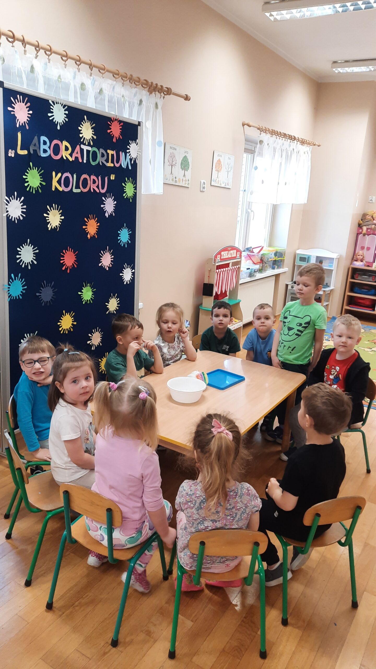 W ramach realizacji Ogólnopolskiego Projektu „Zabawa Sztuką” przedszkolaki z oddziału „Mrówki” wykonały kolejny jego etap pt. „Laboratorium koloru”. Podczas realizacji zadań dzieci utrwalały: pojęcie barwy podstawowej i pochodnej poprzez różnorodne eksperymenty, bawiły się barwami kontrastującymi, ciepłymi i zimnymi. Do pracy badawczej wykorzystane zostały: barwniki, mazaki, farby, bańki, brokat, płatki, mleko, woda, cukierki, olej, pianka, bita śmietana, owoce, zakraplacze i płyn do naczyń. Dzieci tworzyły własne dzieła plastyczne wykorzystując nietypowe narzędzia malarskie. Eksperymentowanie z barwą bardzo się podobało Mróweczkom. Koordynator programu: Ewelina Bury.