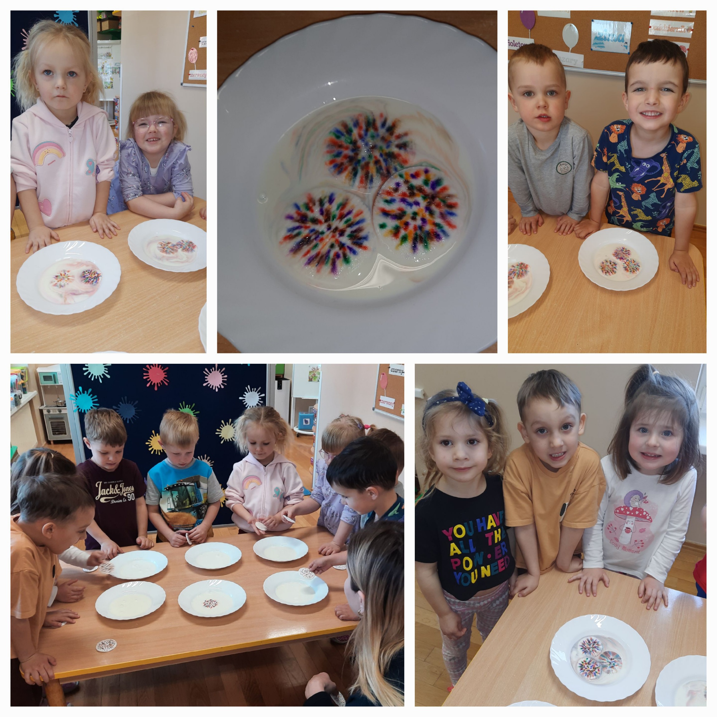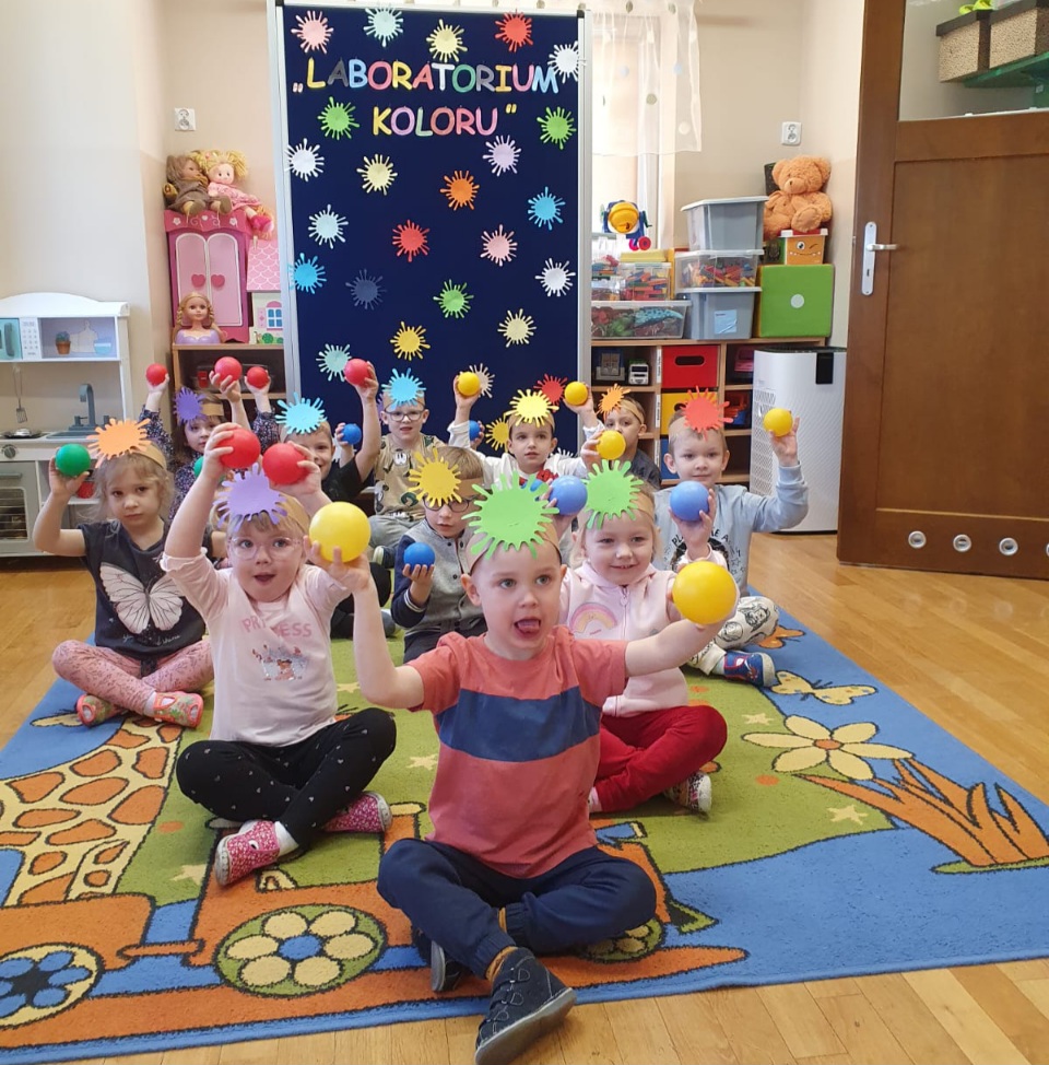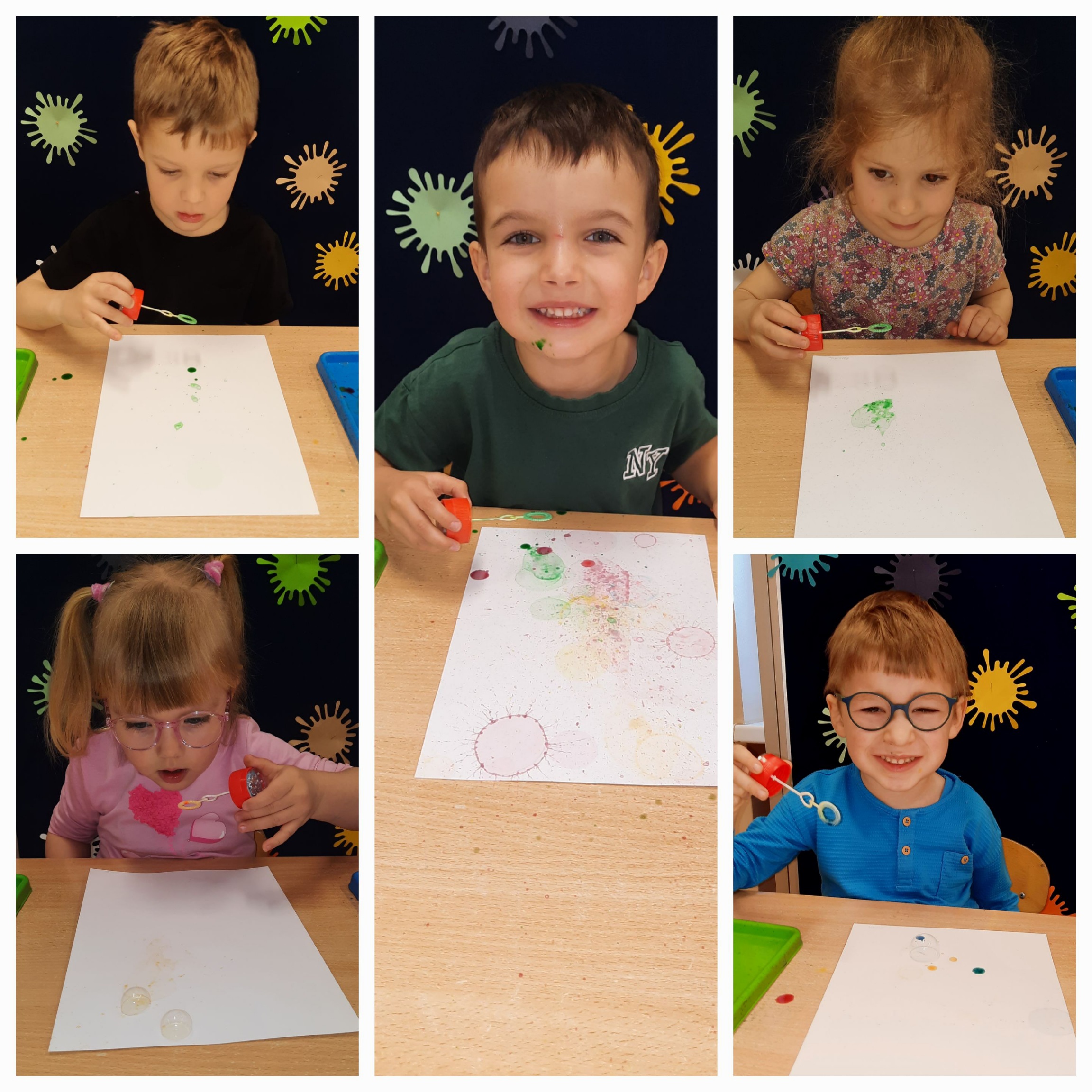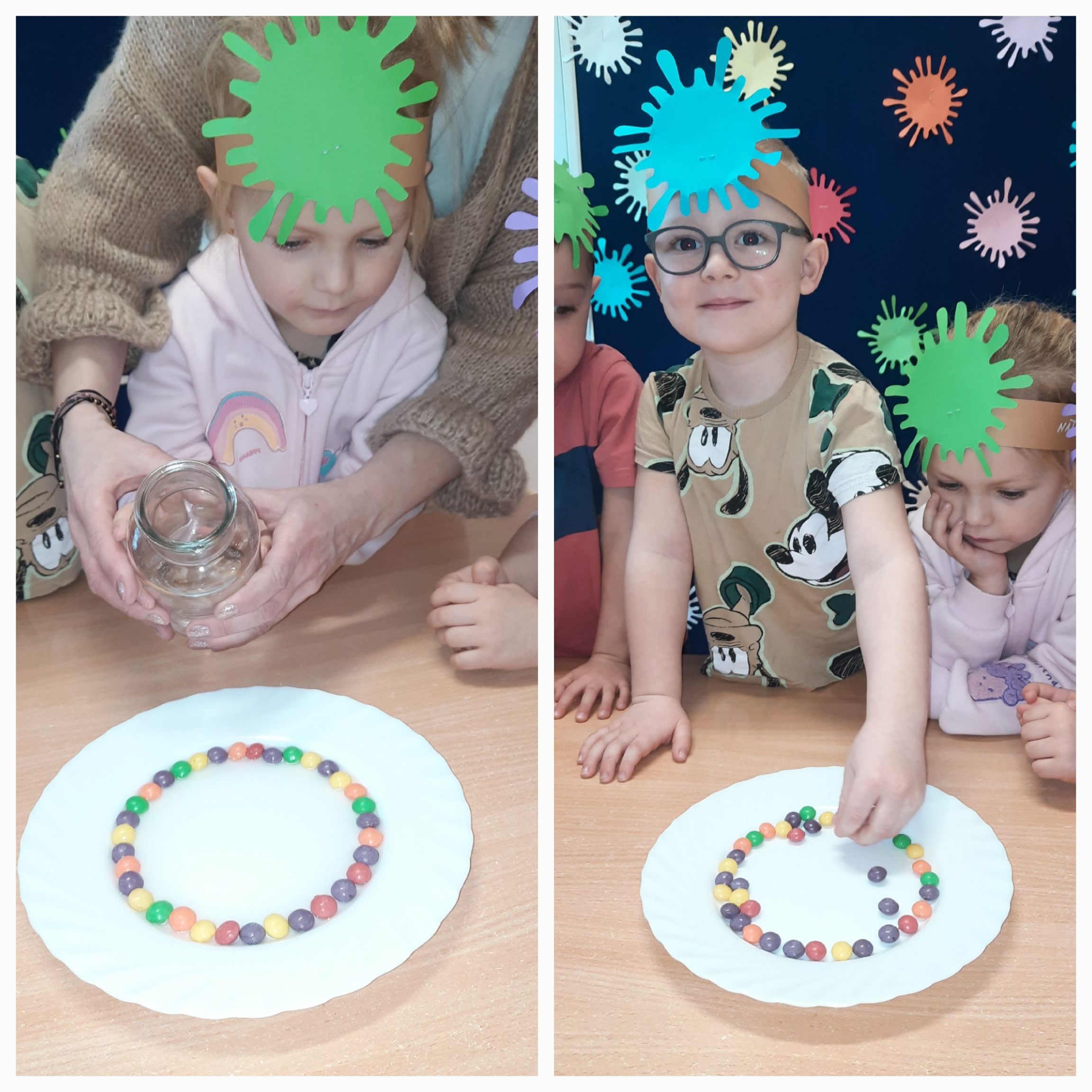 W ramach realizacji Ogólnopolskiego Projektu „Zabawa Sztuką” przedszkolaki z oddziału „Mrówki” wykonały kolejny jego etap pt. „Laboratorium koloru”. Podczas realizacji zadań dzieci utrwalały: pojęcie barwy podstawowej i pochodnej poprzez różnorodne eksperymenty, bawiły się barwami kontrastującymi, ciepłymi i zimnymi. Do pracy badawczej wykorzystane zostały: barwniki, mazaki, farby, bańki, brokat, płatki, mleko, woda, cukierki, olej, pianka, bita śmietana, owoce, zakraplacze i płyn do naczyń. Dzieci tworzyły własne dzieła plastyczne wykorzystując nietypowe narzędzia malarskie. Eksperymentowanie z barwą bardzo się podobało Mróweczkom. Koordynator programu: Ewelina Bury.