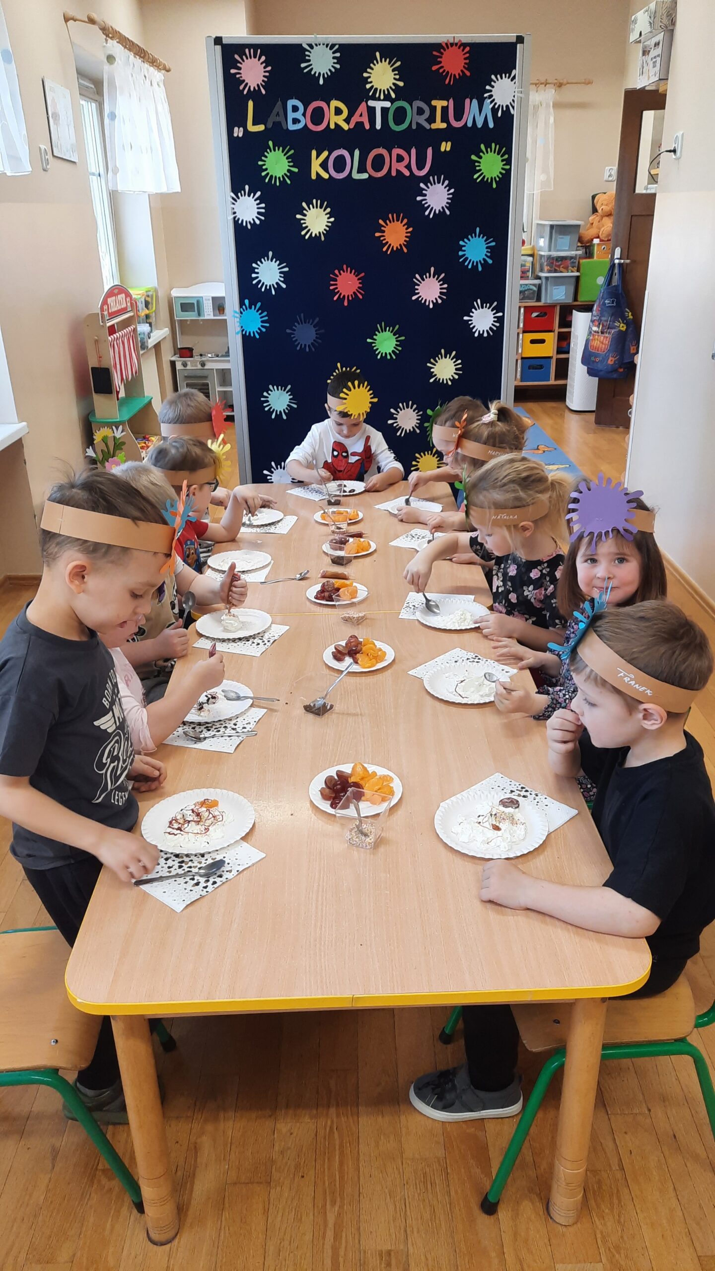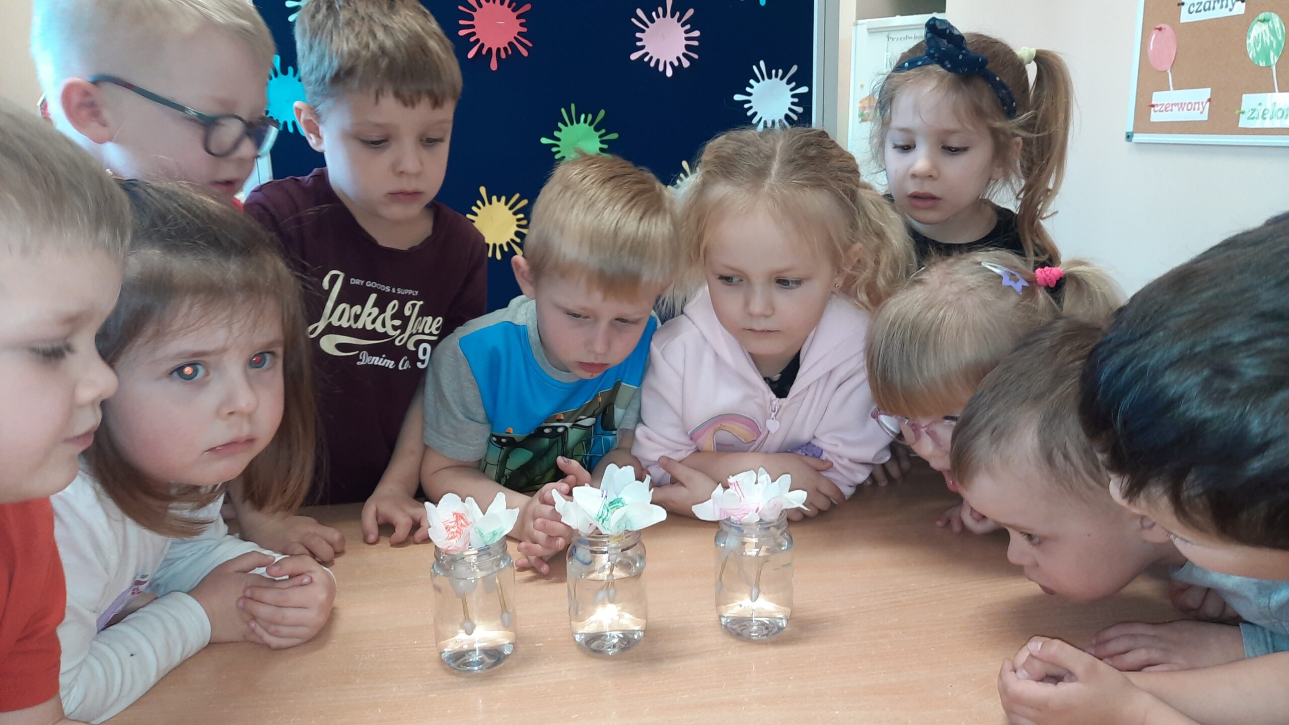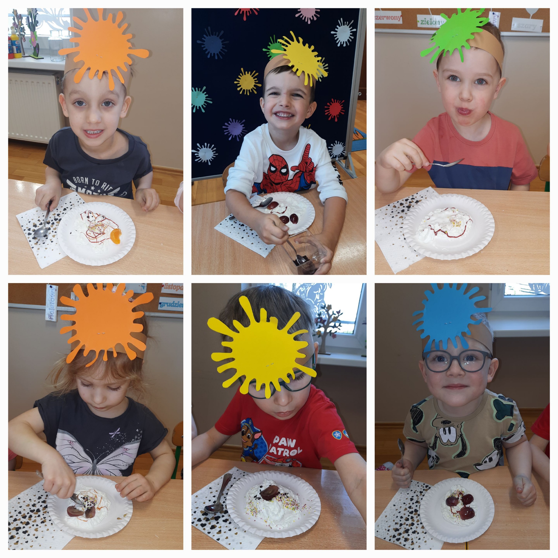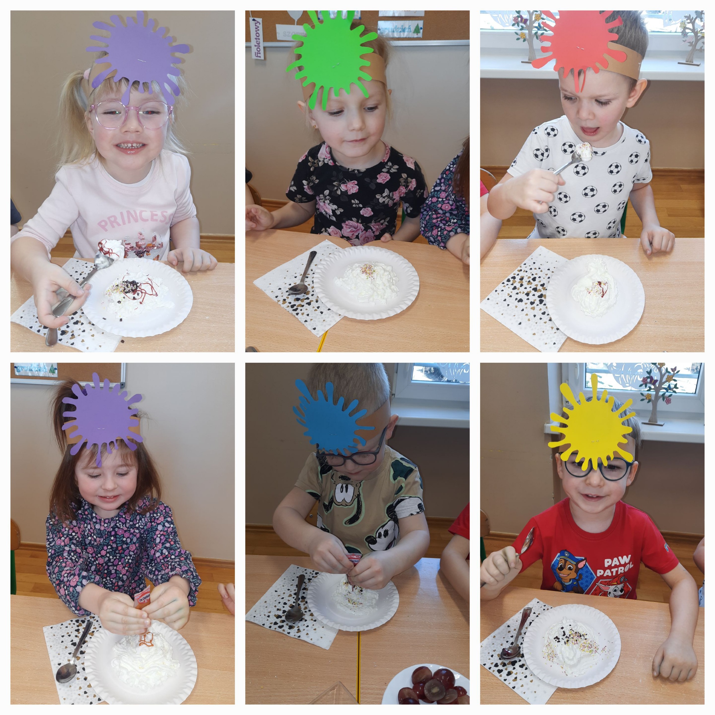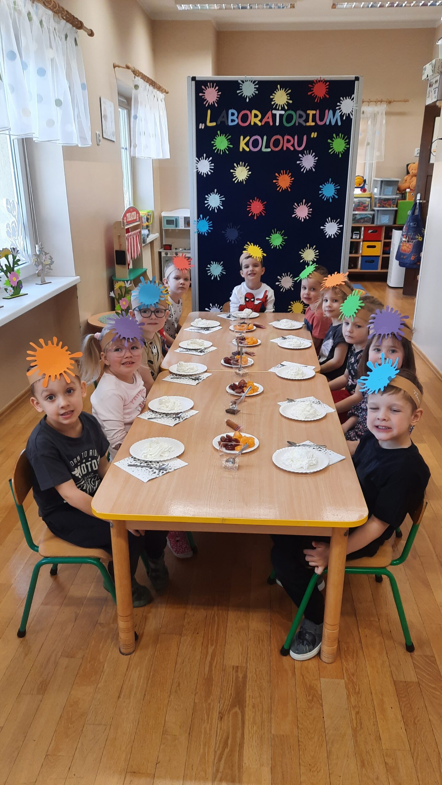 W ramach realizacji Ogólnopolskiego Projektu „Zabawa Sztuką” przedszkolaki z oddziału „Mrówki” wykonały kolejny jego etap pt. „Laboratorium koloru”. Podczas realizacji zadań dzieci utrwalały: pojęcie barwy podstawowej i pochodnej poprzez różnorodne eksperymenty, bawiły się barwami kontrastującymi, ciepłymi i zimnymi. Do pracy badawczej wykorzystane zostały: barwniki, mazaki, farby, bańki, brokat, płatki, mleko, woda, cukierki, olej, pianka, bita śmietana, owoce, zakraplacze i płyn do naczyń. Dzieci tworzyły własne dzieła plastyczne wykorzystując nietypowe narzędzia malarskie. Eksperymentowanie z barwą bardzo się podobało Mróweczkom. Koordynator programu: Ewelina Bury.