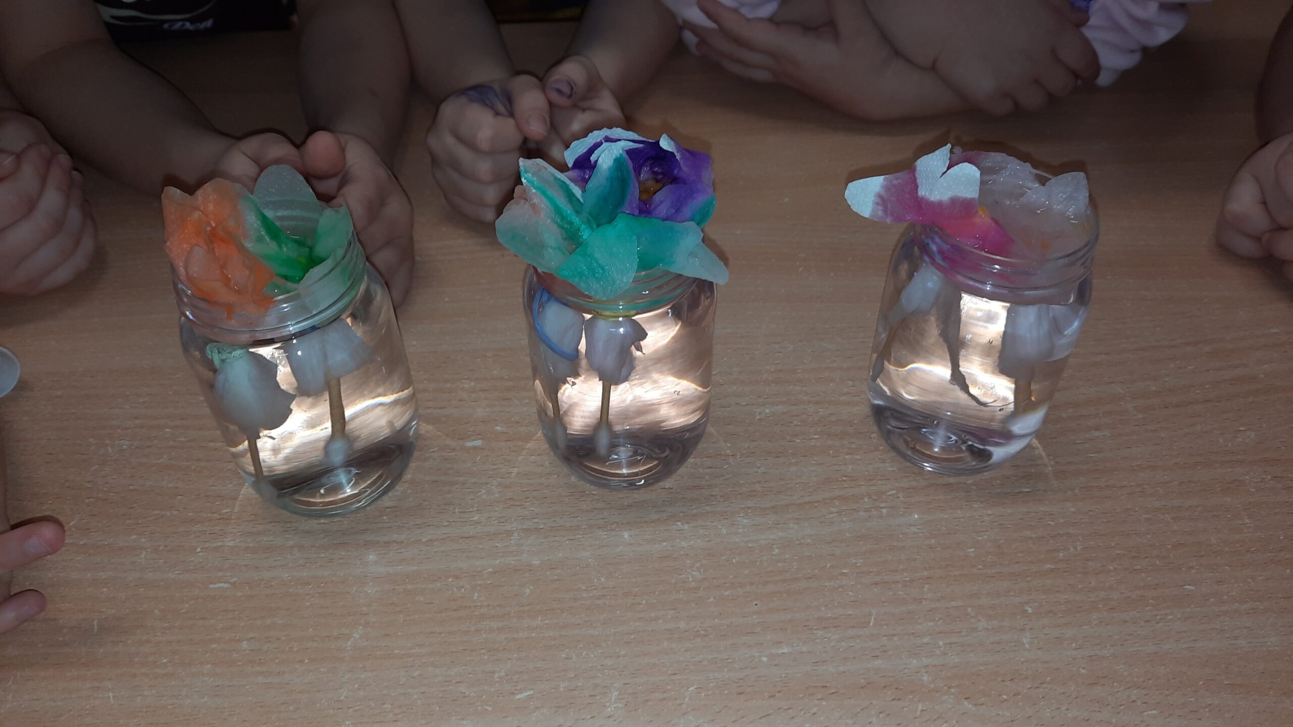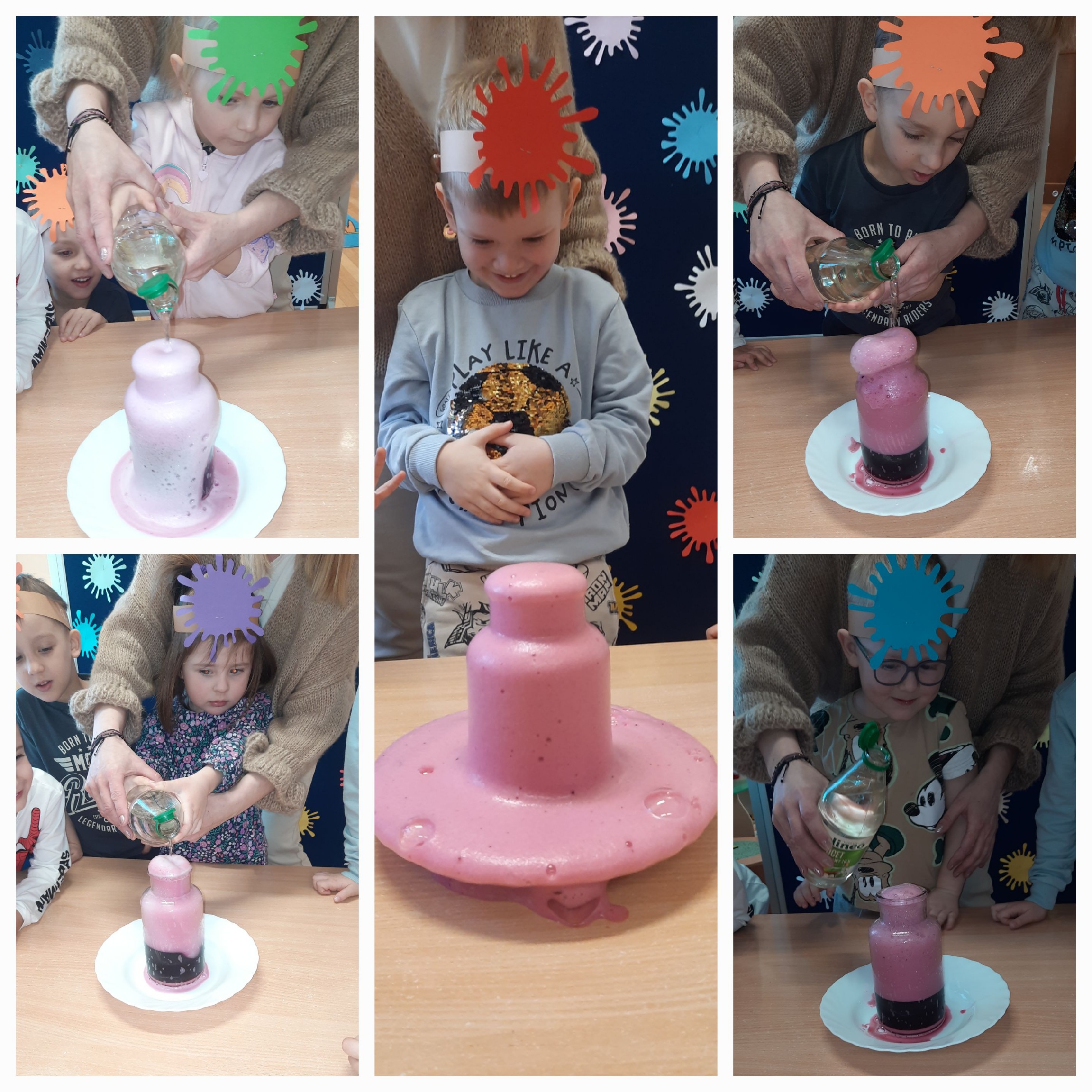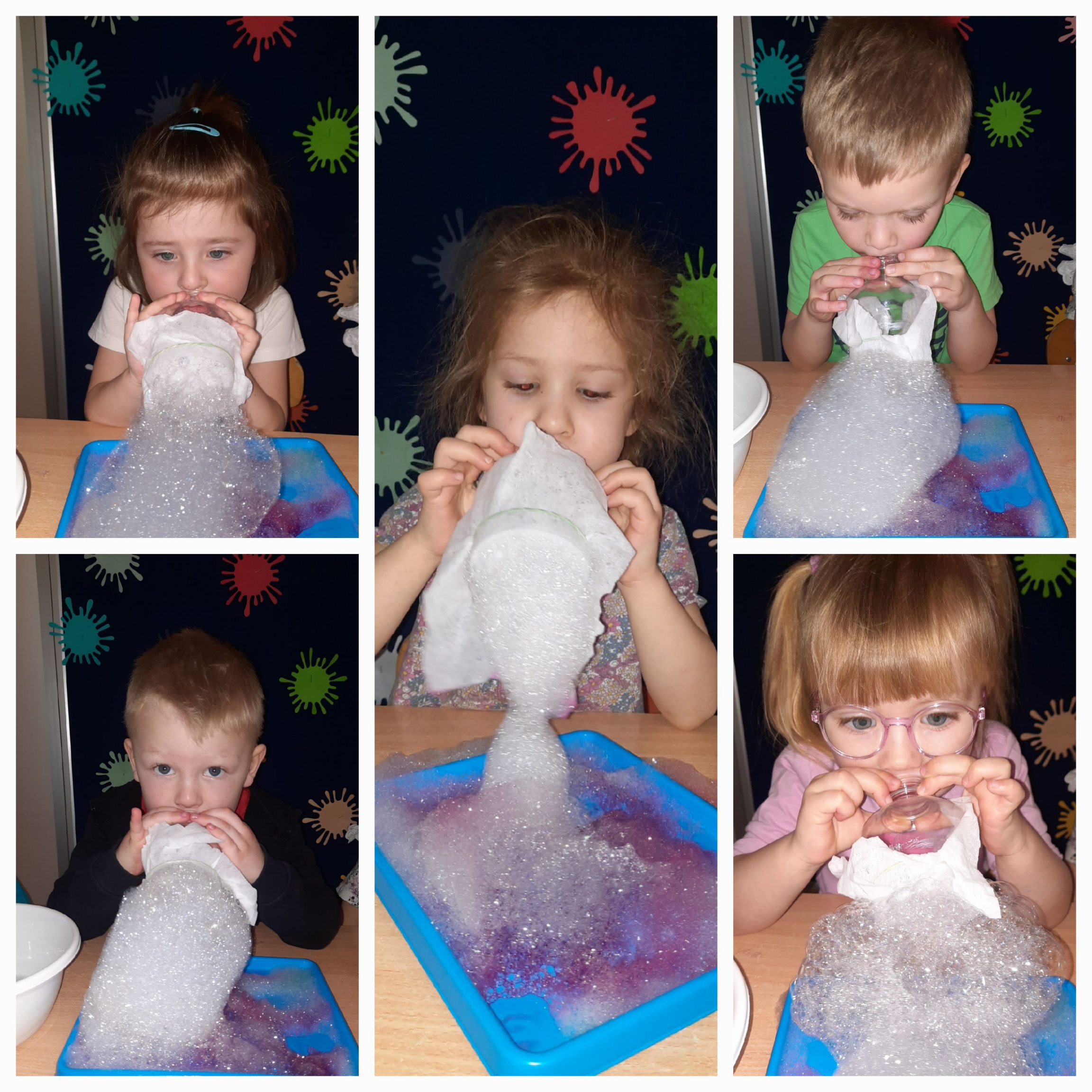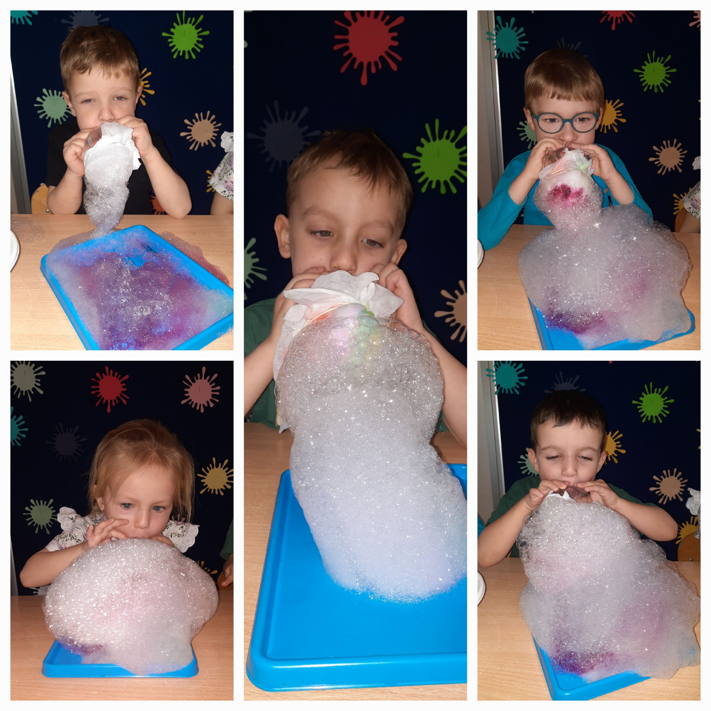 W ramach realizacji Ogólnopolskiego Projektu „Zabawa Sztuką” przedszkolaki z oddziału „Mrówki” wykonały kolejny jego etap pt. „Laboratorium koloru”. Podczas realizacji zadań dzieci utrwalały: pojęcie barwy podstawowej i pochodnej poprzez różnorodne eksperymenty, bawiły się barwami kontrastującymi, ciepłymi i zimnymi. Do pracy badawczej wykorzystane zostały: barwniki, mazaki, farby, bańki, brokat, płatki, mleko, woda, cukierki, olej, pianka, bita śmietana, owoce, zakraplacze i płyn do naczyń. Dzieci tworzyły własne dzieła plastyczne wykorzystując nietypowe narzędzia malarskie. Eksperymentowanie z barwą bardzo się podobało Mróweczkom. Koordynator programu: Ewelina Bury.