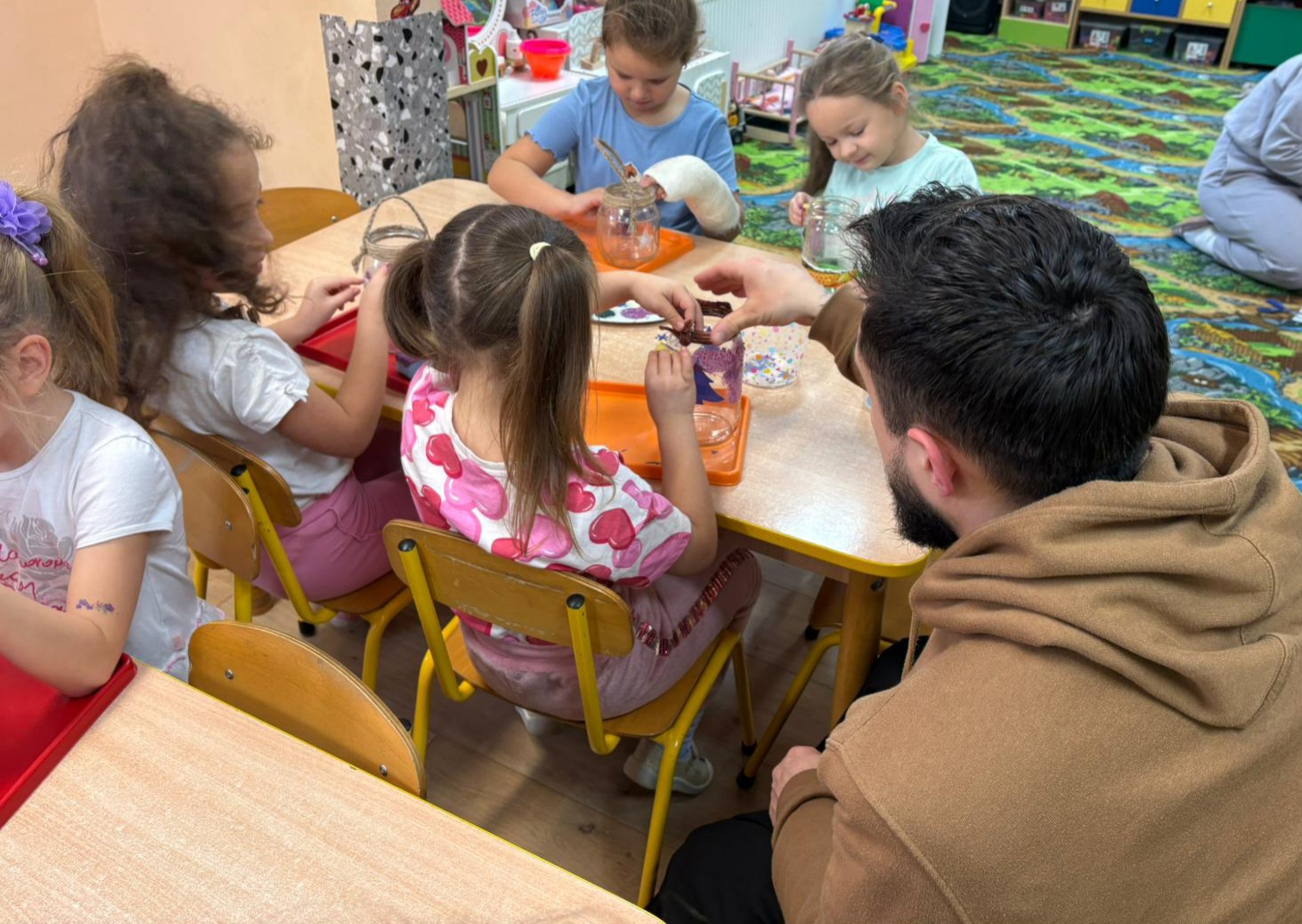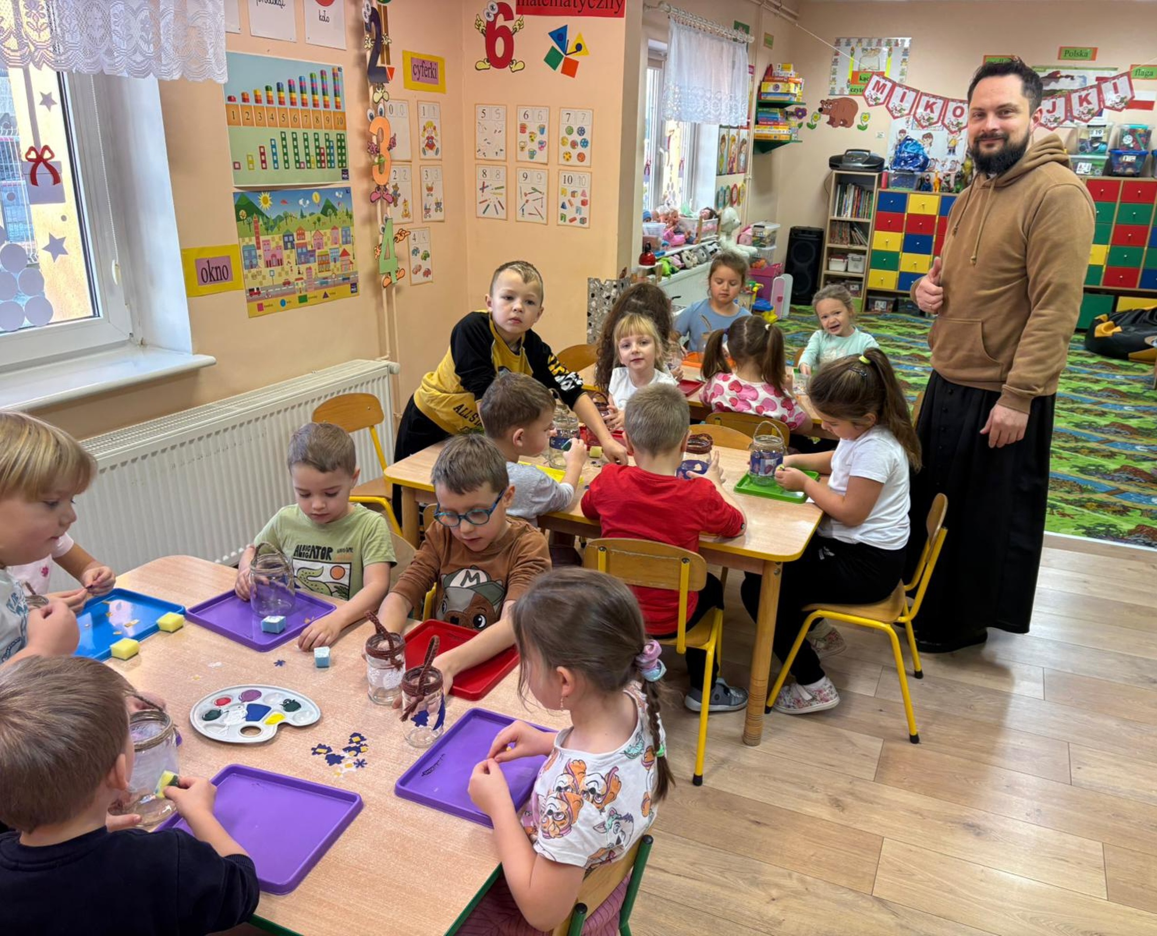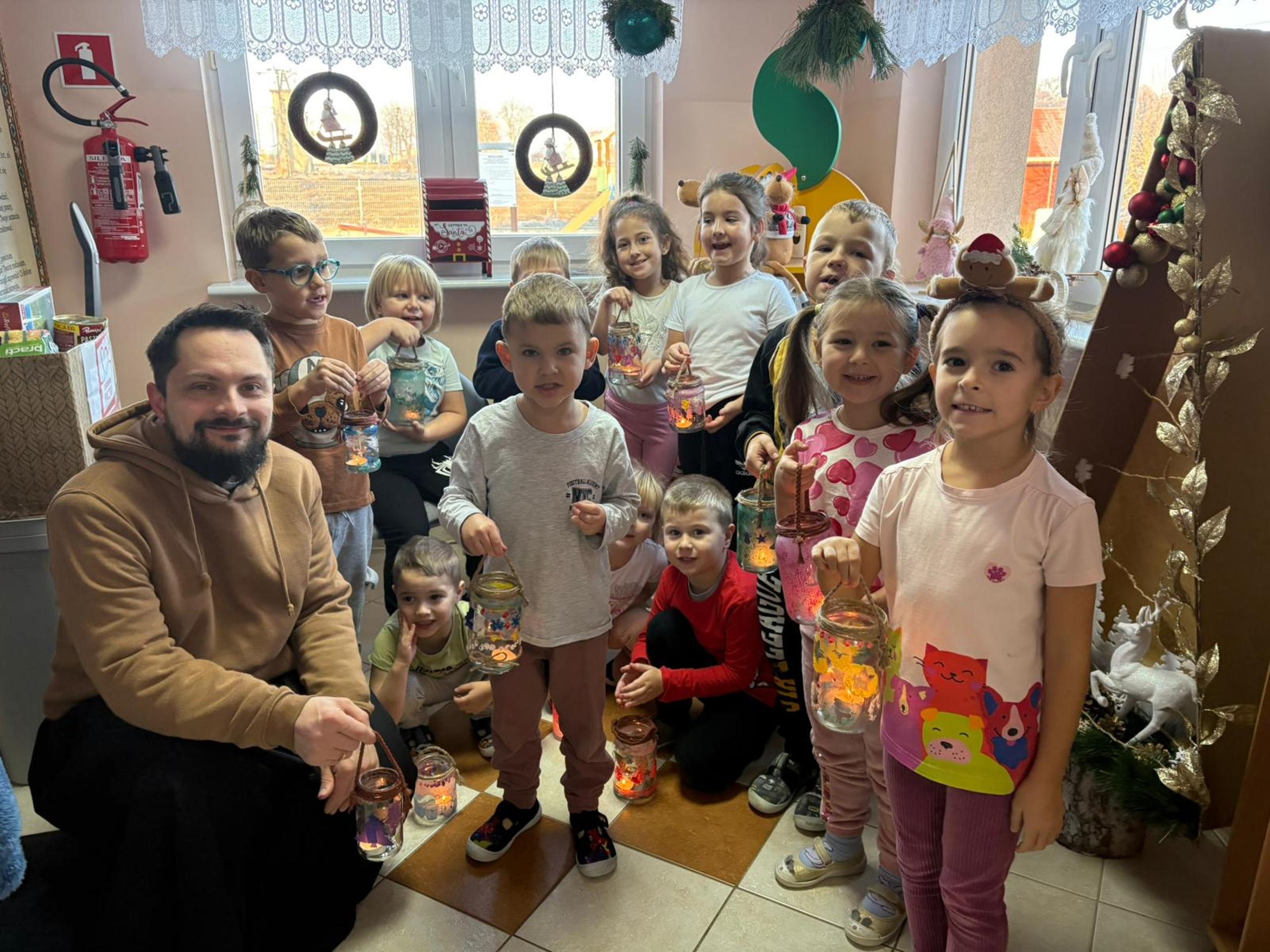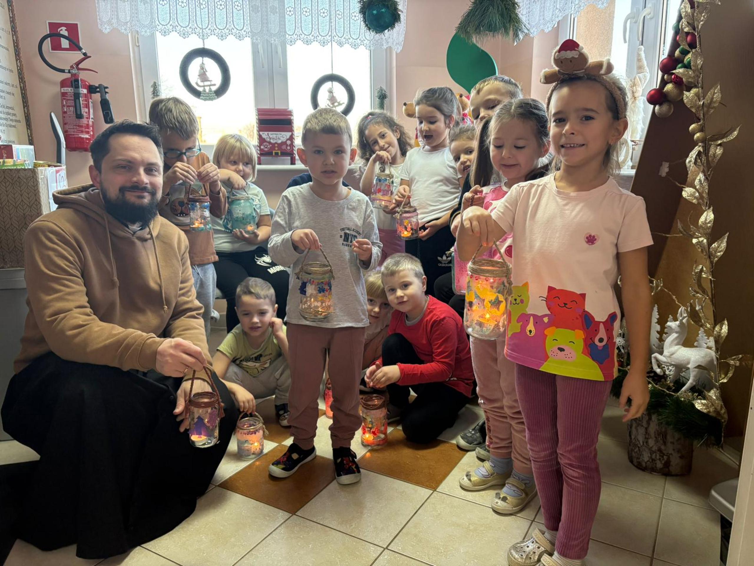 W ramach przygotowań do nadchodzącego okresu świątecznego dzieci z oddziału „Stokrotki” wzięły udział w zajęciach pt. „Lampiony adwentowe oświetlają naszą drogę”. Podczas spotkania ksiądz Marcin rozmawiał z przedszkolakami o tradycjach adwentowych oraz o tym, co symbolizuje światło w tym wyjątkowym czasie. Następnie przedszkolaki z wielkim zaangażowaniem przystąpiły do pracy plastycznej – wykonały własne lampiony adwentowe, wykorzystując papier kolorowy, bibułę, ozdobne gwiazdki oraz farby. Dzieci starannie projektowały wzory, dobierały kolory i dekorowały swoje lampiony, rozwijając przy tym kreatywność, sprawność manualną oraz poczucie estetyki. Powstałe prace wprowadziły w sali wyjątkowy, świąteczny nastrój. Lampiony będą nam symbolicznie towarzyszyć przez cały okres adwentu, przypominając dzieciom o wartościach takich jak dobro, cierpliwość i radość oczekiwania.