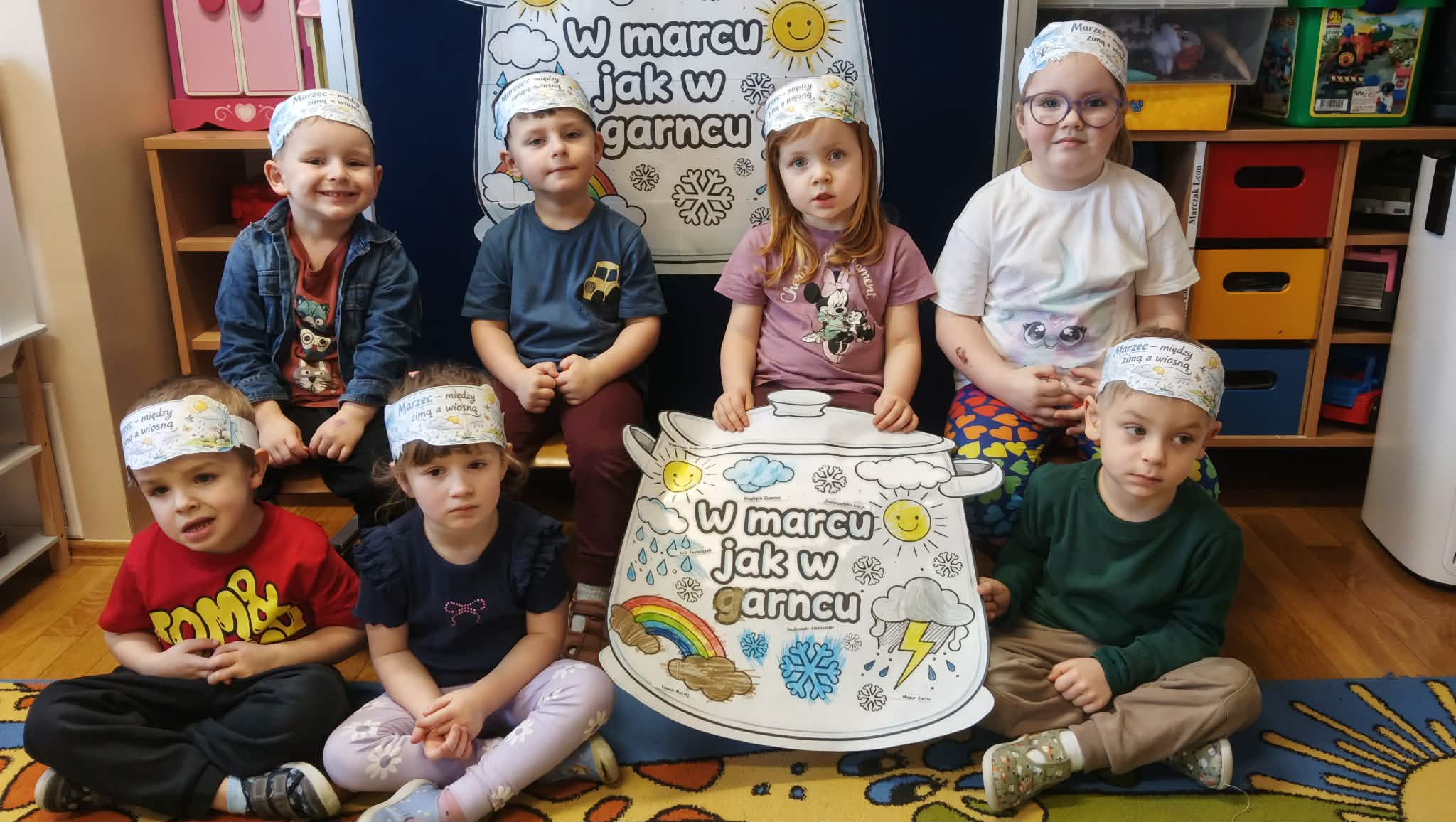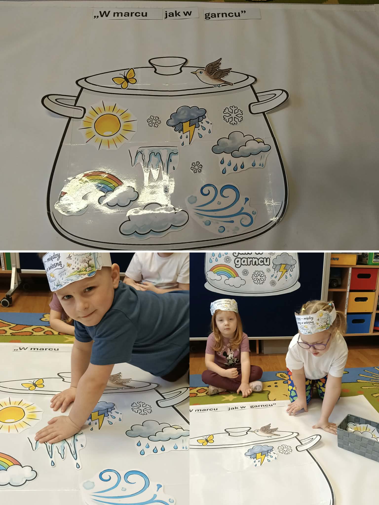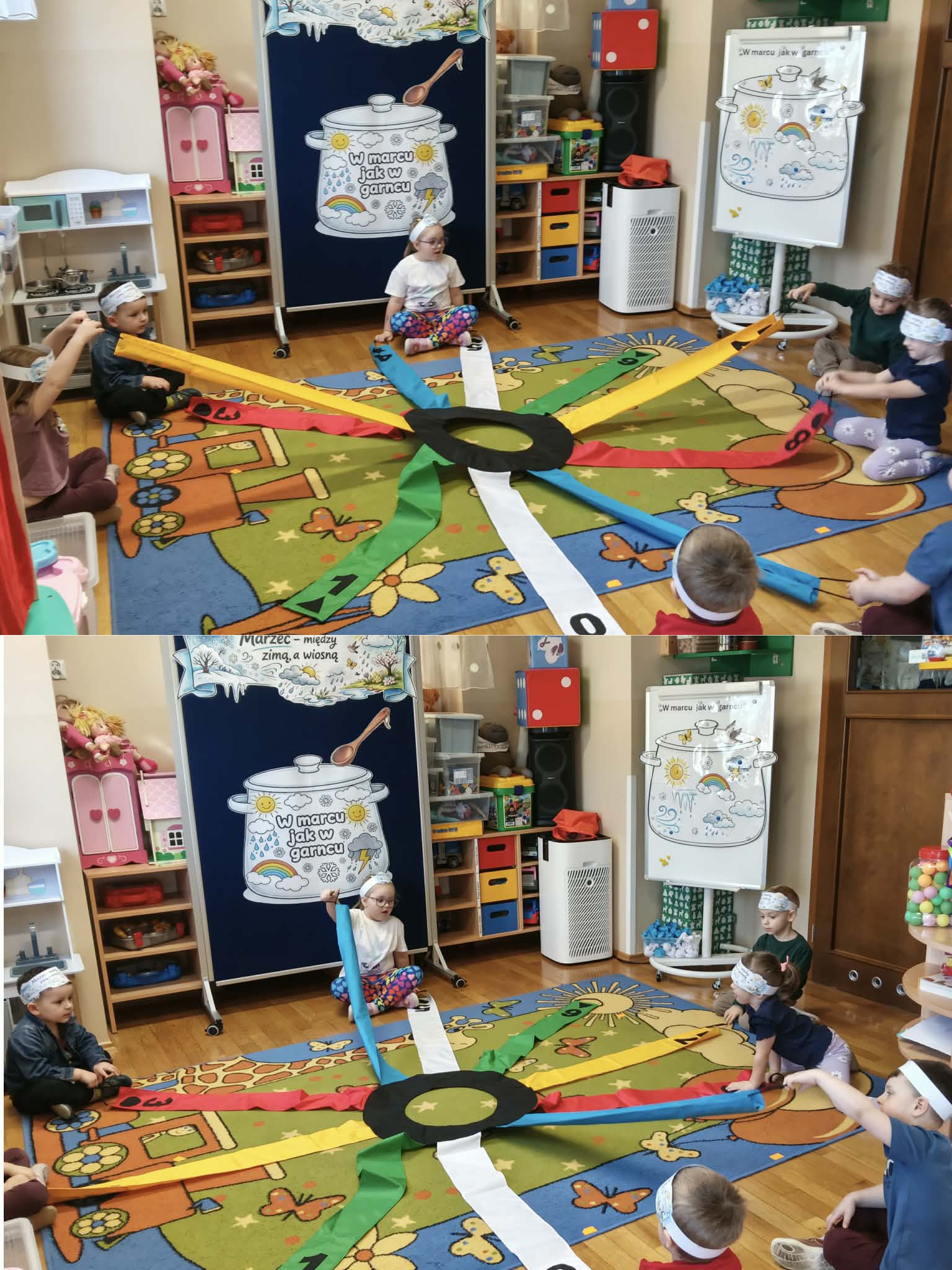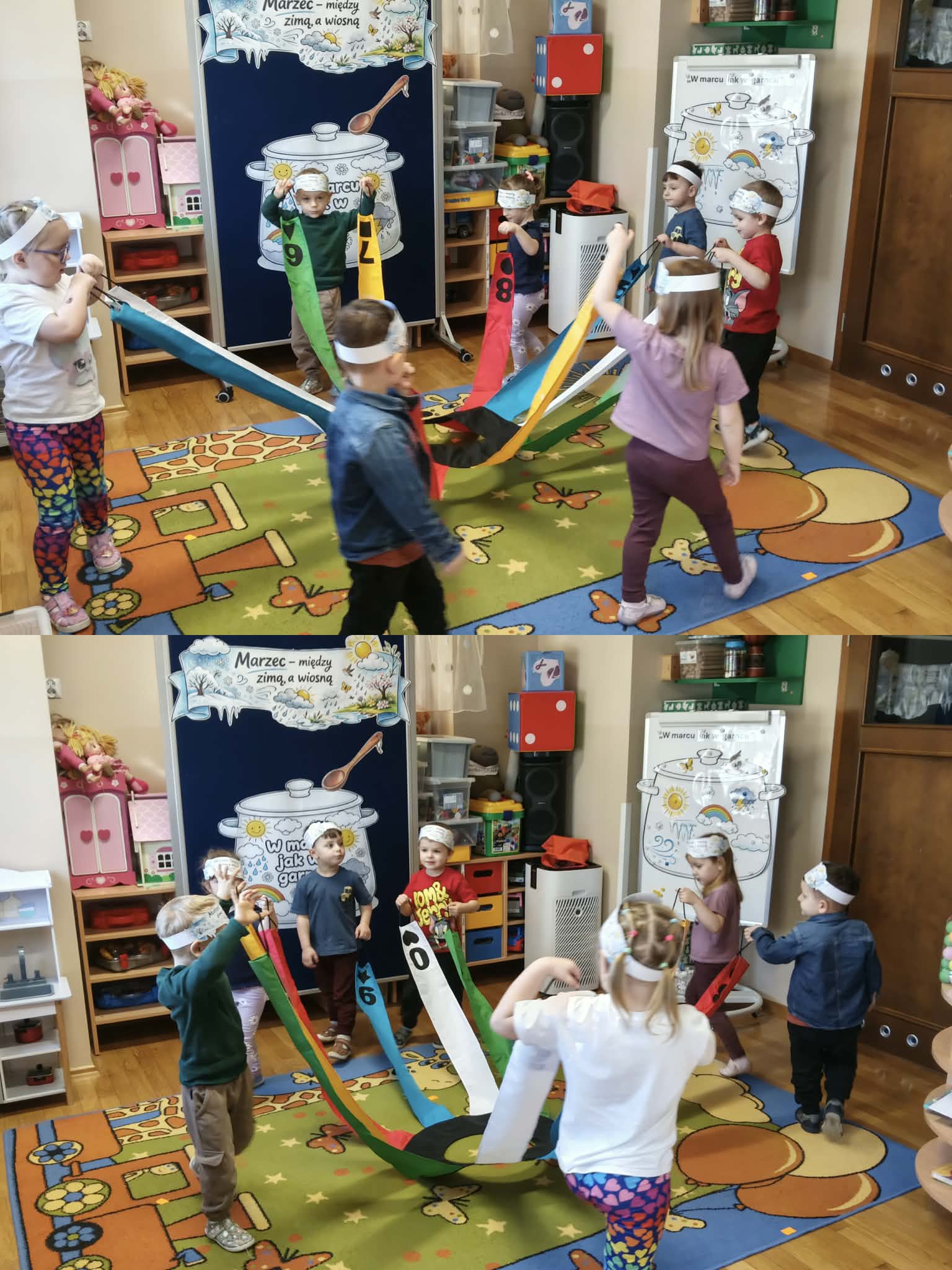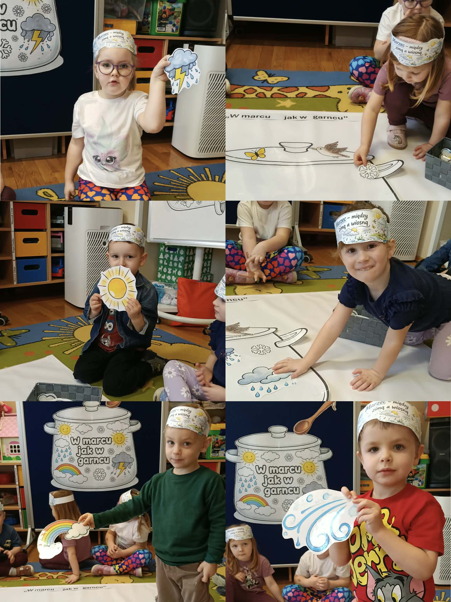 Drugiego marca przedszkolaki z oddziału „Mrówki”, realizując kolejny etap programu edukacyjnego „Twórczy Maluch”, wcieliły się w rolę prezenterów marcowej pogody. Dzieci z ogromnym zaangażowaniem odkrywały tajemnice miesiąca, w którym zima powoli ustępuje miejsca wiośnie, a aura potrafi zmieniać się jak w kalejdoskopie.Podczas zajęć rozmawialiśmy o przysłowiu „W marcu jak w garncu” oraz o charakterystycznych zjawiskach atmosferycznych. Przedszkolaki tworzyły własne prognozy pogody, łącząc elementy zimy i wiosny w twórczych działaniach plastycznych i ruchowych. Nie zabrakło zabaw matematycznych z wykorzystaniem wiatraka, ćwiczeń z chustą animacyjną Klanza oraz aktywności logorytmicznych wspierających rozwój mowy i poczucia rytmu. Zajęcia przebiegły w atmosferze radości, współpracy i dziecięcej ciekawości świata, a zdobyta wiedza i nowe doświadczenia z pewnością na długo pozostaną w pamięci naszych małych odkrywców.