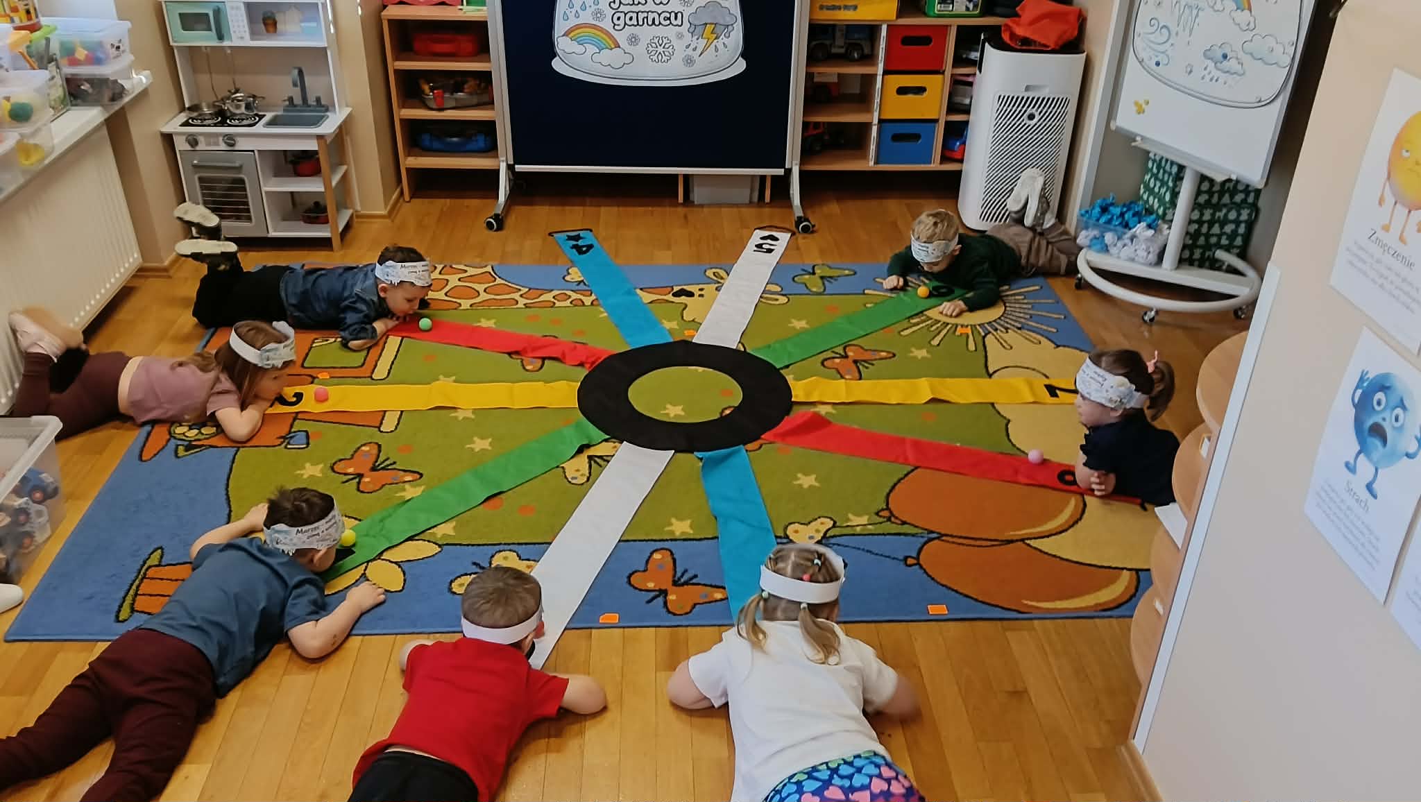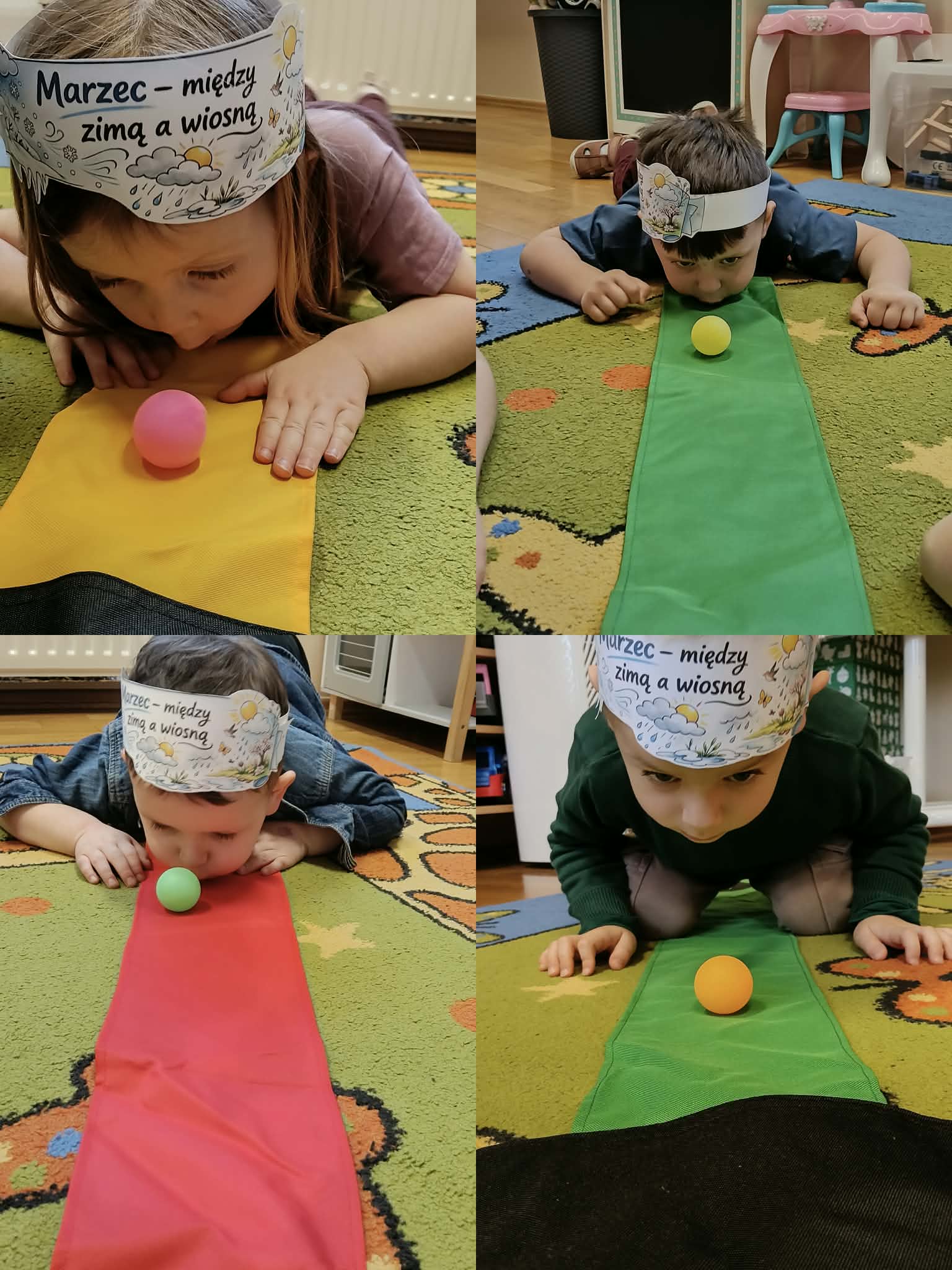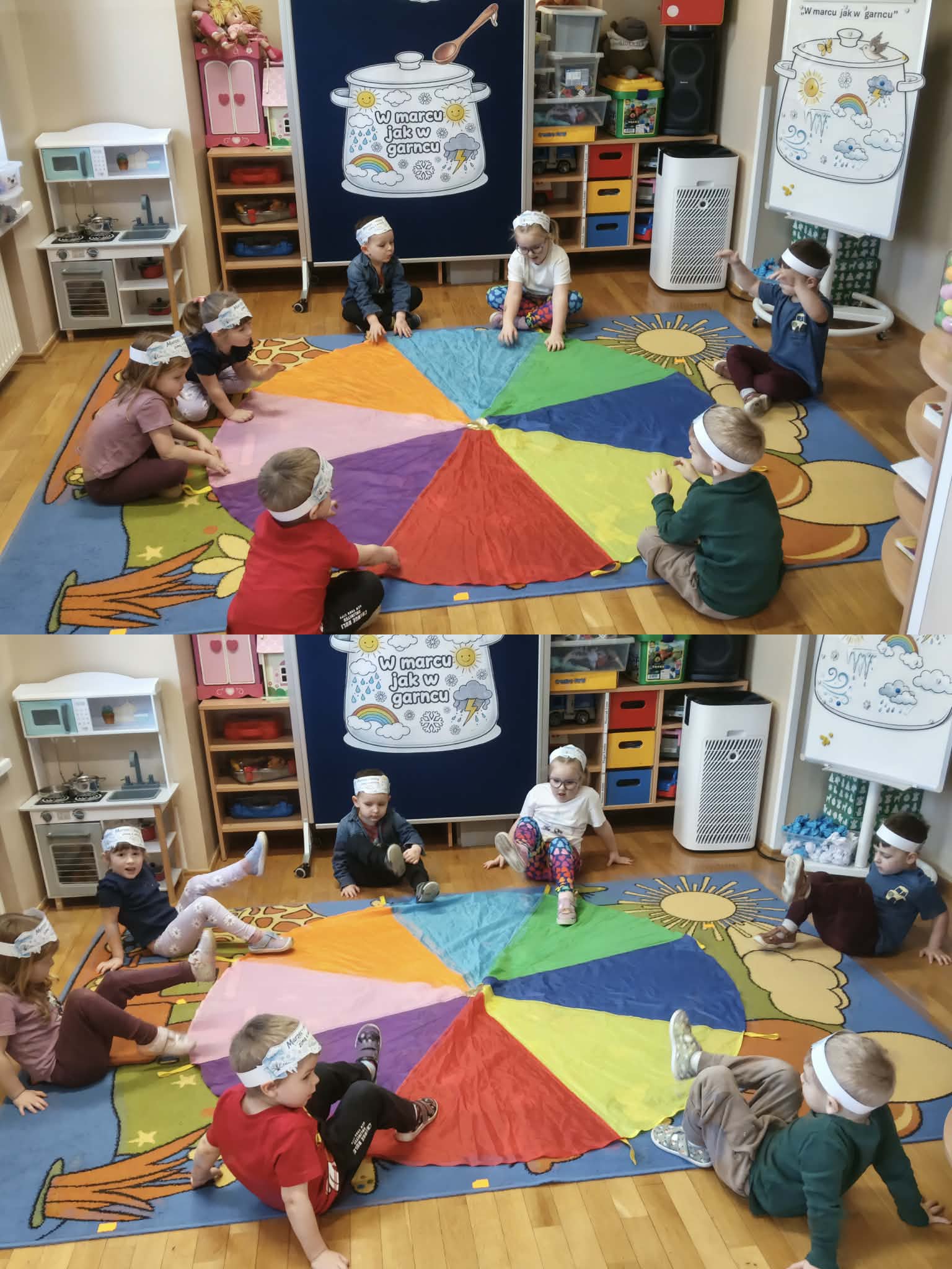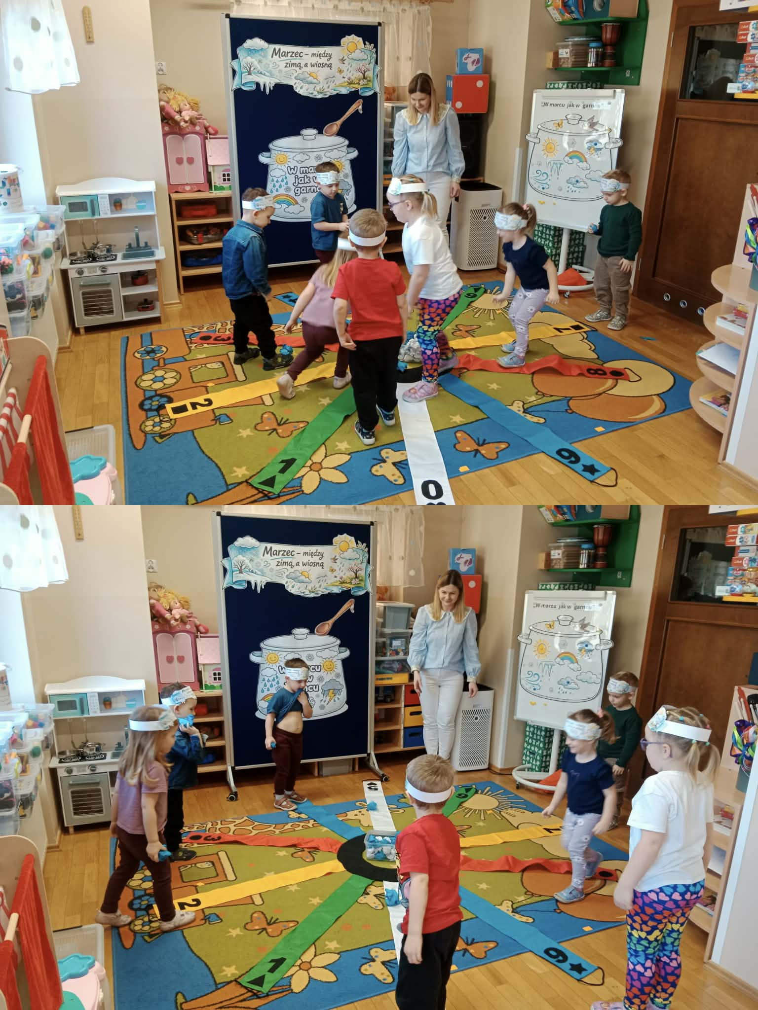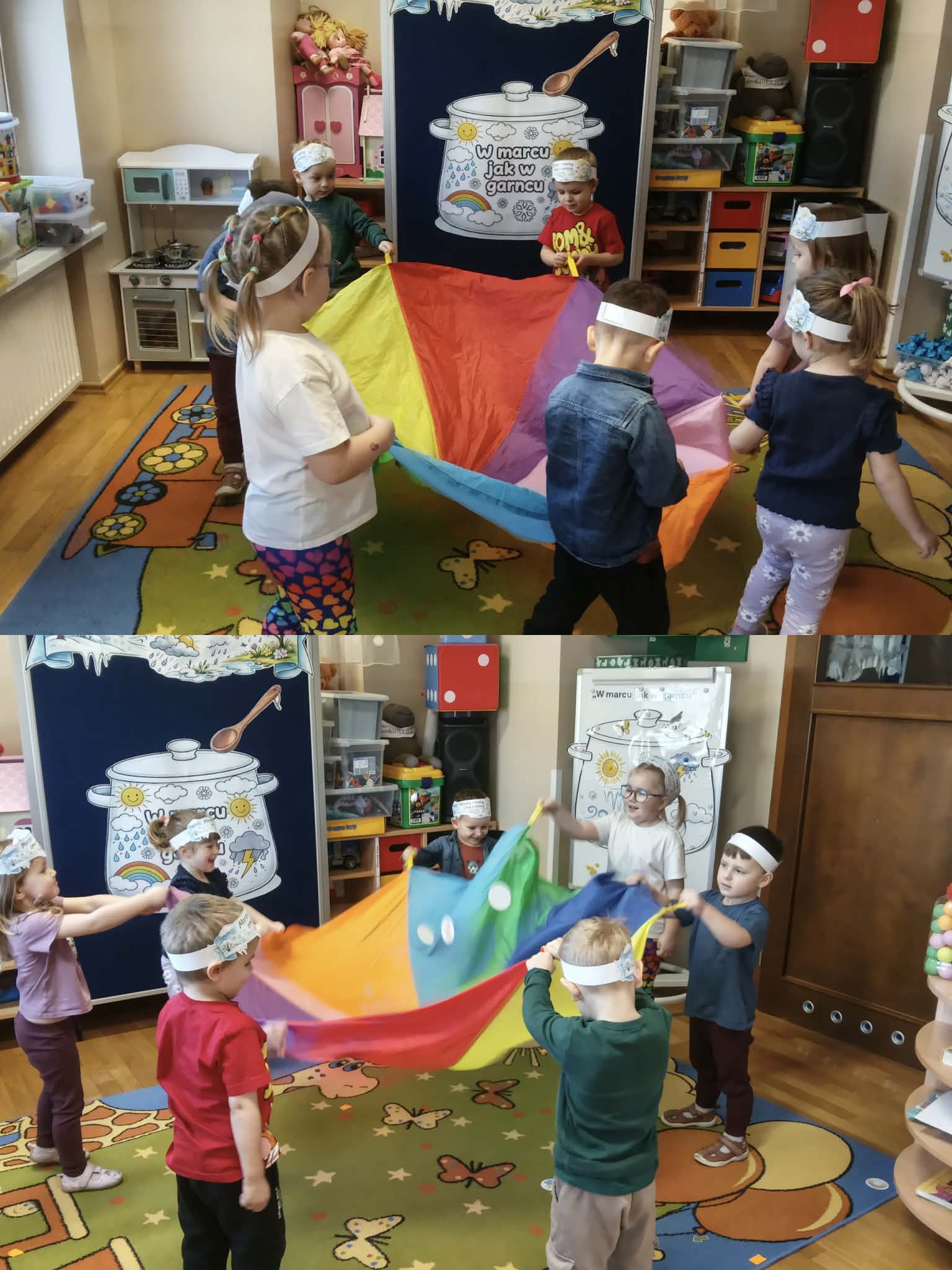 Drugiego marca przedszkolaki z oddziału „Mrówki”, realizując kolejny etap programu edukacyjnego „Twórczy Maluch”, wcieliły się w rolę prezenterów marcowej pogody. Dzieci z ogromnym zaangażowaniem odkrywały tajemnice miesiąca, w którym zima powoli ustępuje miejsca wiośnie, a aura potrafi zmieniać się jak w kalejdoskopie.Podczas zajęć rozmawialiśmy o przysłowiu „W marcu jak w garncu” oraz o charakterystycznych zjawiskach atmosferycznych. Przedszkolaki tworzyły własne prognozy pogody, łącząc elementy zimy i wiosny w twórczych działaniach plastycznych i ruchowych. Nie zabrakło zabaw matematycznych z wykorzystaniem wiatraka, ćwiczeń z chustą animacyjną Klanza oraz aktywności logorytmicznych wspierających rozwój mowy i poczucia rytmu. Zajęcia przebiegły w atmosferze radości, współpracy i dziecięcej ciekawości świata, a zdobyta wiedza i nowe doświadczenia z pewnością na długo pozostaną w pamięci naszych małych odkrywców.