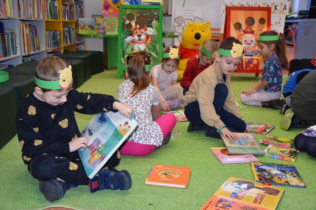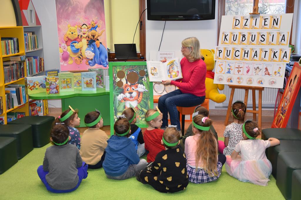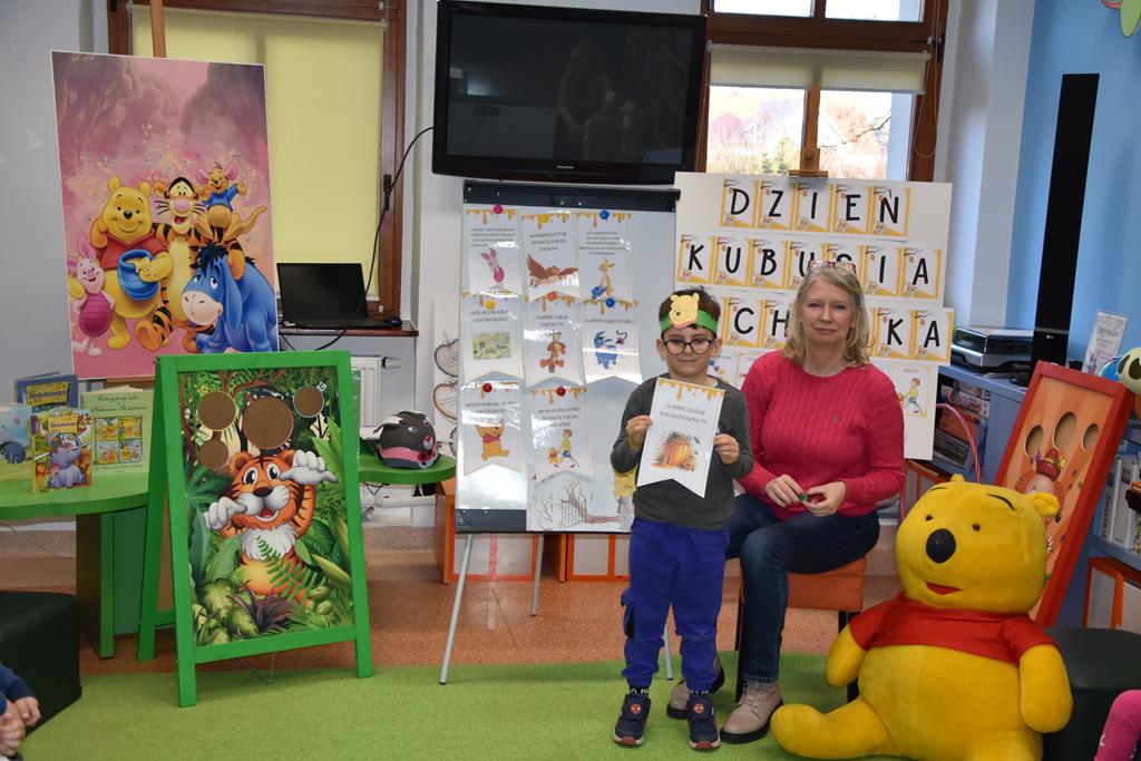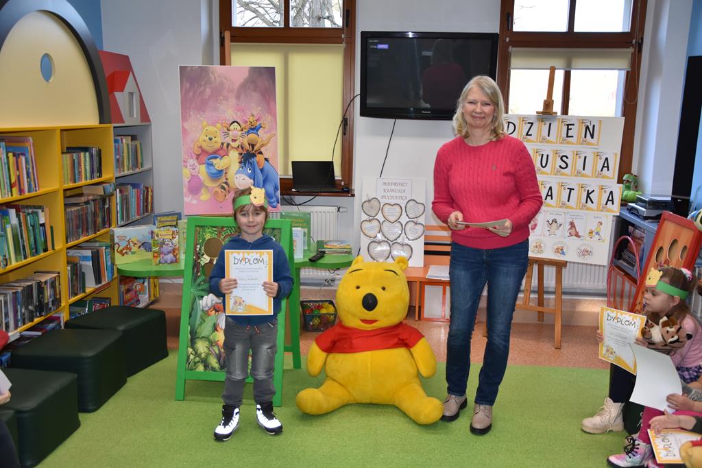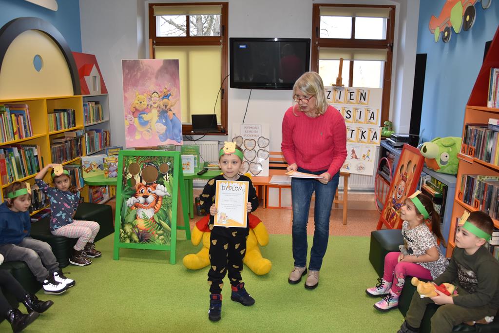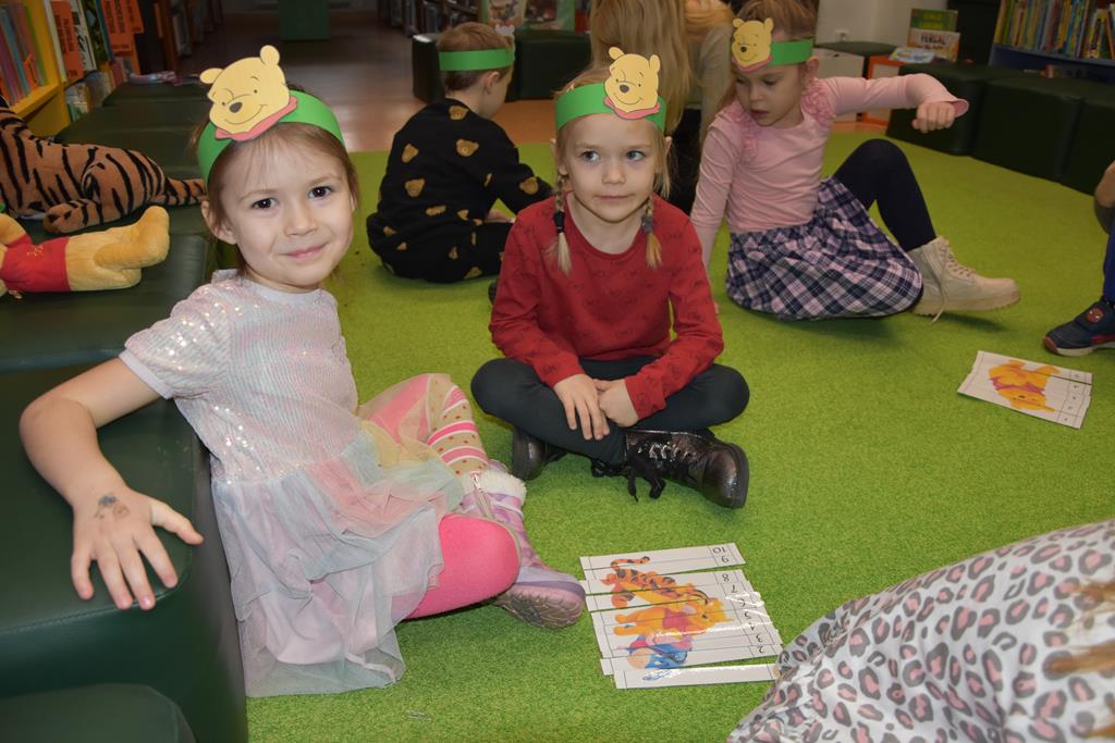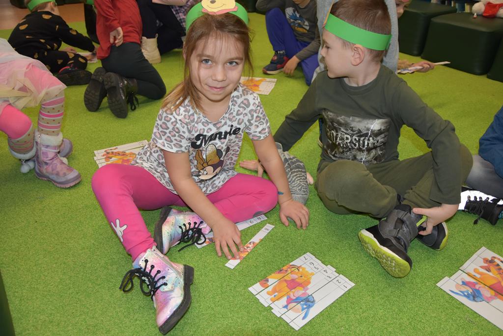 Dnia 17 stycznia 2025 r. dzieci z oddziału ,,Motylki” świętowały Międzynarodowy Dzień Kubusia Puchatka. W tym szczególnym dniu dzieci z maskotkami przedstawiającymi przyjaciół ze Stumilowego Lasu udały się do miejscowej biblioteki. Tam na nasze przedszkolaki czekała pani Agnieszka, która już na wstępie przeczytała przestrzennie ilustrowaną książeczkę o przygodach Kubusia Puchatka, a potem zaprosiła dzieci do udziału w różnych zabawach integracyjnych oraz konkurencjach sprawnościowych. Przedszkolaki m.in. rozpoznawały postacie z bajek, układały w parach puzzle, rozwiązywały zagadki oraz oglądały różne ciekawe książeczki ze zbiorów bibliotecznych. Mamy nadzieję, że urodziny Misia o małym rozumku wszyscy będziemy wspominać z uśmiechem na twarzy i z niecierpliwością oczekiwać kolejnych.