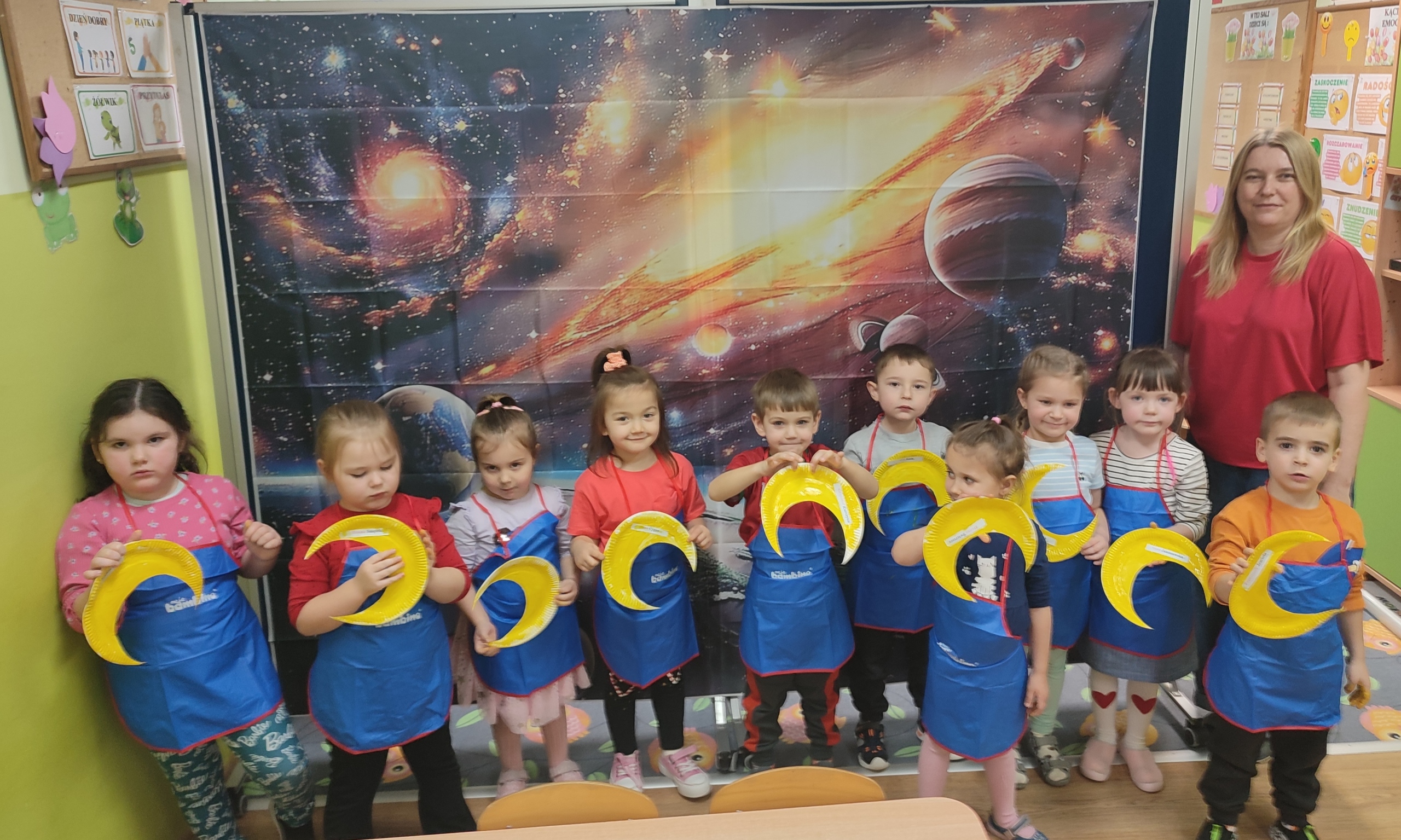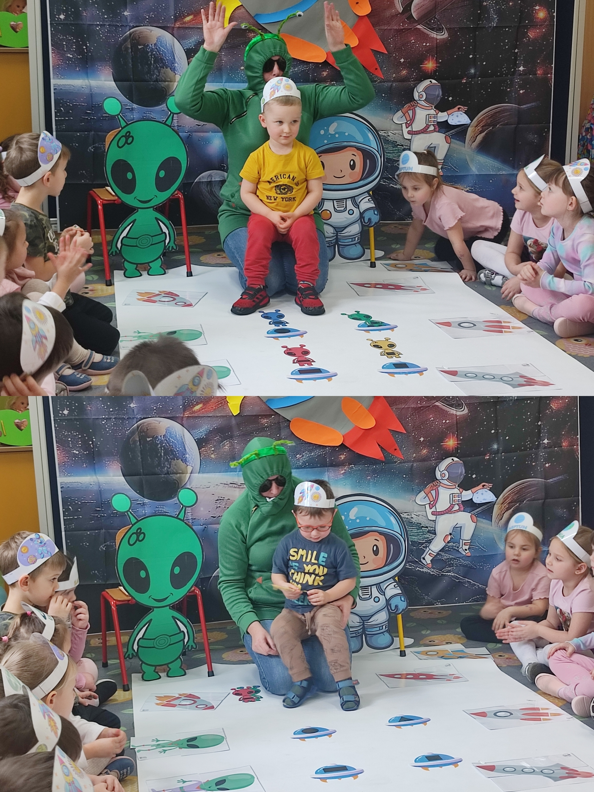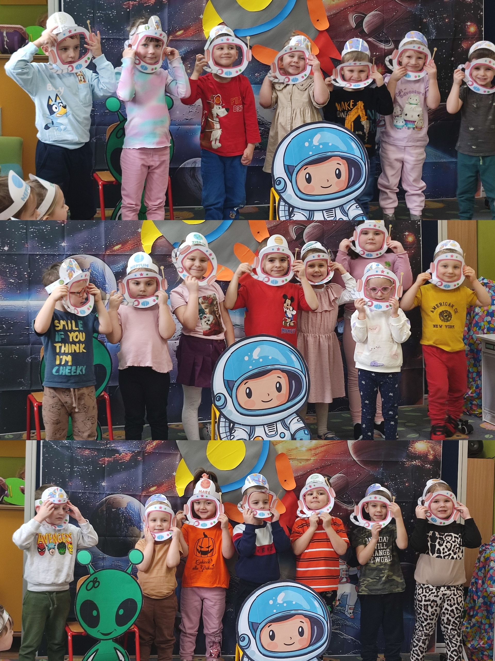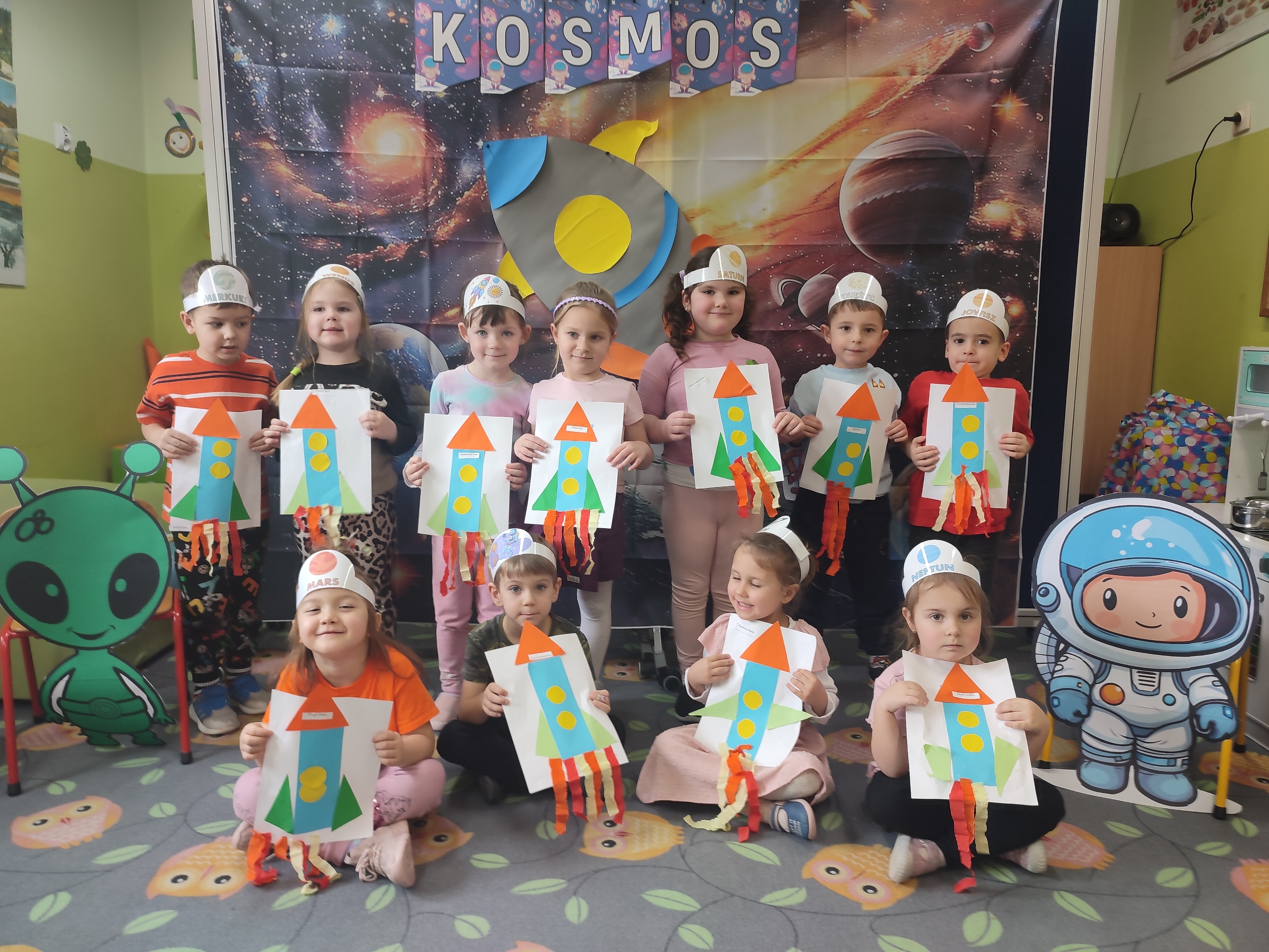 Dzisiaj w grupie Tulipanków i Bratków wydarzyło się coś niezwykłego! Sala przedszkolna zamieniła się w prawdziwą bazę kosmiczną, a nasze dzielne przedszkolaki w odważnych odkrywców. Podczas tej niezwykłej podróży mali odkrywcy poznali tajemnice planet i dowiedzieli się, która z nich jest największa, a która ma pierścienie. Nie zabrakło też wyzwań dla umysłu – podczas zabaw matematycznych przeliczaliśmy pojazdy kosmiczne, układaliśmy gwiezdne wzory. Największą niespodzianką była jednak wizyta gościa z innej galaktyki – odwiedził nas prawdziwy, przyjazny kosmita! Razem z nim trenowaliśmy wysokie skoki w warunkach braku grawitacji i poznawaliśmy międzygwiezdne zwyczaje. Ta przygoda pokazała nam, że wszechświat jest pełen niespodzianek,