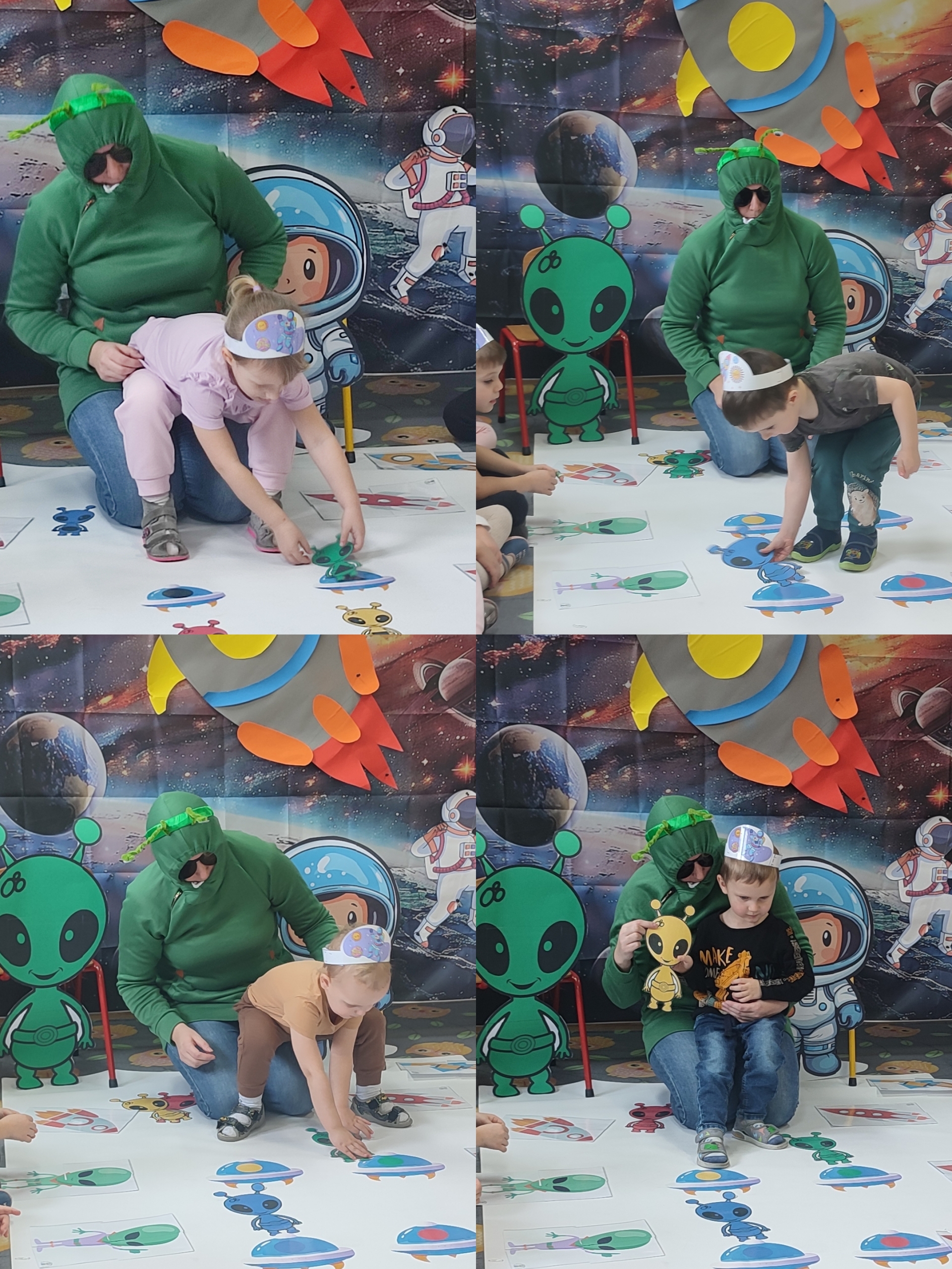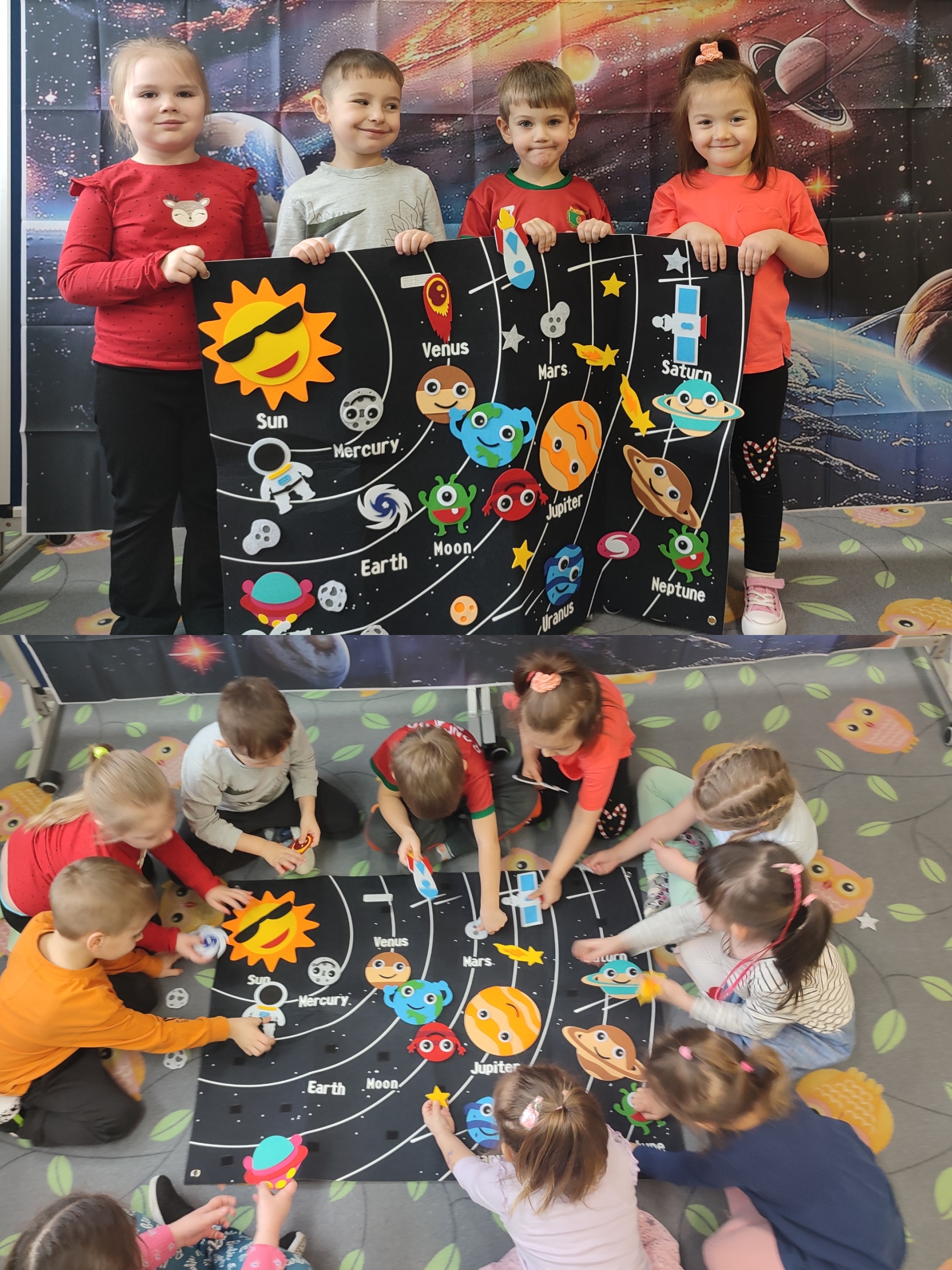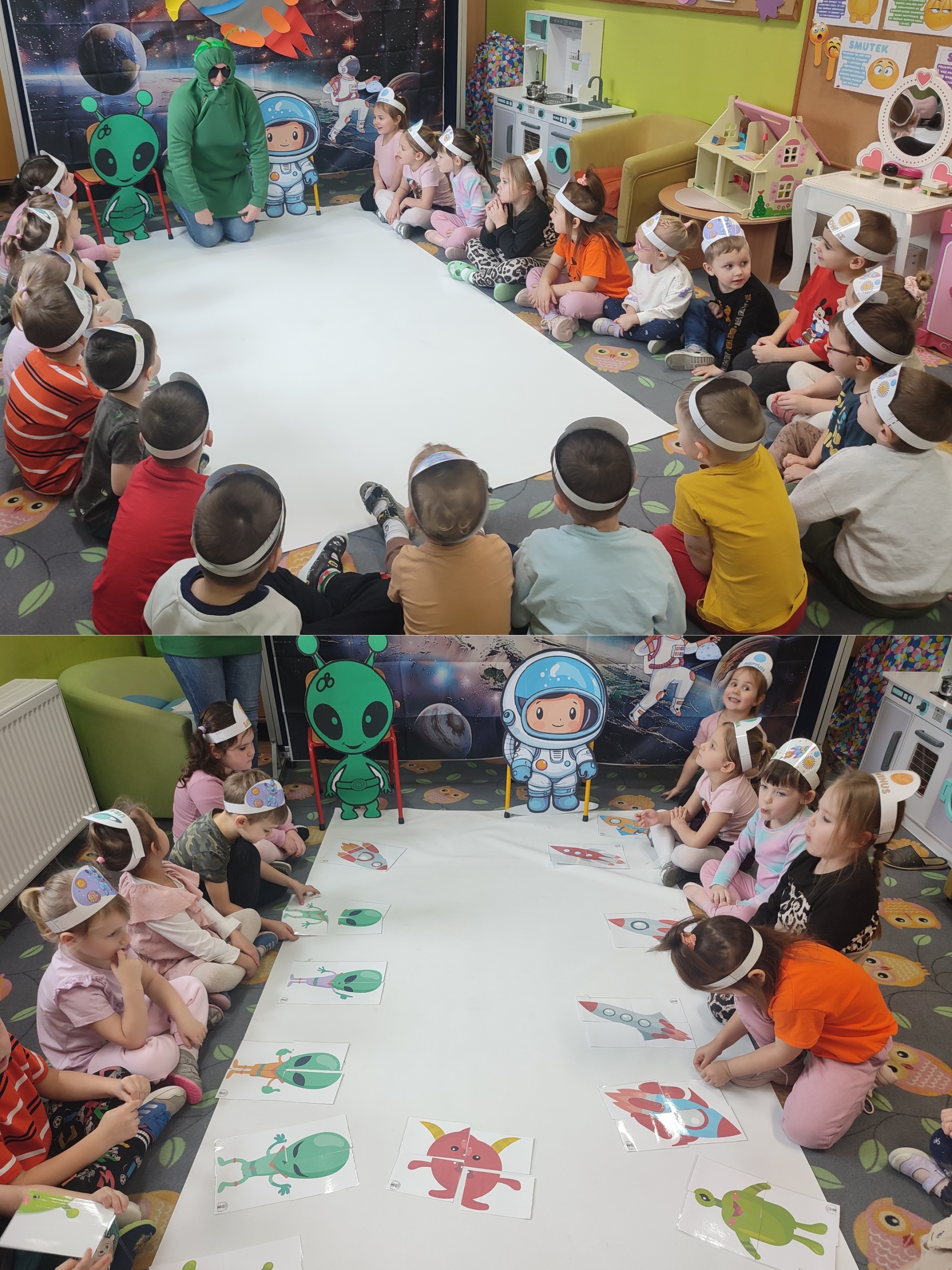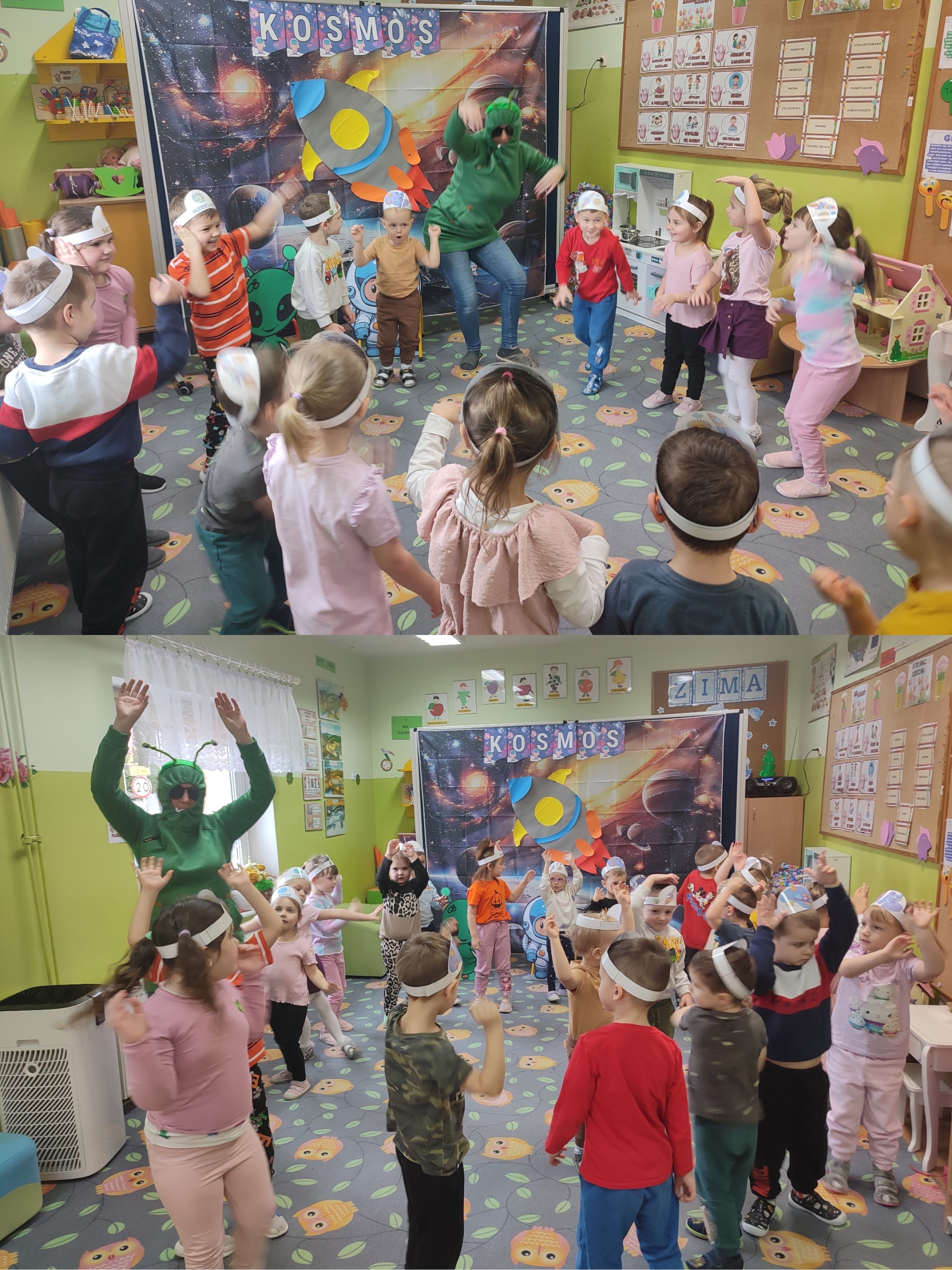 Dzisiaj w grupie Tulipanków i Bratków wydarzyło się coś niezwykłego! Sala przedszkolna zamieniła się w prawdziwą bazę kosmiczną, a nasze dzielne przedszkolaki w odważnych odkrywców. Podczas tej niezwykłej podróży mali odkrywcy poznali tajemnice planet i dowiedzieli się, która z nich jest największa, a która ma pierścienie. Nie zabrakło też wyzwań dla umysłu – podczas zabaw matematycznych przeliczaliśmy pojazdy kosmiczne, układaliśmy gwiezdne wzory. Największą niespodzianką była jednak wizyta gościa z innej galaktyki – odwiedził nas prawdziwy, przyjazny kosmita! Razem z nim trenowaliśmy wysokie skoki w warunkach braku grawitacji i poznawaliśmy międzygwiezdne zwyczaje. Ta przygoda pokazała nam, że wszechświat jest pełen niespodzianek,