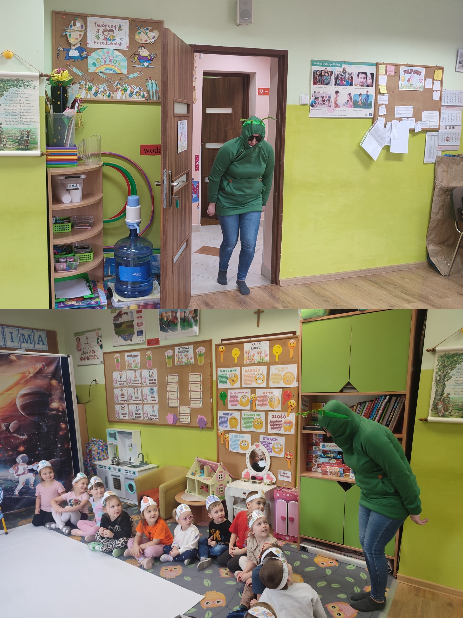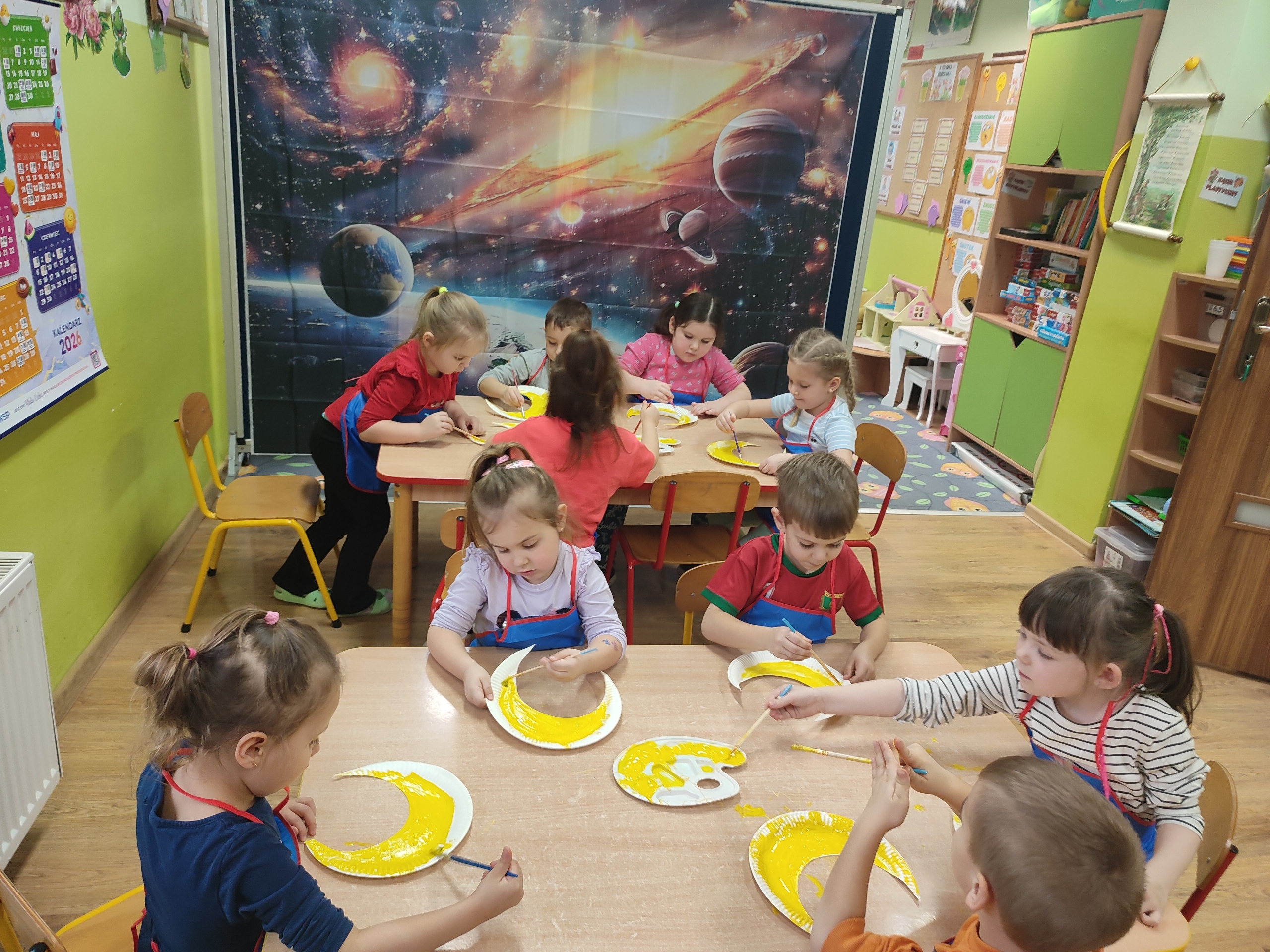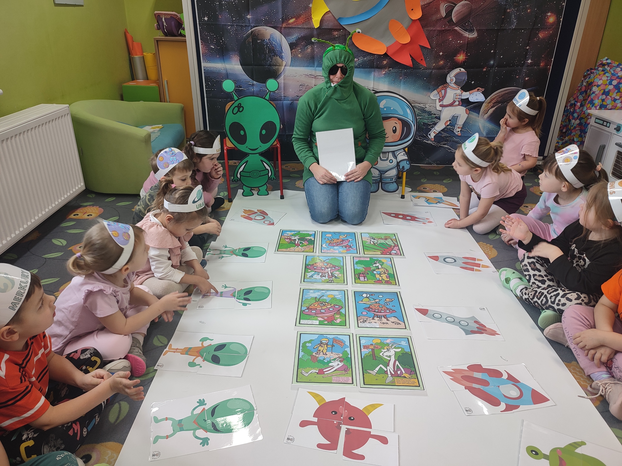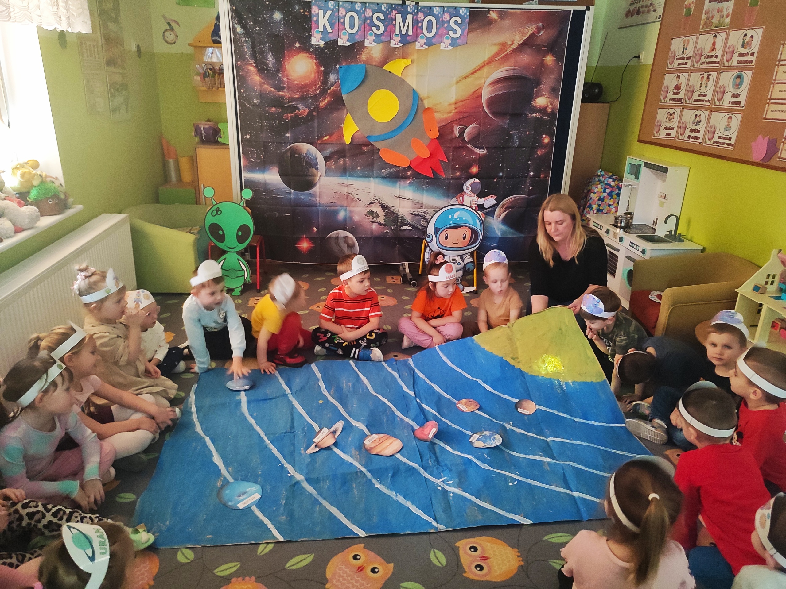 Dzisiaj w grupie Tulipanków i Bratków wydarzyło się coś niezwykłego! Sala przedszkolna zamieniła się w prawdziwą bazę kosmiczną, a nasze dzielne przedszkolaki w odważnych odkrywców. Podczas tej niezwykłej podróży mali odkrywcy poznali tajemnice planet i dowiedzieli się, która z nich jest największa, a która ma pierścienie. Nie zabrakło też wyzwań dla umysłu – podczas zabaw matematycznych przeliczaliśmy pojazdy kosmiczne, układaliśmy gwiezdne wzory. Największą niespodzianką była jednak wizyta gościa z innej galaktyki – odwiedził nas prawdziwy, przyjazny kosmita! Razem z nim trenowaliśmy wysokie skoki w warunkach braku grawitacji i poznawaliśmy międzygwiezdne zwyczaje. Ta przygoda pokazała nam, że wszechświat jest pełen niespodzianek,