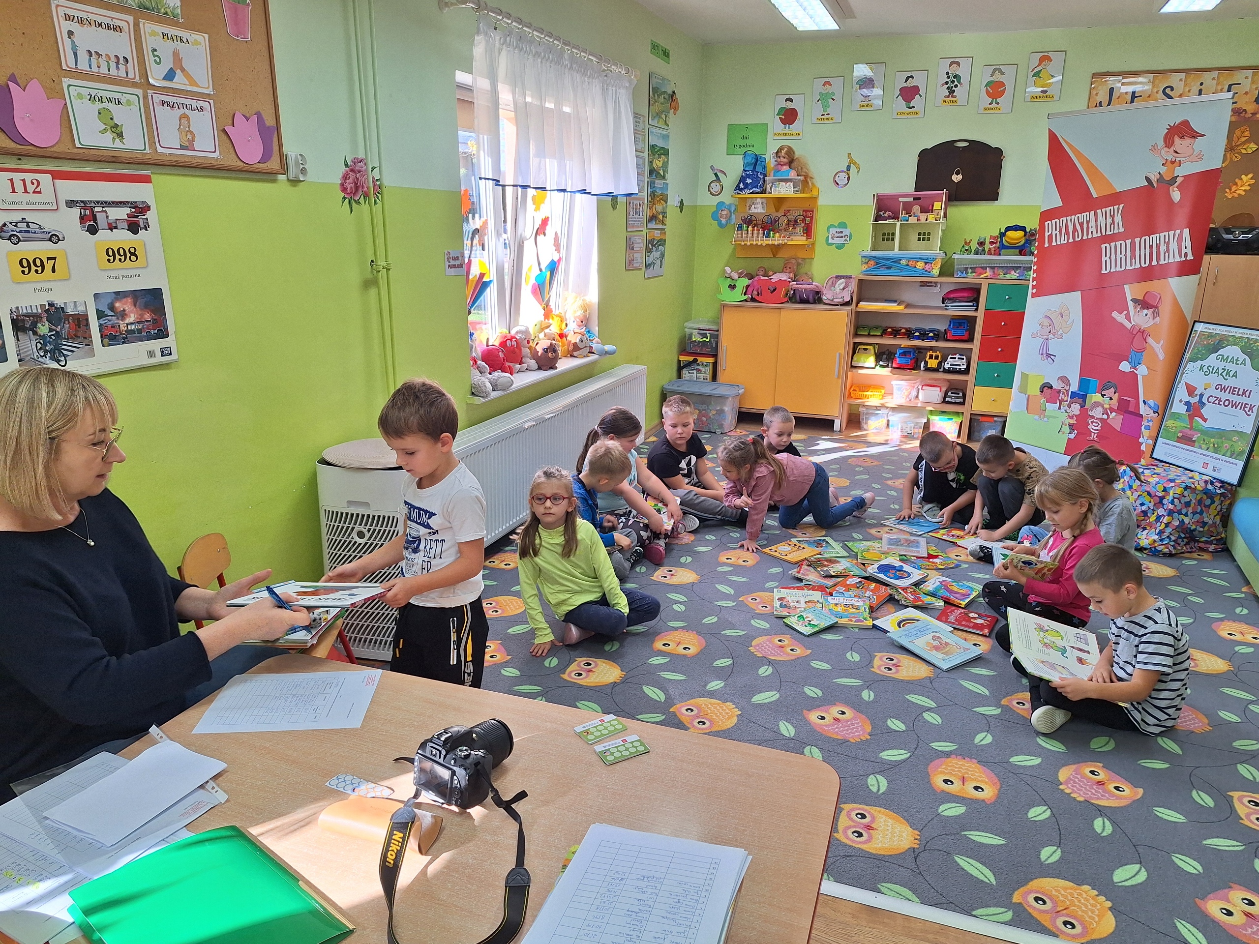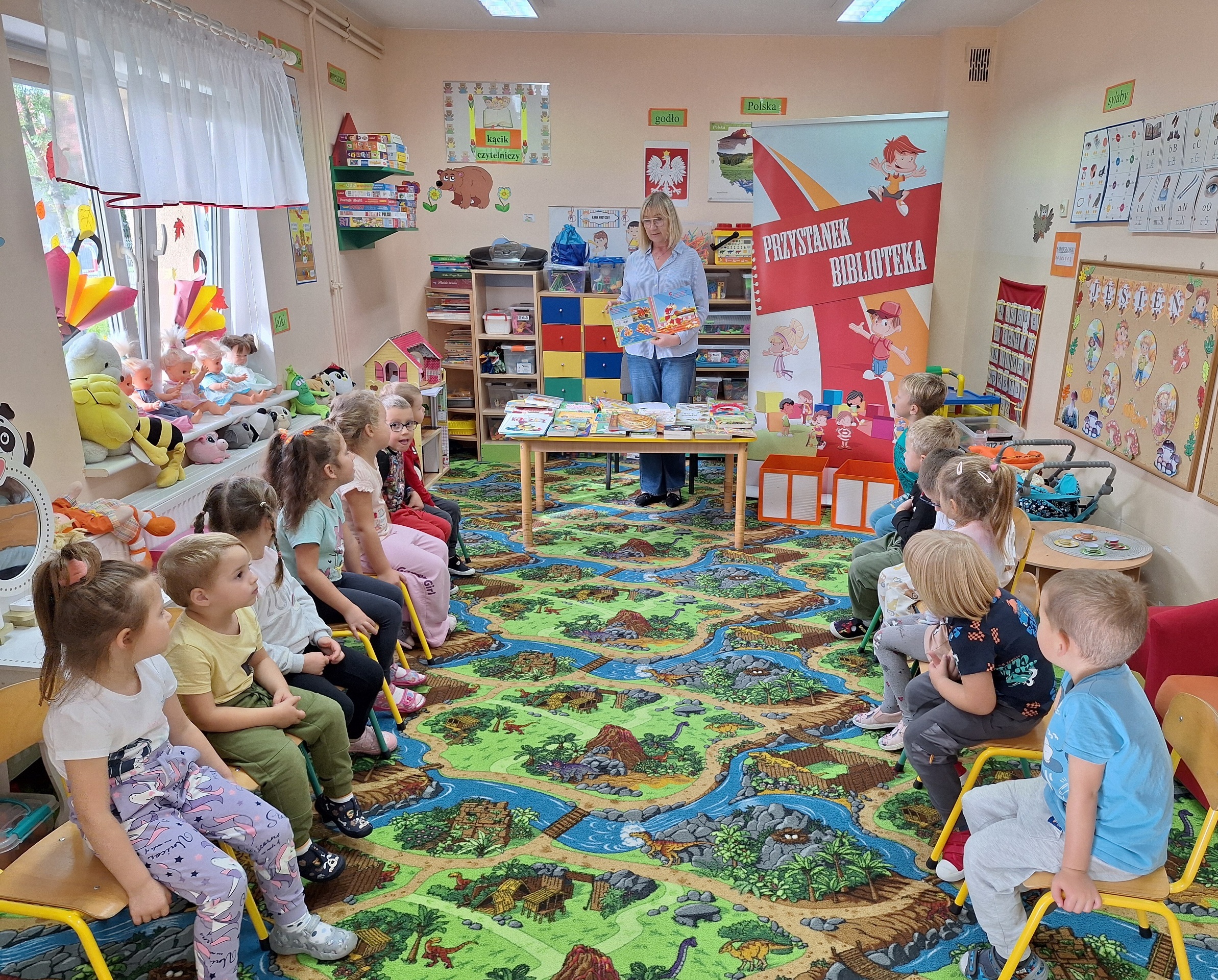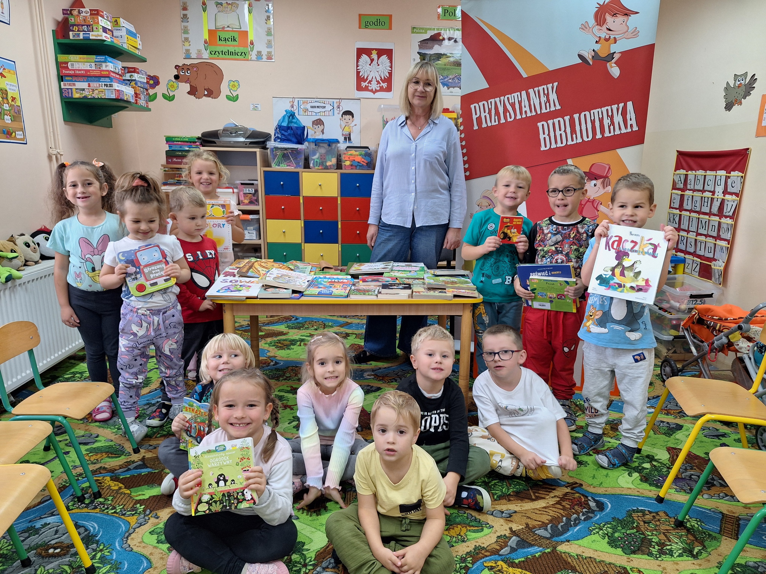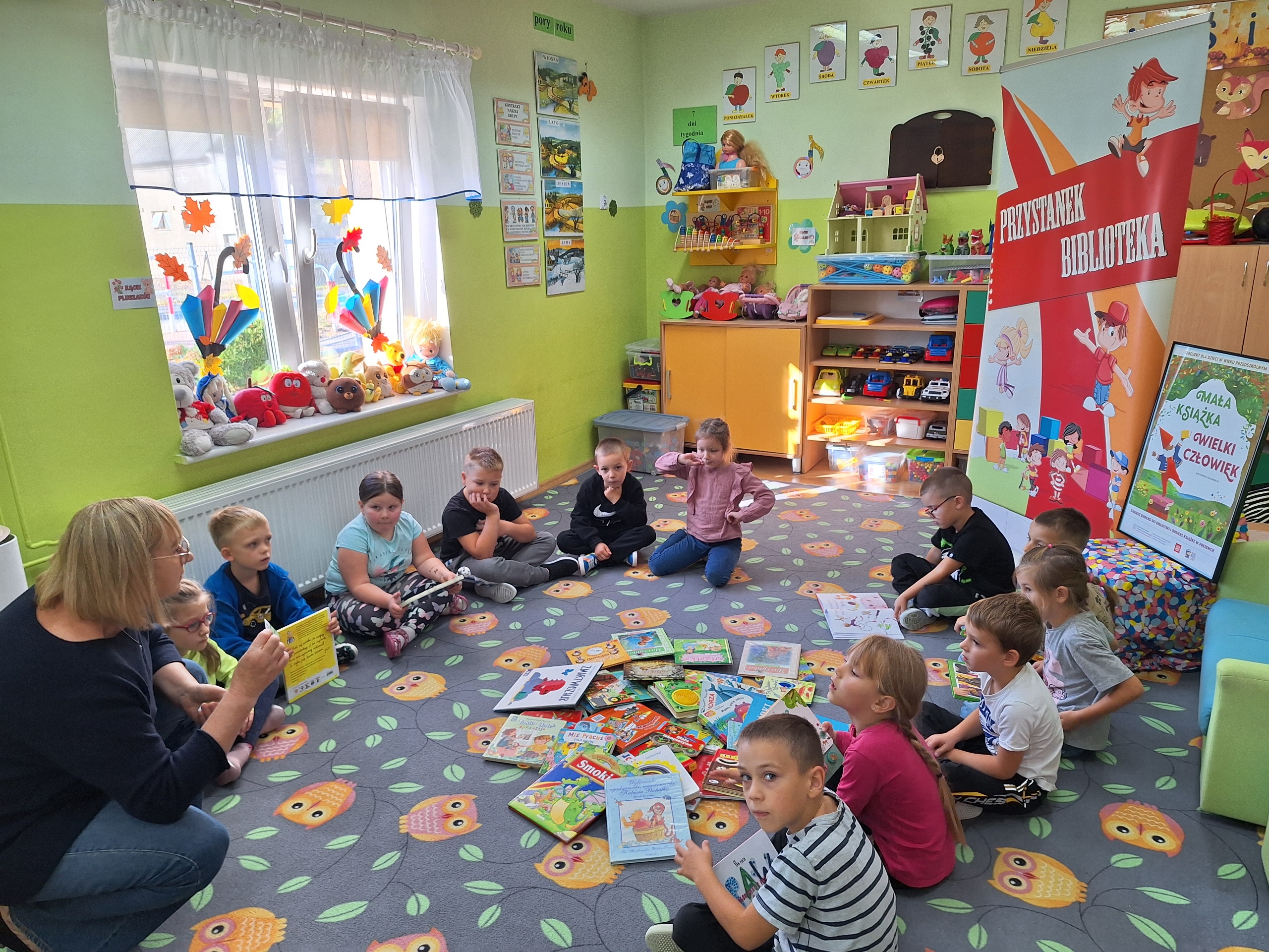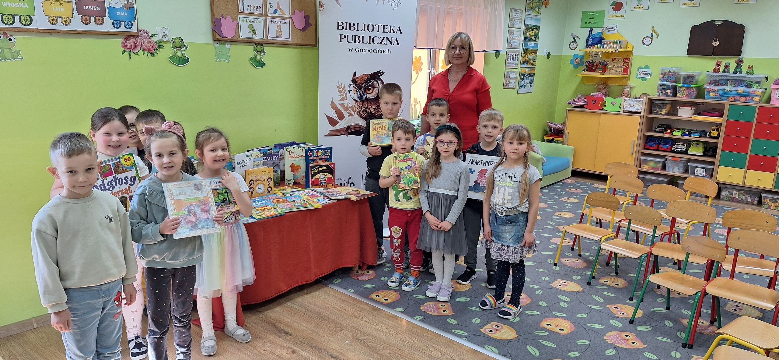 Celem spotkania było rozbudzenie zainteresowania książkami, wzbogacanie słownictwa i pobudzanie wyobraźni. Działaniami edukacyjnymi objęte były dzieci w wieku od 3 do 6 lat. Bibliotekarz zwracał uwagę dzieci na poznawcze walory książek, sytuacje humorystyczne oraz kolorowe ilustracje zachęcając przedszkolaków do czytania książek. Dzieci w trakcie spotkań odpowiadały na zadawane pytania, dotyczące w jaki sposób trzeba szanować książki oraz jakich zachowań należy się wystrzegać podczas czytania. Dzięki tym spotkaniom przedszkolaki miały łatwiejszy dostęp do książek, które rozweselały, uczyły i inspirowały do odkrywania nowych światów. Dziękujemy Pani Barbarze Tasarz za owocną współpracę.