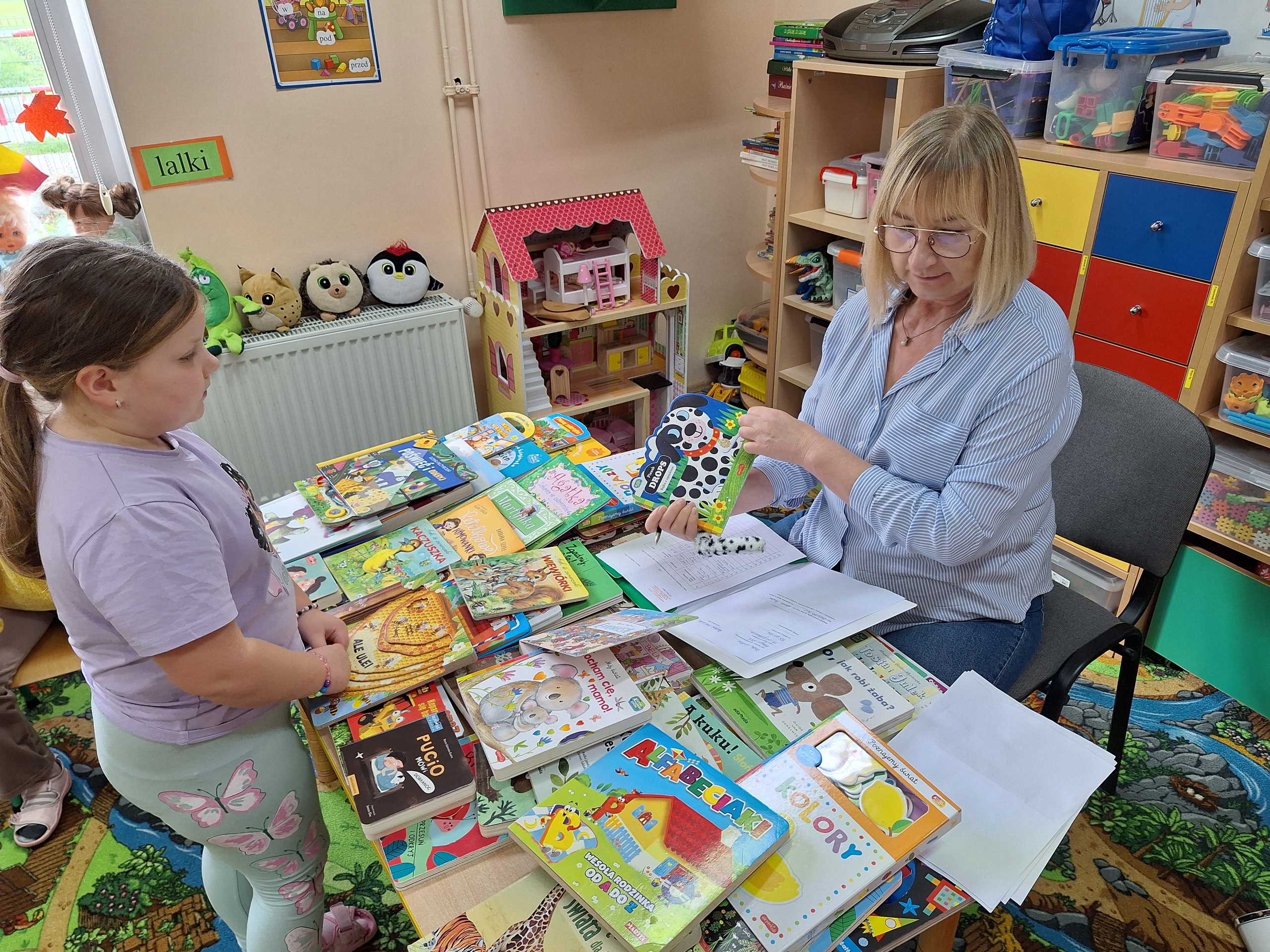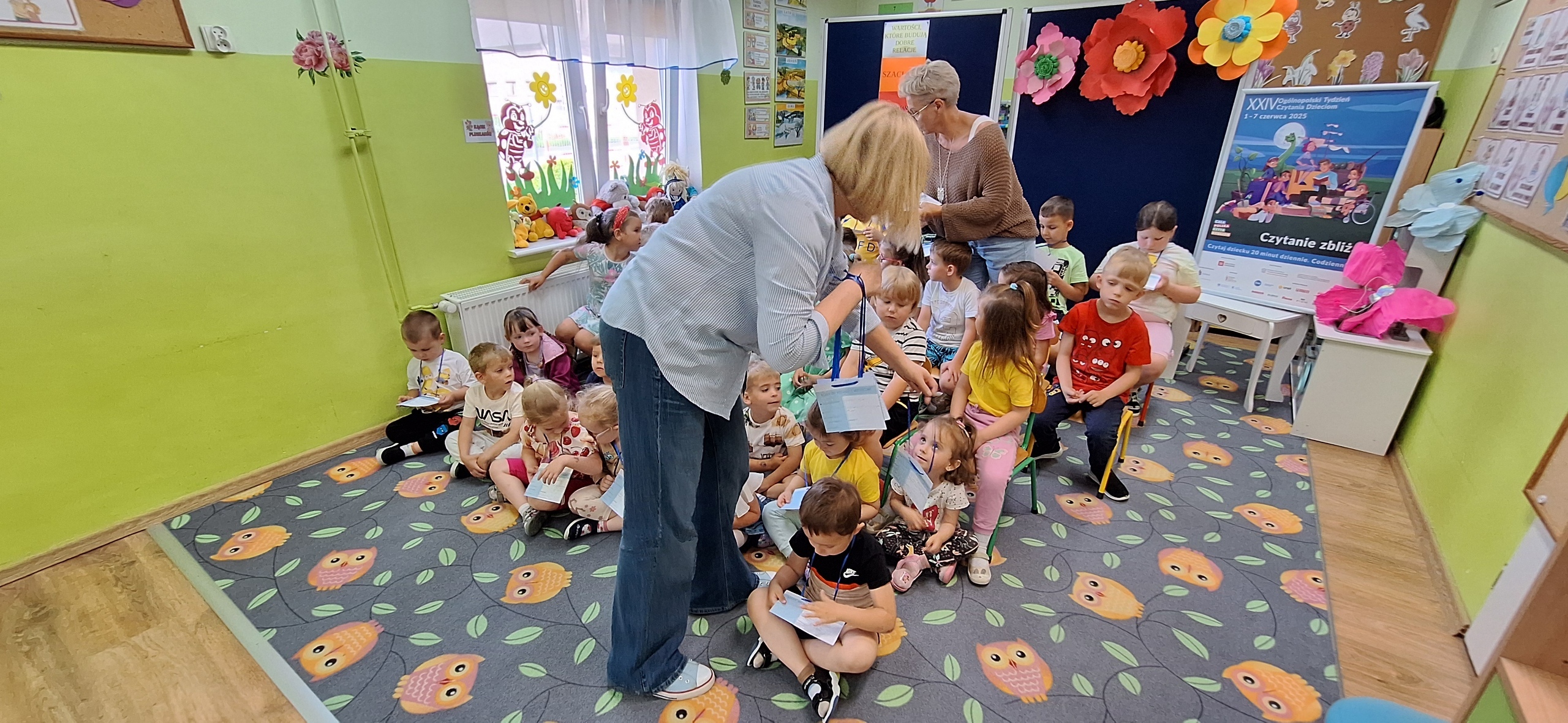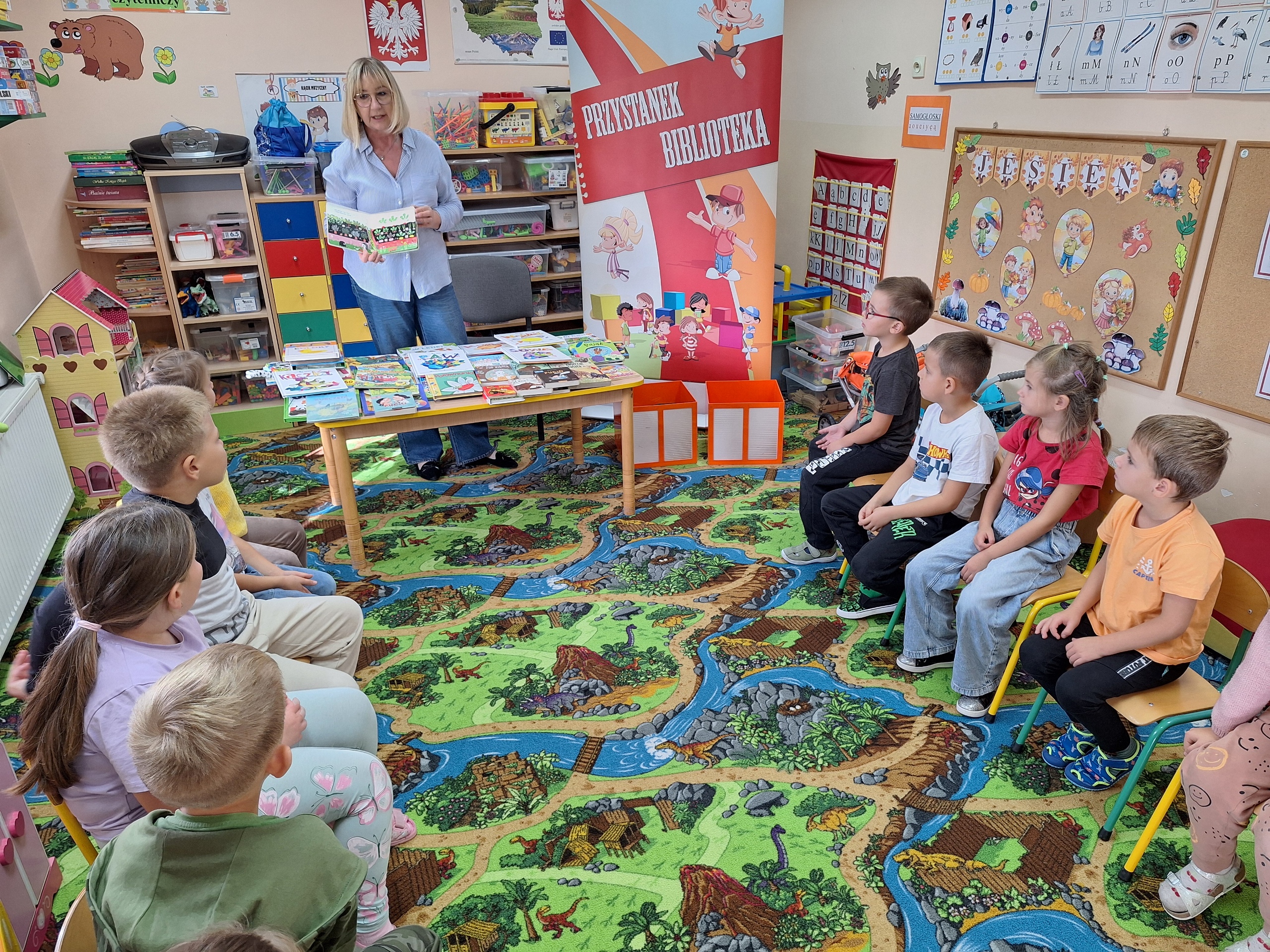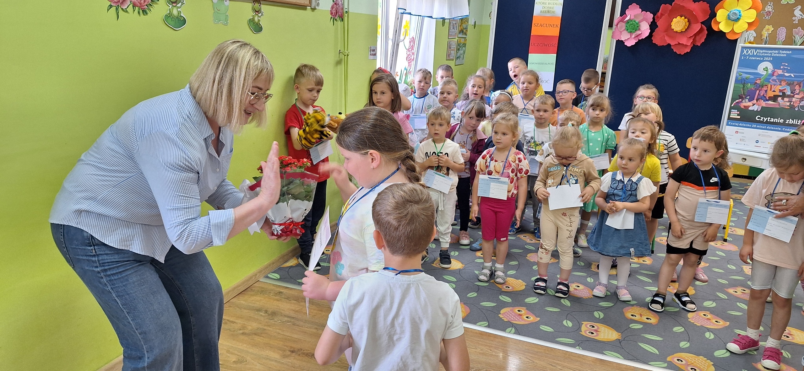 Celem spotkania było rozbudzenie zainteresowania książkami, wzbogacanie słownictwa i pobudzanie wyobraźni. Działaniami edukacyjnymi objęte były dzieci w wieku od 3 do 6 lat. Bibliotekarz zwracał uwagę dzieci na poznawcze walory książek, sytuacje humorystyczne oraz kolorowe ilustracje zachęcając przedszkolaków do czytania książek. Dzieci w trakcie spotkań odpowiadały na zadawane pytania, dotyczące w jaki sposób trzeba szanować książki oraz jakich zachowań należy się wystrzegać podczas czytania. Dzięki tym spotkaniom przedszkolaki miały łatwiejszy dostęp do książek, które rozweselały, uczyły i inspirowały do odkrywania nowych światów. Dziękujemy Pani Barbarze Tasarz za owocną współpracę.