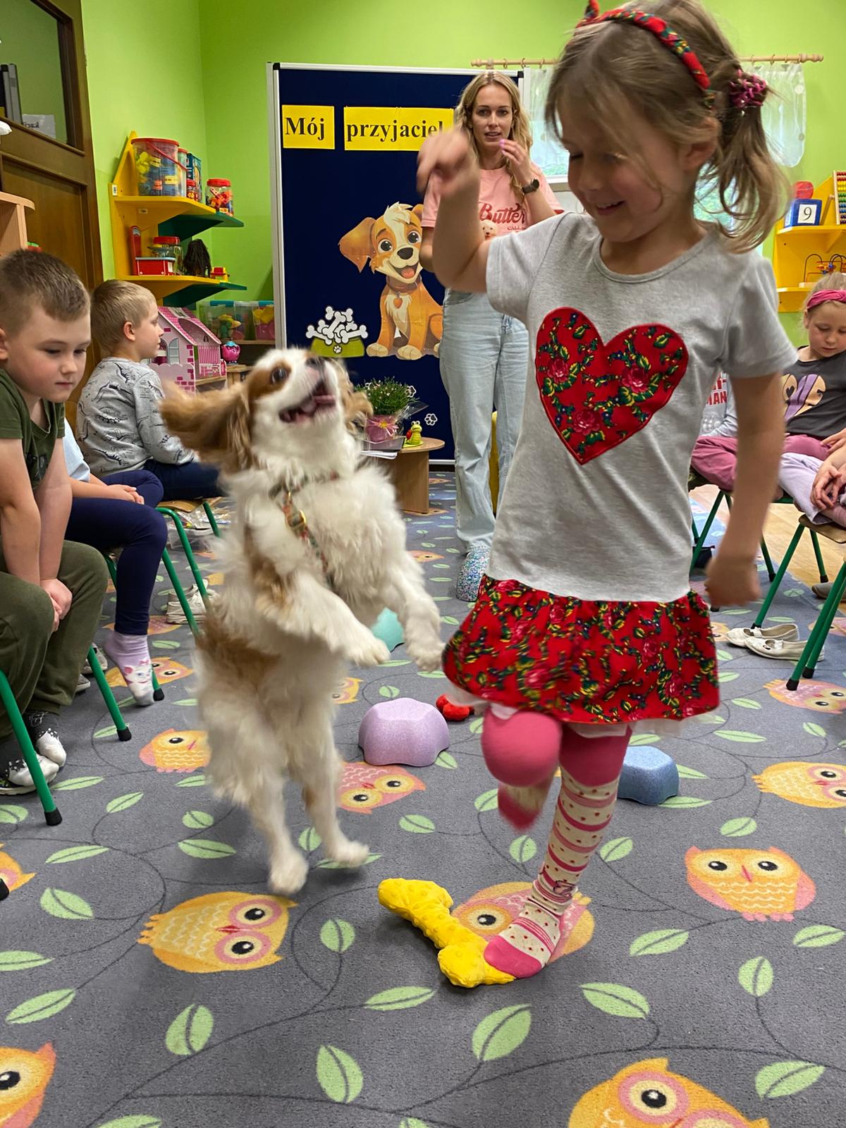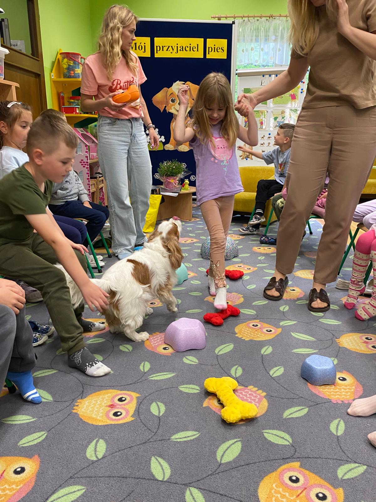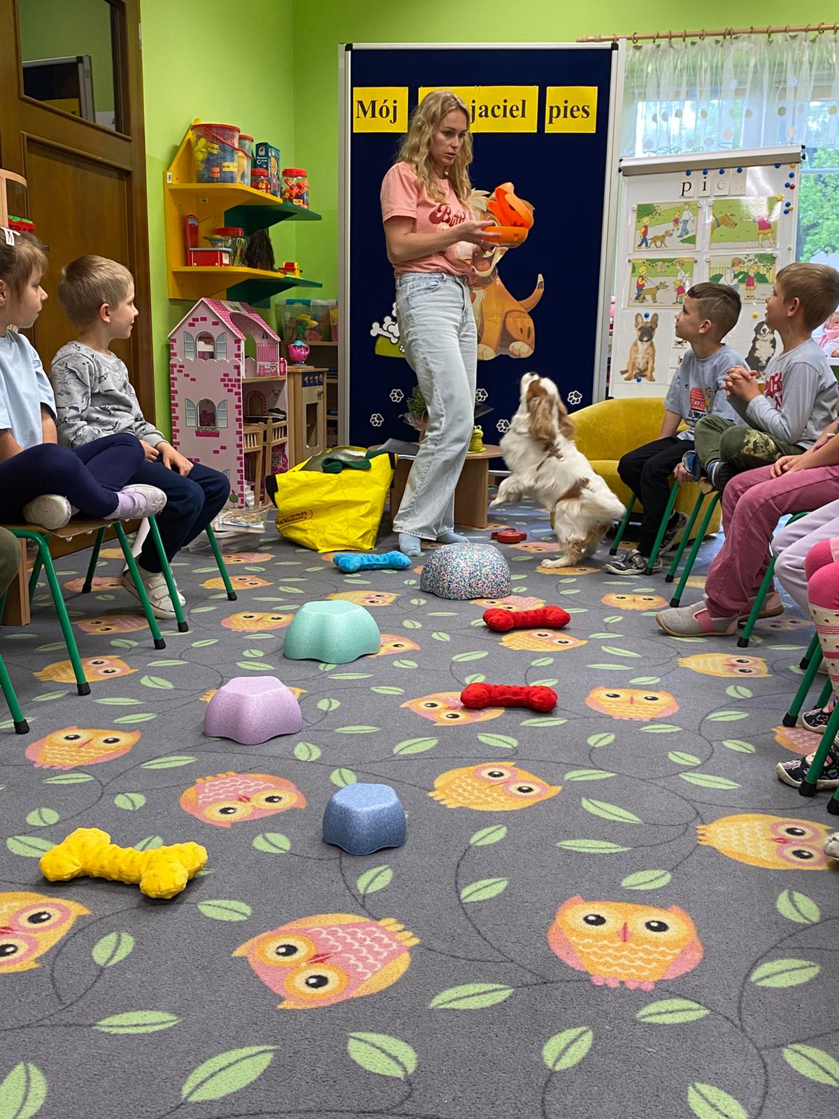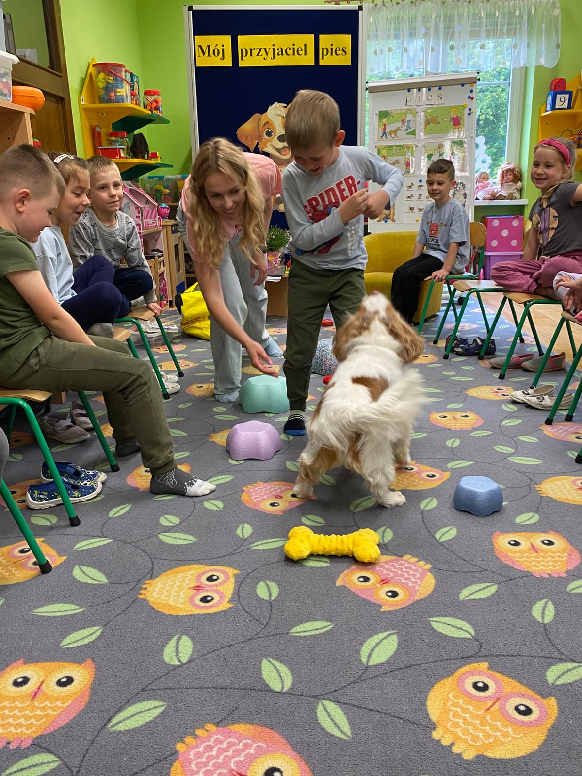 Zajęcia z dogoterapii, to zajęcia terapeutyczne z psem. Dzieci poprzez kontakt z czworonogiem bardzo często przełamują lęki, uczą się okazywać emocje i ćwiczą koncentrację uwagi. W poniedziałek, 19 maja oddział ,,Motylki” odwiedził niezwykły, czworonożny gość – suczka Szila wraz z instruktorką dogoterapii – panią Barbarą Dembek. Pani Basia przeprowadziła zabawy edukacyjne, podczas których dzieci mogły głaskać pieska, karmić go przysmakami, ukrywać je w macie węchowej i pokonywać z pieskiem tor przeszkód. Podczas praktycznych zajęć dzieci utrwaliły swoją wiedzę dotyczącą właściwego opiekowania się i traktowania czworonożnych przyjaciół.