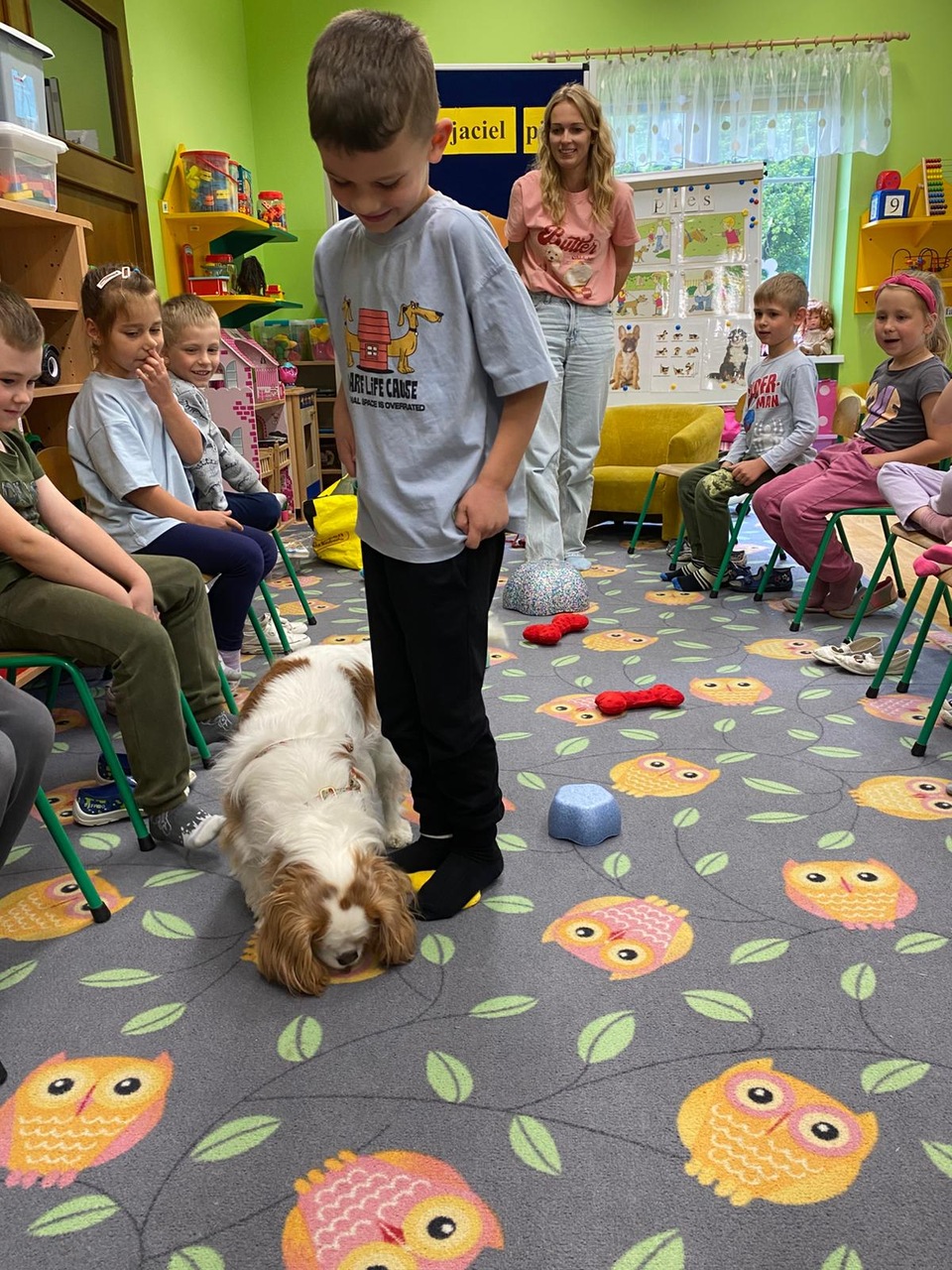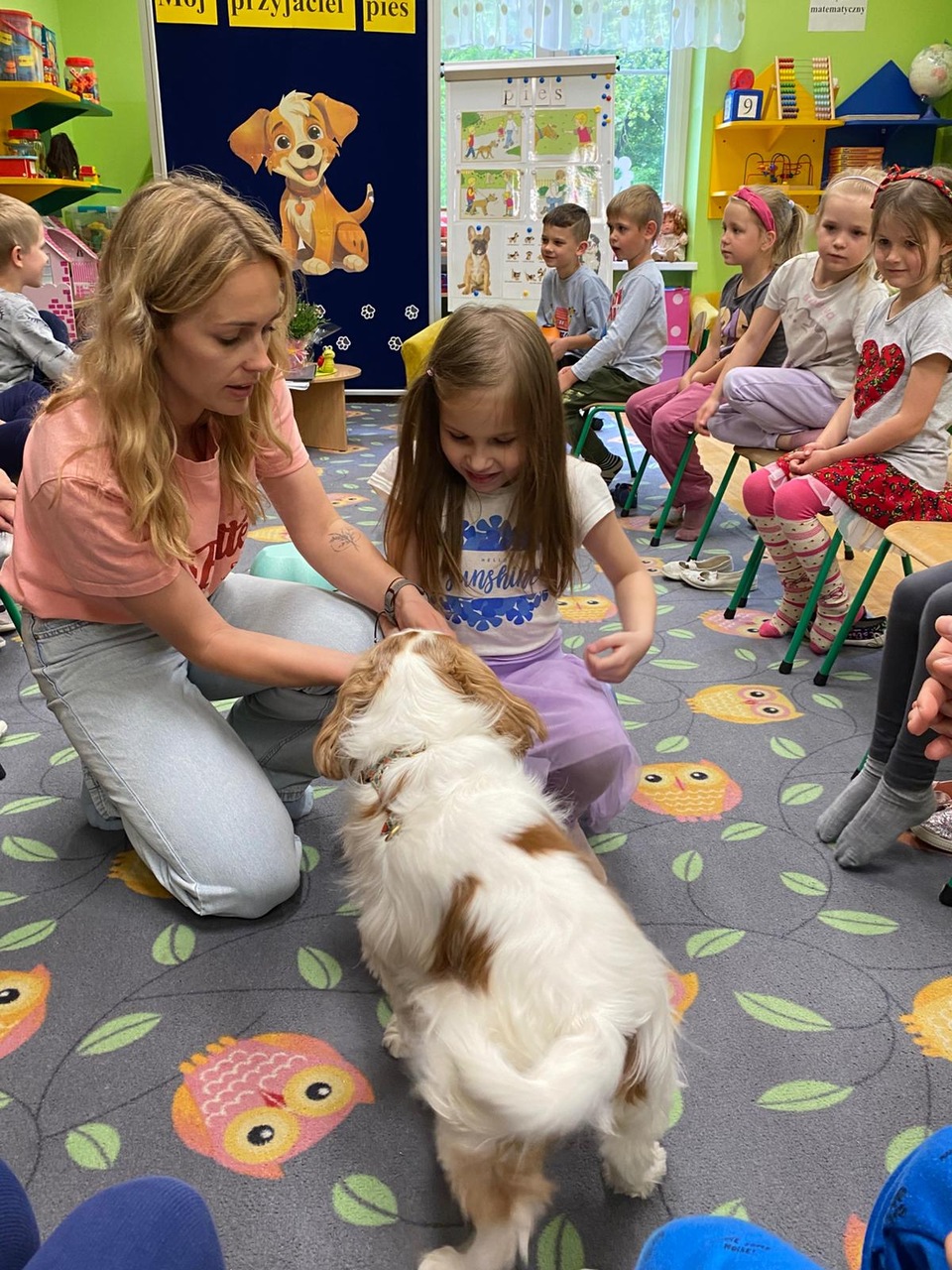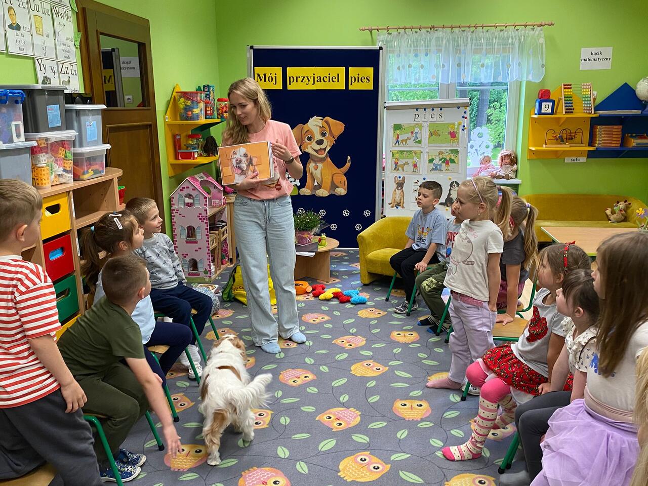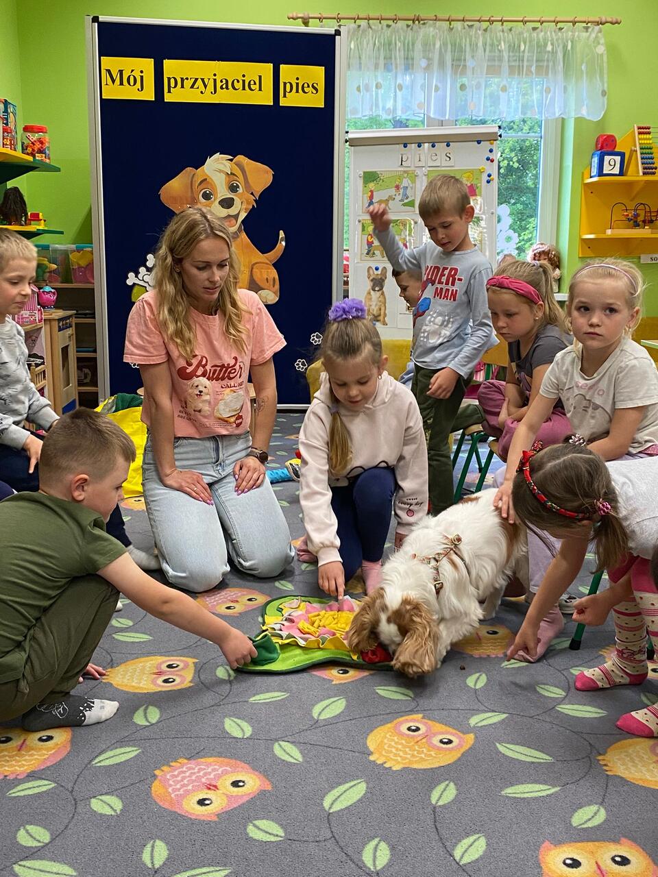 Zajęcia z dogoterapii, to zajęcia terapeutyczne z psem. Dzieci poprzez kontakt z czworonogiem bardzo często przełamują lęki, uczą się okazywać emocje i ćwiczą koncentrację uwagi. W poniedziałek, 19 maja oddział ,,Motylki” odwiedził niezwykły, czworonożny gość – suczka Szila wraz z instruktorką dogoterapii – panią Barbarą Dembek. Pani Basia przeprowadziła zabawy edukacyjne, podczas których dzieci mogły głaskać pieska, karmić go przysmakami, ukrywać je w macie węchowej i pokonywać z pieskiem tor przeszkód. Podczas praktycznych zajęć dzieci utrwaliły swoją wiedzę dotyczącą właściwego opiekowania się i traktowania czworonożnych przyjaciół.