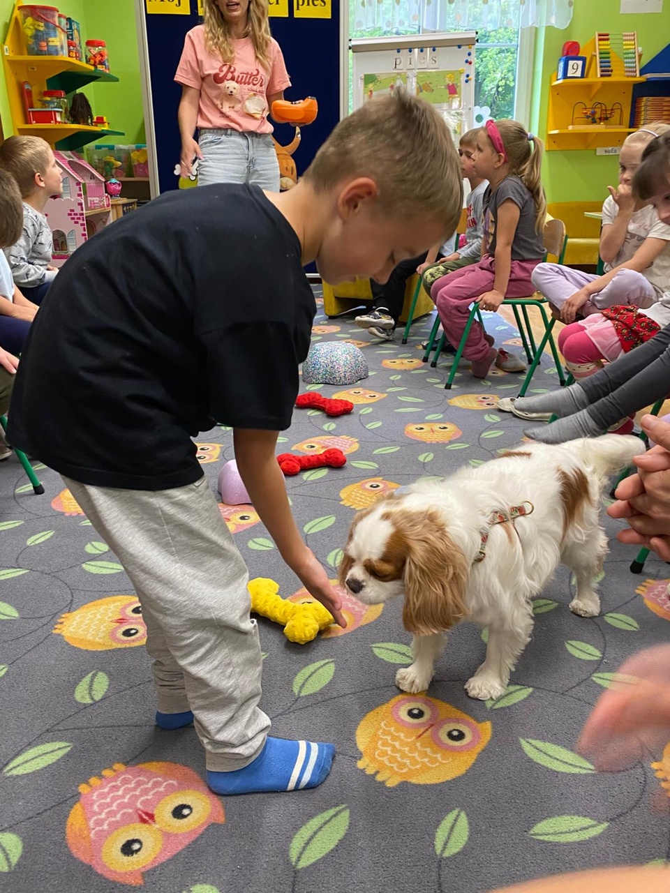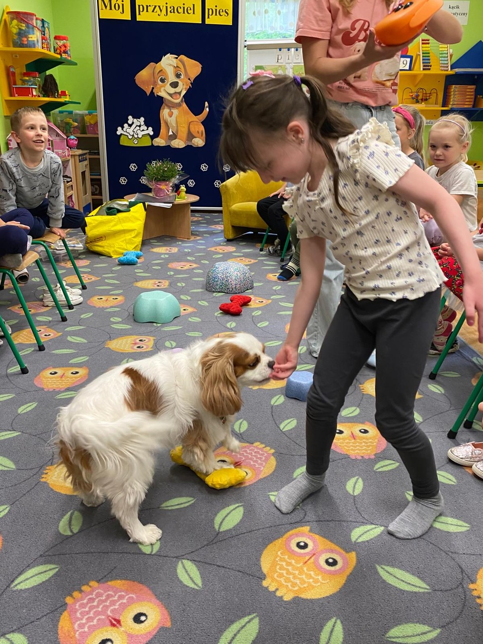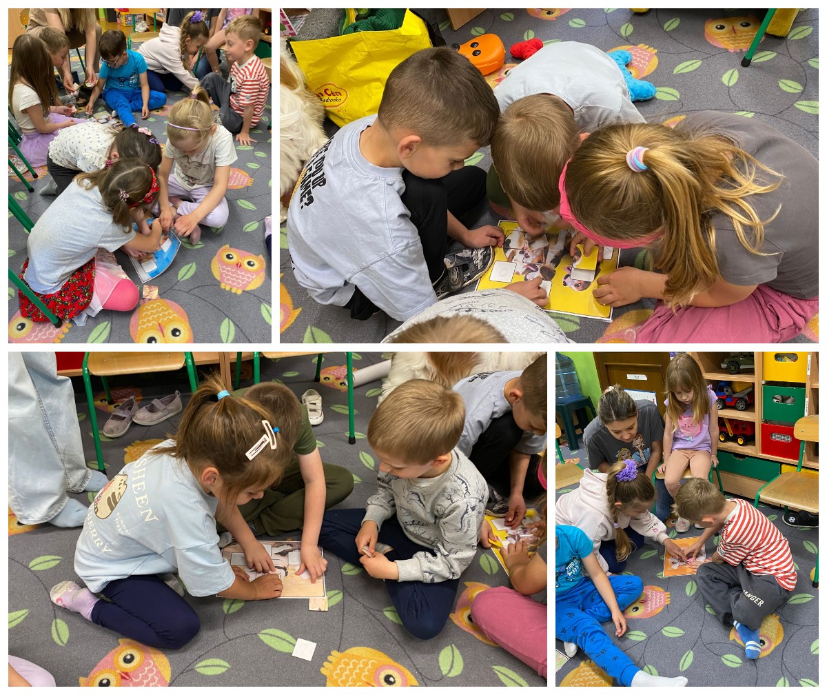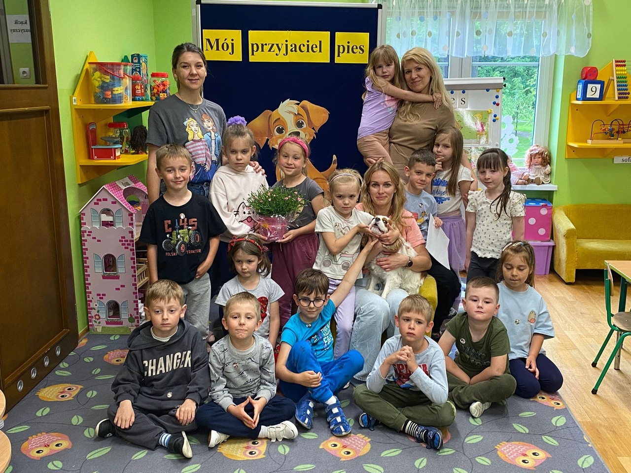 Zajęcia z dogoterapii, to zajęcia terapeutyczne z psem. Dzieci poprzez kontakt z czworonogiem bardzo często przełamują lęki, uczą się okazywać emocje i ćwiczą koncentrację uwagi. W poniedziałek, 19 maja oddział ,,Motylki” odwiedził niezwykły, czworonożny gość – suczka Szila wraz z instruktorką dogoterapii – panią Barbarą Dembek. Pani Basia przeprowadziła zabawy edukacyjne, podczas których dzieci mogły głaskać pieska, karmić go przysmakami, ukrywać je w macie węchowej i pokonywać z pieskiem tor przeszkód. Podczas praktycznych zajęć dzieci utrwaliły swoją wiedzę dotyczącą właściwego opiekowania się i traktowania czworonożnych przyjaciół.