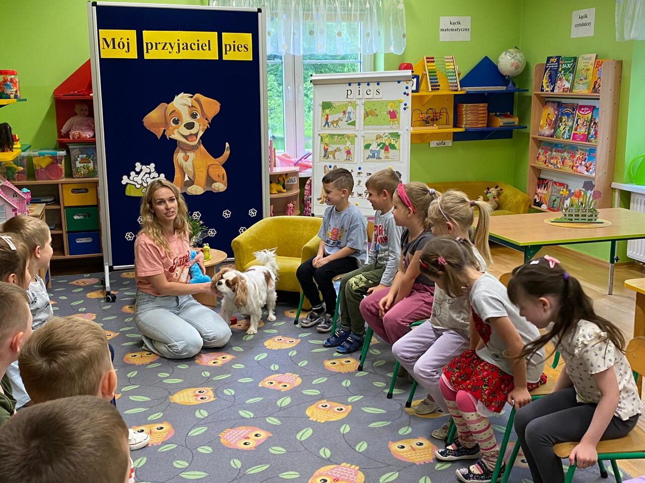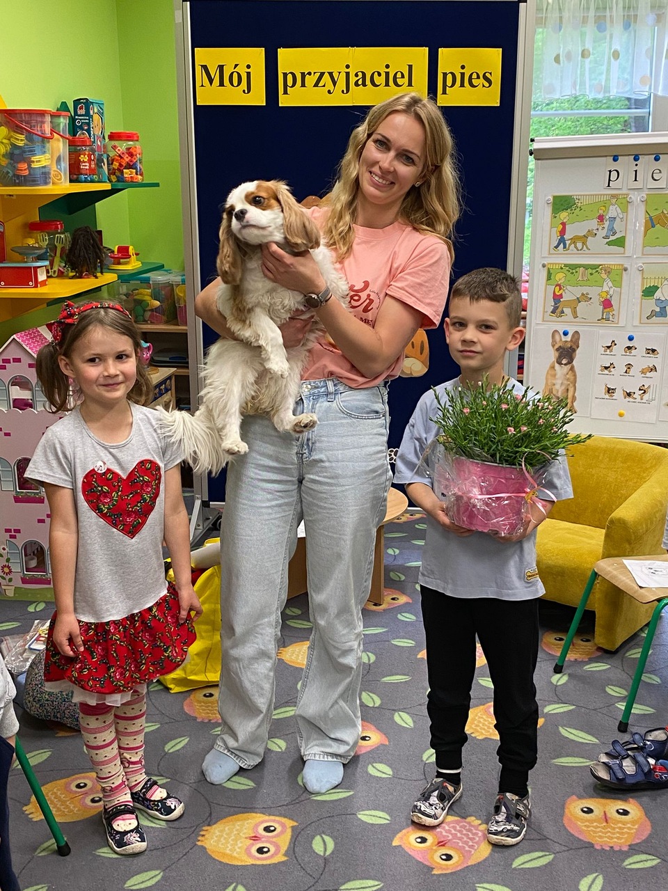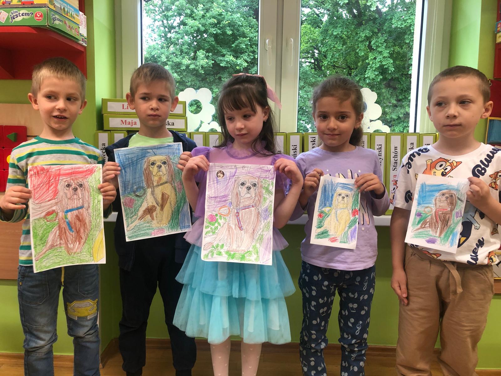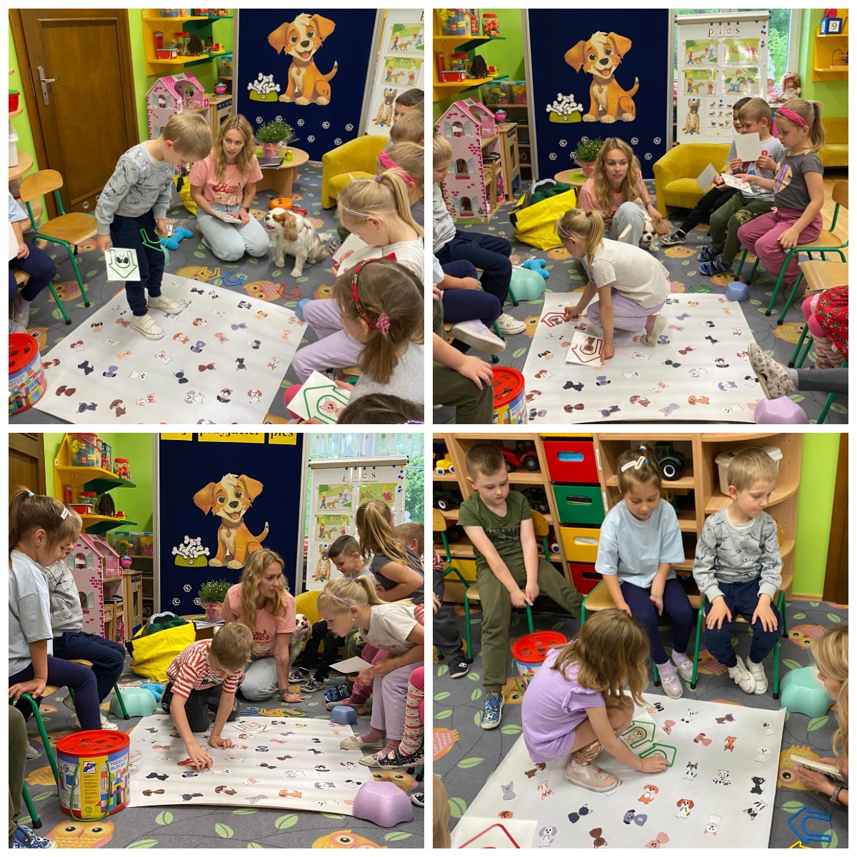 Zajęcia z dogoterapii, to zajęcia terapeutyczne z psem. Dzieci poprzez kontakt z czworonogiem bardzo często przełamują lęki, uczą się okazywać emocje i ćwiczą koncentrację uwagi. W poniedziałek, 19 maja oddział ,,Motylki” odwiedził niezwykły, czworonożny gość – suczka Szila wraz z instruktorką dogoterapii – panią Barbarą Dembek. Pani Basia przeprowadziła zabawy edukacyjne, podczas których dzieci mogły głaskać pieska, karmić go przysmakami, ukrywać je w macie węchowej i pokonywać z pieskiem tor przeszkód. Podczas praktycznych zajęć dzieci utrwaliły swoją wiedzę dotyczącą właściwego opiekowania się i traktowania czworonożnych przyjaciół.
