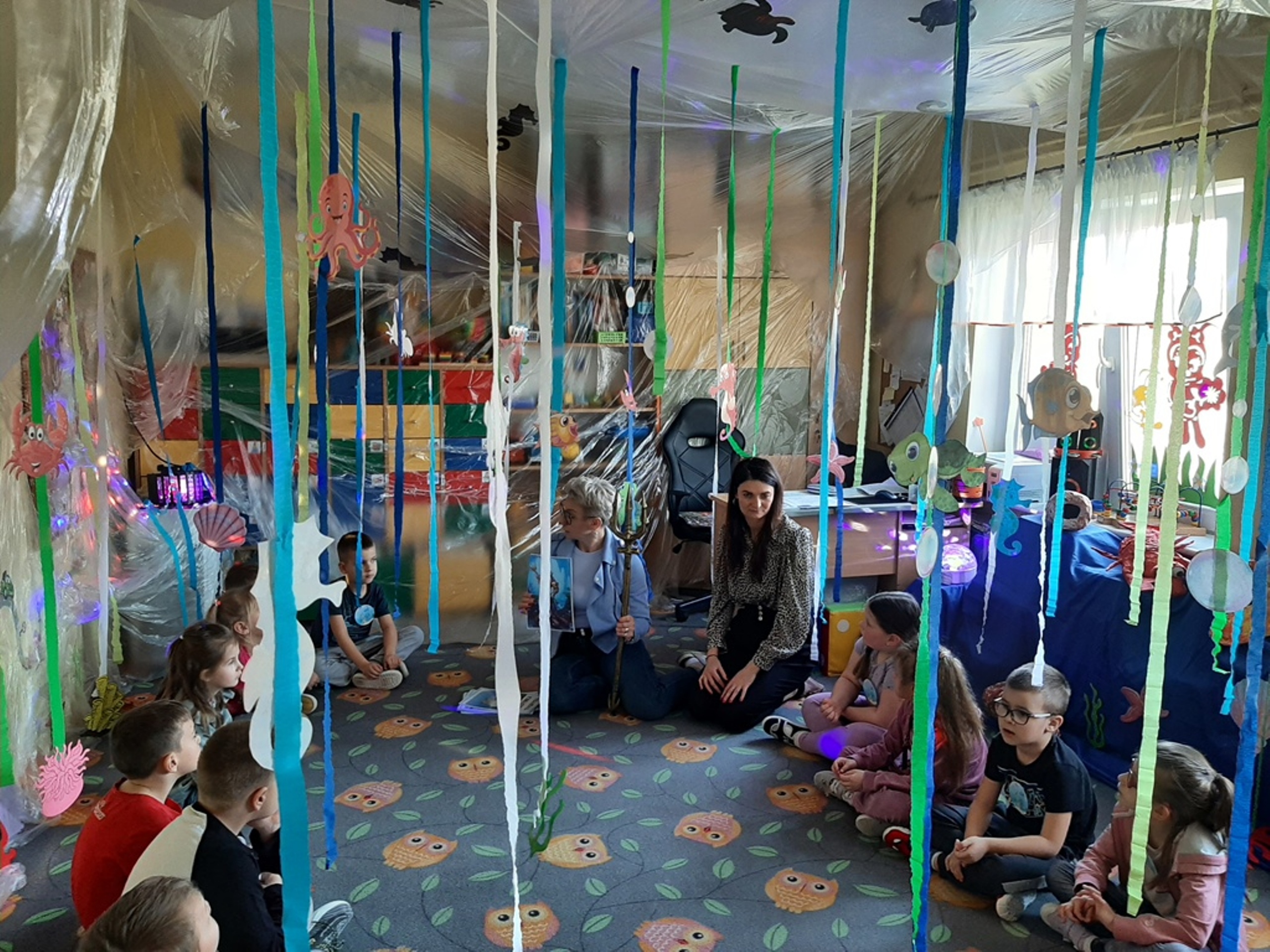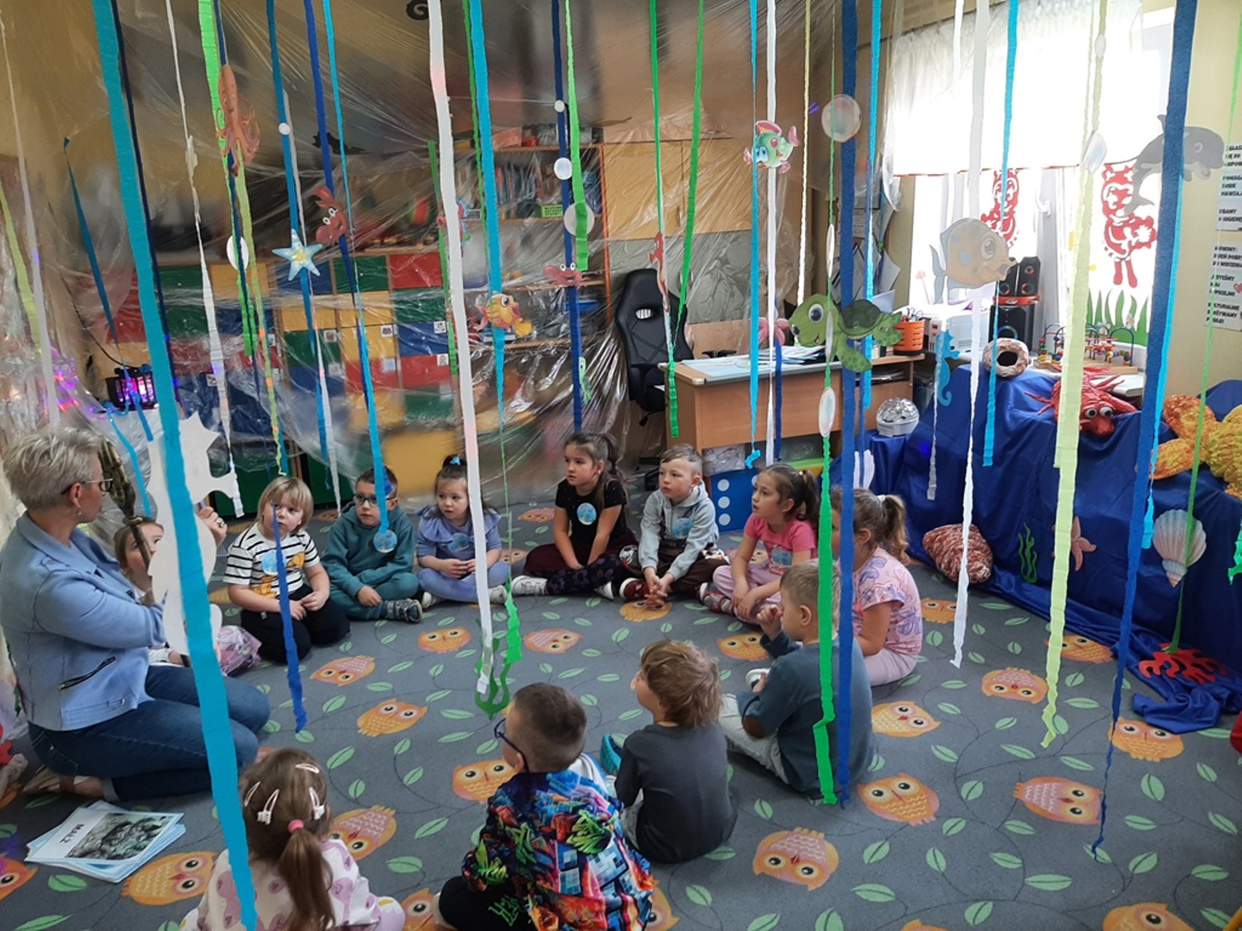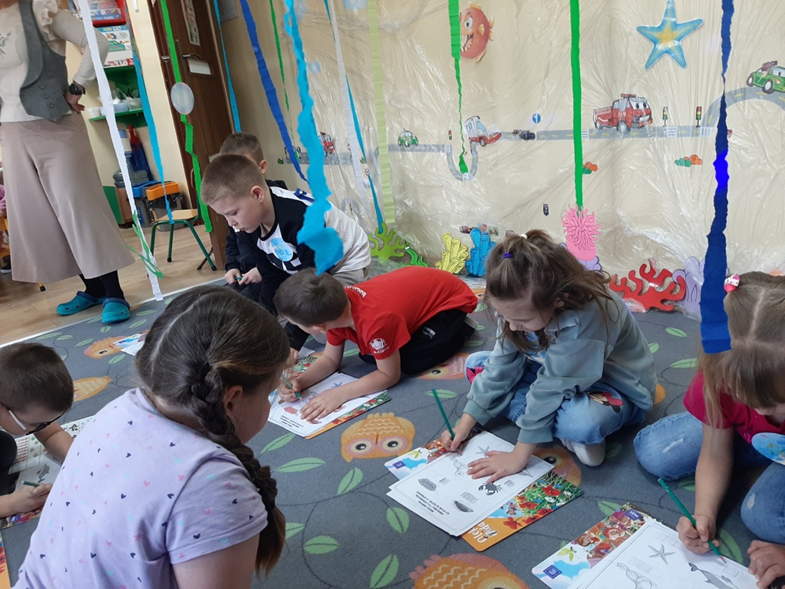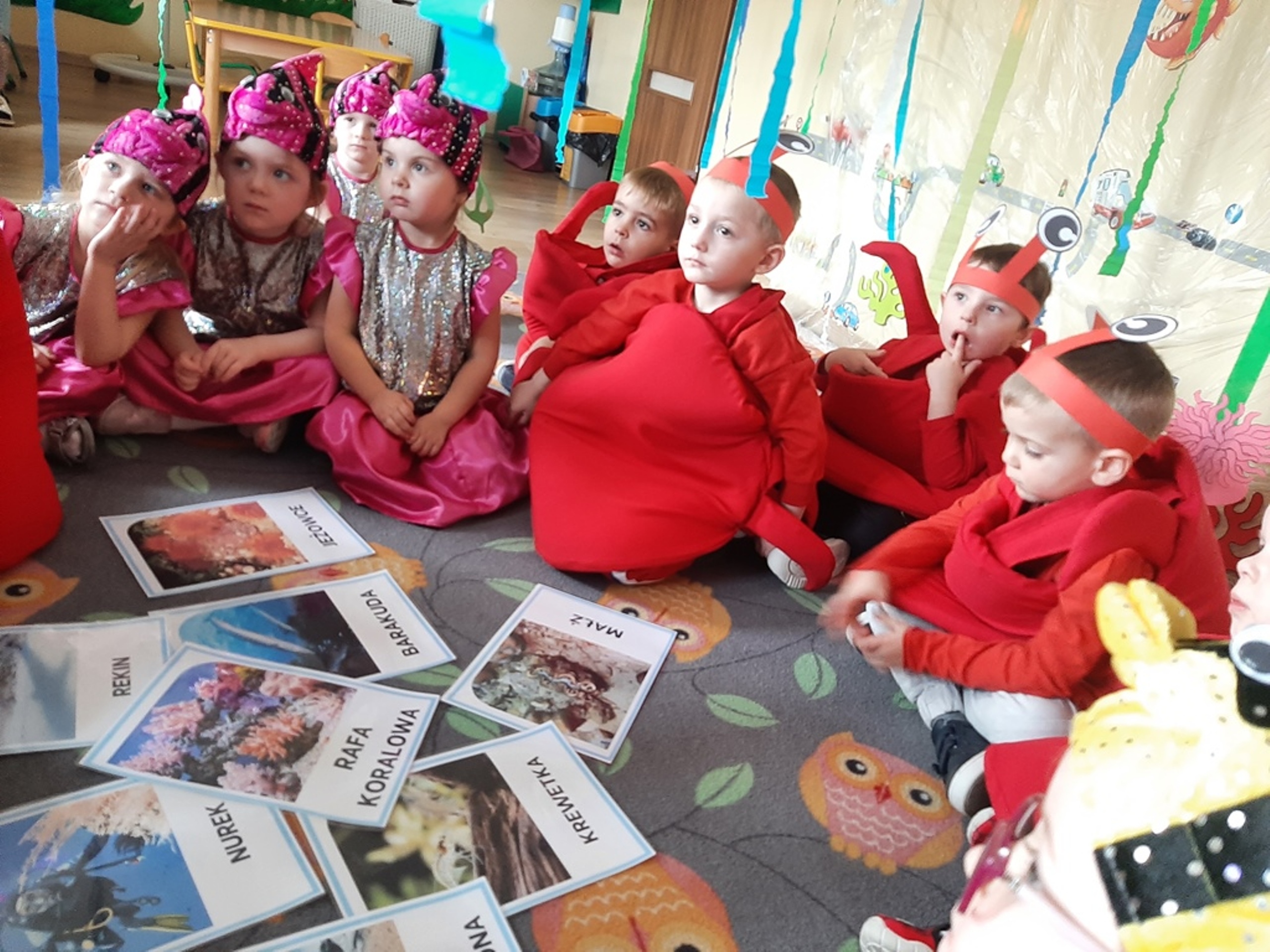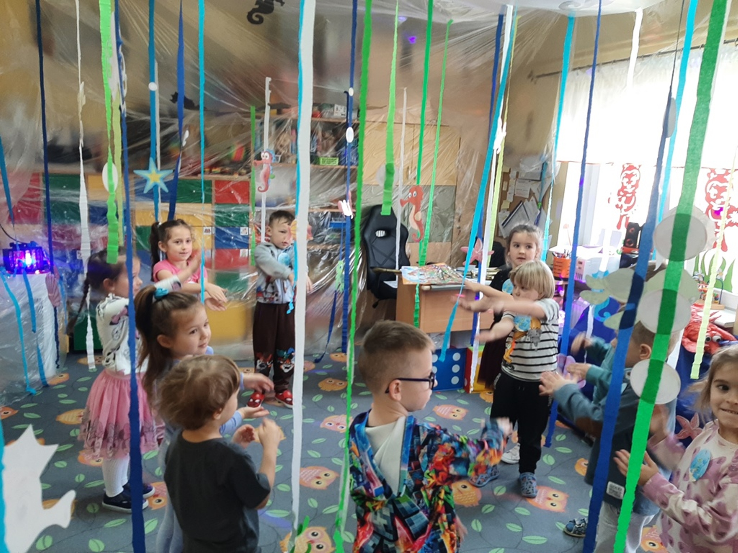 Dzieci poznały nazwy oceanów, dowiedziały się również, że ocean to bogaty i różnorodny świat pełen niezmierzonych przestworzy. Zajęcie wzbudziło wśród dzieci zainteresowanie światem podwodnych głębin, zwierząt i raf koralowych .Ważnym elementem zajęcia był temat zanieczyszczeń mórz i oceanów przez rozwiniętą i niszczycielską działalność człowieka. Dzieci wysłuchały ciekawostek związanych z możliwością ochrony środowiska wodnego oraz korzyściami jakie niesie ze sobą oszczędzanie wody. Dzieci z oddziału „Bratki” zaprosiły do wspólnej zabawy kolegów i koleżanki z oddziału „Tulipanki” i „Stokrotki”. Po zakończonej części edukacyjnej przyszedł czas na zabawę.