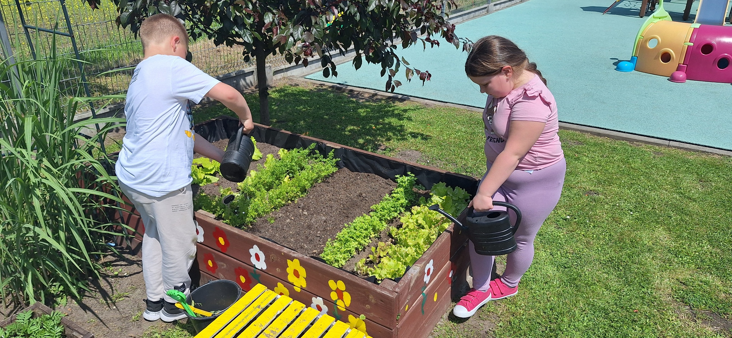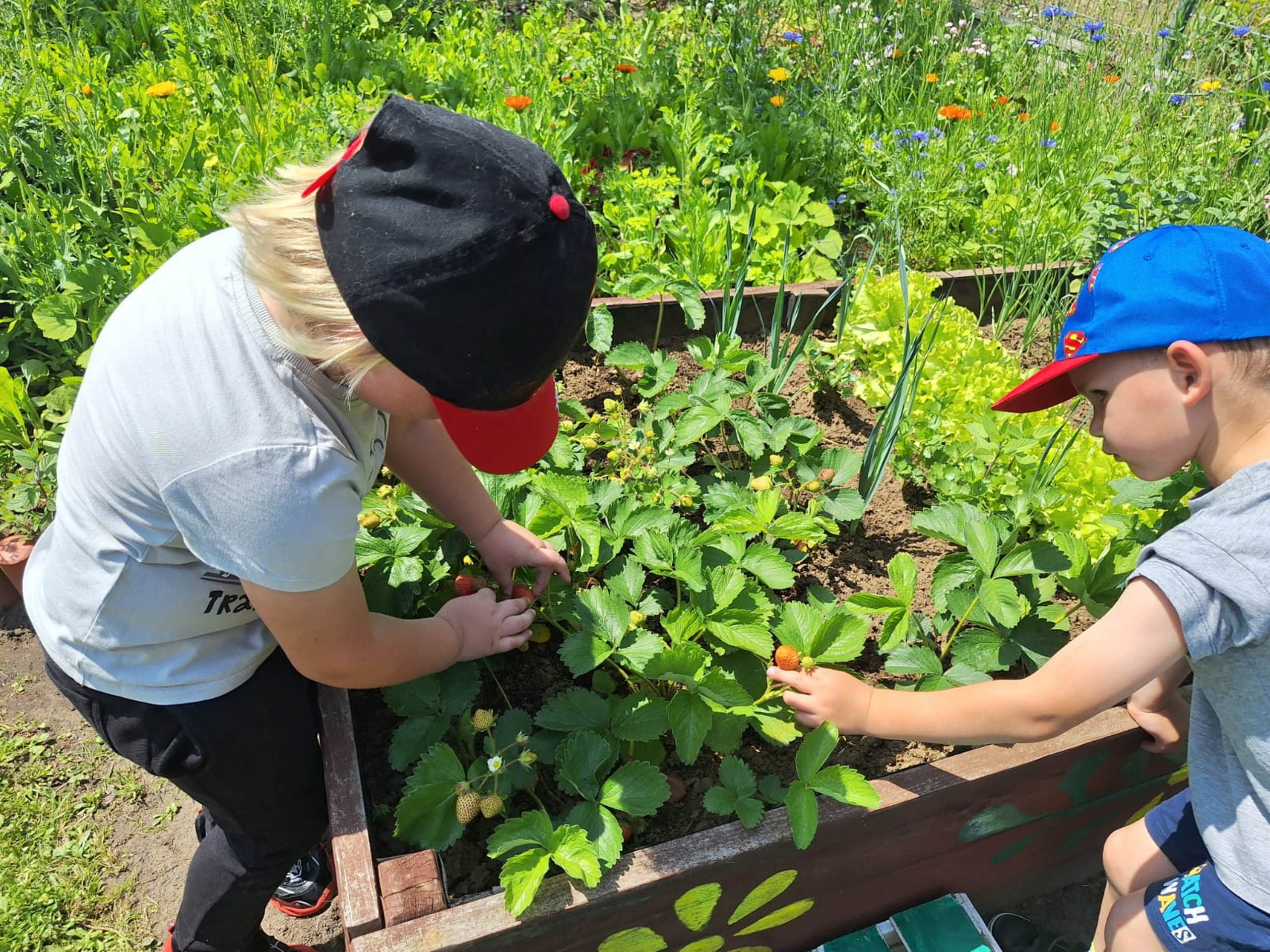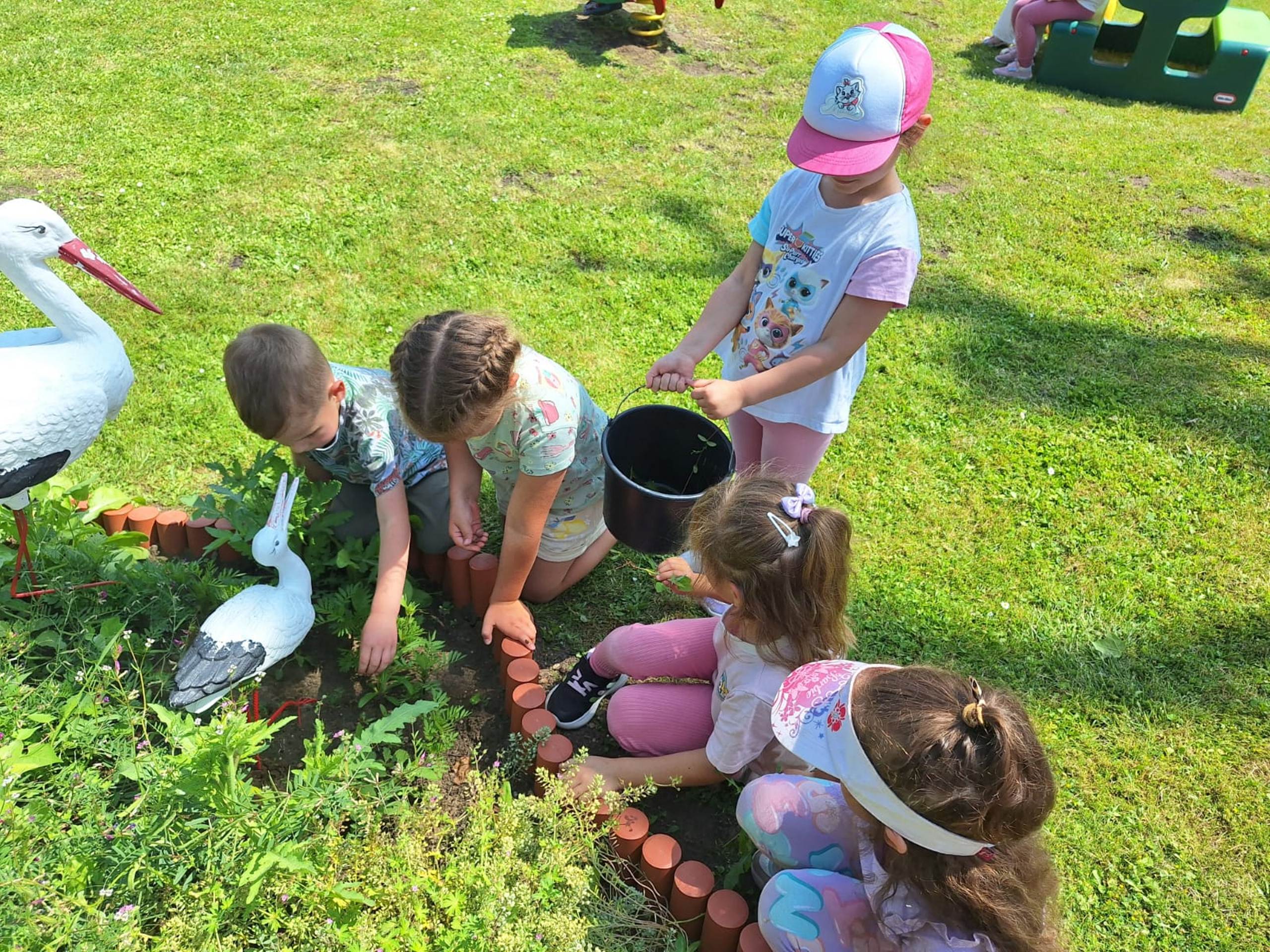Dzieci pracując w ogródku wspólnie z rówieśnikami uczyły się współpracy i współdziałania.