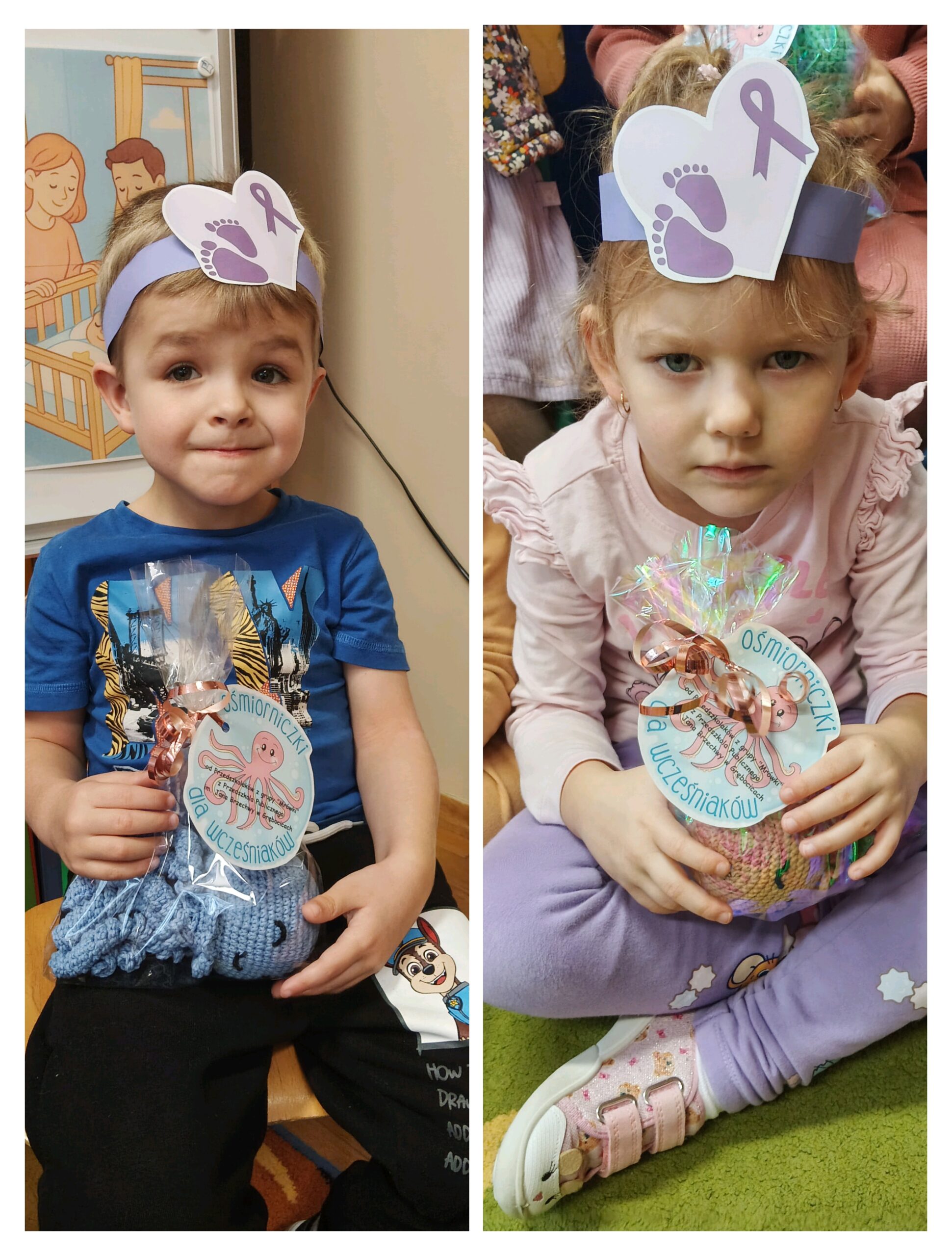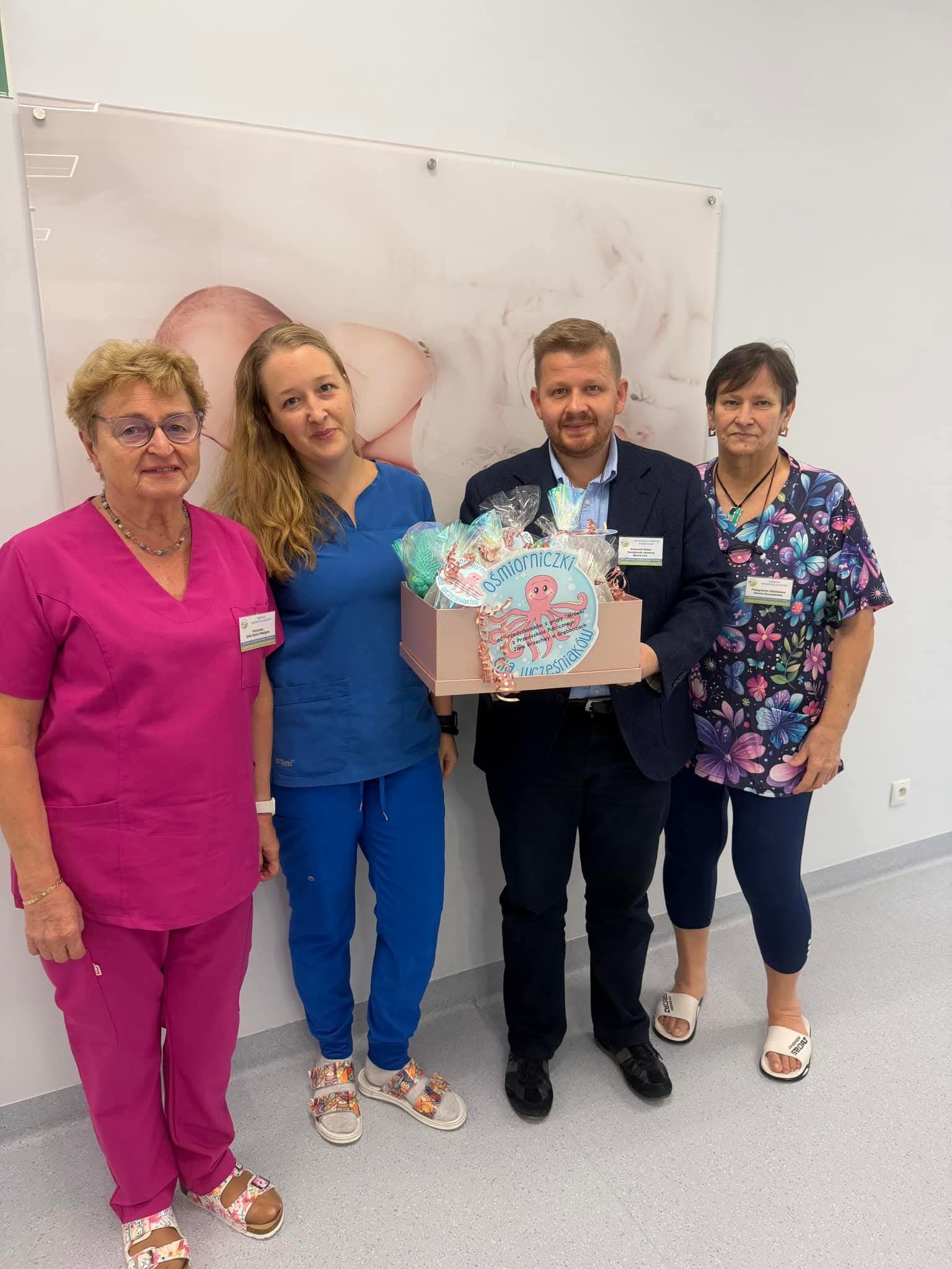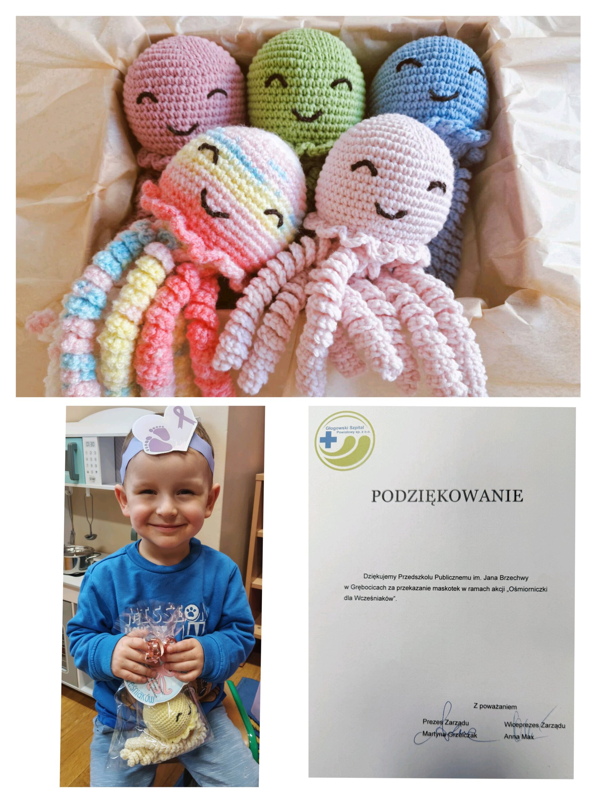Dnia 1 grudnia na Oddział Neonatologiczny w Głogowskim Szpitalu Powiatowym trafiły kolorowe, szydełkowe ośmiorniczki przygotowane przez dzieci z grupy „Mrówki” z Przedszkola Publicznego im. Jana Brzechwy w Grębocicach. W ramach akcji ogólnopolskiego projektu charytatywnego „Ośmiorniczki dla Wcześniaków”, prowadzonego przez Fundację Małych Serc. Ordynator Oddziału Neonatologicznego, pani Zofia Dejlich-Waligóra, wyjaśniła, że maskotki najpierw trafiają w ręce mam, a dopiero później umieszczane zostaną w inkubatorach, by maluszki mogły poznać zapach swojej mamy.