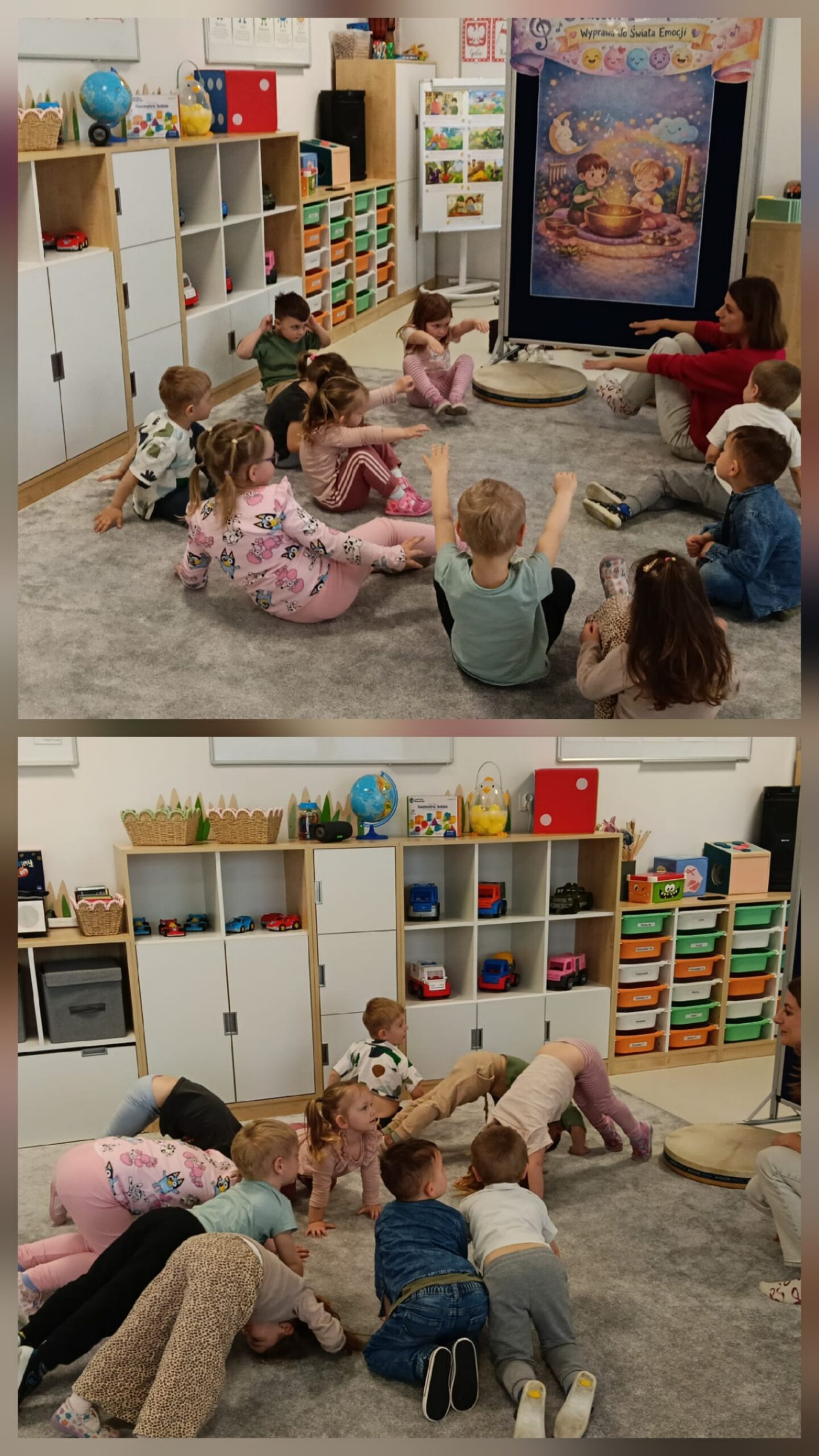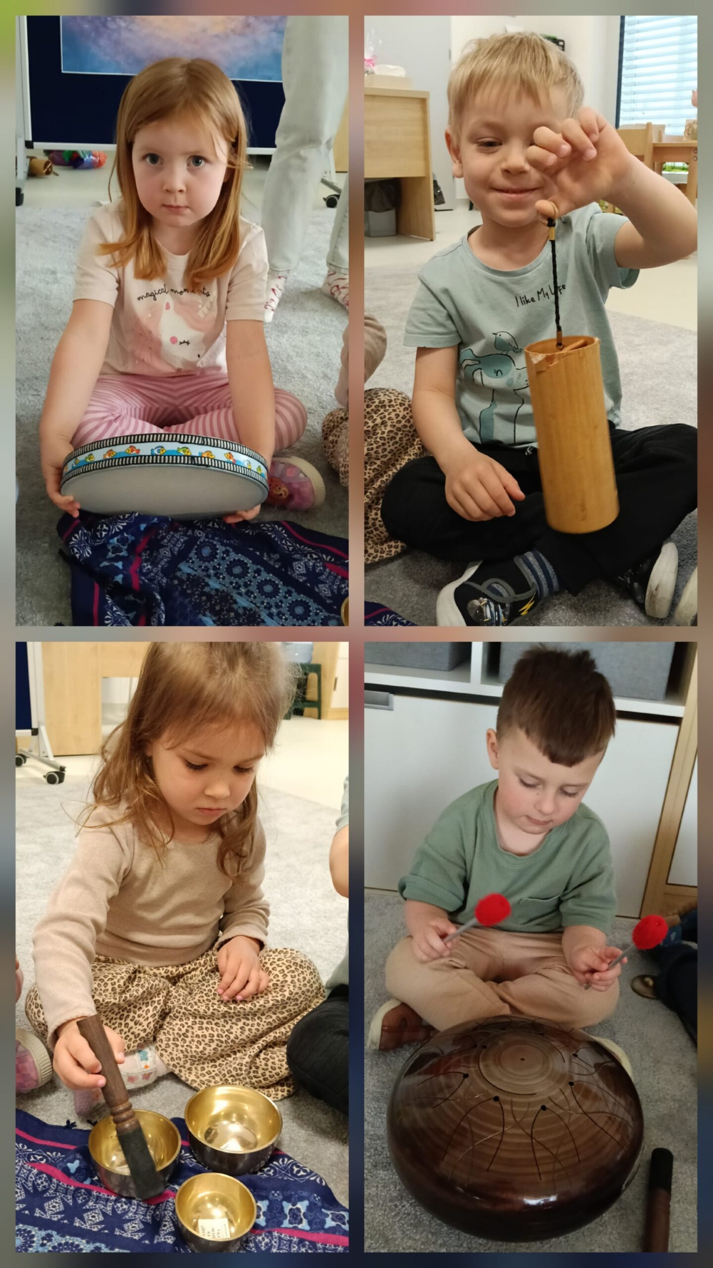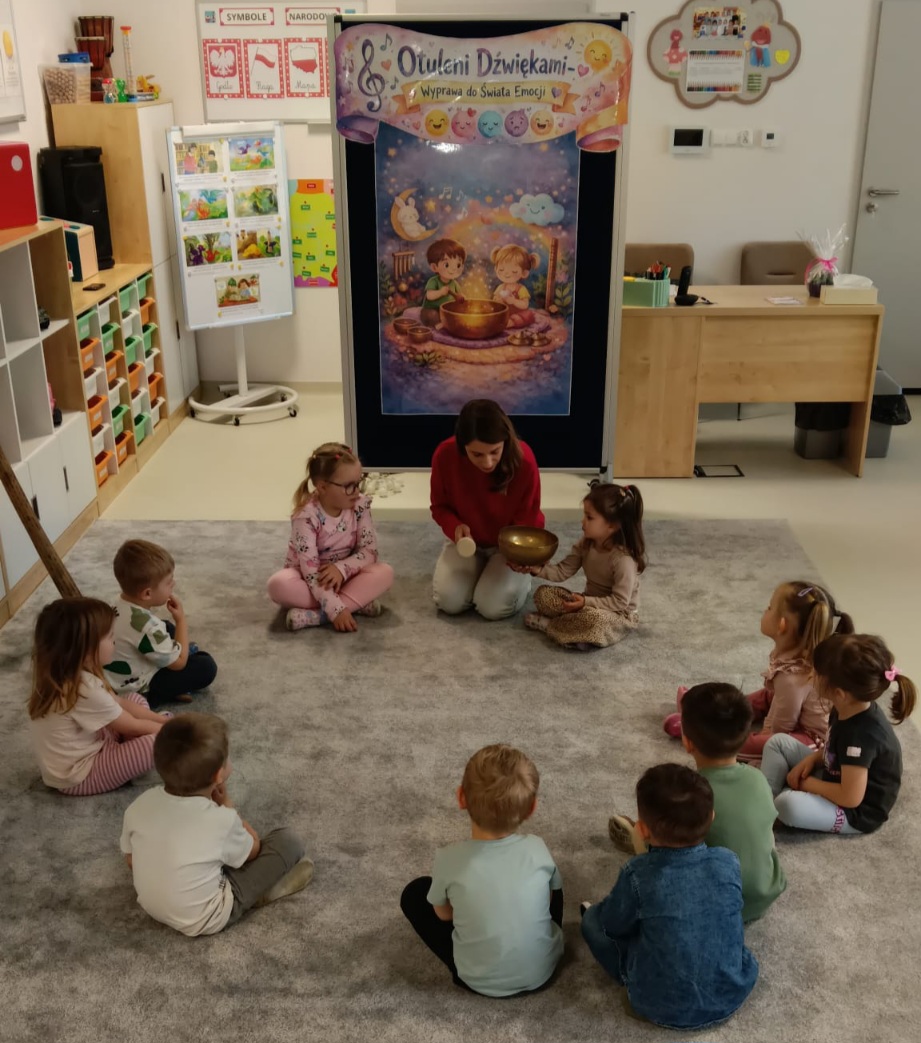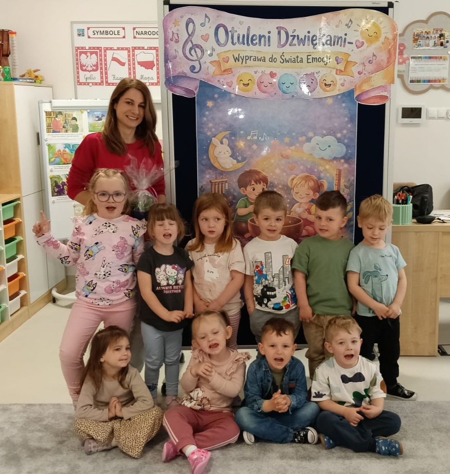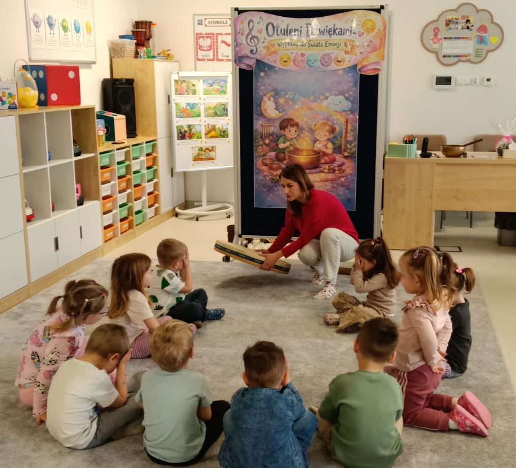 Dzieci z oddziału „Mrówki” wyruszyły w niezwykłą muzyczną podróż pod przewodnictwem Pani Eweliny Ceklarz – terapeuty z PPP w Głogowie, trenera uważności i muzykoterapeuty holistycznego. Warsztaty rozpoczęliśmy od wyprawy nad morze – dzieci rozciągały ciała i wzmacniały mięśnie, przygotowując się do dalszych aktywności. Nie zabrakło także chwili na automasaż, który wspiera rozwój zmysłu dotyku. Podczas zajęć dzieci poznały podstawy prawidłowego oddychania – ważny krok w kierunku uważności. W dalszej części ćwiczyły empatię w relaksacji w parach, a następnie odkrywały egzotyczne i nowoczesne instrumenty muzyczne. Wspólnie stworzyliśmy wyjątkową relaksację przy dźwiękach, pełną rytmu i wyobraźni. To była piękna podróż do świata emocji i uważności – czas spokoju, współpracy i radości z odkrywania dźwięków.