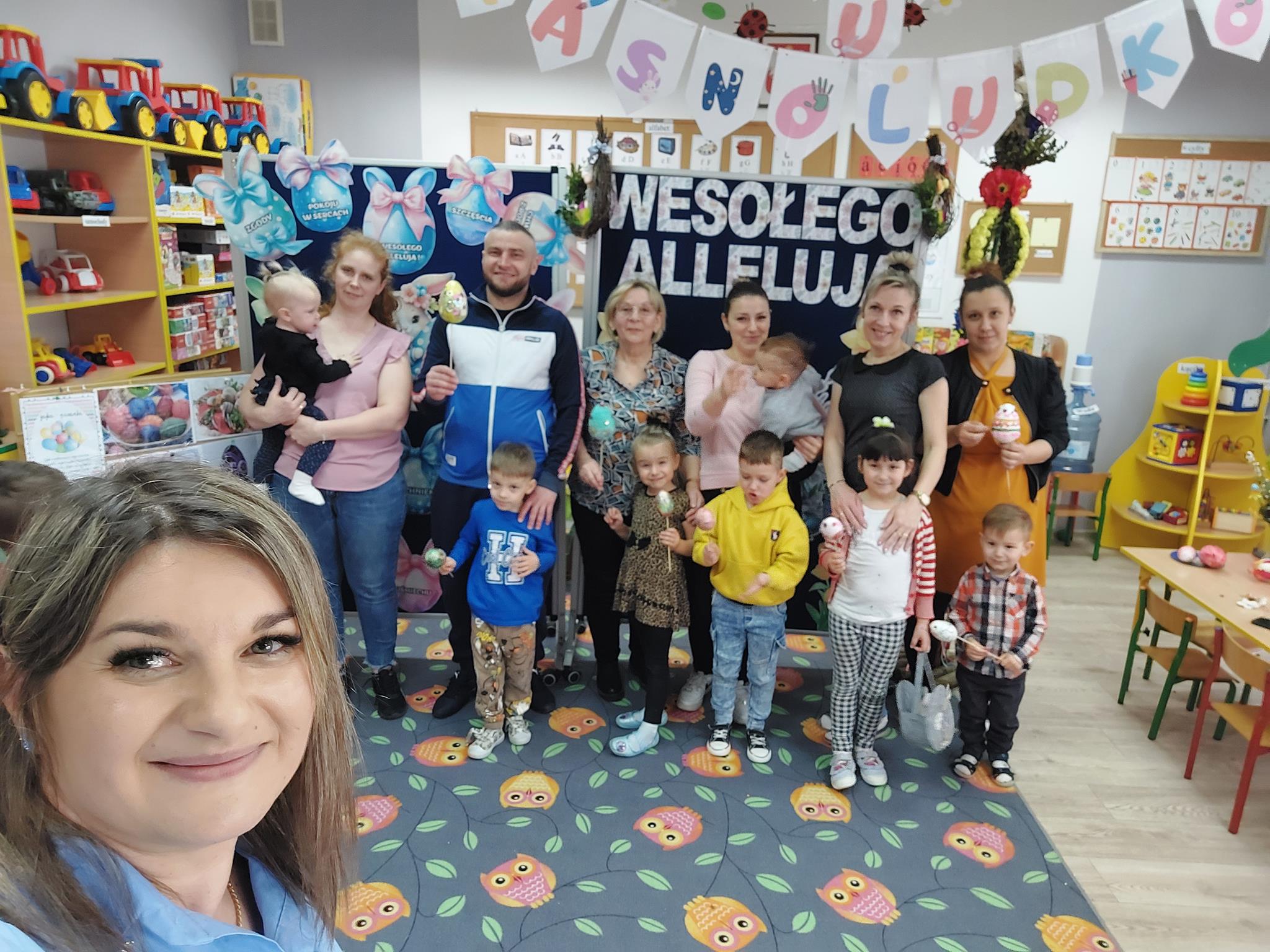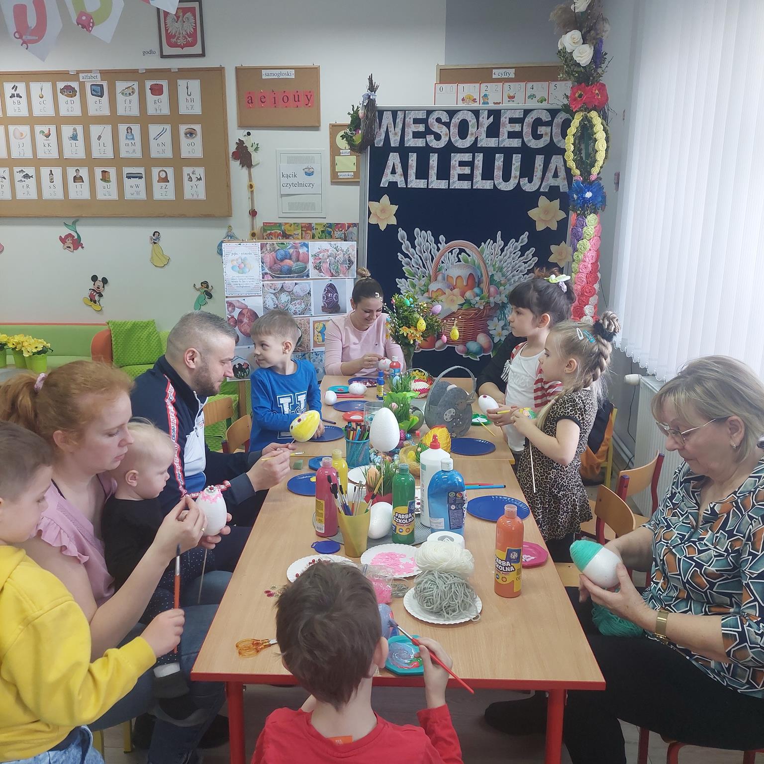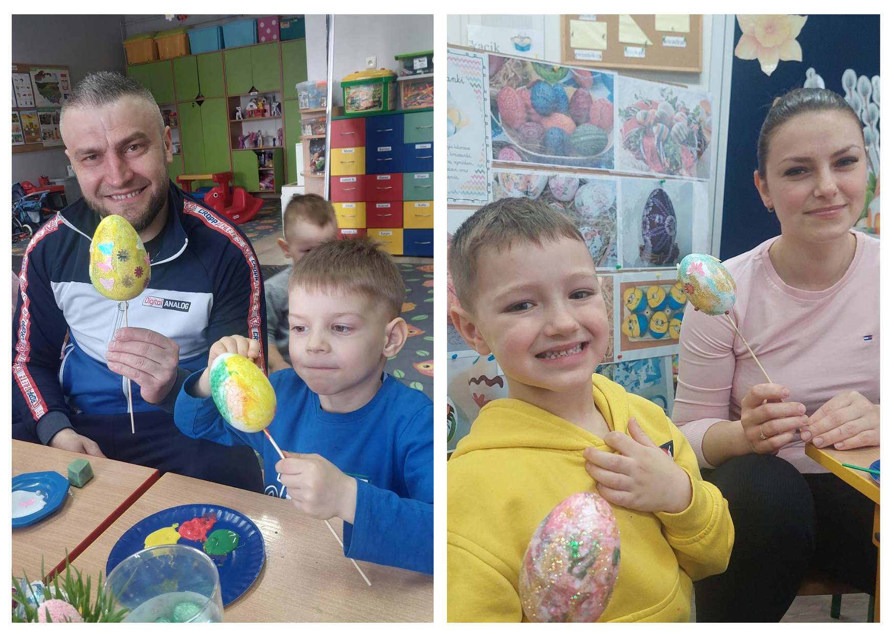 Święta Wielkanocne są związane przede wszystkim z tradycją malowania pisanek. W myśl tej zasady oddział Krasnoludków odwiedzili bliscy naszych przedszkolaków, którzy wspólnie zdobili różnymi technikami jajka. Dzięki temu każde dziecko stworzyło swoją indywidualną pisankę. Powstały istne piankowe cudeńka, które z pewnością zagoszczą w wielkanocnych koszyczkach naszych przedszkolaków. Głównym celem spotkania było zapoznanie dzieci z tradycją Świąt Wielkanocnych (ozdabianie jajek) oraz utrwalenie posiadanej przez dzieci wiedzy na temat tradycji wielkanocnych.