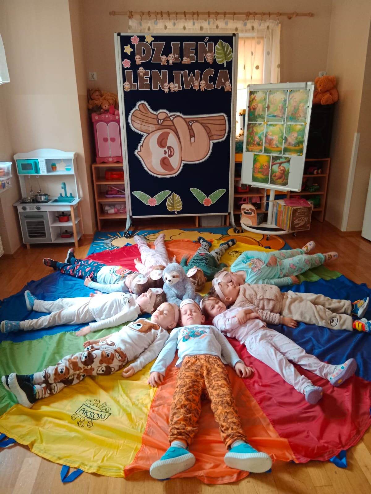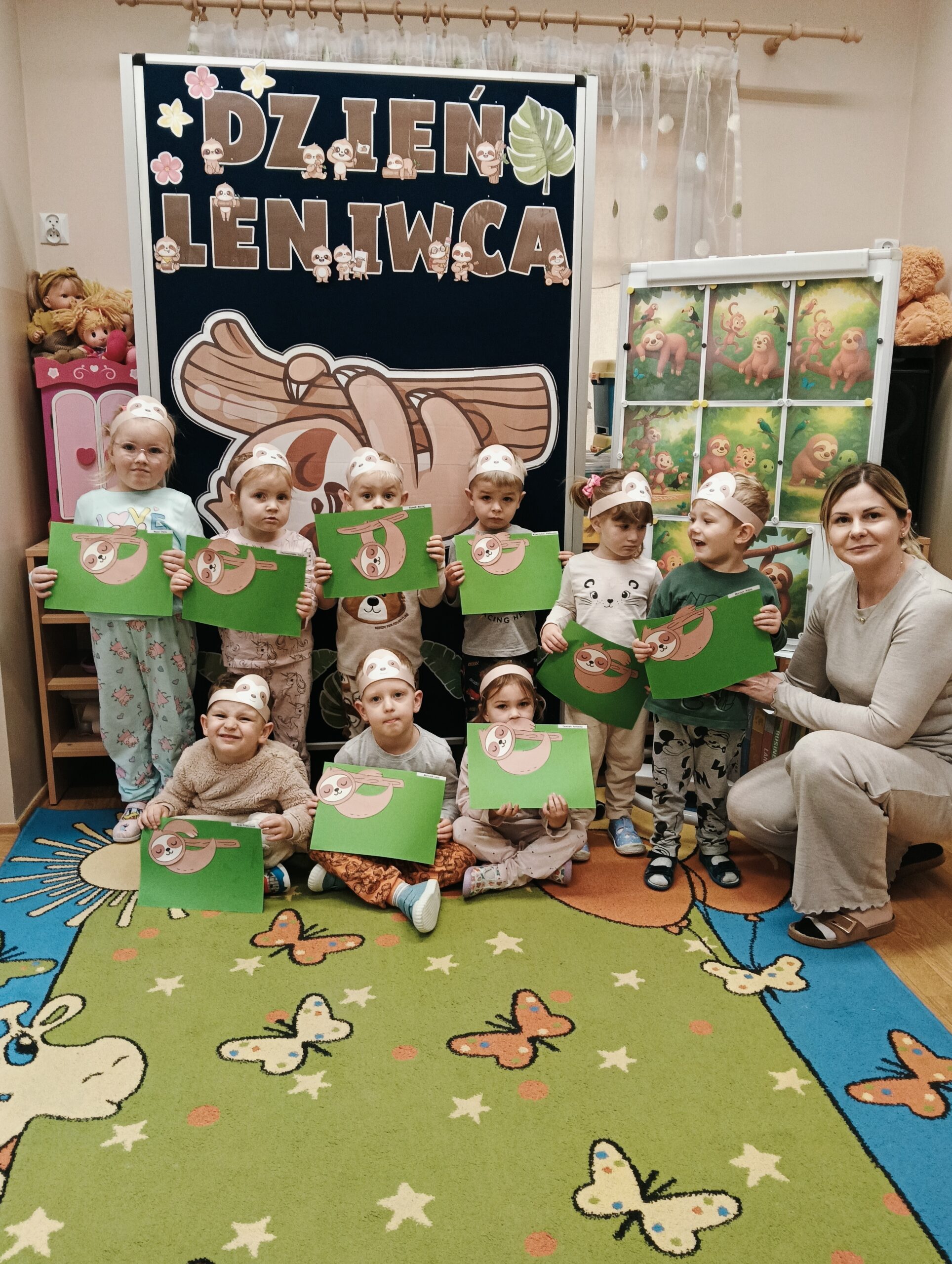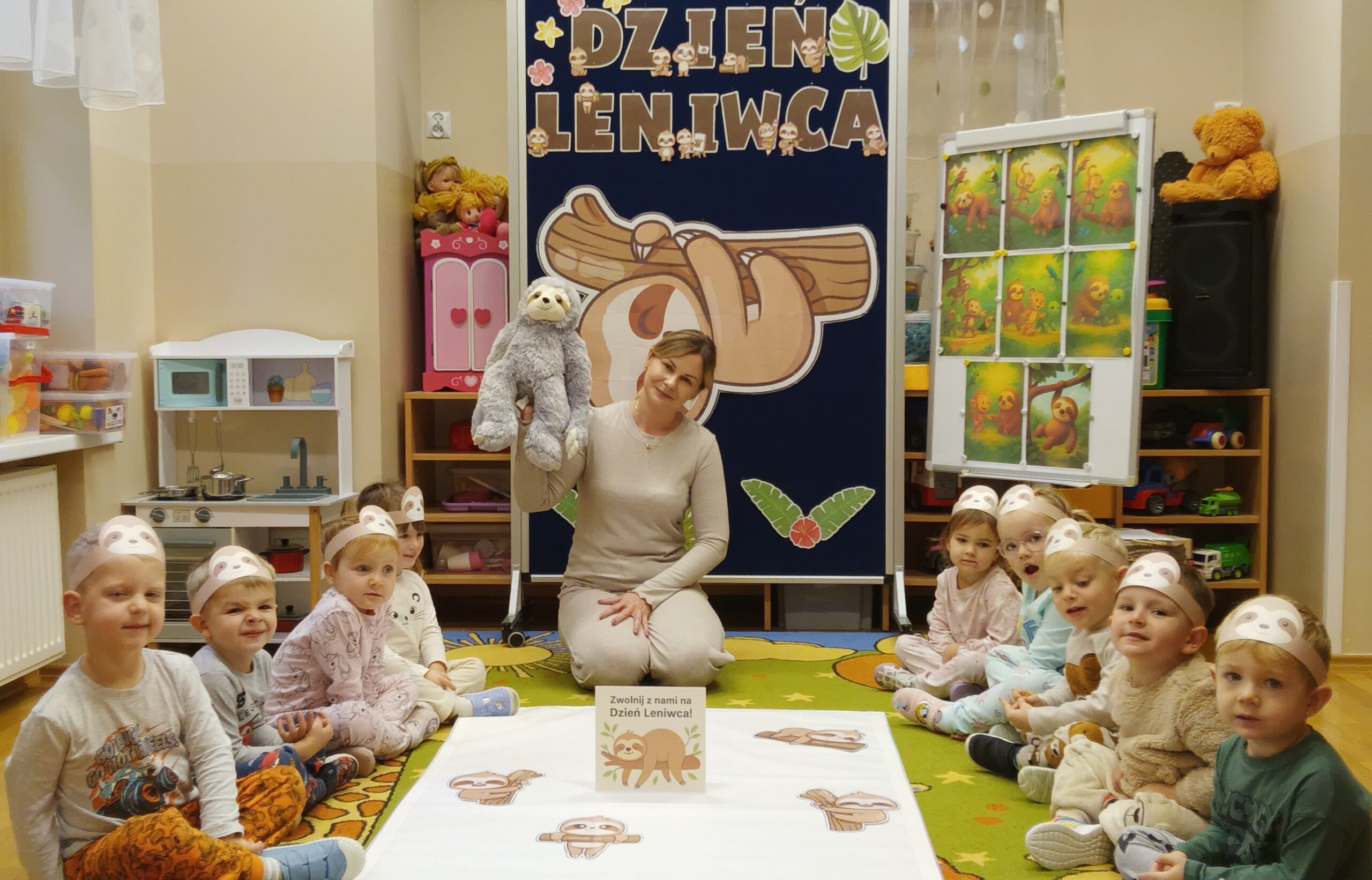 W oddziale przedszkolnym „Mrówki” odbył się wyjątkowy dzień pełen radości i zabawy – „Dzień Leniwca”. Dzieci przyszły do przedszkola w kolorowych, mięciutkich piżamkach, gotowe na relaks i wesołe aktywności. Uczestniczyły w różnych zabawach tematycznych i dydaktycznych m.in. śpiewały piosenki o leniwcach, oglądały prezentację multimedialną, a także tworzyły „leniwcowy las”. Wiele radości sprawiły przedszkolakom „leniwcowe ćwiczenia” – podczas których naśladowały powolne ruchy leniwca i ćwiczyły równowagę. Nie zabrakło również czytania bajek o sympatycznym, pomocnym leniwcu, który wprowadził dzieci w spokojny i przyjazny nastrój. Dzięki niemu odkryły ważną prawdę, że „czasem warto zwolnić, by dostrzec piękno świata”.