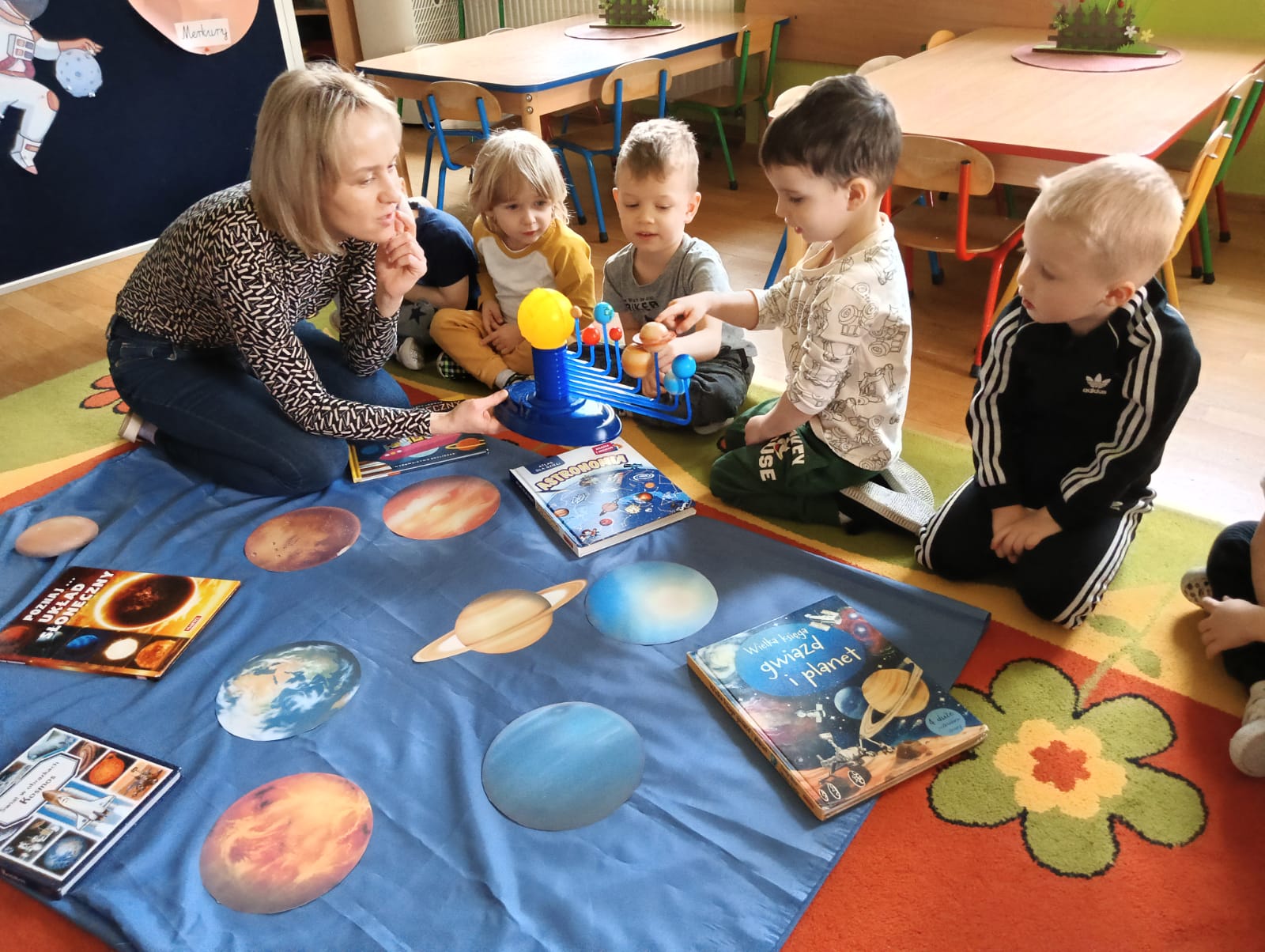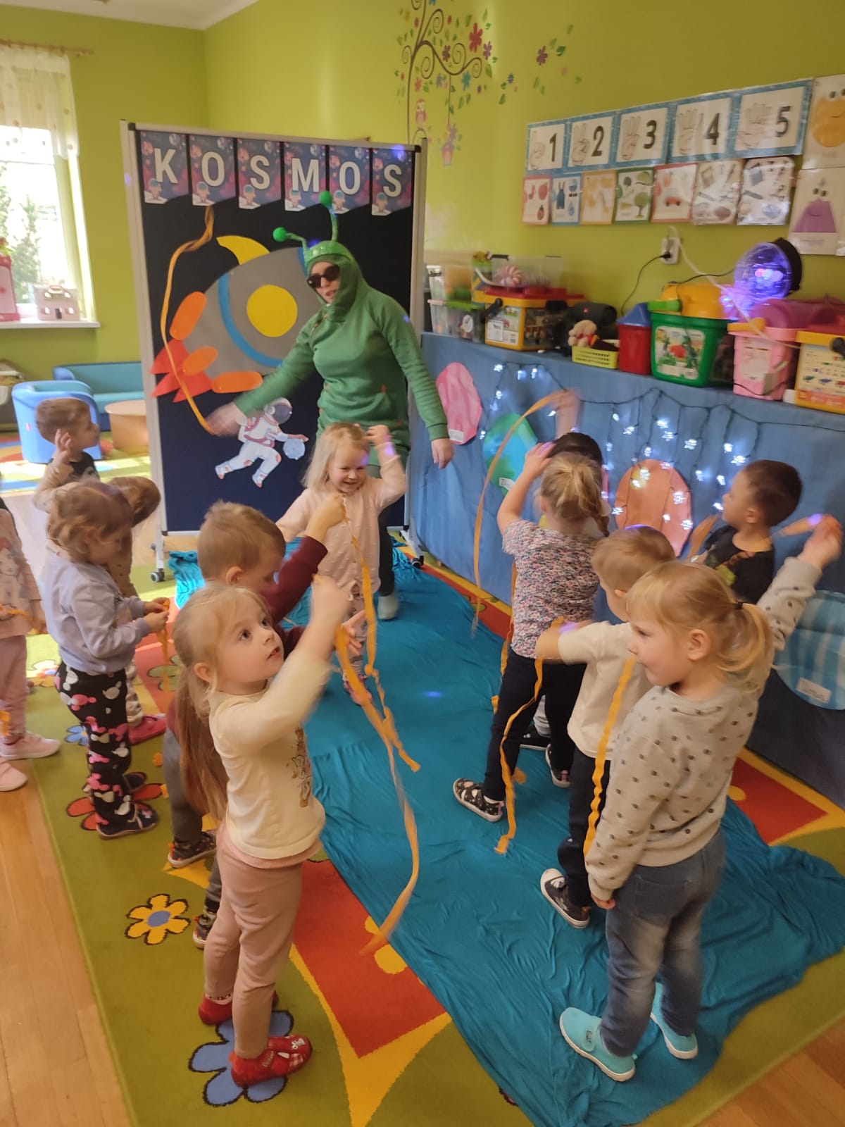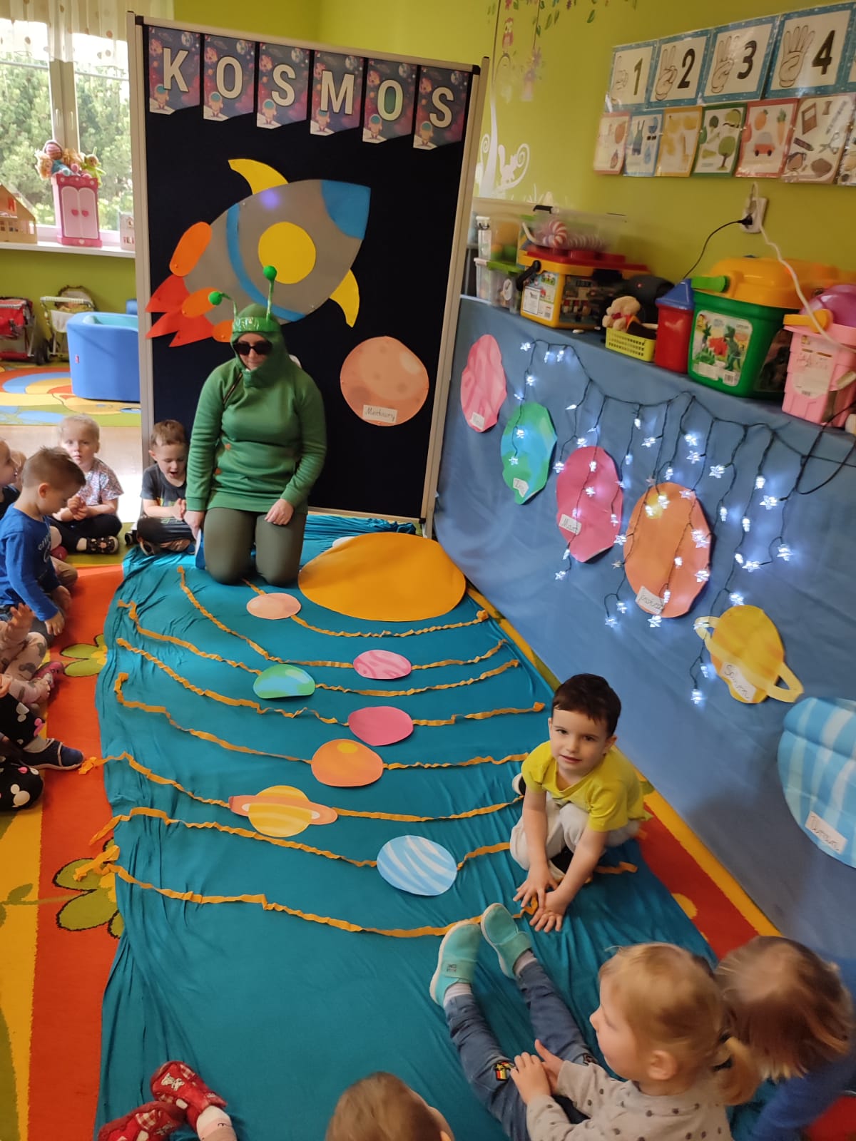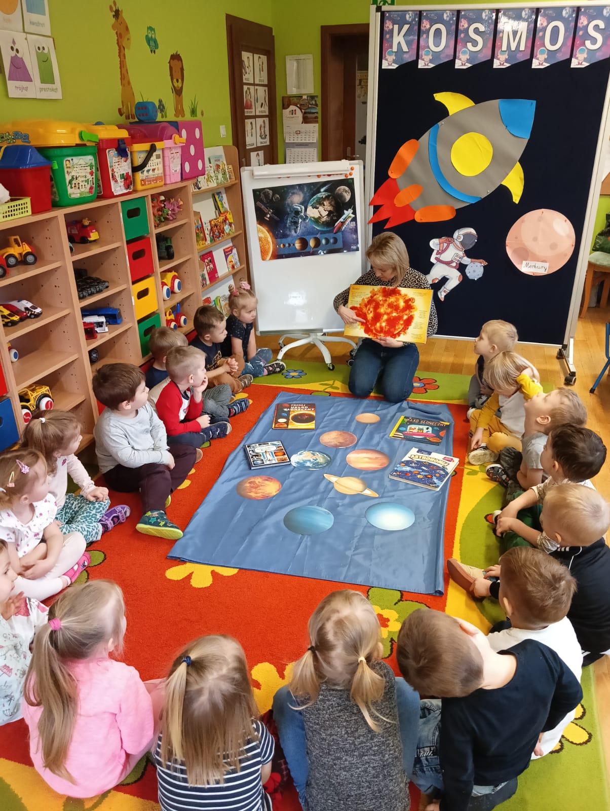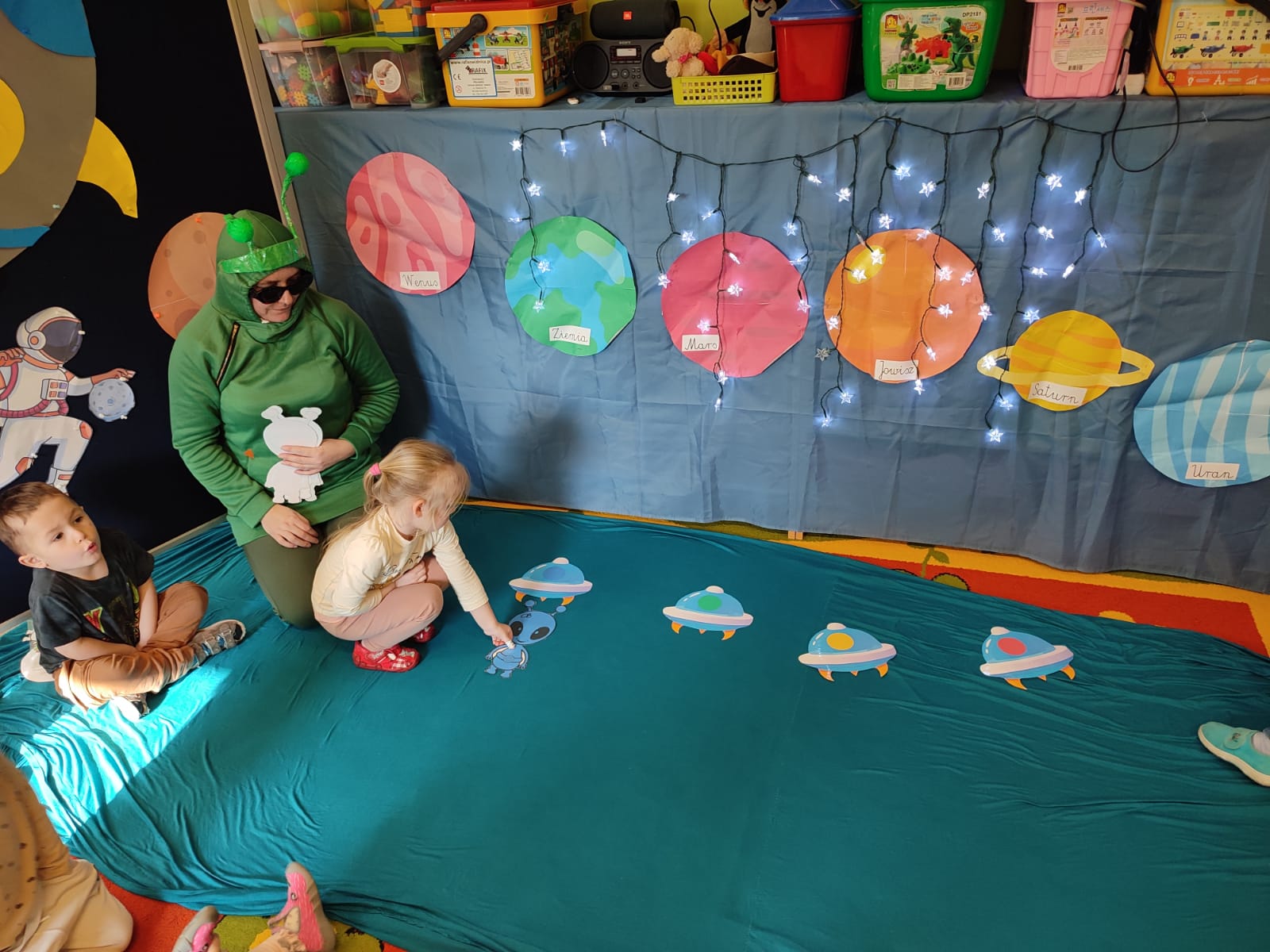 Przedszkolaki z oddziału Żuczki realizowały tematykę związaną z kosmosem. Zajęcia miały na celu rozbudzenie zainteresowań dzieci otaczającym nas wszechświatem. Podczas zajęć poznały planety układu słonecznego, poszerzyły słownik pojęciowy o wyrazy związane z kosmosem, a także dowiedziały się kim jest astronauta. Wiele radości sprawiło dzieciom przybycie ufoludka, z którym zastanawiały się czy życie na innych planetach jest możliwe i czy UFO tak naprawdę istnieje. Oczywiście nie mogło zabraknąć piosenki „Układ Słoneczny”, którą przedszkolaki bardzo polubiły. Był to tydzień pełen wrażeń i nowych doświadczeń.