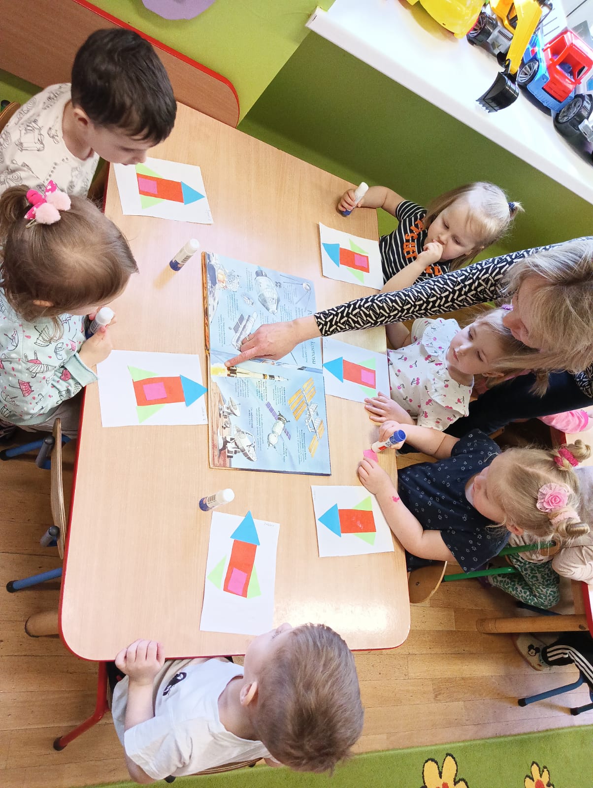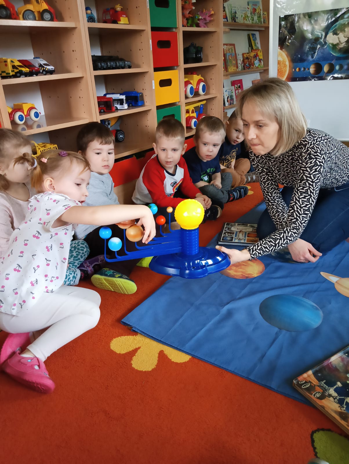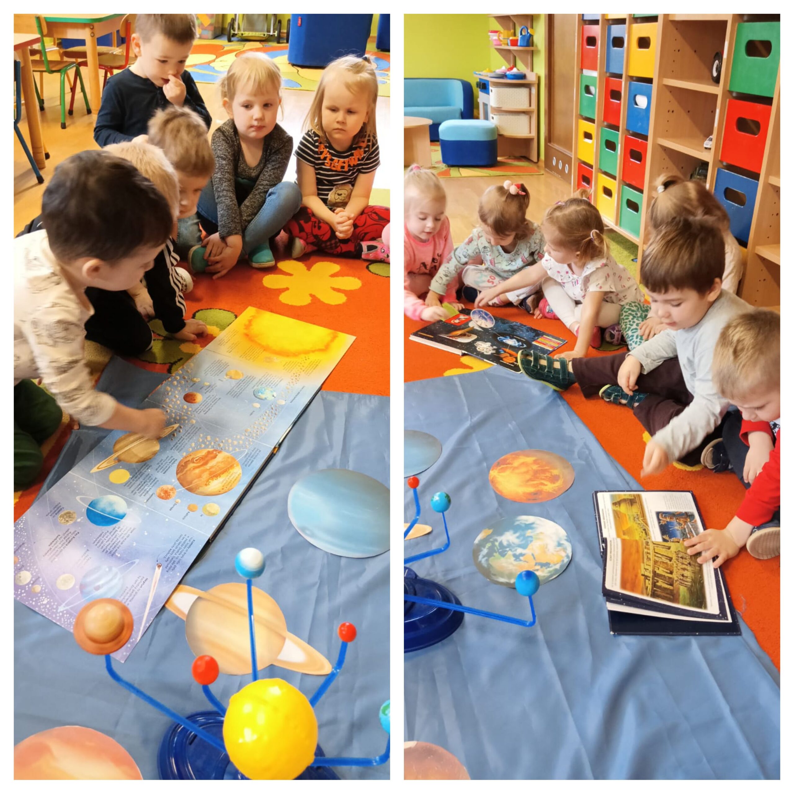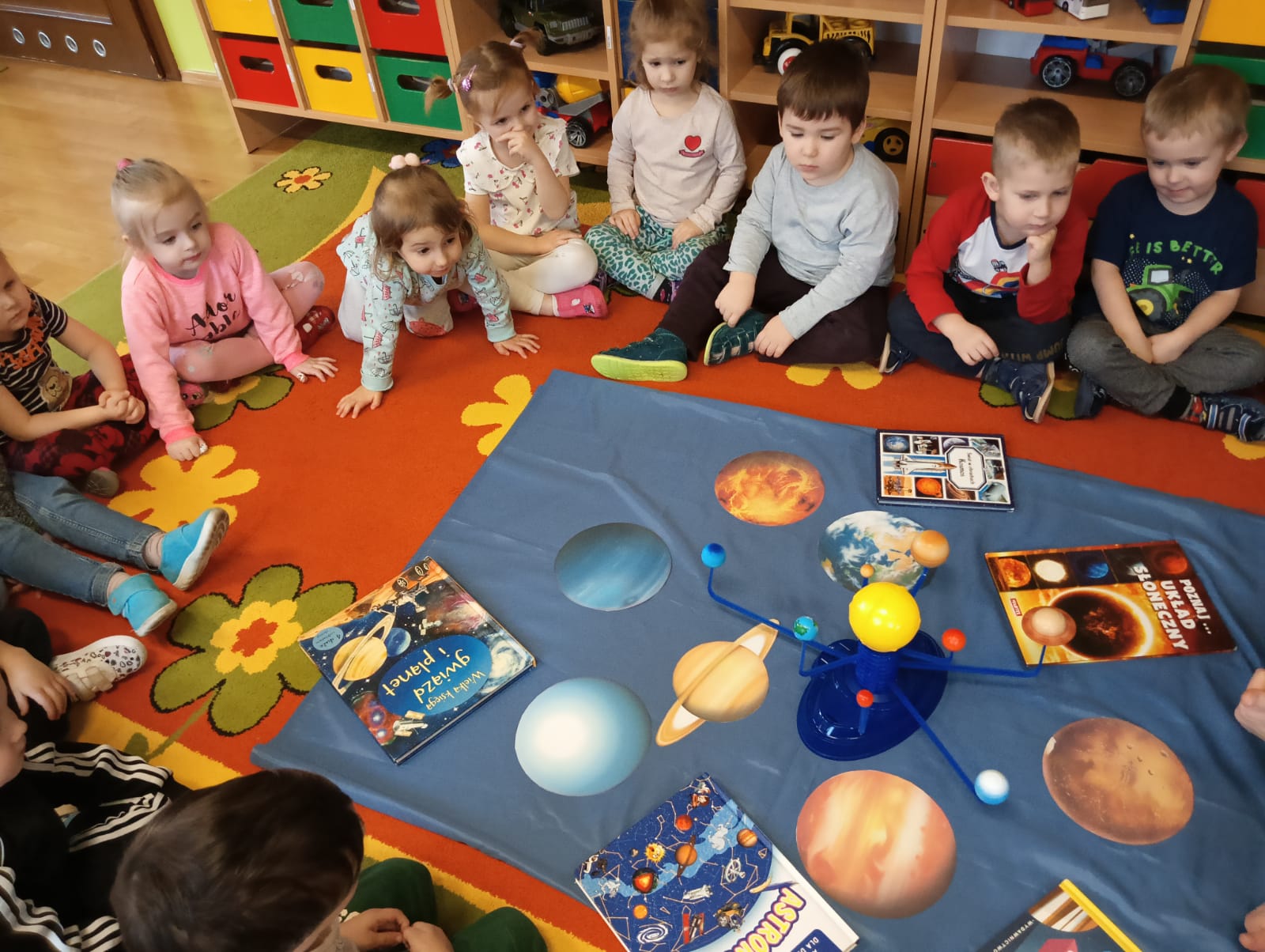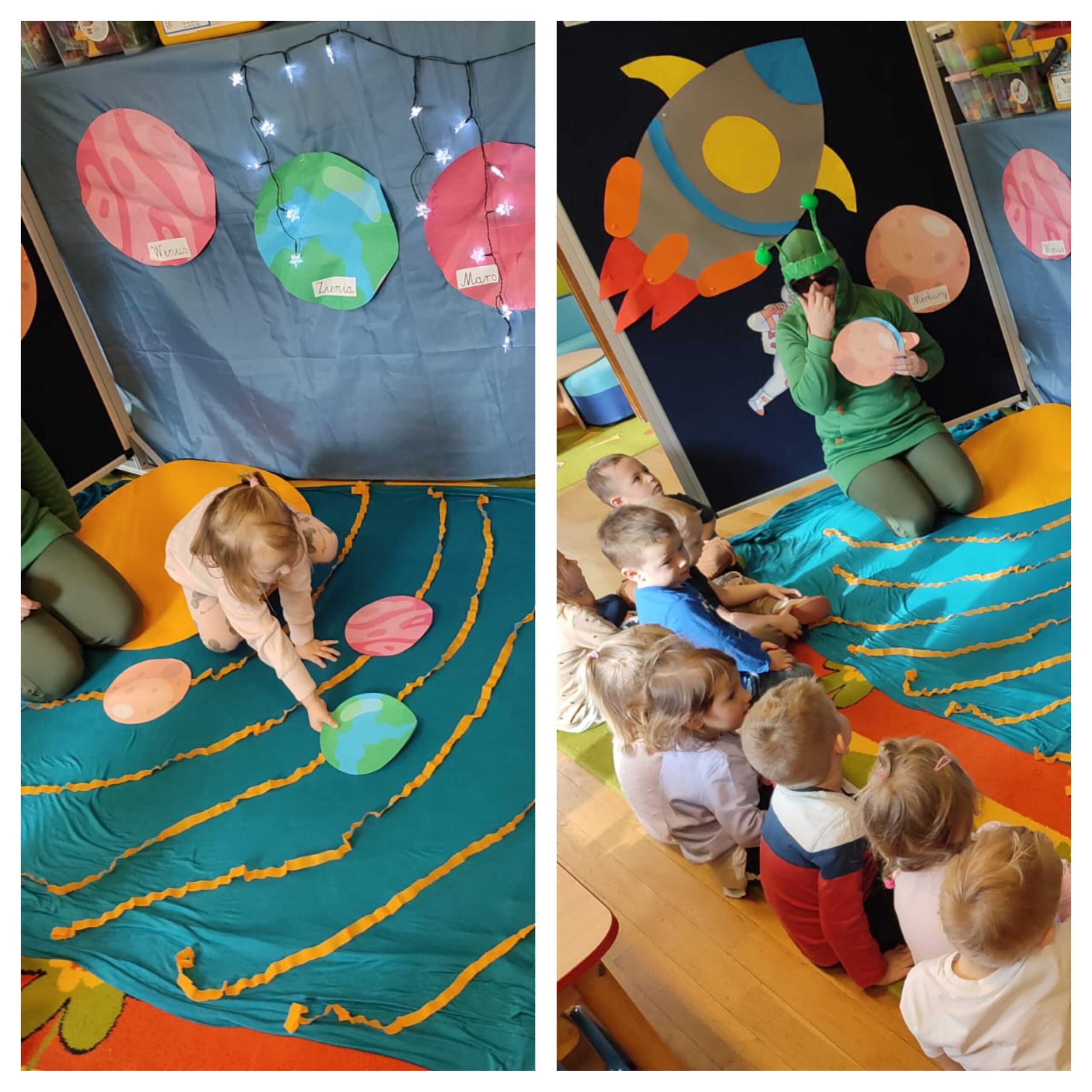 Przedszkolaki z oddziału Żuczki realizowały tematykę związaną z kosmosem. Zajęcia miały na celu rozbudzenie zainteresowań dzieci otaczającym nas wszechświatem. Podczas zajęć poznały planety układu słonecznego, poszerzyły słownik pojęciowy o wyrazy związane z kosmosem, a także dowiedziały się kim jest astronauta. Wiele radości sprawiło dzieciom przybycie ufoludka, z którym zastanawiały się czy życie na innych planetach jest możliwe i czy UFO tak naprawdę istnieje. Oczywiście nie mogło zabraknąć piosenki „Układ Słoneczny”, którą przedszkolaki bardzo polubiły. Był to tydzień pełen wrażeń i nowych doświadczeń.