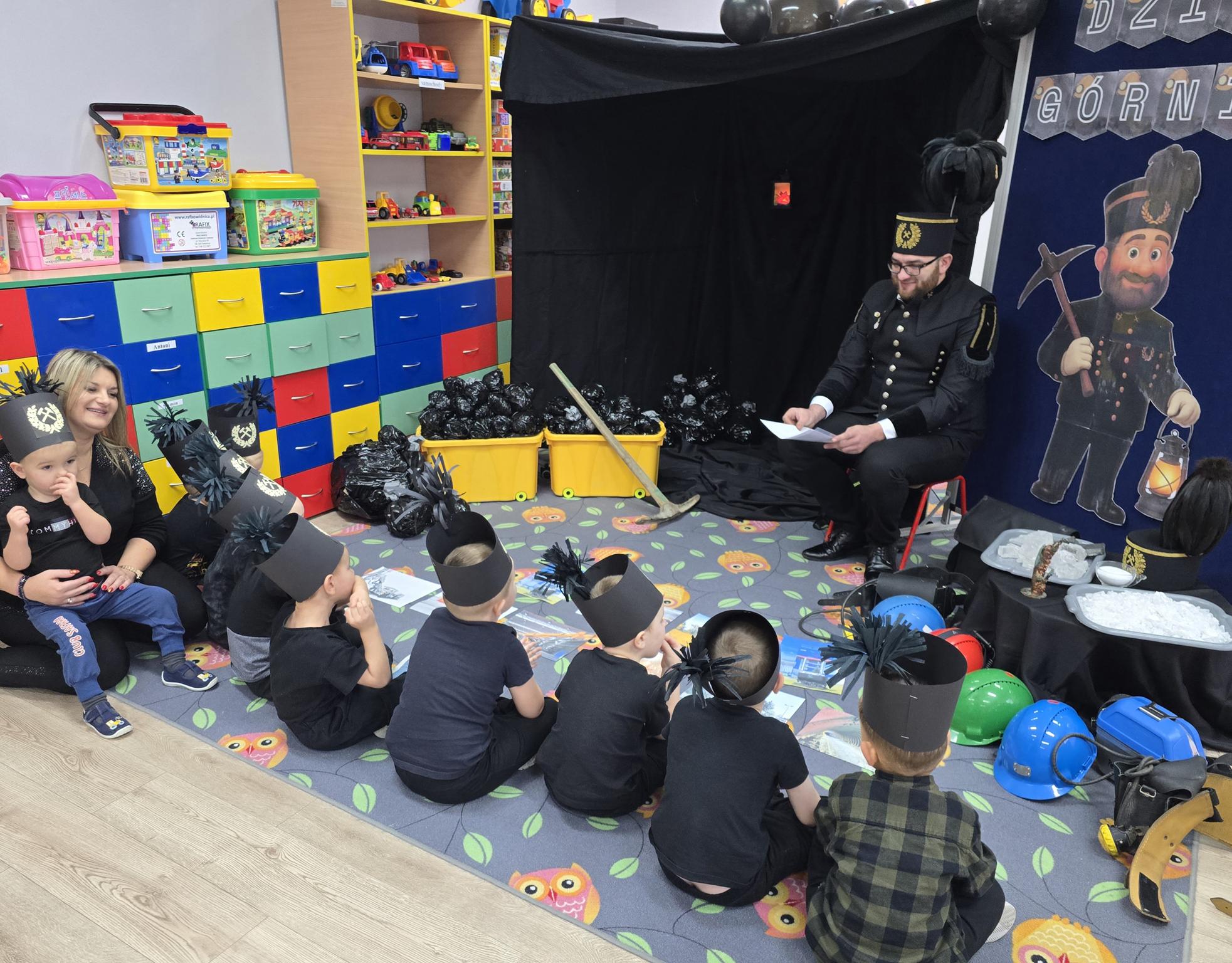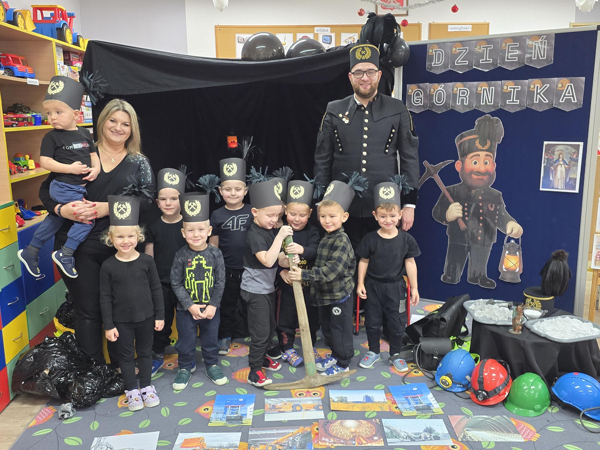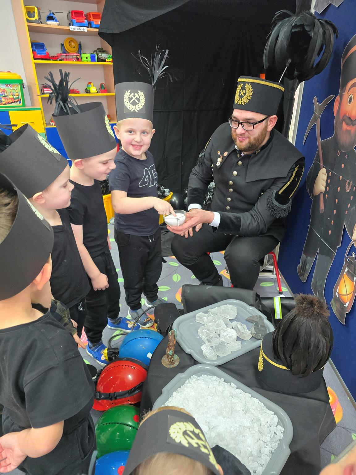 W Oddziale „Krasnoludki” odbyło się wyjątkowe spotkanie z górnikiem – Panem Danielem Bobrowskim. Dzieci poznały galowy mundur górniczy, tradycje górnicze oraz ciekawostki związane z pracą pod ziemią. Przedszkolaki z zainteresowaniem słuchały opowieści o kopalni, bezpieczeństwie i górniczych zwyczajach, chętnie zadając pytania. Celem spotkania było przybliżenie dzieciom zawodu górnika, rozwijanie ciekawości poznawczej oraz kształtowanie szacunku do pracy innych ludzi.
