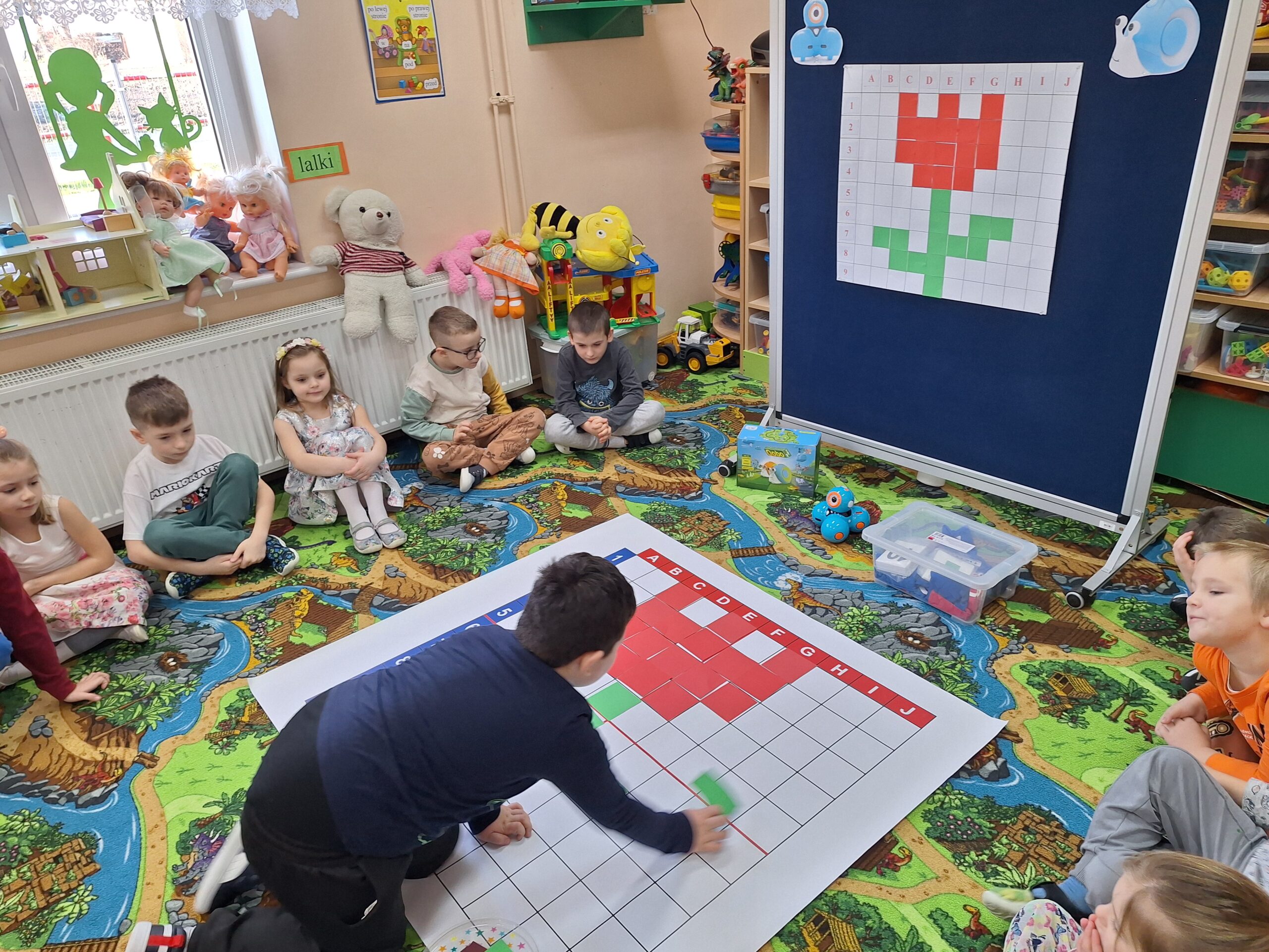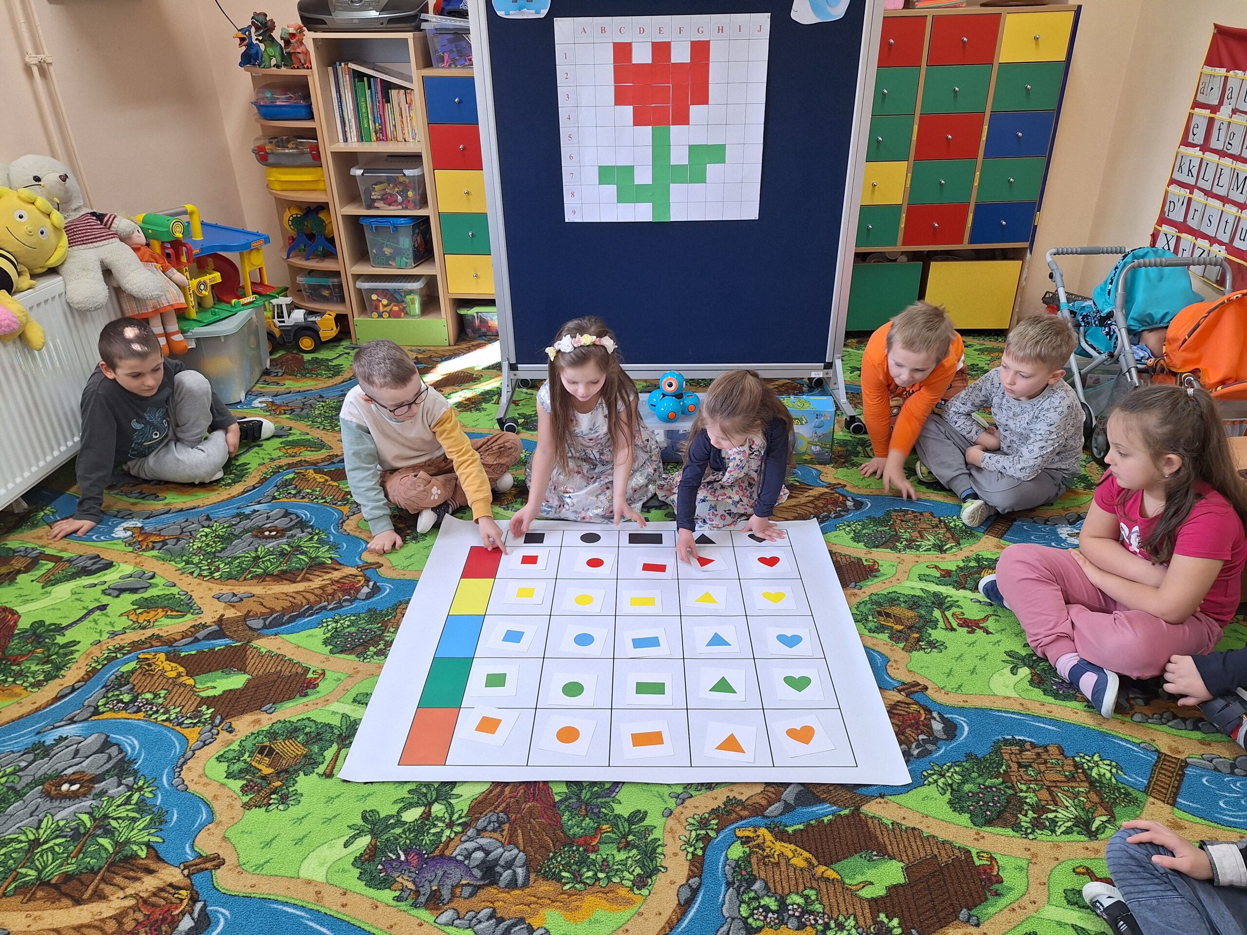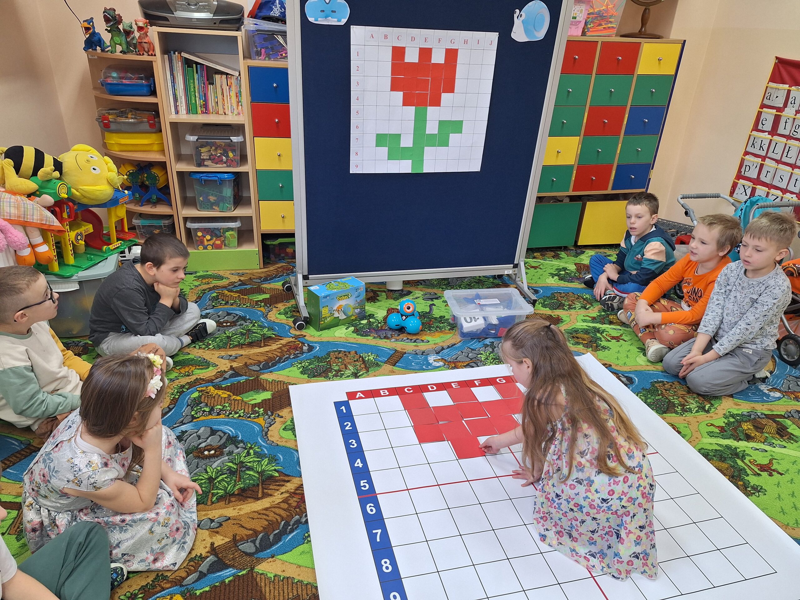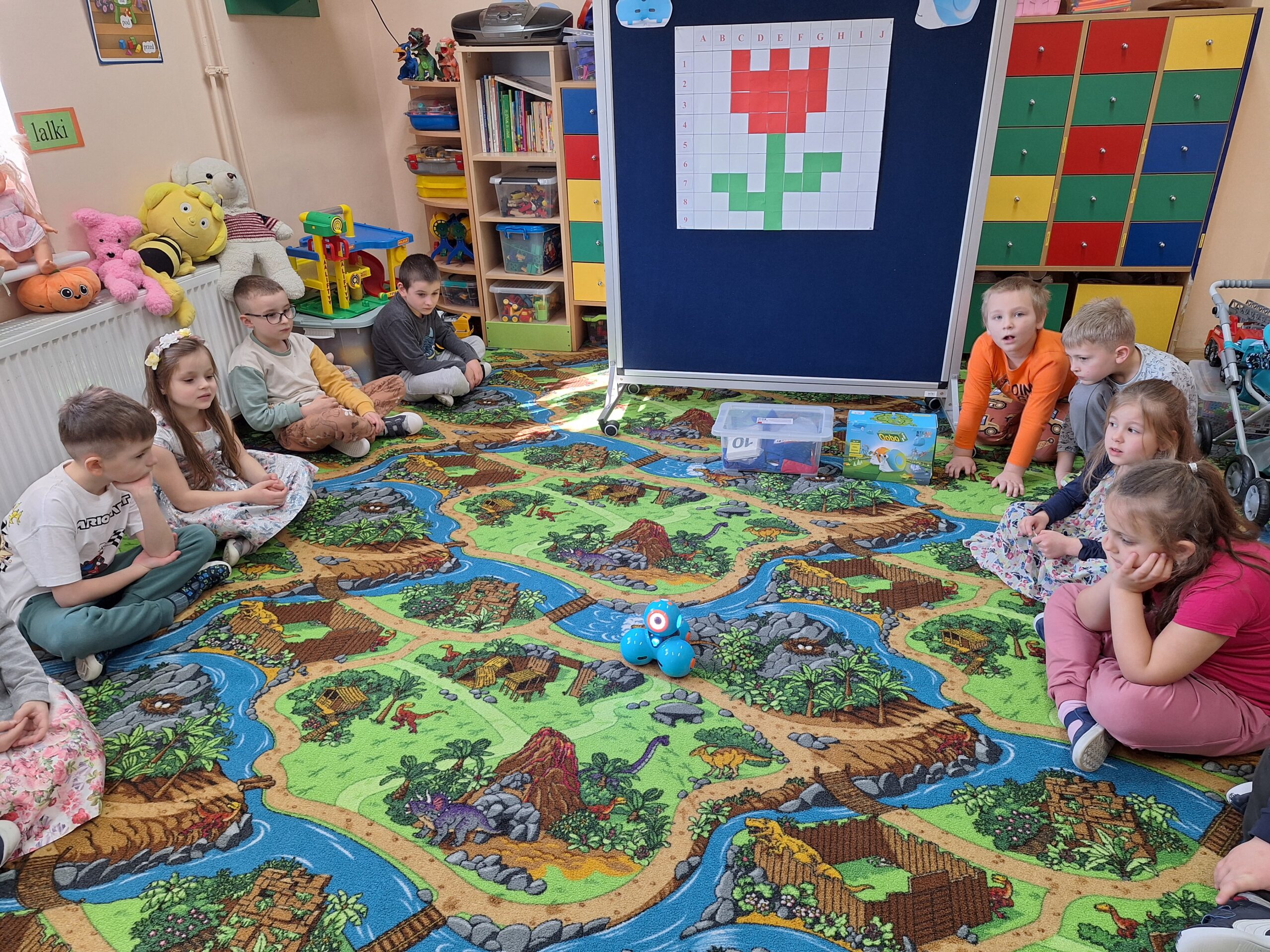 W ramach projektu „20 minut dla matematyki” dzieci z Oddziału „Stokrotki” uczyły się kodowania i programowania robotów takich jak: DOC oraz QOBO. Kodowanie i programowanie staje się dziś ważnym kierunkiem w edukacji na wszystkich poziomach kształcenia, aby jednak uczniowie z powodzeniem kodowali, pewne umiejętności analizowania, wnioskowania, planowania możemy zaszczepić u dzieci jeszcze na etapie przedszkola. Zabawy z kodowaniem są pełne radości, otwierają umysły, rozwijają umiejętności logicznego myślenia, rozumowania i wnioskowania. Czas, który dzieci spędzają w przedszkolu, pozwala im polubić kodowanie, traktować zabawy z nim jako naturalną część edukacji i wychowania. Stokrotki poznały zasady kodowania z Robotem DOC oraz QOBO. Każde dziecko miało okazję zaprogramować robota i sprawdzić czy dobrze wykonał ich kodowanie. Dzieci z grypy „Stokrotek” w ramach zajęć zrozumiały, że matematyka jest wszędzie i może być ciekawa, przyjemna, a przede wszystkim daje dużo radości. Koordynatorem zajęć była nauczycielka Zuzanna Bilska.